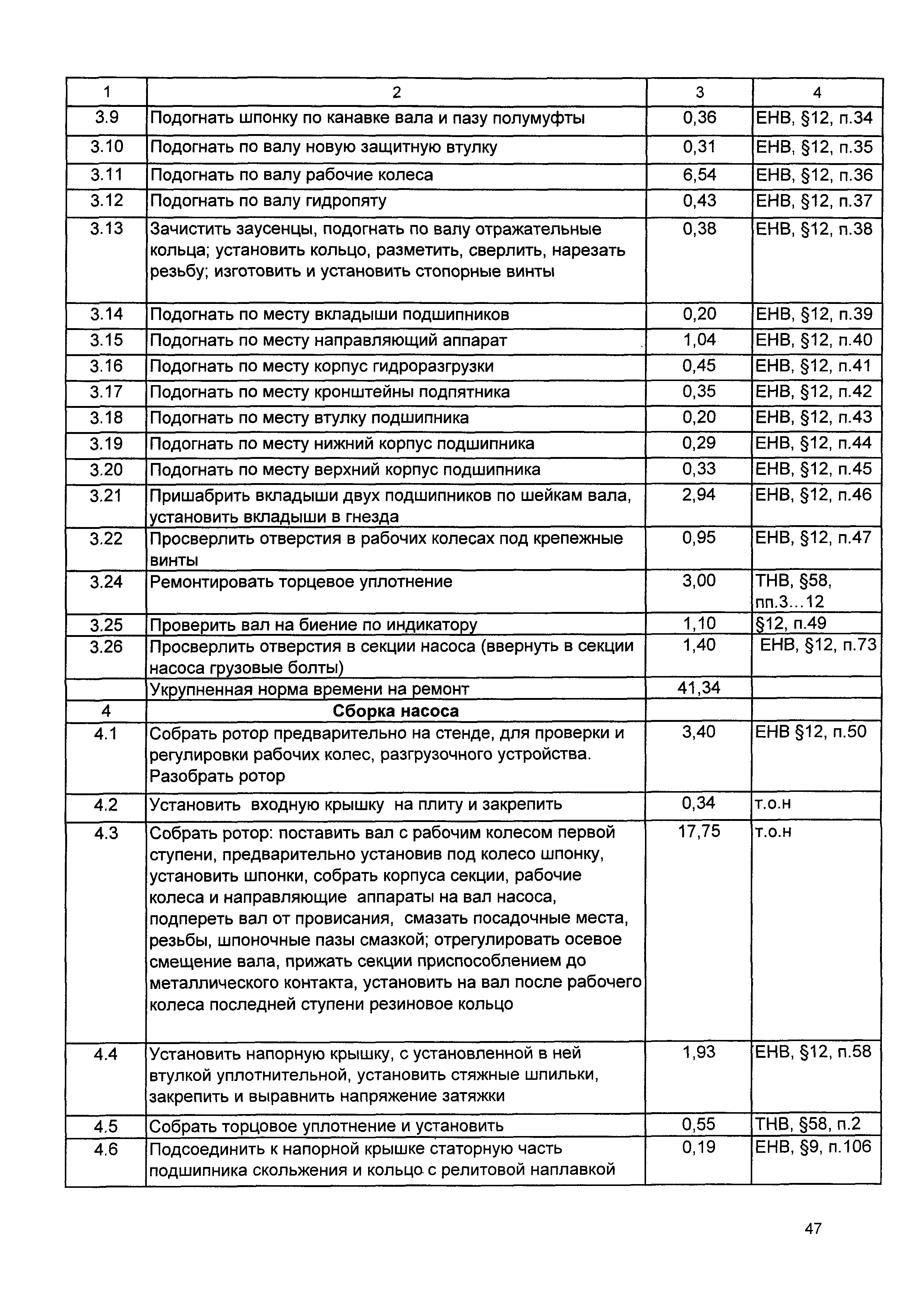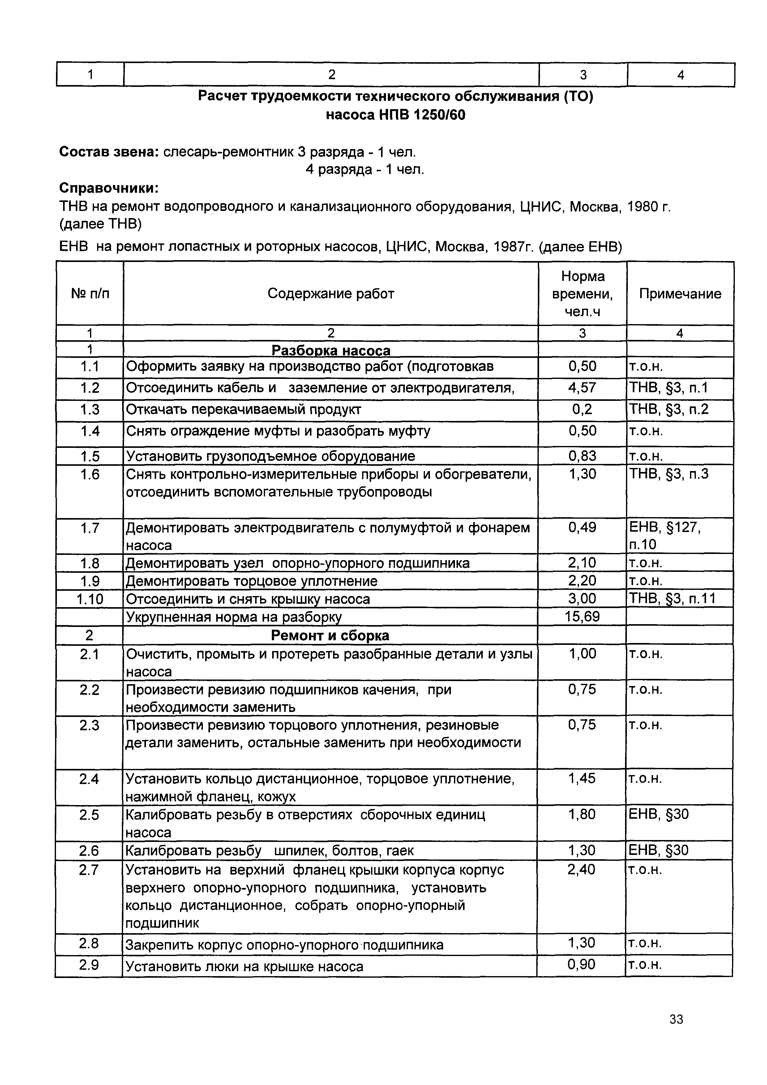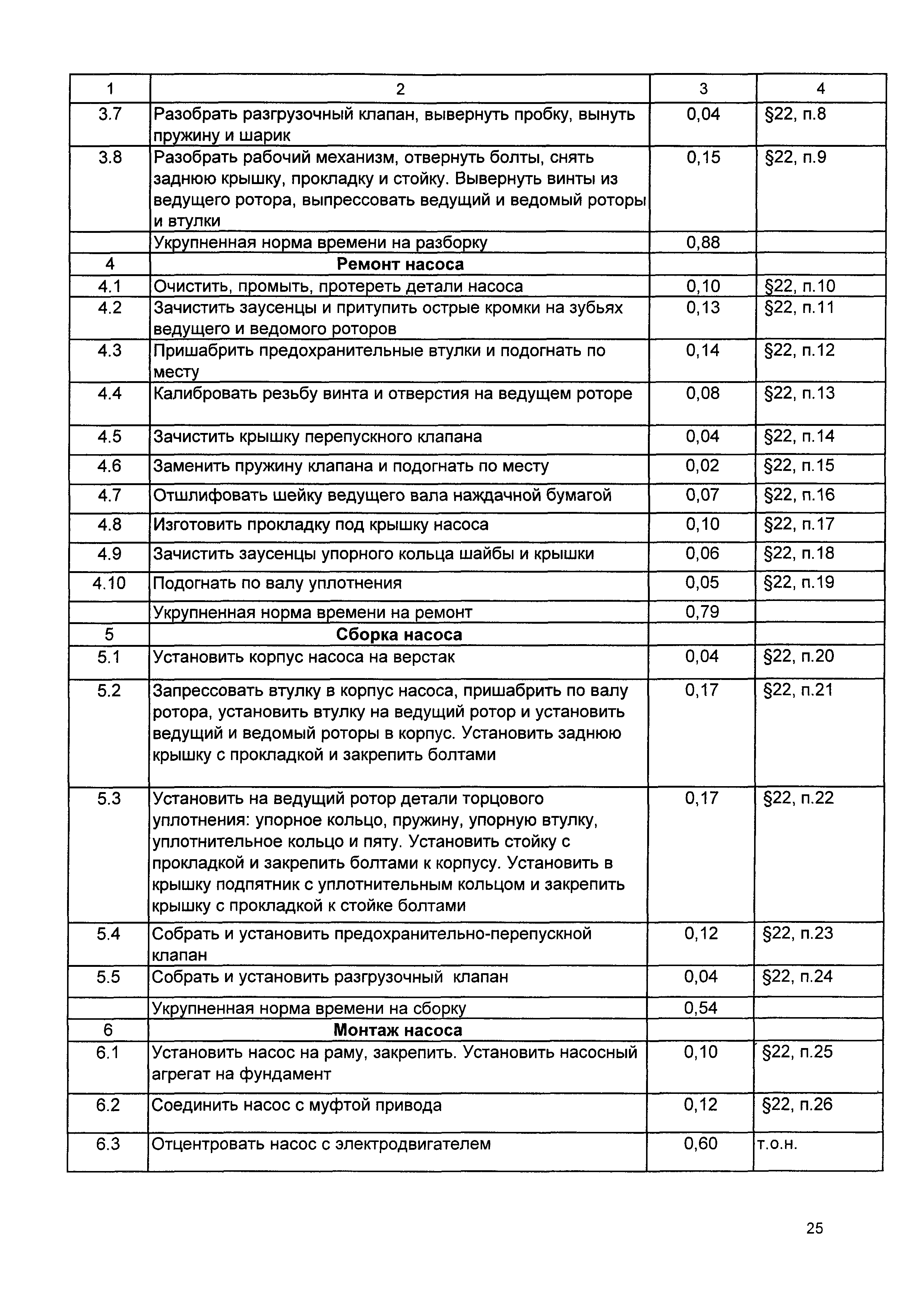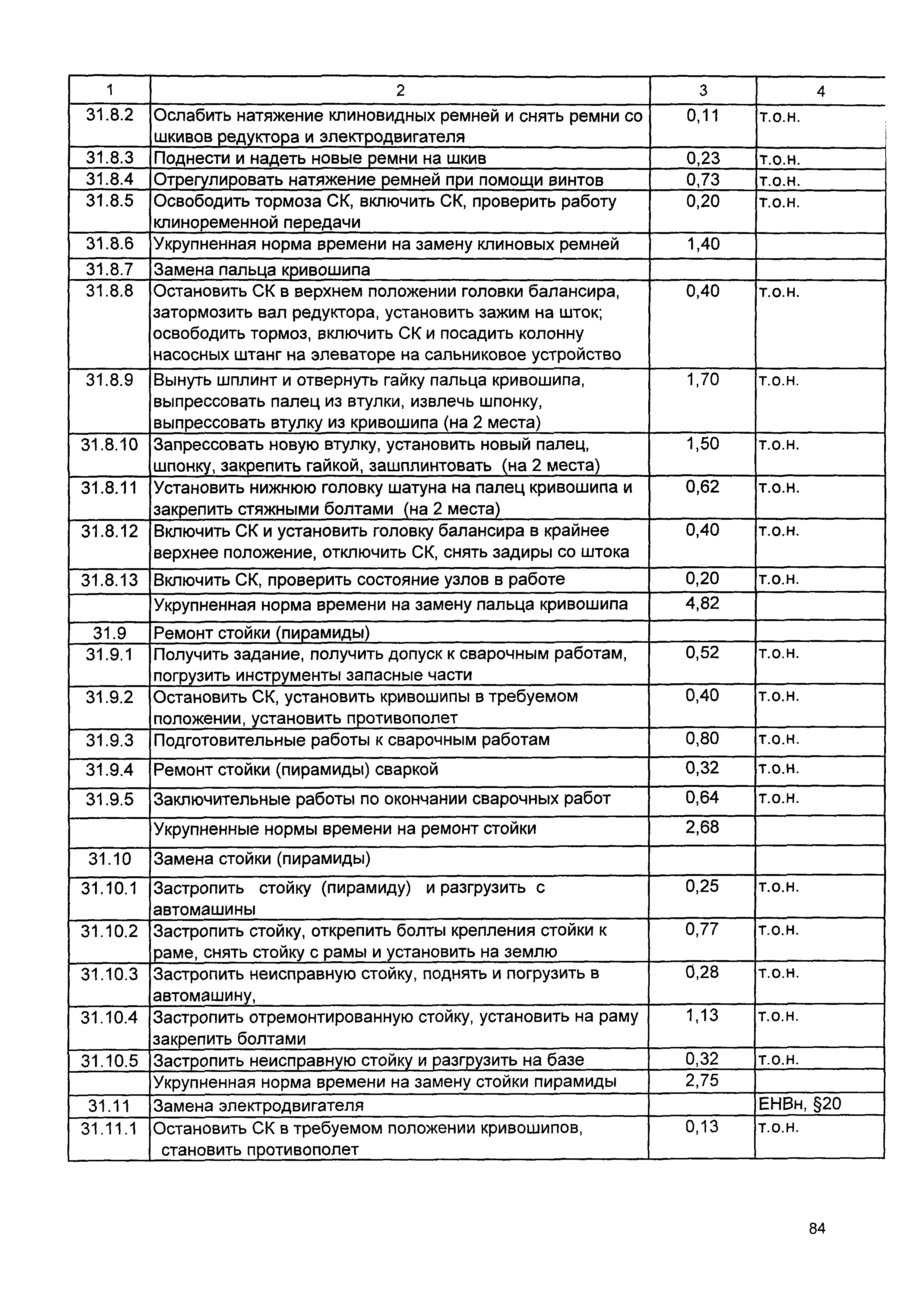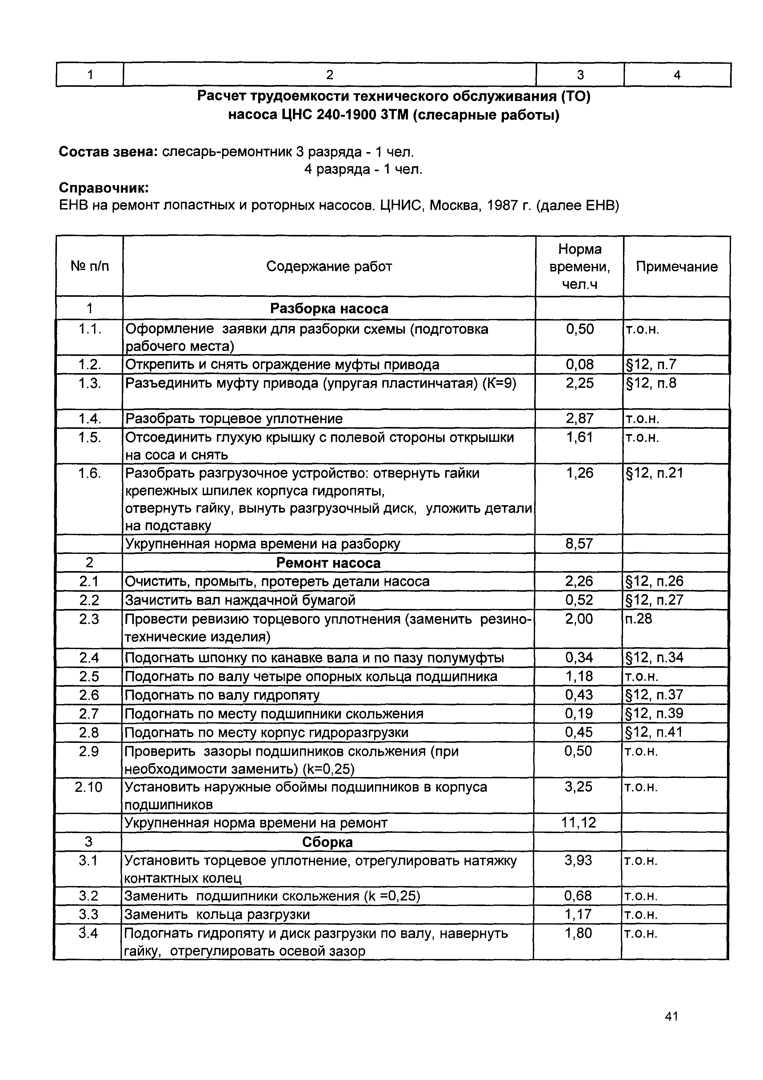 Нормы времени разработаны с учетом ранее действующих единых норм времени (ЕНВ), единого тарифно-квалификационного справочника по нефтяной промышленности и разработанных технологических карт технического обслуживания и ремонтов НПО. | | Оглавление: | Общие положения Насосы К8/18, К50/30 Насосы 1Д315-71, 1Д630-90…125, 1Д250-90…125 Насос НВ 50/50-СД Насосы Н8-25, НМШ5-25, НМШ8-25 Насос НС 160-45 Насос НПВ 1250/60 Насос ЦНС 240-1900 ЗТМ Насосы К80-50-200. К65-50-60, К100-65-200, К100-80-160-С-УХЛ Насос ЦНС 850 Насосы КМН 100-80-160, КМН 80-65-175 Насосы Х80-65-175, АХ65-45-200 Насос НК 210/200 Станки-качалки UP-9T, UP-12T ("VULCAN"), "LEGRAN", C-320 ("LUFKIN") | | Разработан: | ООО СПКТБ НЕФТЕГАЗМАШ