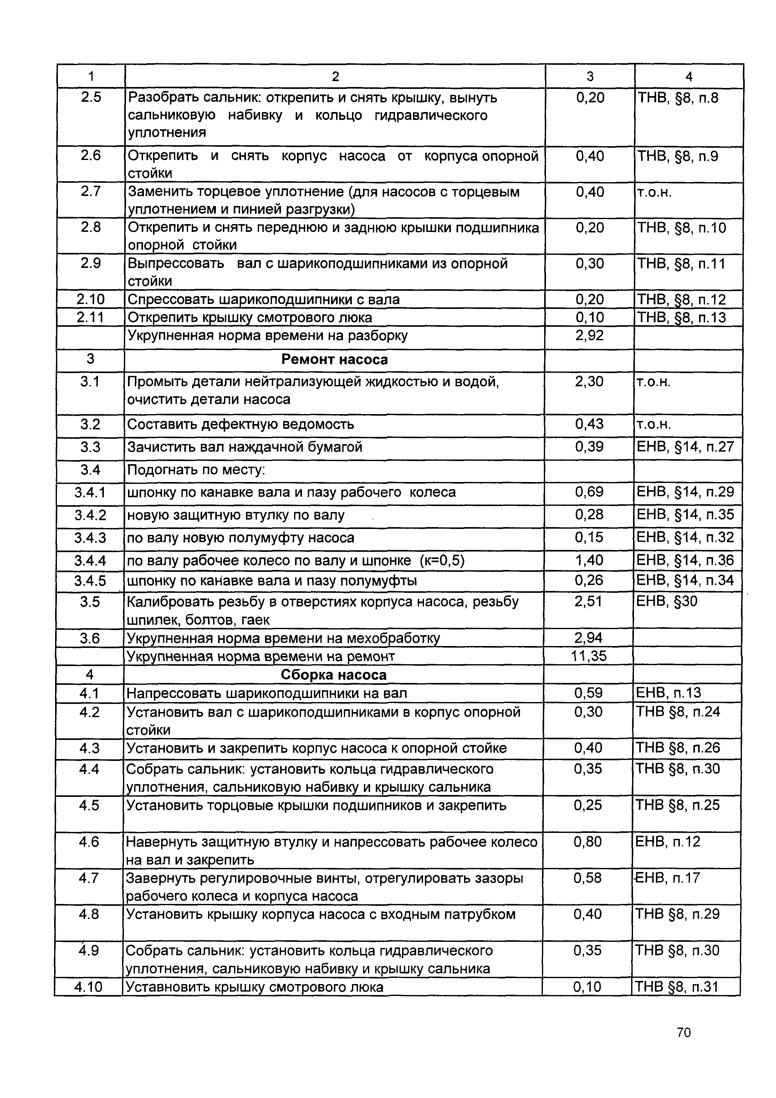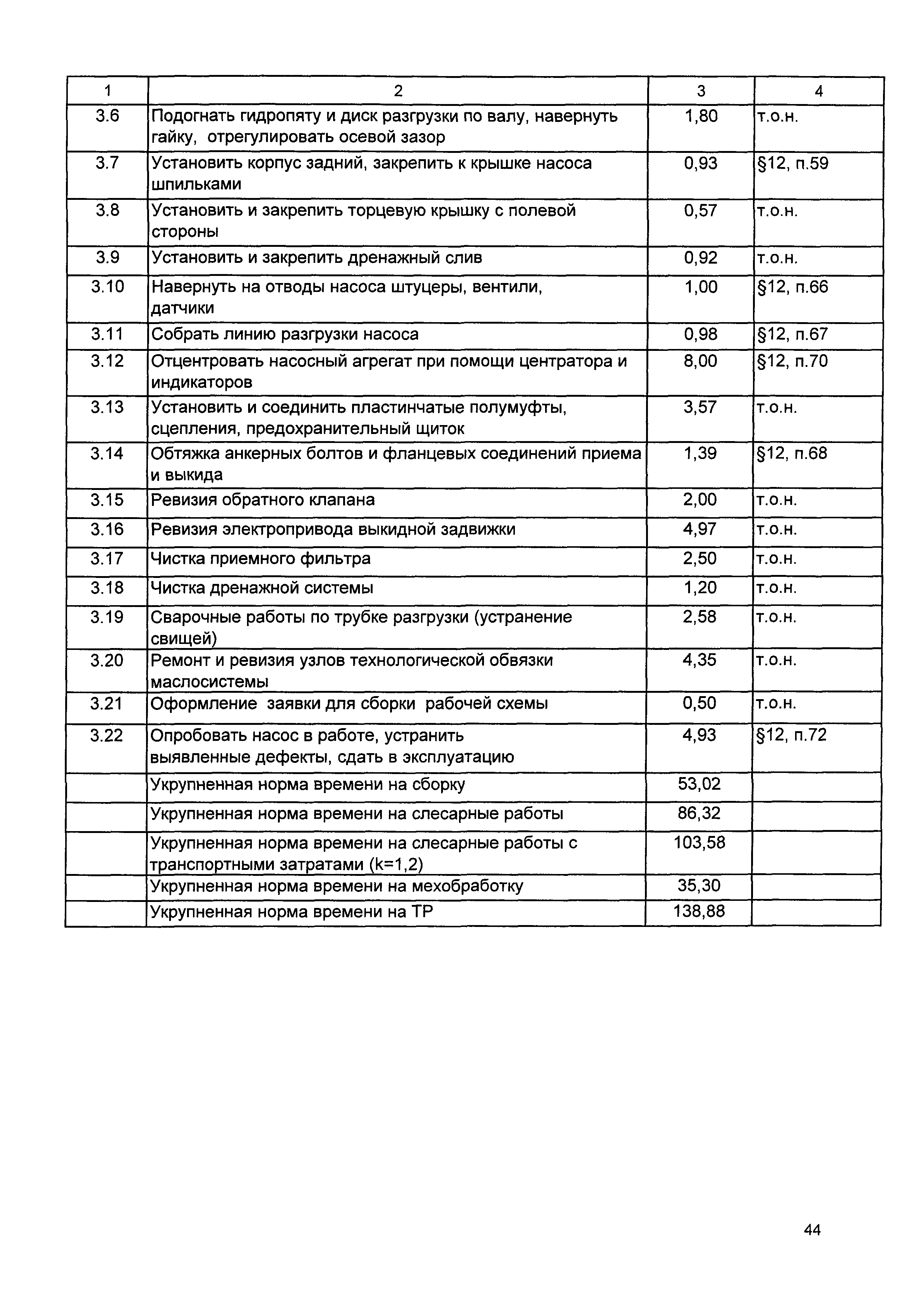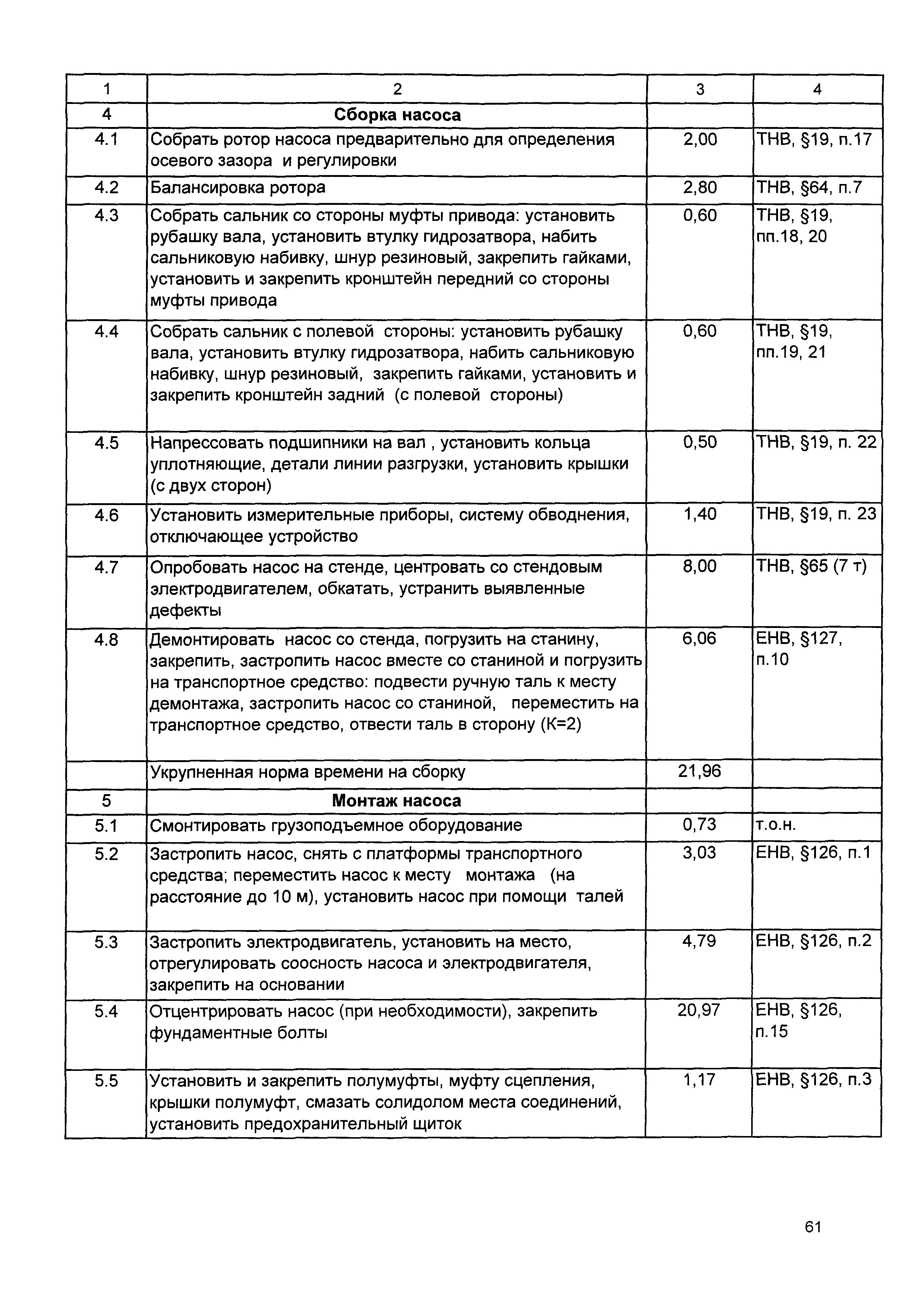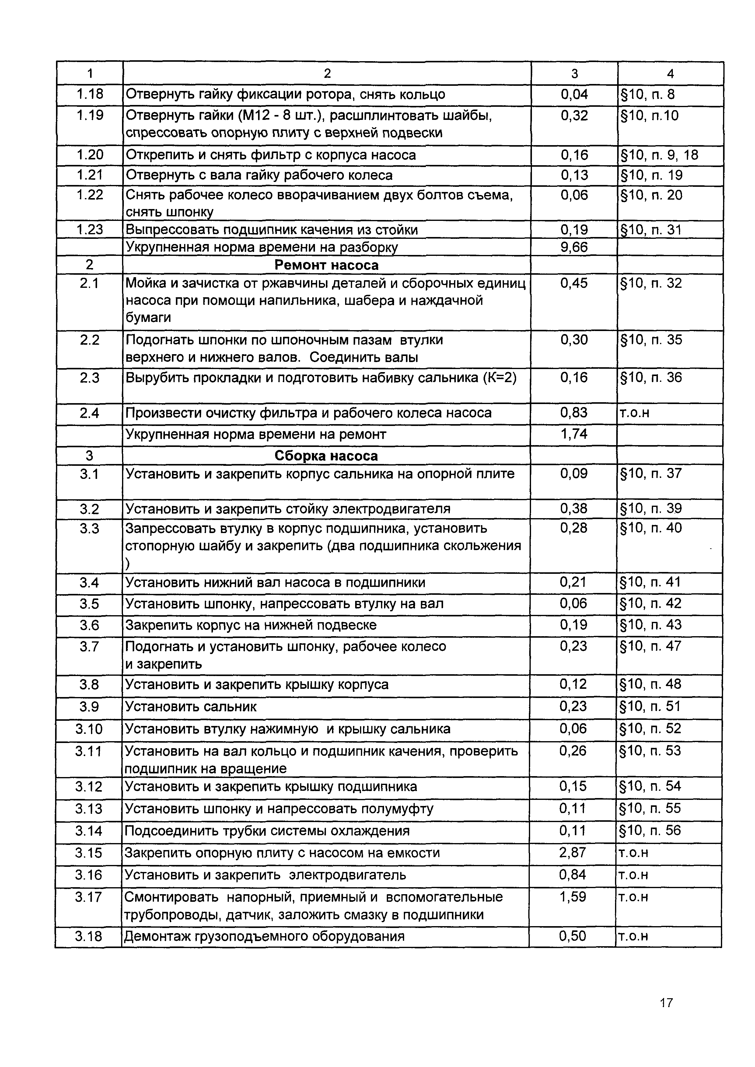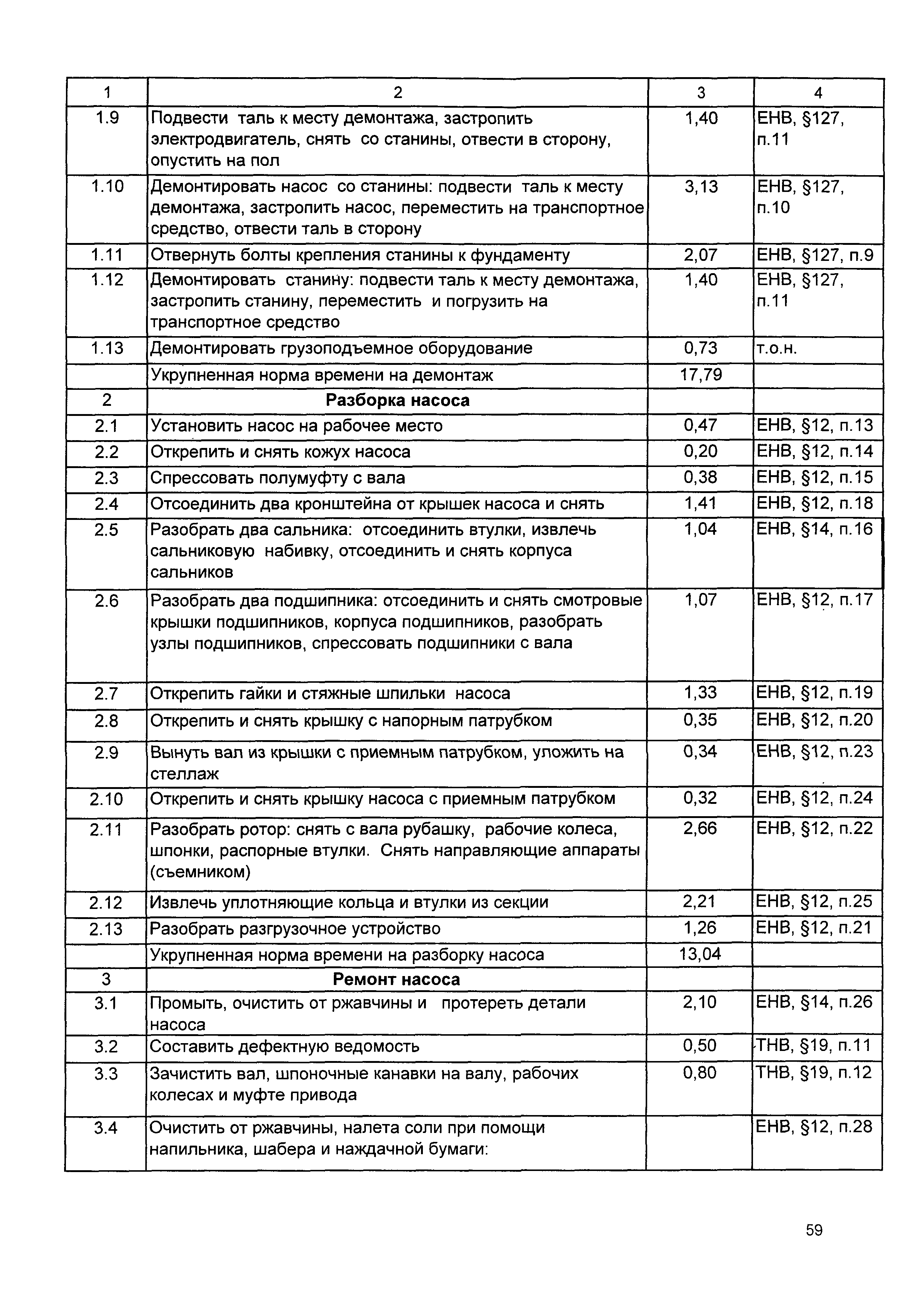 Нормы времени разработаны с учетом ранее действующих единых норм времени (ЕНВ), единого тарифно-квалификационного справочника по нефтяной промышленности и разработанных технологических карт технического обслуживания и ремонтов НПО. | | Оглавление: | Общие положения Насосы К8/18, К50/30 Насосы 1Д315-71, 1Д630-90…125, 1Д250-90…125 Насос НВ 50/50-СД Насосы Н8-25, НМШ5-25, НМШ8-25 Насос НС 160-45 Насос НПВ 1250/60 Насос ЦНС 240-1900 ЗТМ Насосы К80-50-200. К65-50-60, К100-65-200, К100-80-160-С-УХЛ Насос ЦНС 850 Насосы КМН 100-80-160, КМН 80-65-175 Насосы Х80-65-175, АХ65-45-200 Насос НК 210/200 Станки-качалки UP-9T, UP-12T ("VULCAN"), "LEGRAN", C-320 ("LUFKIN") | | Разработан: | ООО СПКТБ НЕФТЕГАЗМАШ