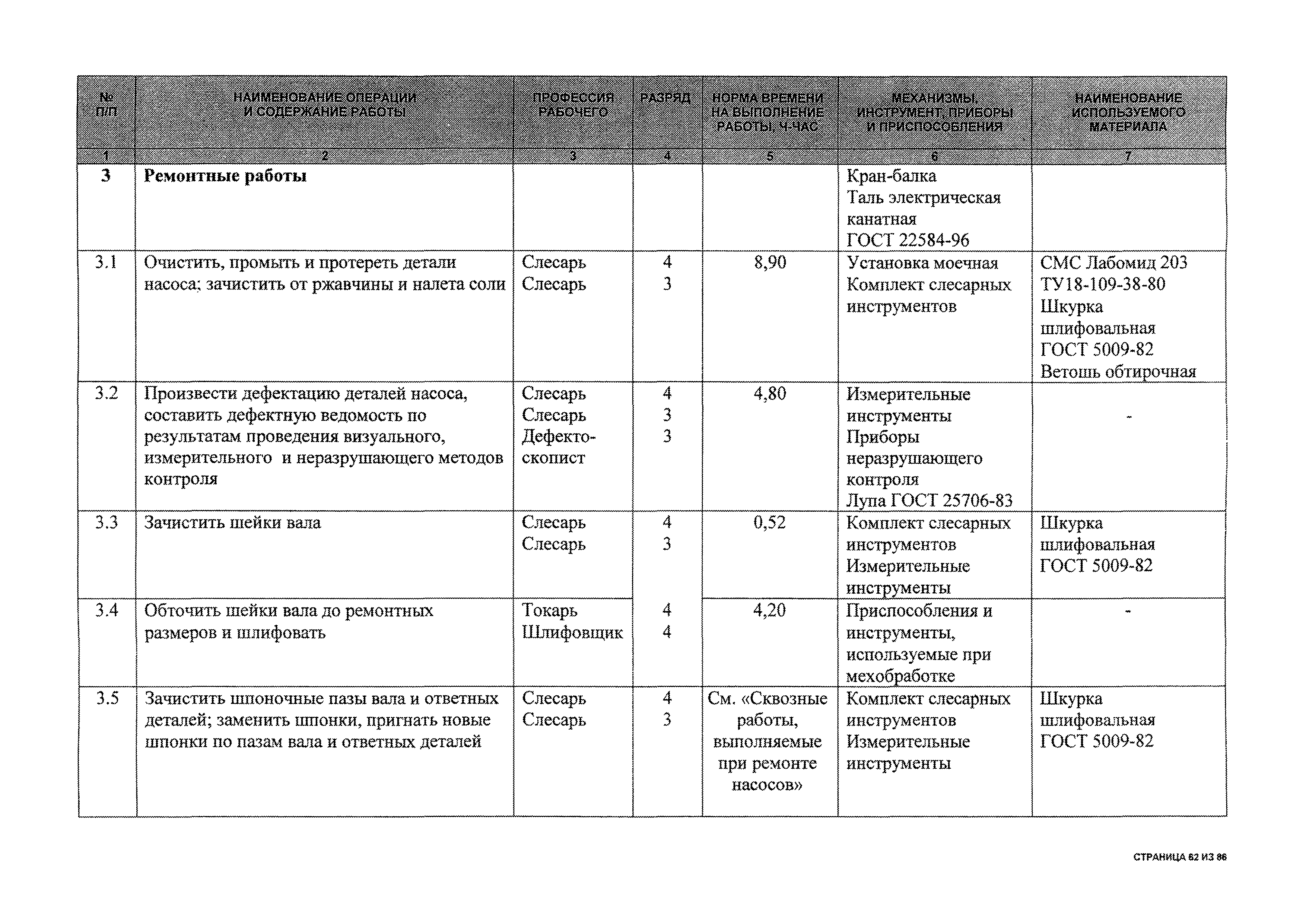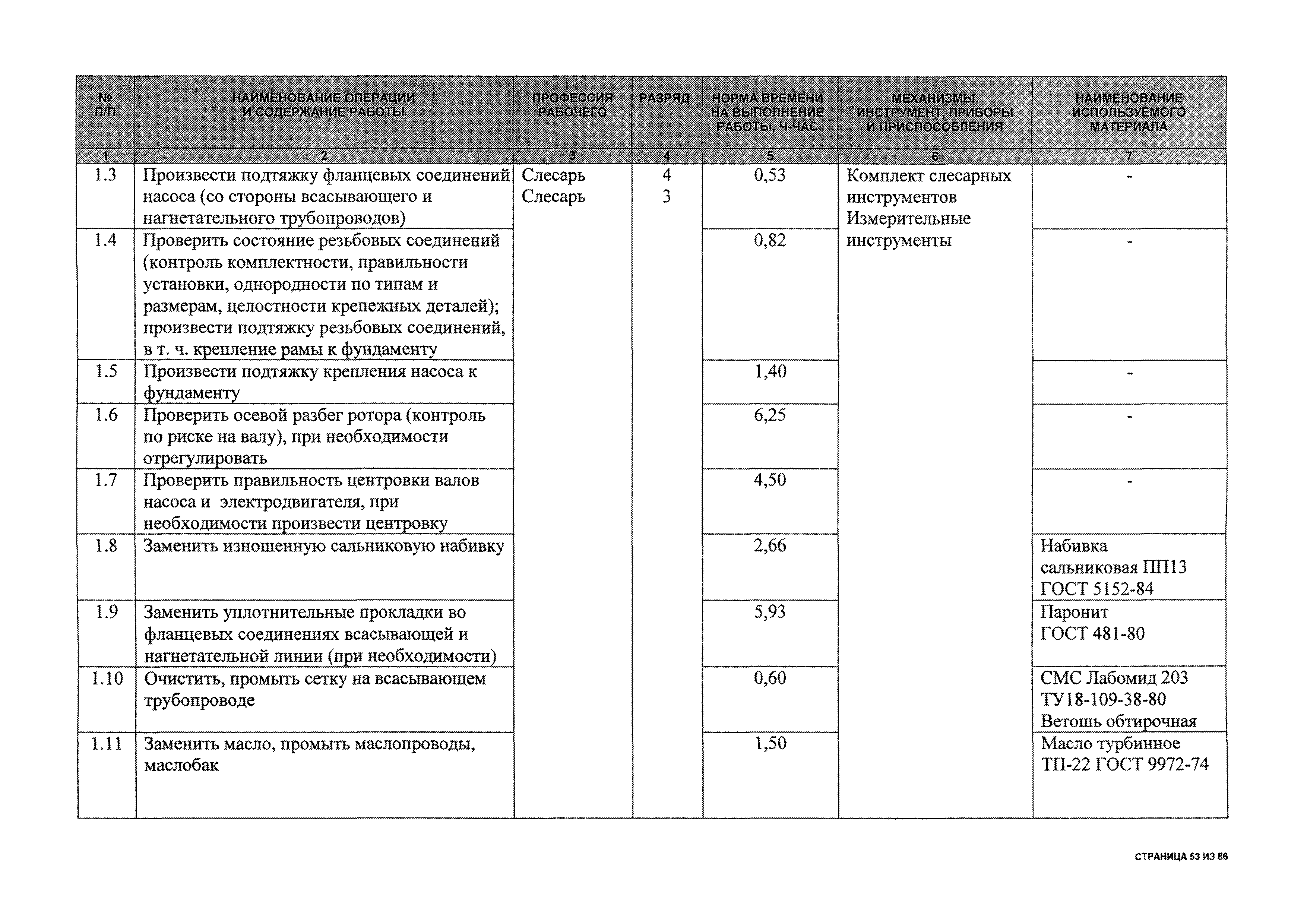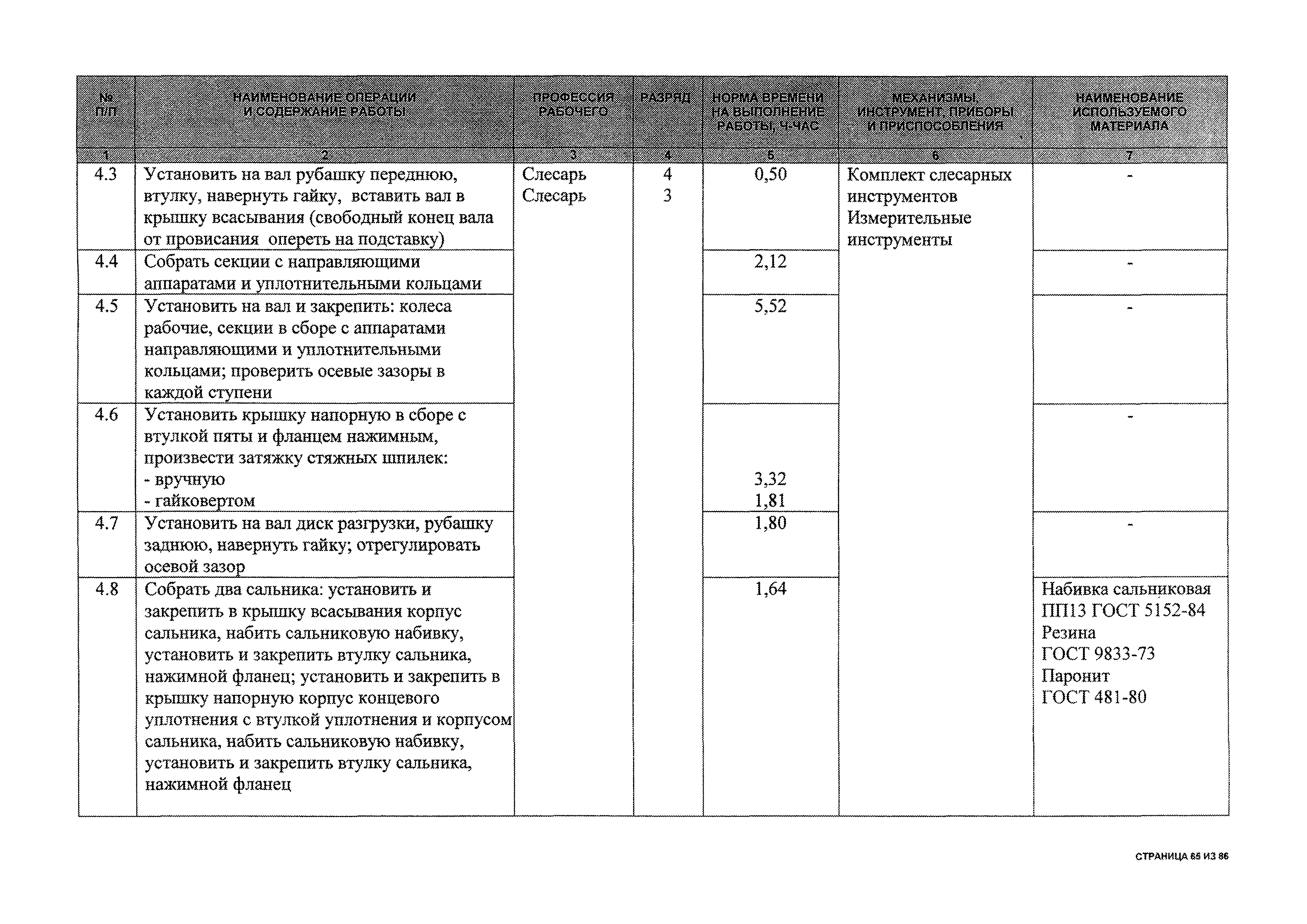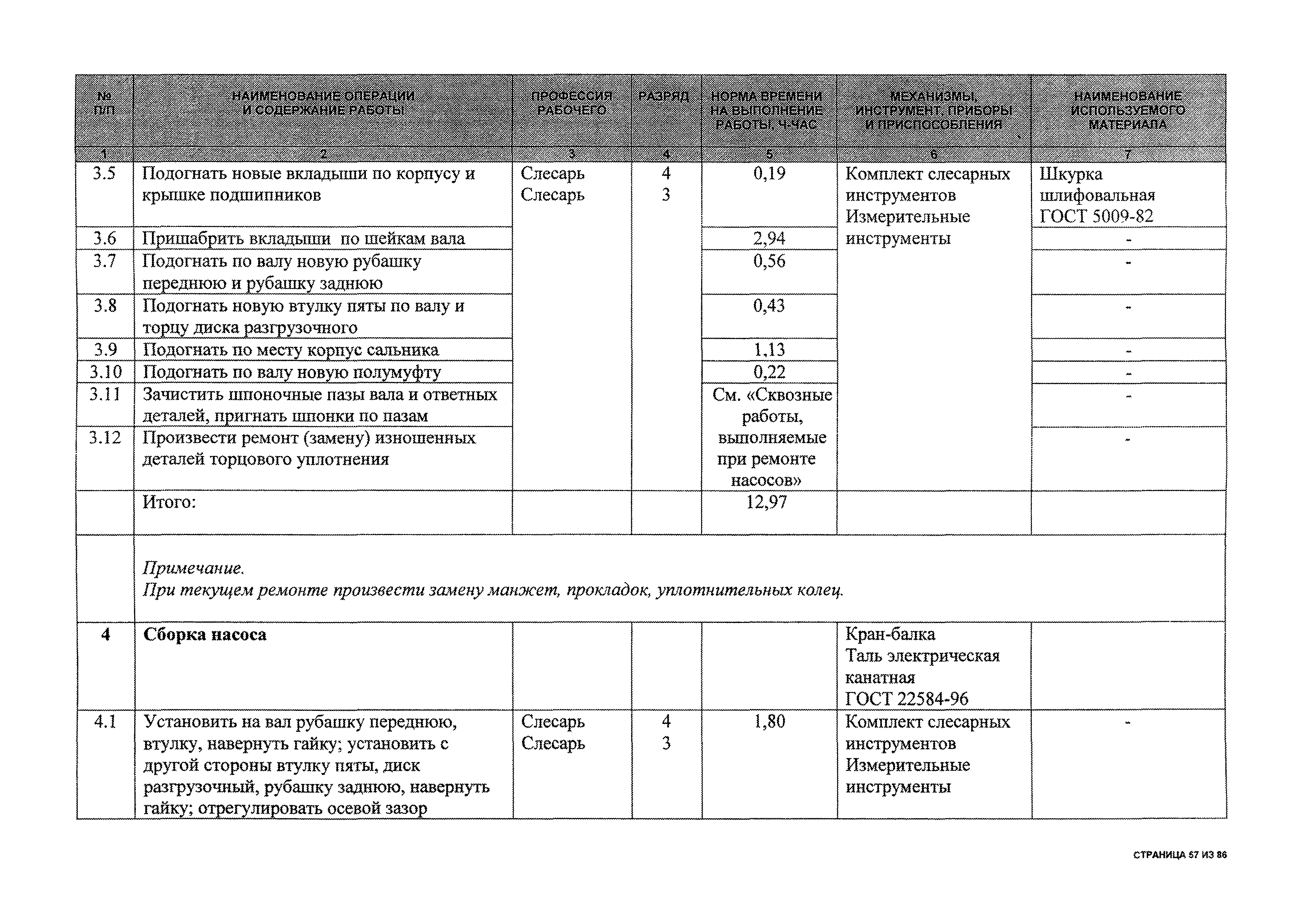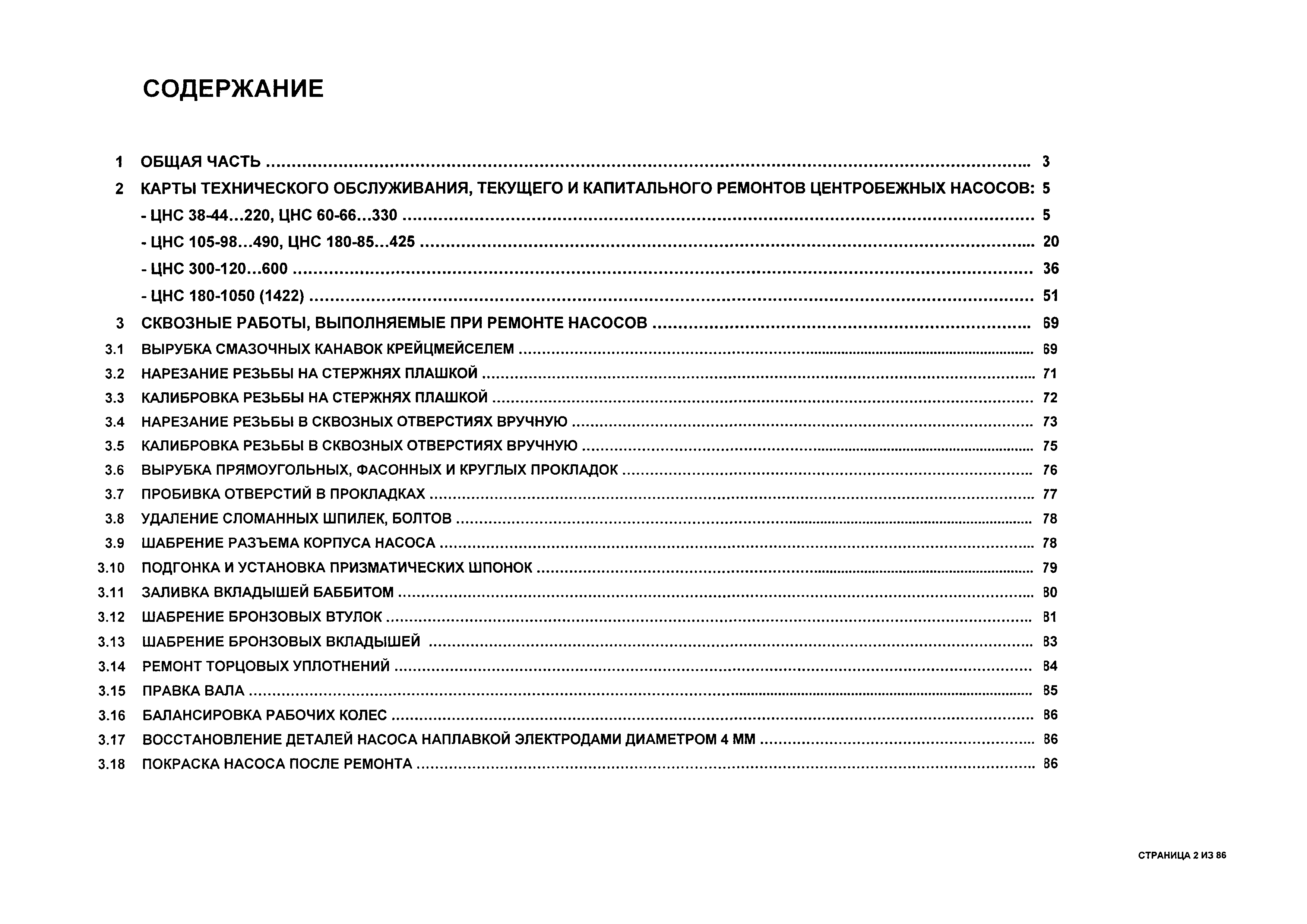 | Оглавление: | 1 Общая часть 2 Карты технического обслуживания, текущего и капитального ремонтов центробежных насосов: ЦНС 38-44…220, ЦНС 60-66…330 ЦНС105-98…490, ЦНС 180-85…425 ЦНС 300-120…600 ЦНС 180-1050 (1422) 3 Сквозные работы, выполняемые при ремонте насосов 3.1 Вырубка смазочных канавок крейцмейселем 3.2 Нарезание резьбы на стержнях плашкой 3.3 Калибровка резьбы на стержнях плашкой 3.4 Нарезание резьбы в сквозных отверстиях вручную 3.5 Калибровка резьбы в сквозных отверстиях вручную 3.6 Вырубка прямоугольных, фасонных и круглых прокладок 3.7 Пробивка отверстий в прокладках 3.8 Удаление сломанных шпилек, болтов 3.9 Шабрение разъема корпуса насоса 3.10 Подгонка и установка призматических шпонок 3.11 Заливка вкладышей баббитом 3.12 Шабрение бронзовых втулок 3.13 Шабрение бронзовых вкладышей 3.14 Ремонт торцовых уплотнений 3.15 Правка вала 3.16 Балансировка рабочих колес 3.17 Восстановление деталей насоса наплавкой электродами диаметром 4 мм 3.18 Покраска насоса после ремонта |