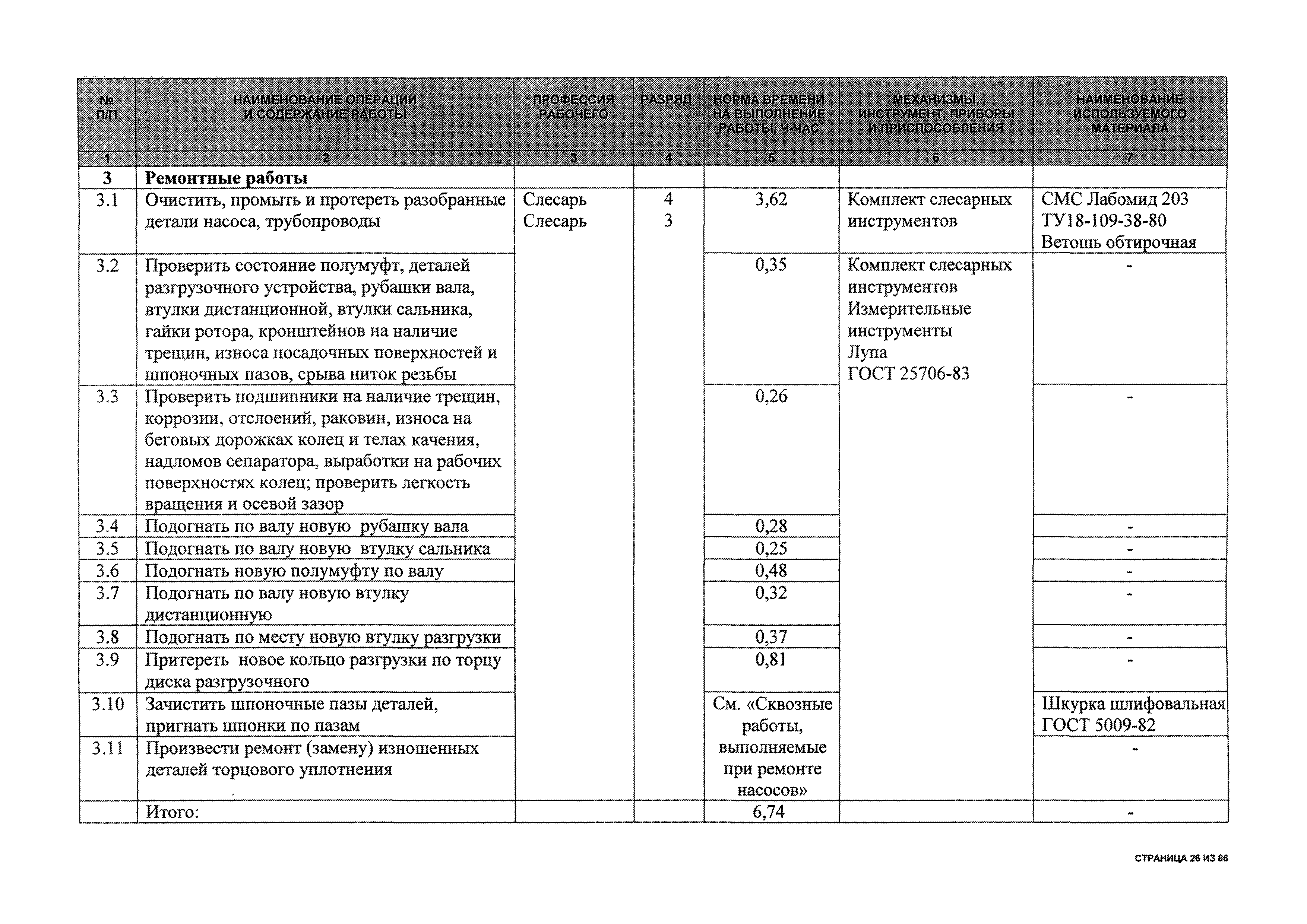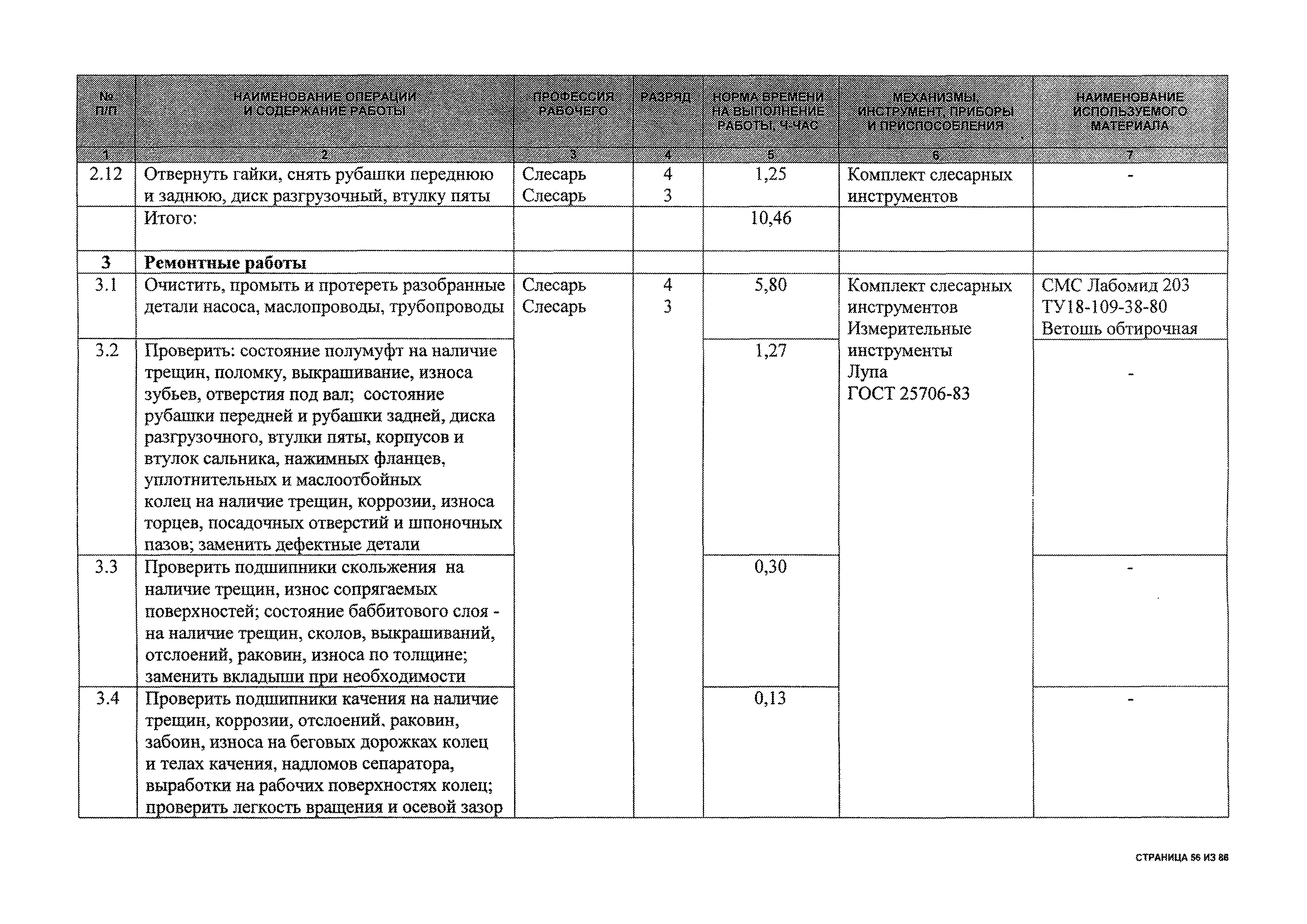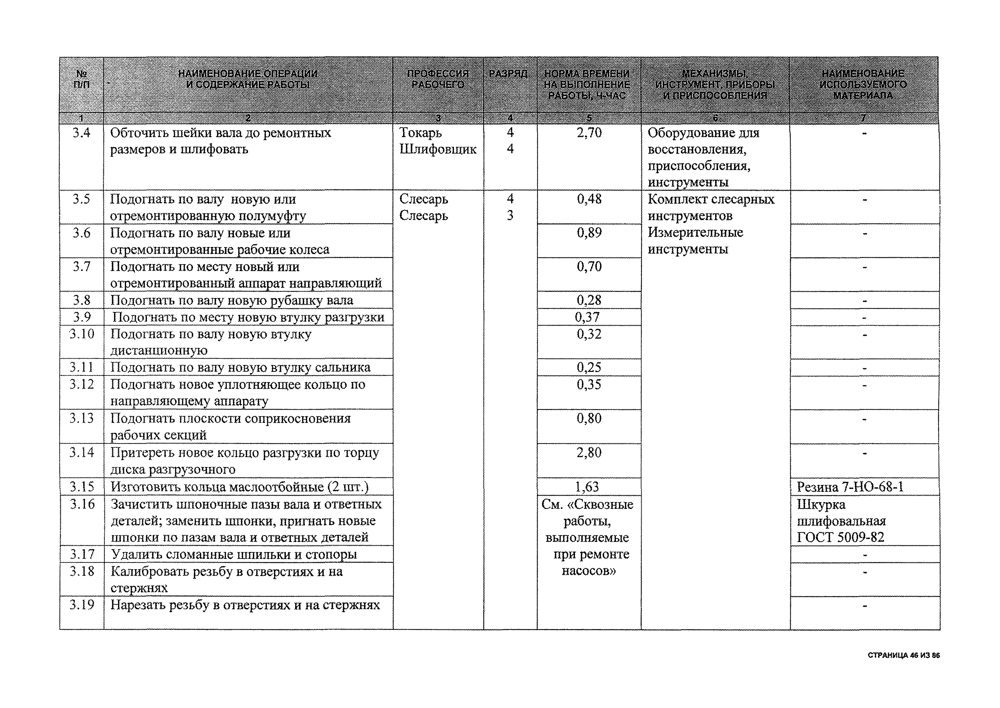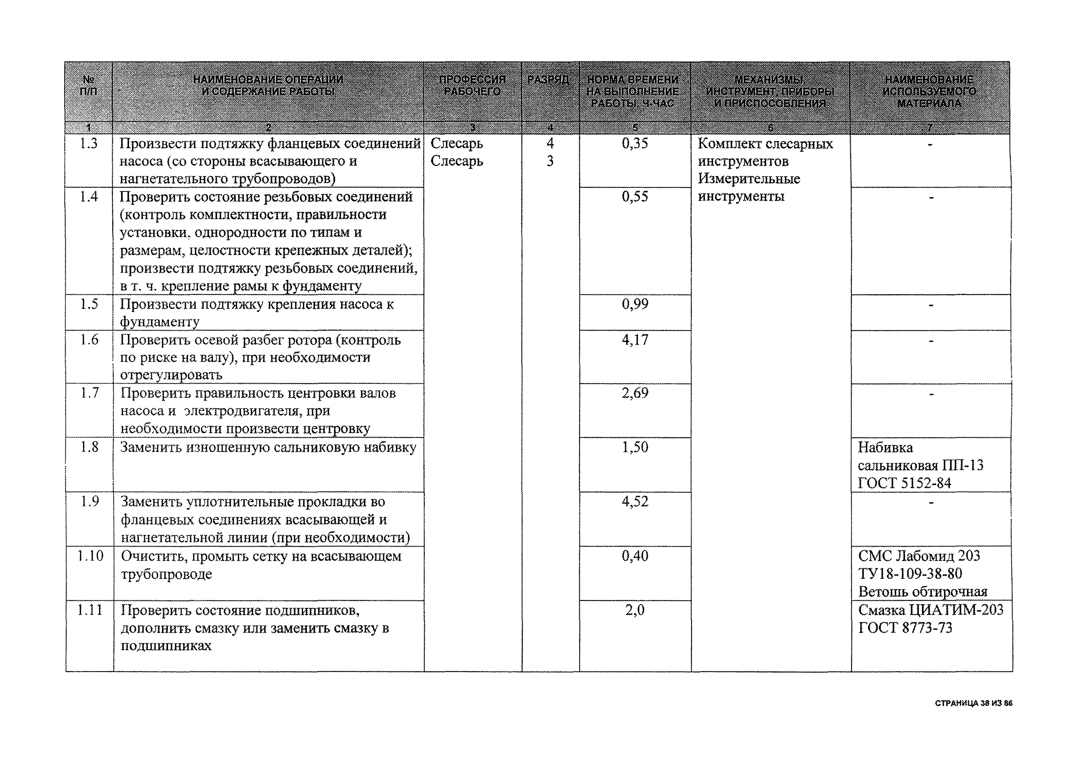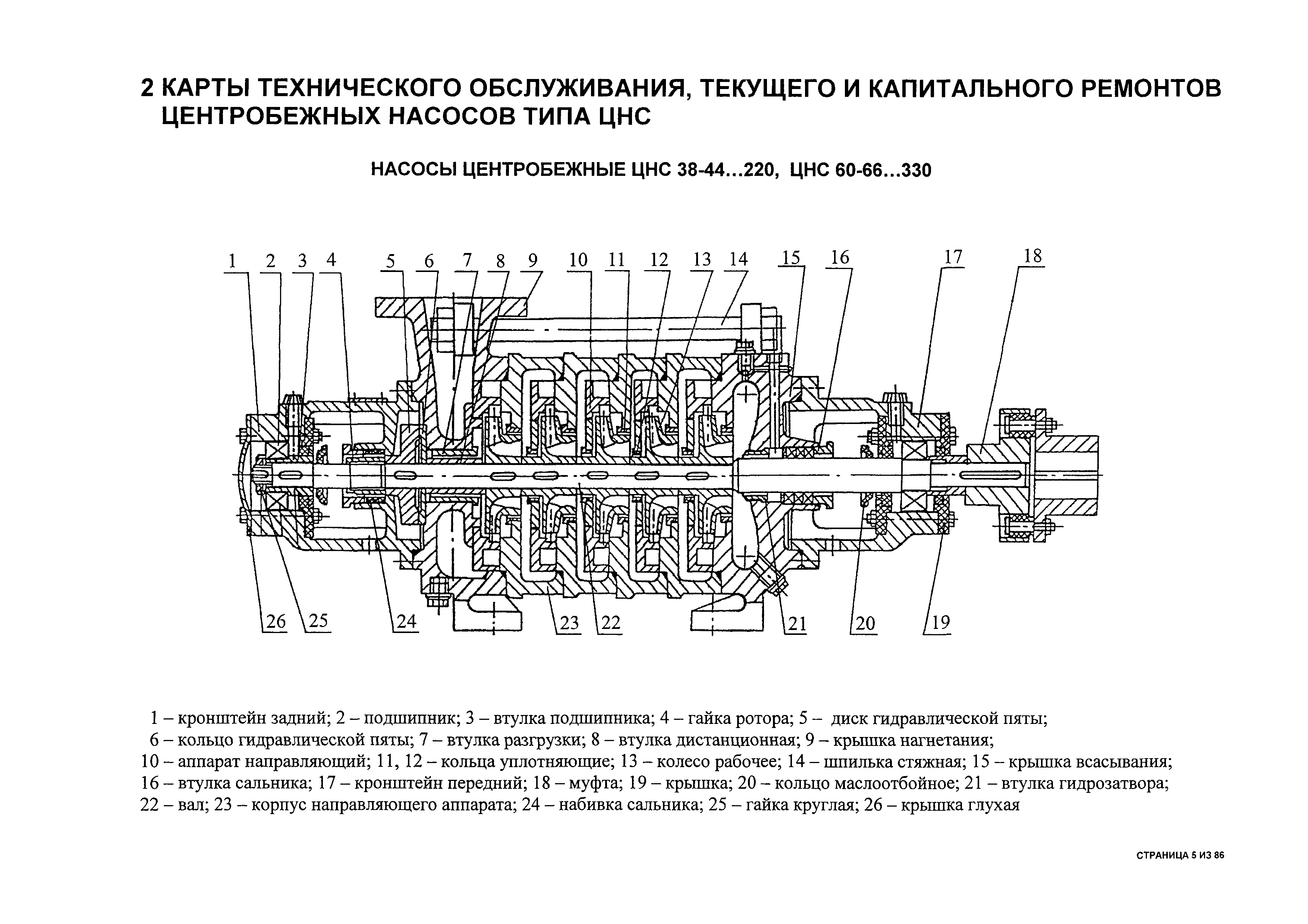 | Оглавление: | 1 Общая часть 2 Карты технического обслуживания, текущего и капитального ремонтов центробежных насосов: ЦНС 38-44…220, ЦНС 60-66…330 ЦНС105-98…490, ЦНС 180-85…425 ЦНС 300-120…600 ЦНС 180-1050 (1422) 3 Сквозные работы, выполняемые при ремонте насосов 3.1 Вырубка смазочных канавок крейцмейселем 3.2 Нарезание резьбы на стержнях плашкой 3.3 Калибровка резьбы на стержнях плашкой 3.4 Нарезание резьбы в сквозных отверстиях вручную 3.5 Калибровка резьбы в сквозных отверстиях вручную 3.6 Вырубка прямоугольных, фасонных и круглых прокладок 3.7 Пробивка отверстий в прокладках 3.8 Удаление сломанных шпилек, болтов 3.9 Шабрение разъема корпуса насоса 3.10 Подгонка и установка призматических шпонок 3.11 Заливка вкладышей баббитом 3.12 Шабрение бронзовых втулок 3.13 Шабрение бронзовых вкладышей 3.14 Ремонт торцовых уплотнений 3.15 Правка вала 3.16 Балансировка рабочих колес 3.17 Восстановление деталей насоса наплавкой электродами диаметром 4 мм 3.18 Покраска насоса после ремонта |