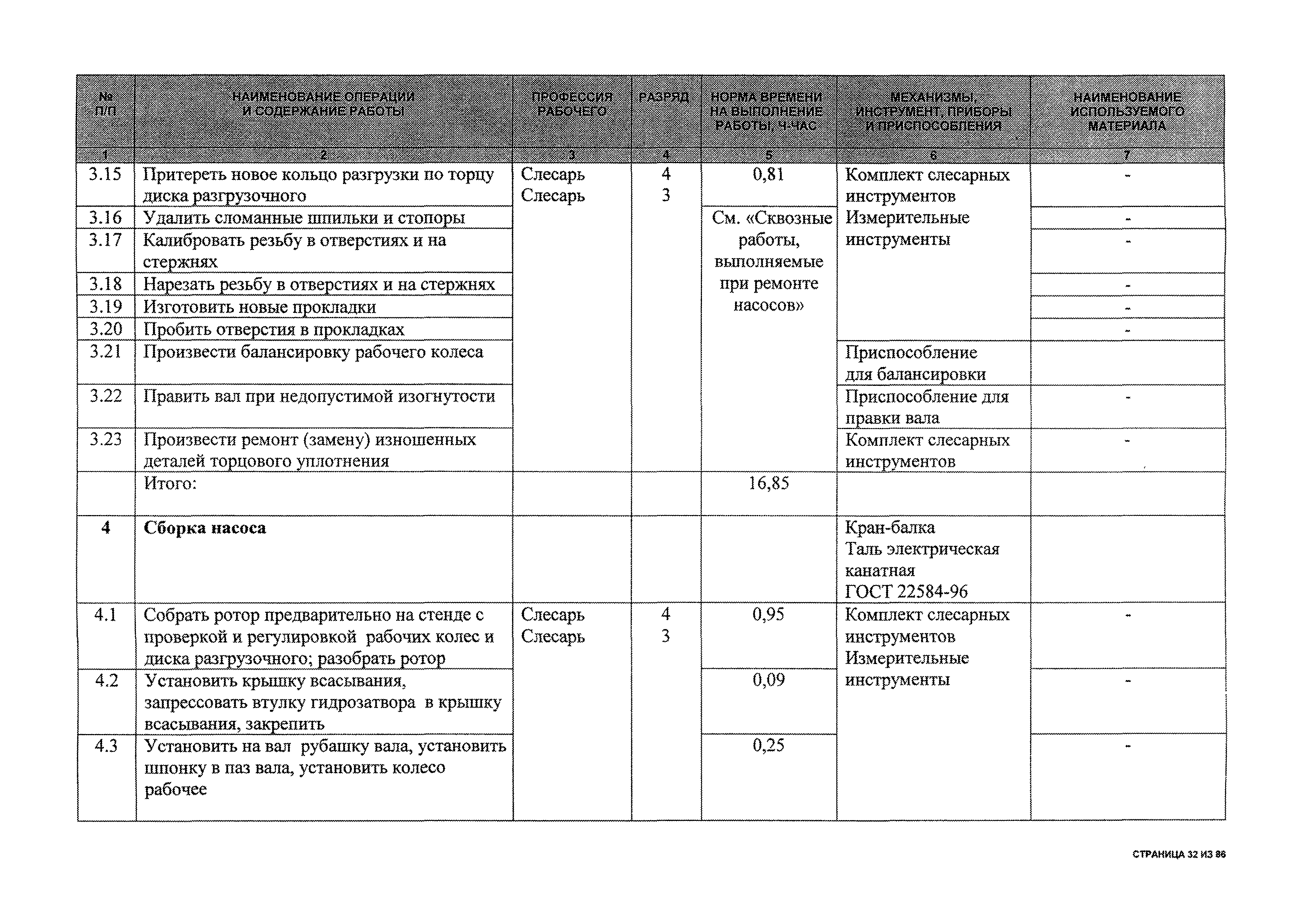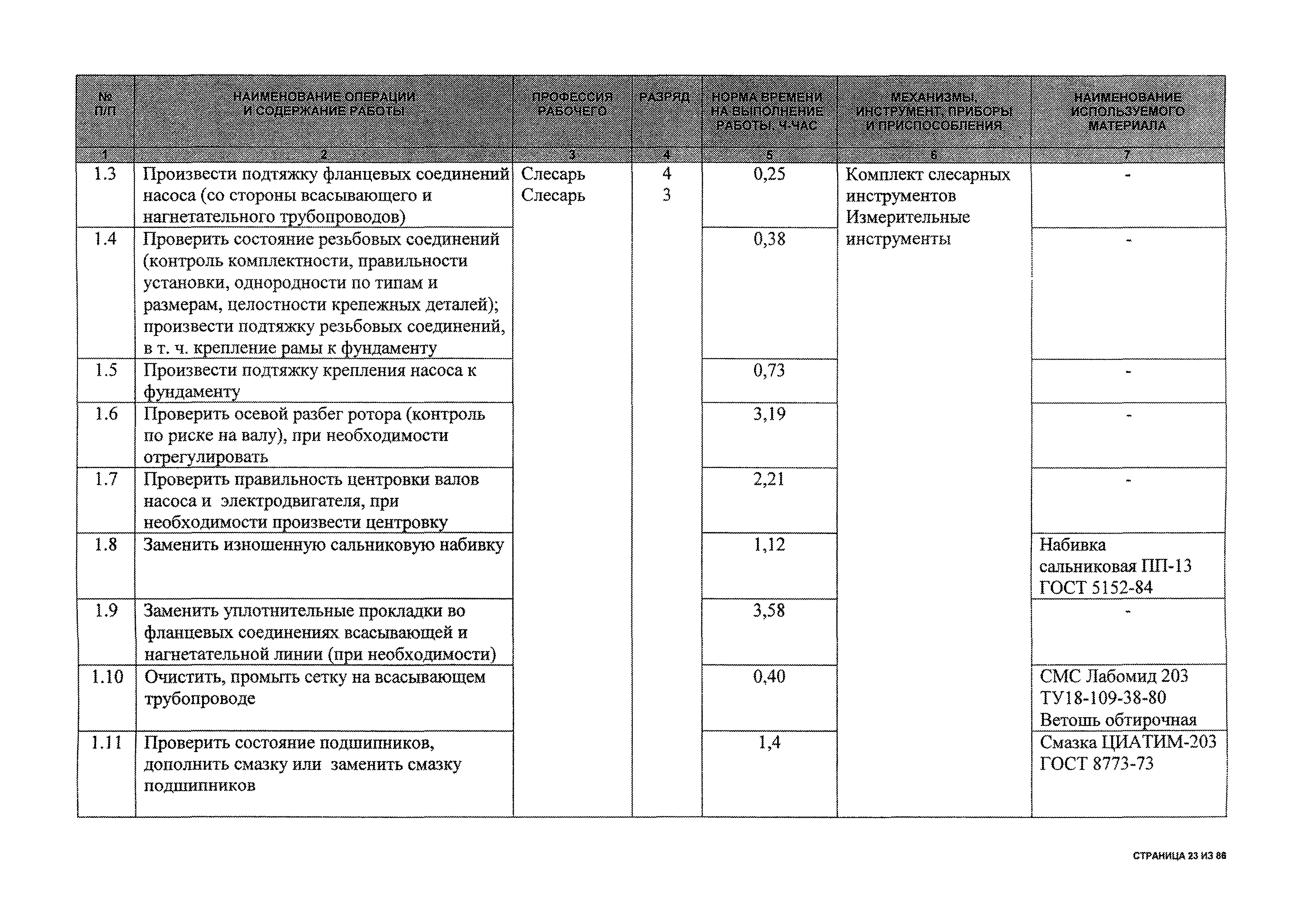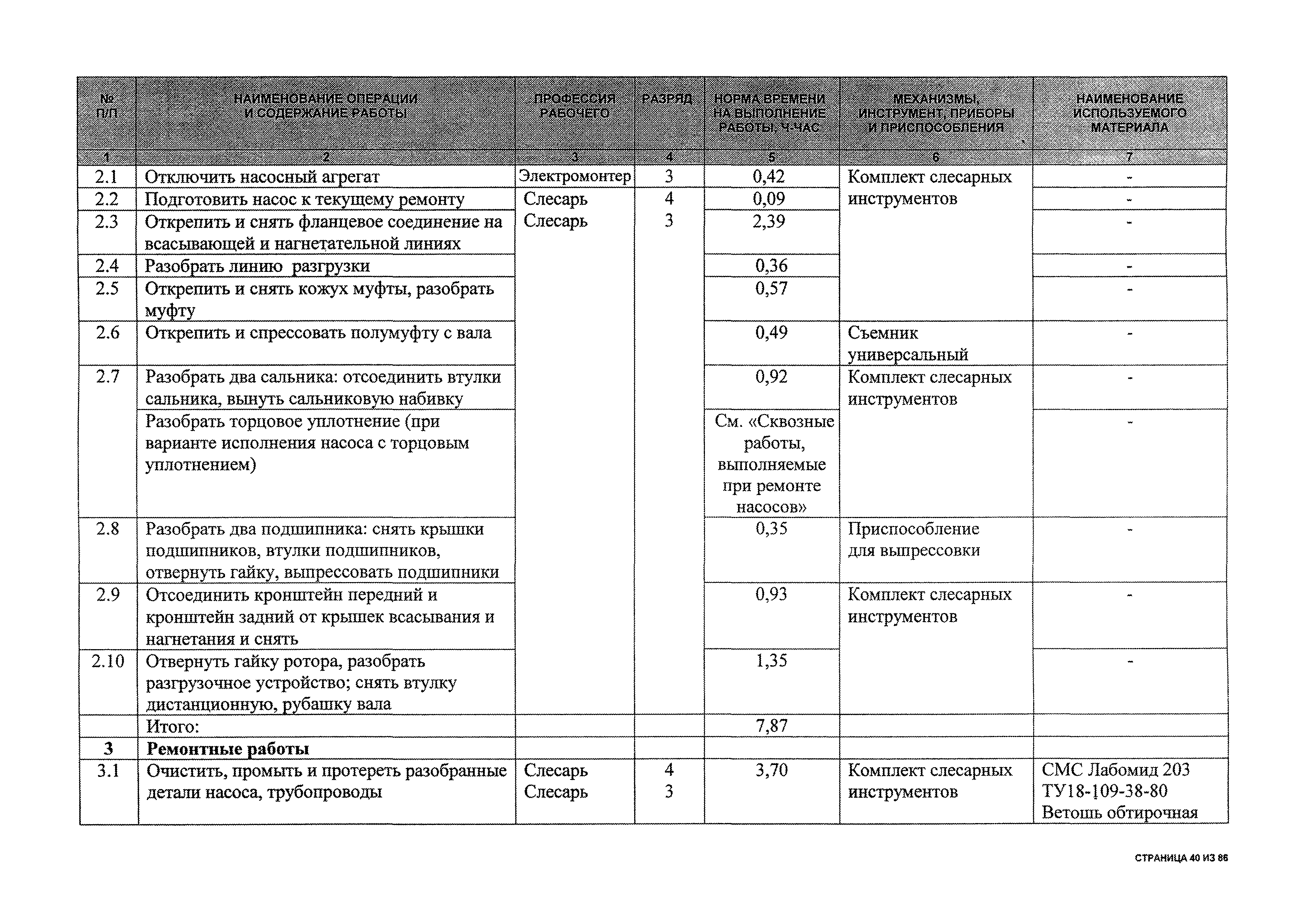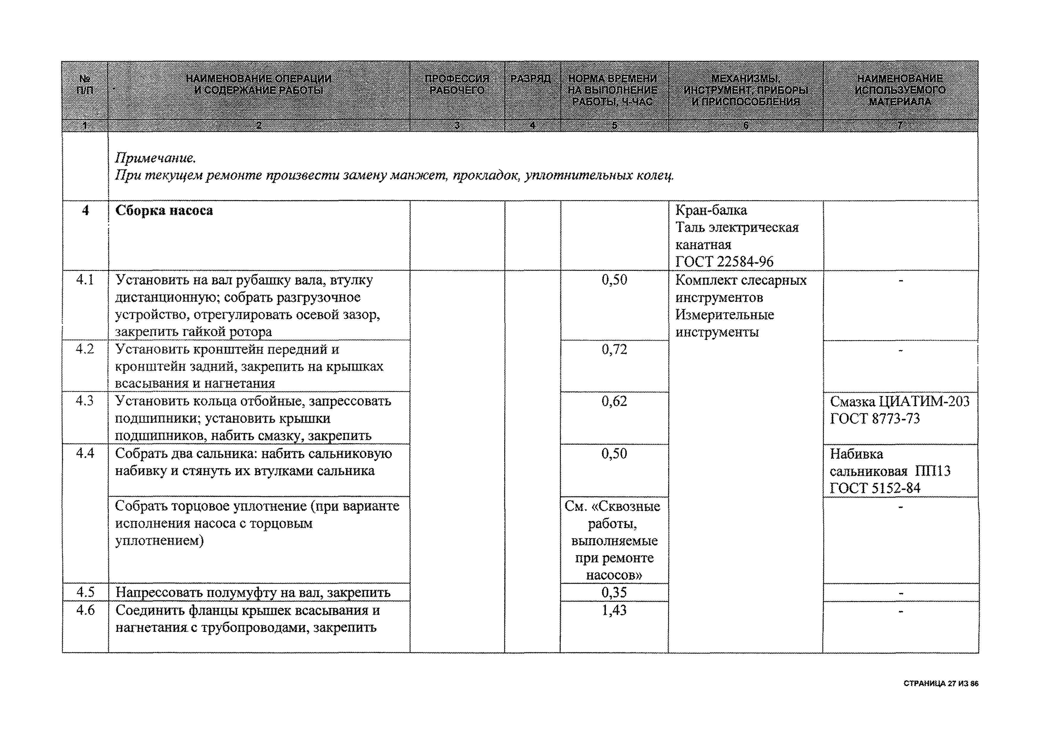 | Оглавление: | 1 Общая часть 2 Карты технического обслуживания, текущего и капитального ремонтов центробежных насосов: ЦНС 38-44…220, ЦНС 60-66…330 ЦНС105-98…490, ЦНС 180-85…425 ЦНС 300-120…600 ЦНС 180-1050 (1422) 3 Сквозные работы, выполняемые при ремонте насосов 3.1 Вырубка смазочных канавок крейцмейселем 3.2 Нарезание резьбы на стержнях плашкой 3.3 Калибровка резьбы на стержнях плашкой 3.4 Нарезание резьбы в сквозных отверстиях вручную 3.5 Калибровка резьбы в сквозных отверстиях вручную 3.6 Вырубка прямоугольных, фасонных и круглых прокладок 3.7 Пробивка отверстий в прокладках 3.8 Удаление сломанных шпилек, болтов 3.9 Шабрение разъема корпуса насоса 3.10 Подгонка и установка призматических шпонок 3.11 Заливка вкладышей баббитом 3.12 Шабрение бронзовых втулок 3.13 Шабрение бронзовых вкладышей 3.14 Ремонт торцовых уплотнений 3.15 Правка вала 3.16 Балансировка рабочих колес 3.17 Восстановление деталей насоса наплавкой электродами диаметром 4 мм 3.18 Покраска насоса после ремонта |