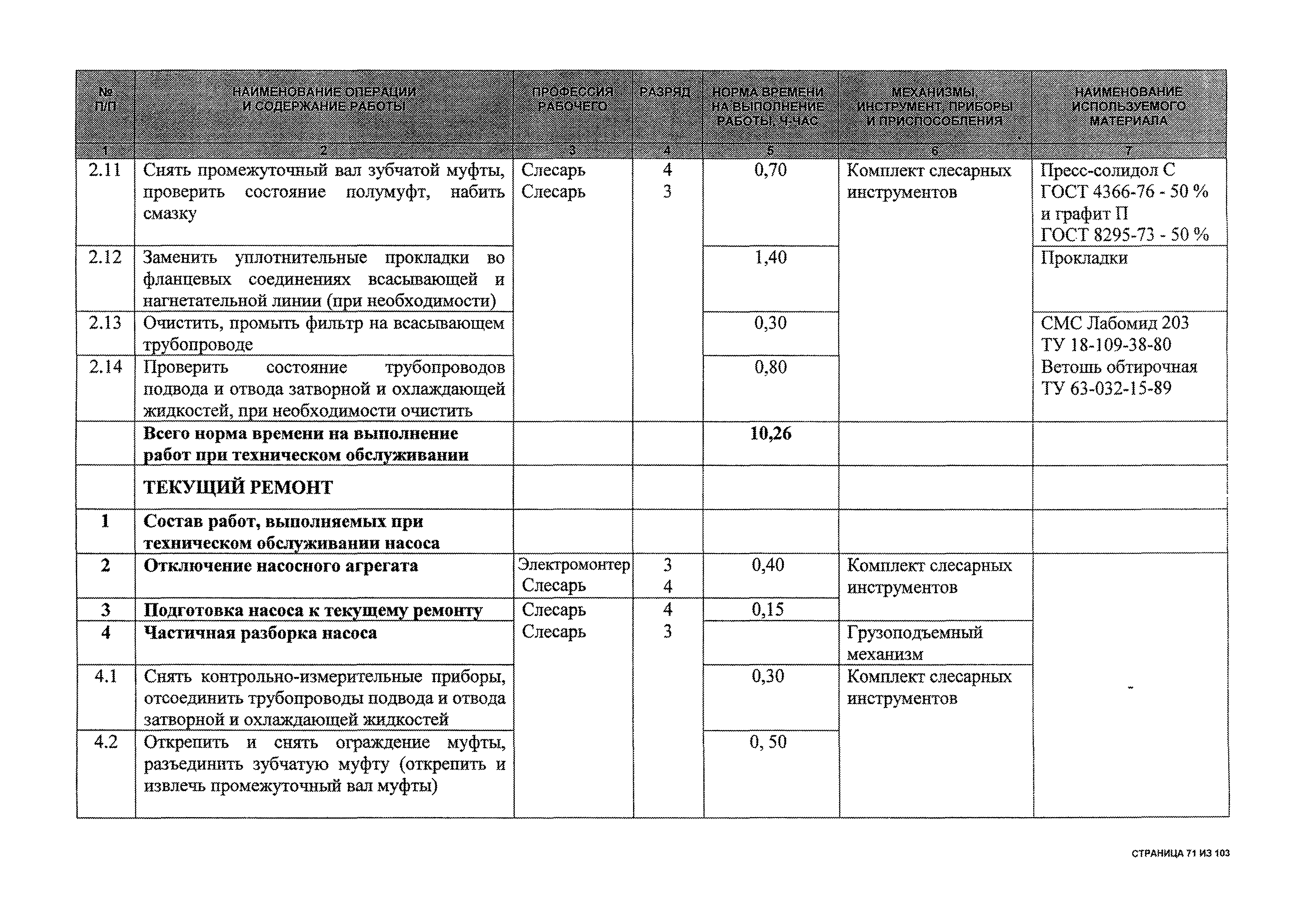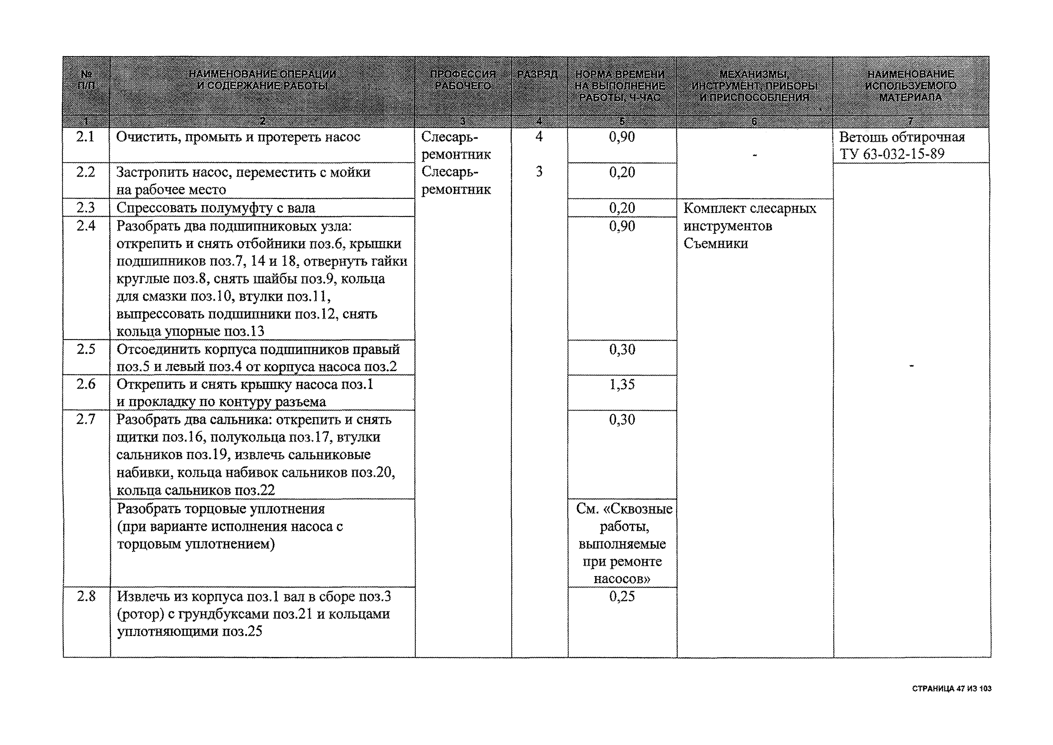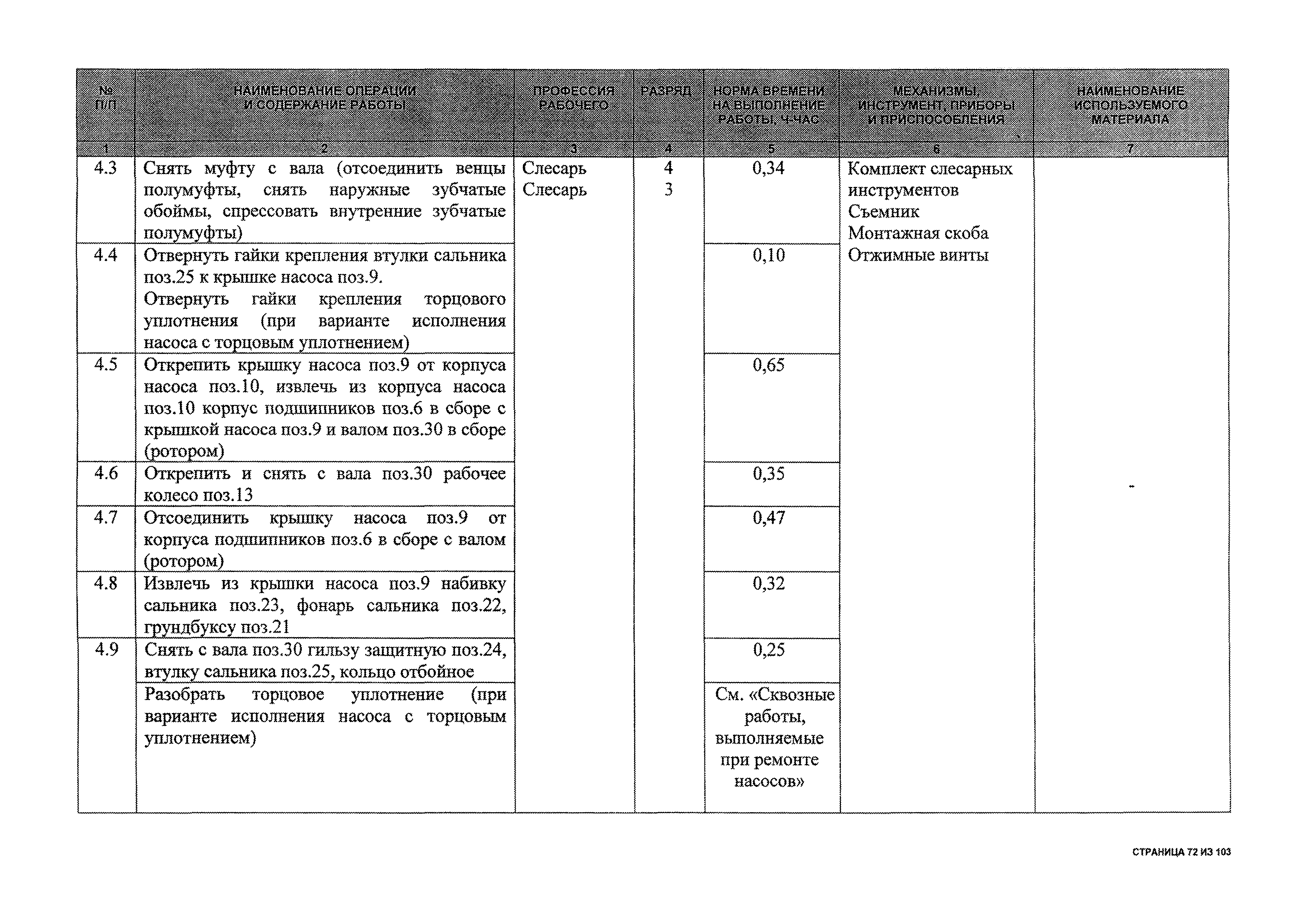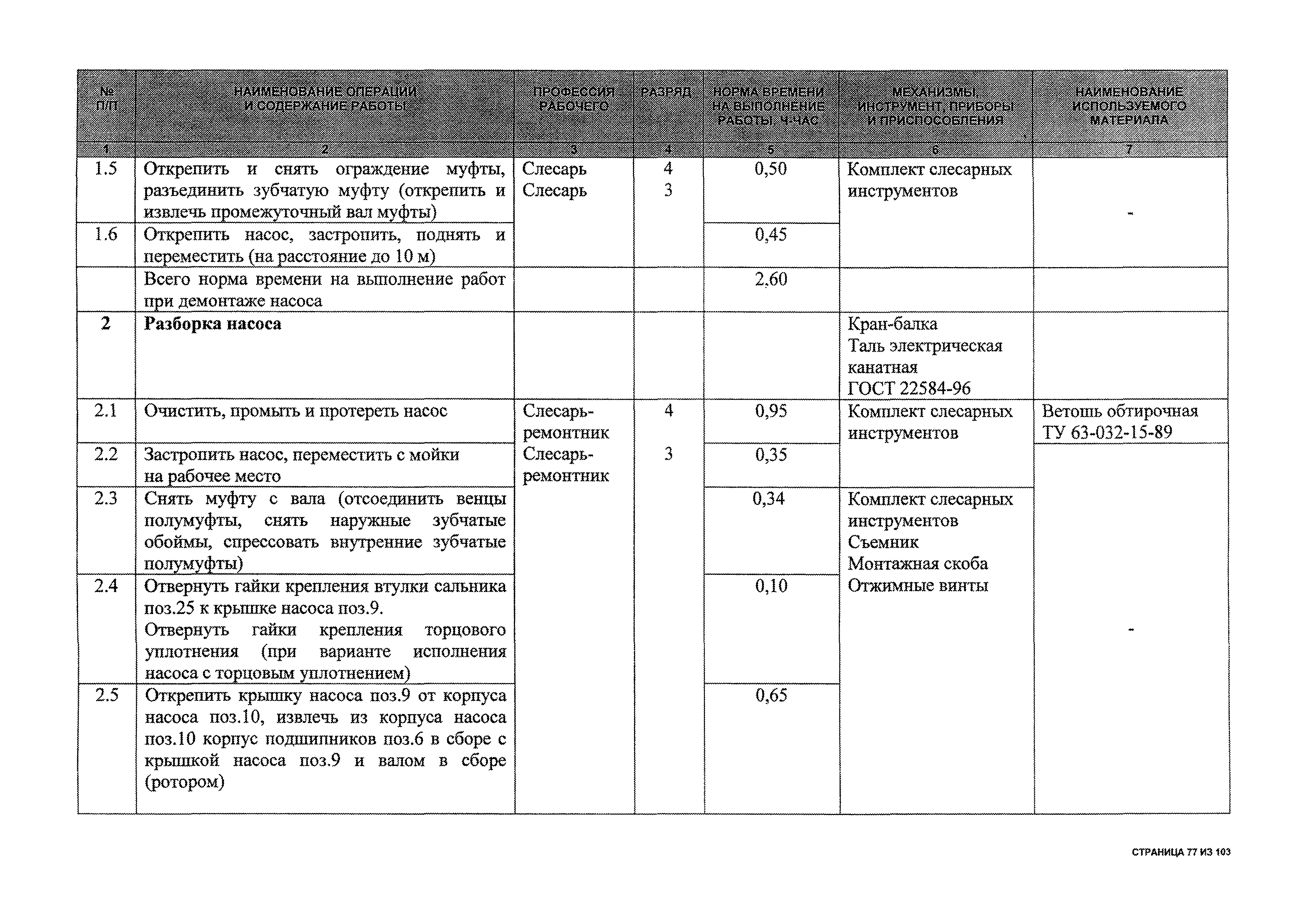 | Оглавление: | 1 Общая часть 2 Карты технического обслуживания, текущего и капитального ремонтов насосов: НБ-32 12НА-9Х4 10НД-6ХI АХП-45/31 НК560/300 3 Сквозные работы, выполняемые при ремонте насосов 3.1 Вырубка смазочных канавок крейцмейселем 3.2 Нарезание резьбы на стержнях плашкой 3.3 Калибровка резьбы на стержнях плашкой 3.4 Нарезание резьбы в сквозных отверстиях вручную 3.5 Калибровка резьбы в сквозных отверстиях вручную 3.6 Вырубка прямоугольных, фасонных и круглых прокладок 3.7 Пробивка отверстий в прокладках 3.8 Удаление сломанных шпилек, болтов 3.9 Шабрение разъема корпуса насоса 3.10 Подгонка и установка призматических шпонок 3.11 Заливка вкладышей баббитом 3.12 Шабрение бронзовых втулок 3.13 Шабрение бронзовых вкладышей 3.14 Ремонт торцовых уплотнений 3.15 Правка вала 3.16 Балансировка рабочих колес 3.17 Восстановление деталей насоса наплавкой электродами диаметром 4 мм 3.18 Покраска насоса после ремонта |