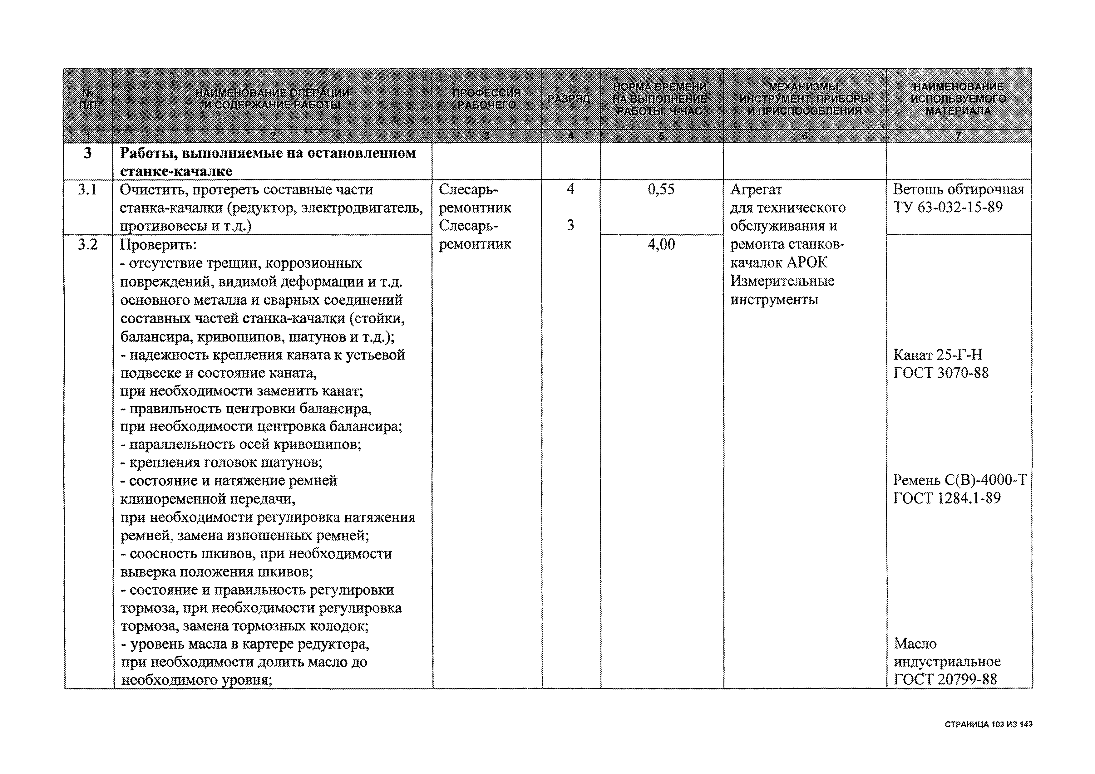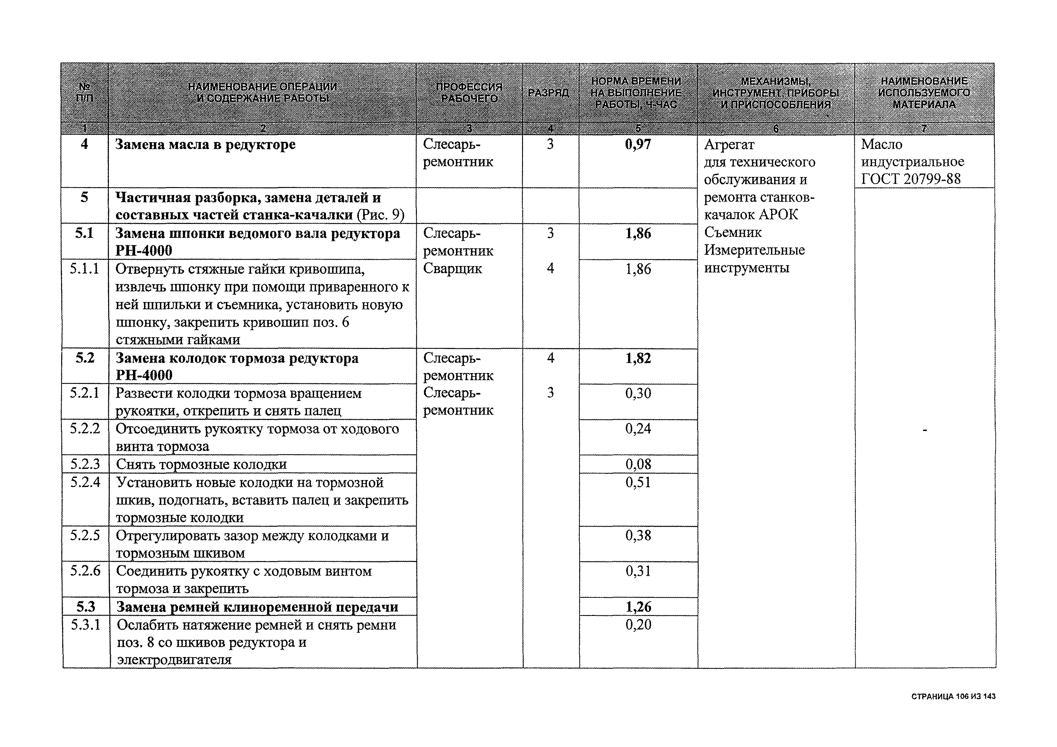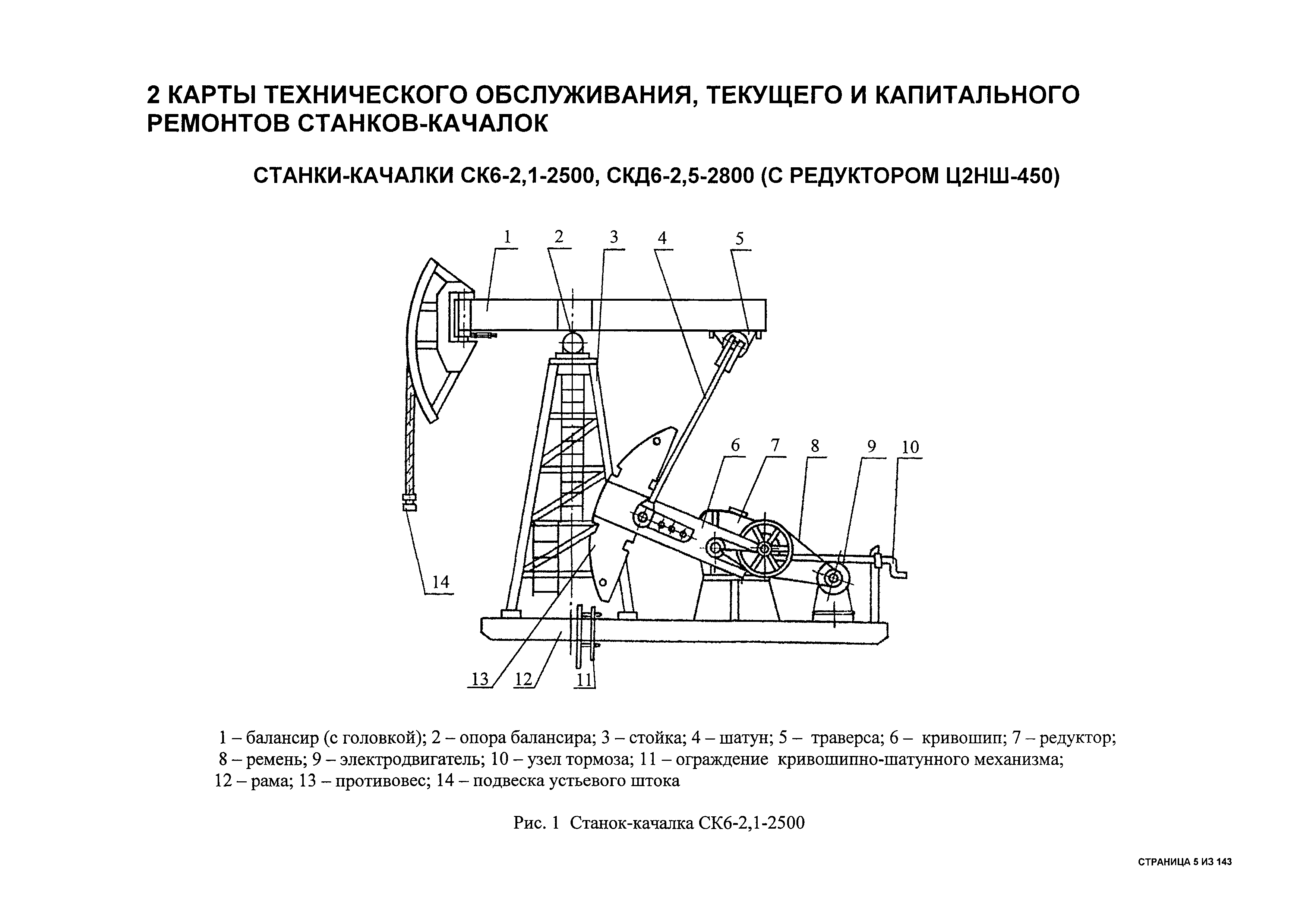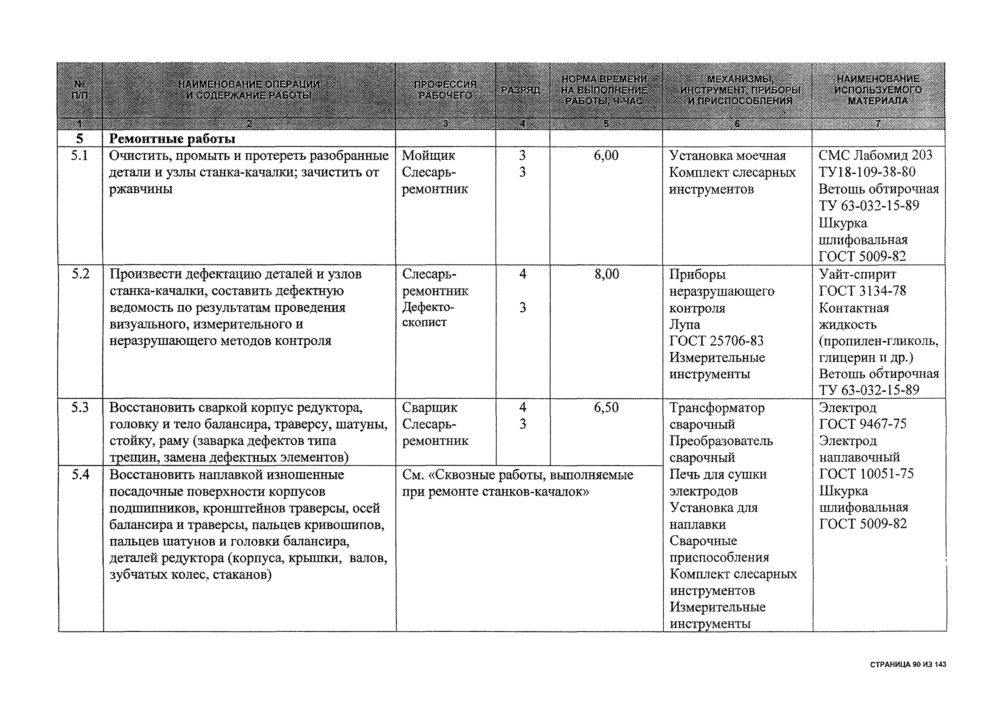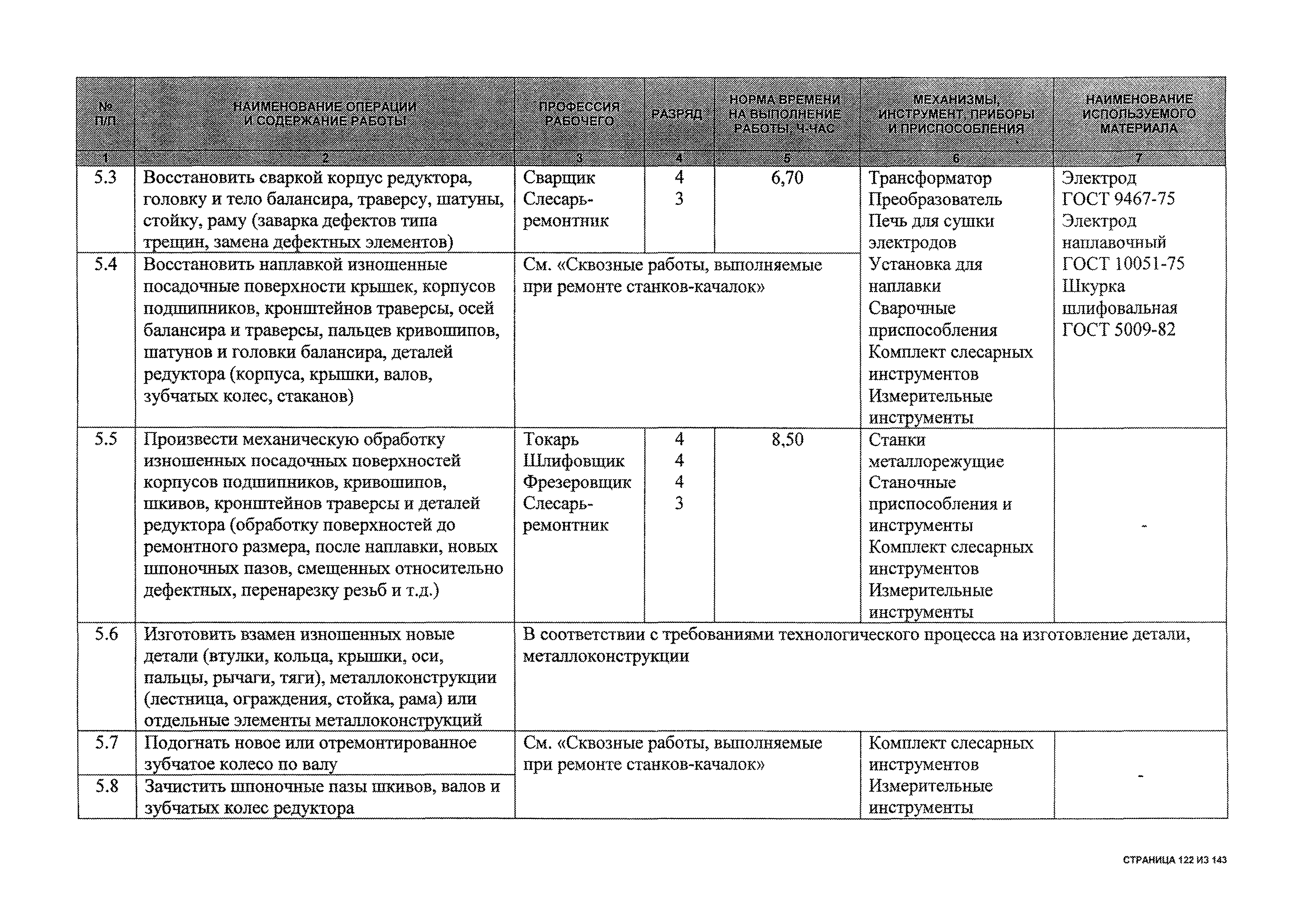 | Оглавление: | 1 Общая часть 2 Карты технического обслуживания, текущего и капитального ремонтов станков-качалок СК6-2,1-2500, СКД6-2,5-2800 (с редуктором Ц2НШ-450) СК8-3,5-4000, СК12-2,5-4000, СКД8-3-4000 (с редуктором Ц2НШ-750) СКН5-3015 (с редуктором РН-2300) СКН10-3315 (с редуктором РН-4000) 3 Сквозные работы, выполняемые при ремонте станка-качалки 3.1 Нарезание резьбы на стержнях плашкой 3.2 Калибровка резьбы на стержнях плашкой 3.3 Нарезание резьбы в сквозных отверстиях вручную 3.4 Калибровка резьбы в сквозных отверстиях вручную 3.5 Вырубка прямоугольных, фасонных и круглых прокладок 3.6 Пробивка отверстий в прокладках 3.7 Удаление сломанных шпилек, болтов 3.8 Шабрение разъема корпуса редуктора 3.9 Подгонка и установка призматических шпонок 3.10 Правка вала 3.11 Восстановление деталей станка-качалки наплавкой электродами диаметром 4 мм 3.12 Покраска станка-качалки после ремонта |