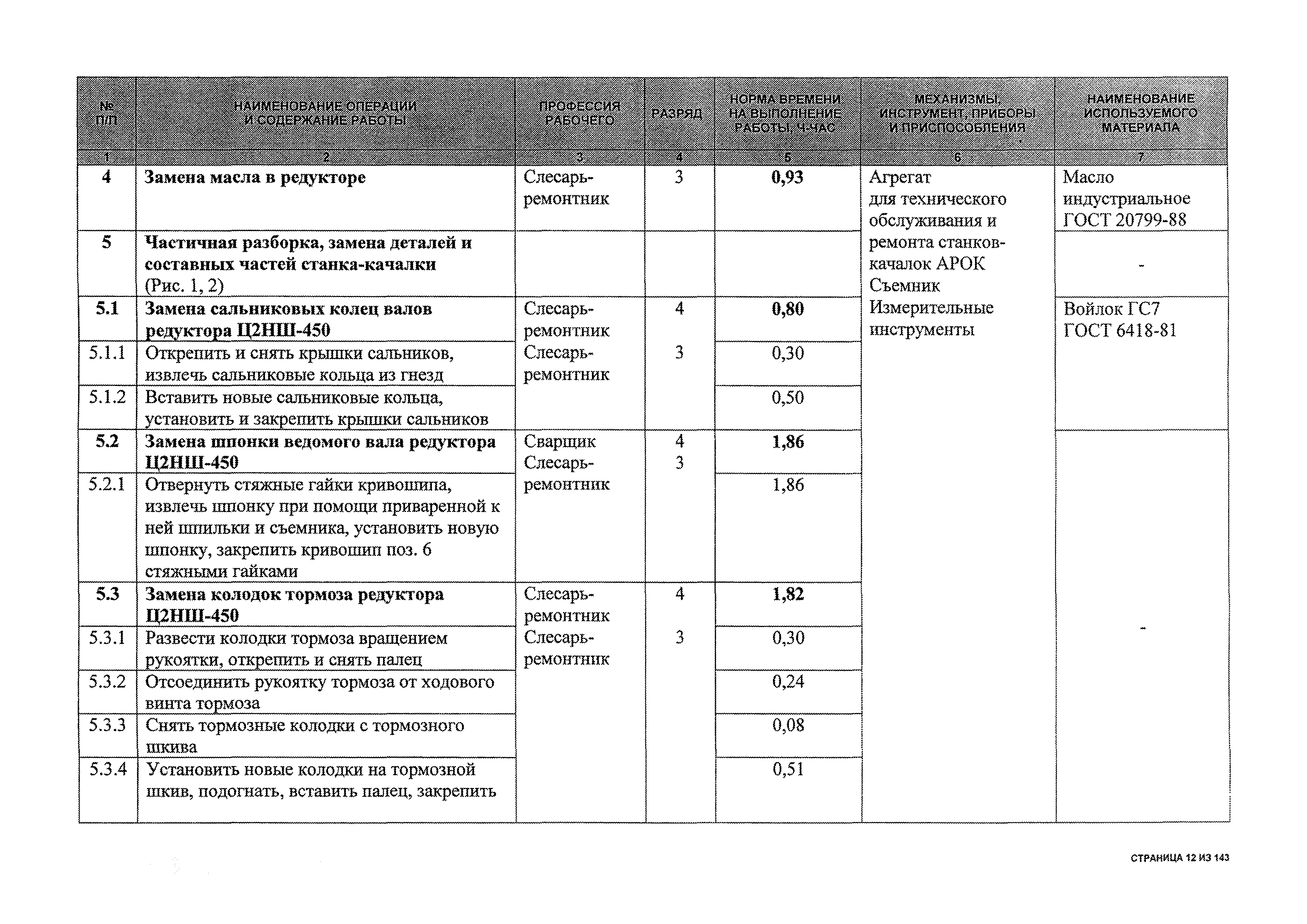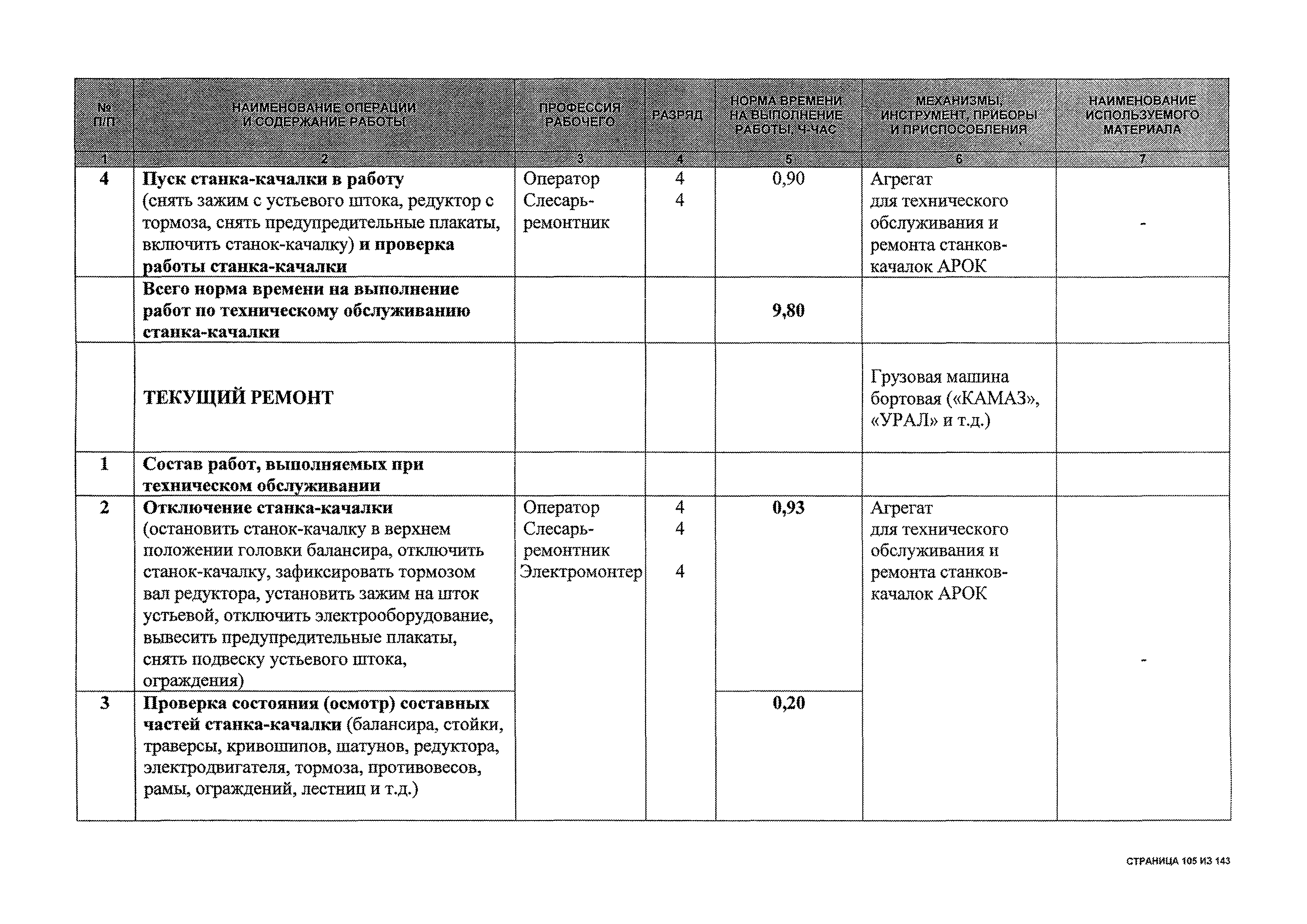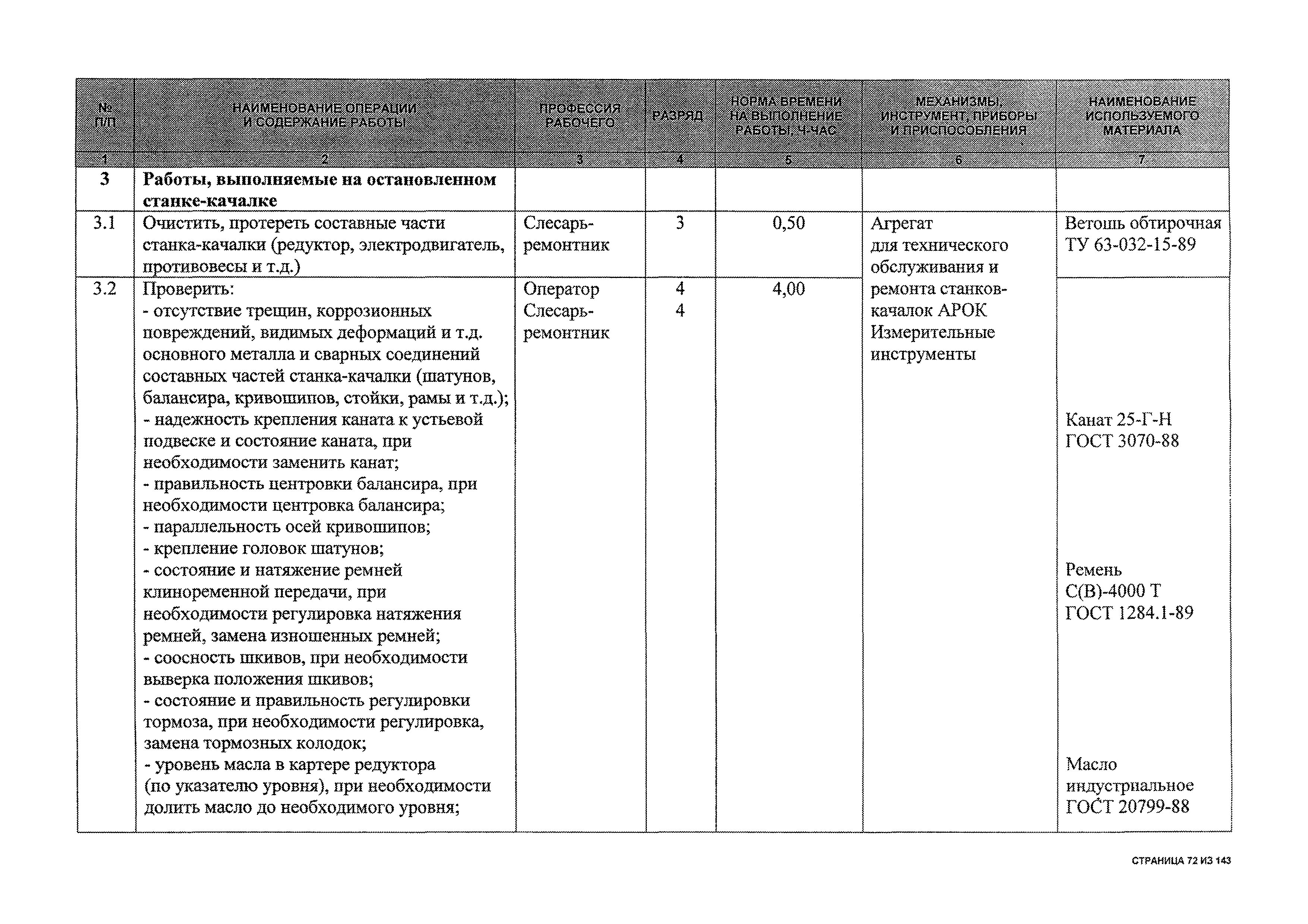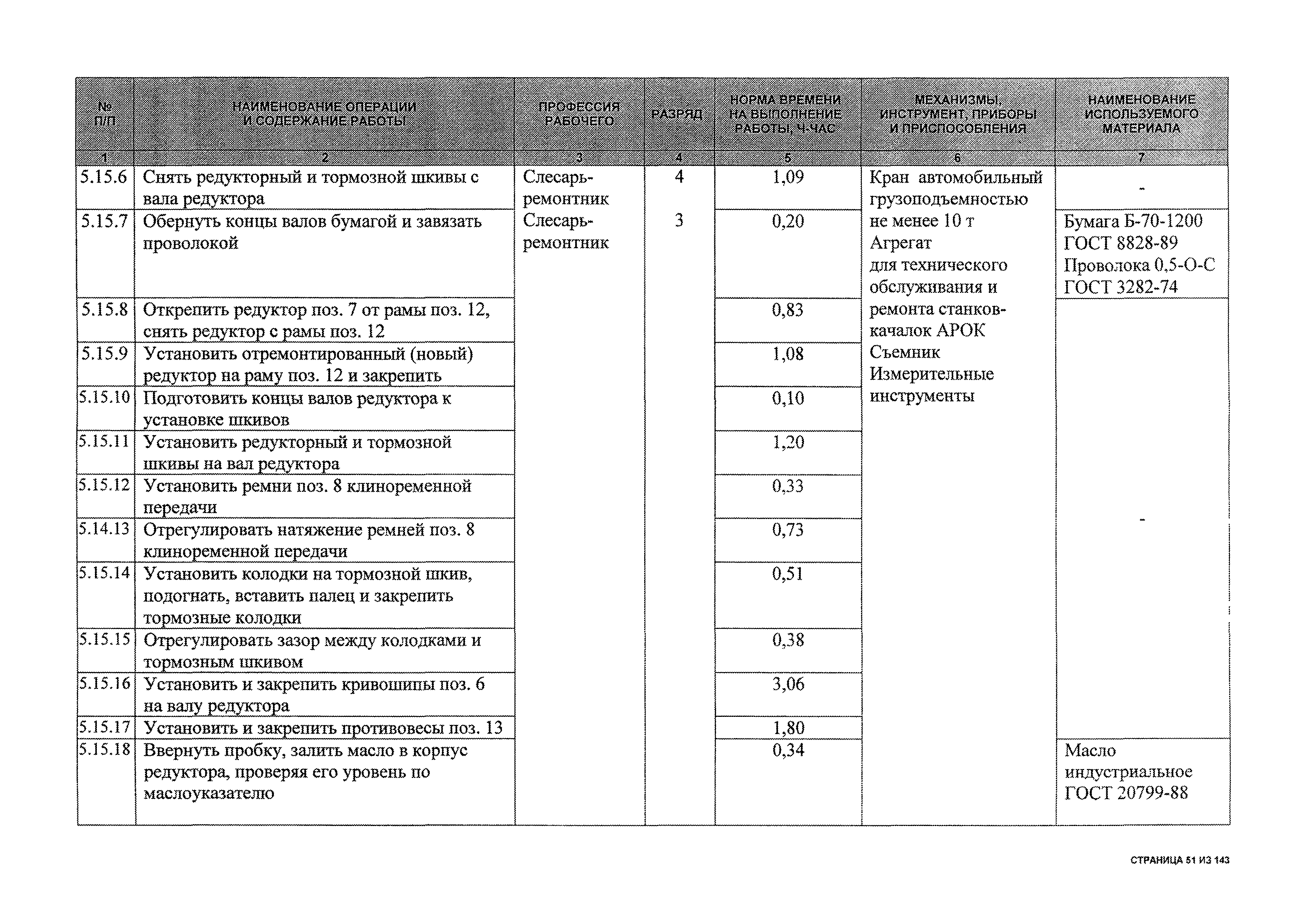 | Оглавление: | 1 Общая часть 2 Карты технического обслуживания, текущего и капитального ремонтов станков-качалок СК6-2,1-2500, СКД6-2,5-2800 (с редуктором Ц2НШ-450) СК8-3,5-4000, СК12-2,5-4000, СКД8-3-4000 (с редуктором Ц2НШ-750) СКН5-3015 (с редуктором РН-2300) СКН10-3315 (с редуктором РН-4000) 3 Сквозные работы, выполняемые при ремонте станка-качалки 3.1 Нарезание резьбы на стержнях плашкой 3.2 Калибровка резьбы на стержнях плашкой 3.3 Нарезание резьбы в сквозных отверстиях вручную 3.4 Калибровка резьбы в сквозных отверстиях вручную 3.5 Вырубка прямоугольных, фасонных и круглых прокладок 3.6 Пробивка отверстий в прокладках 3.7 Удаление сломанных шпилек, болтов 3.8 Шабрение разъема корпуса редуктора 3.9 Подгонка и установка призматических шпонок 3.10 Правка вала 3.11 Восстановление деталей станка-качалки наплавкой электродами диаметром 4 мм 3.12 Покраска станка-качалки после ремонта |