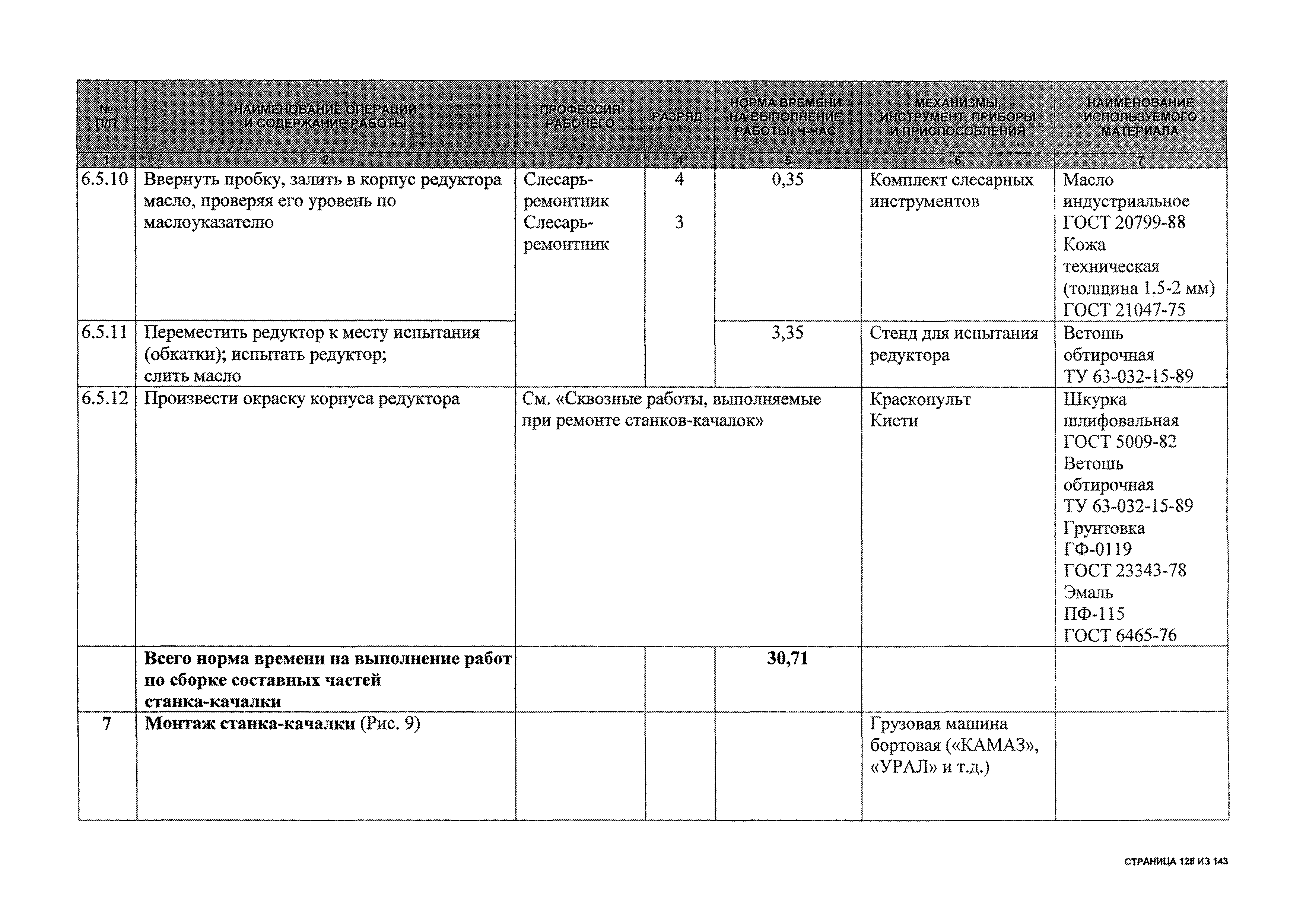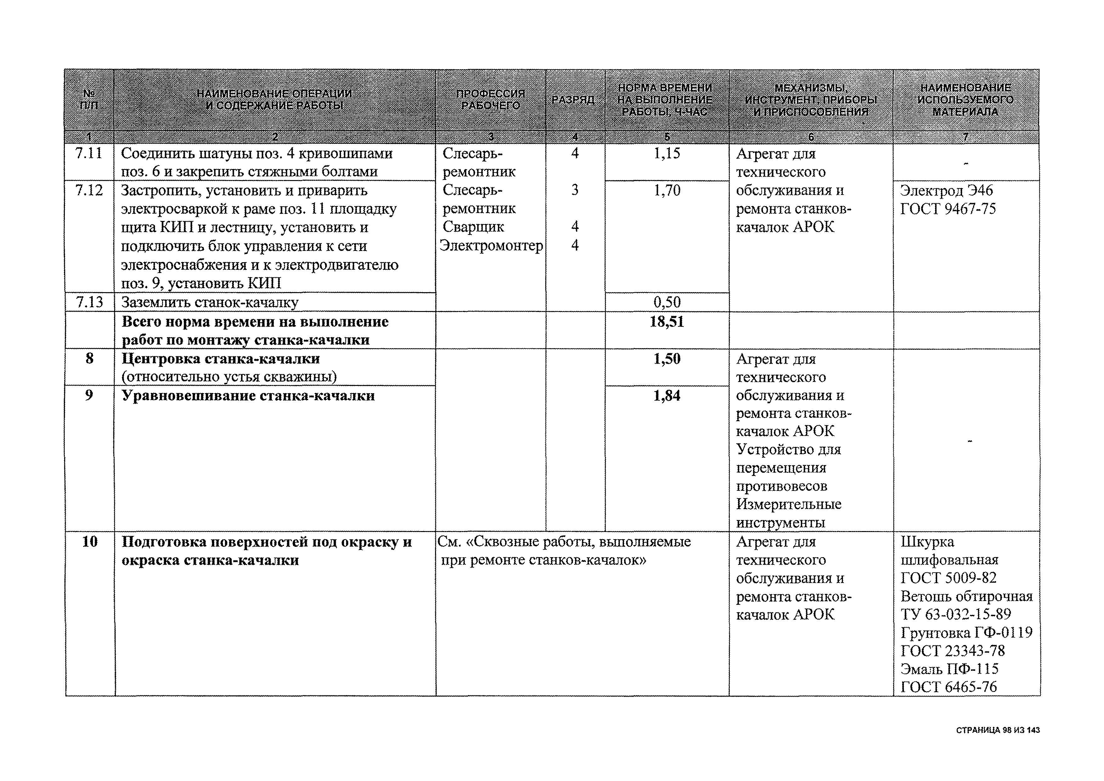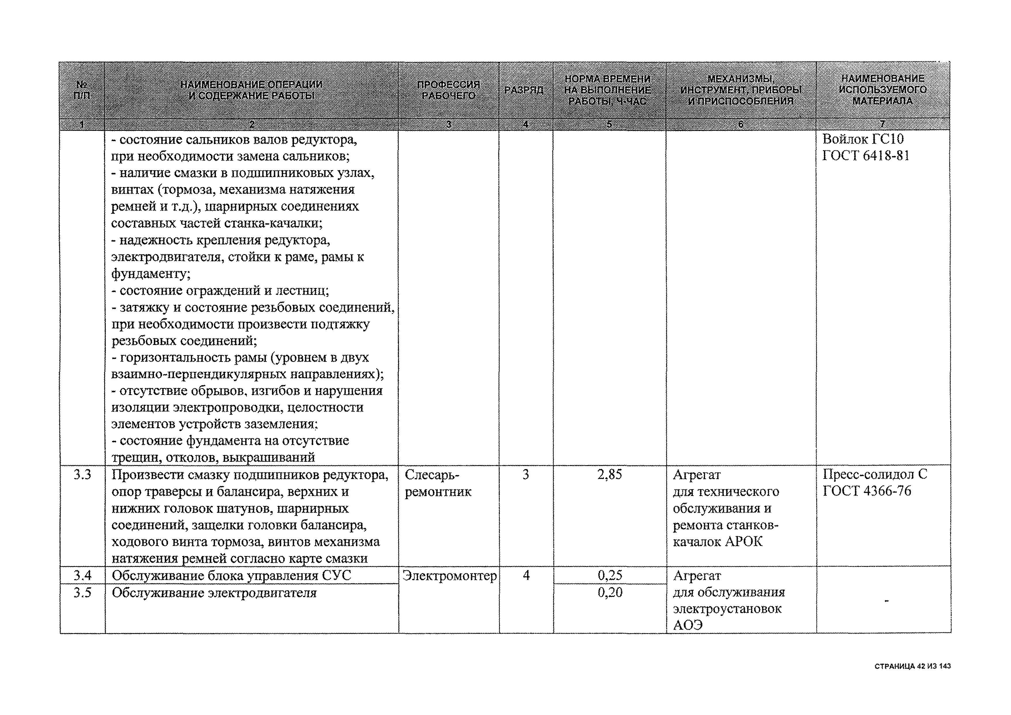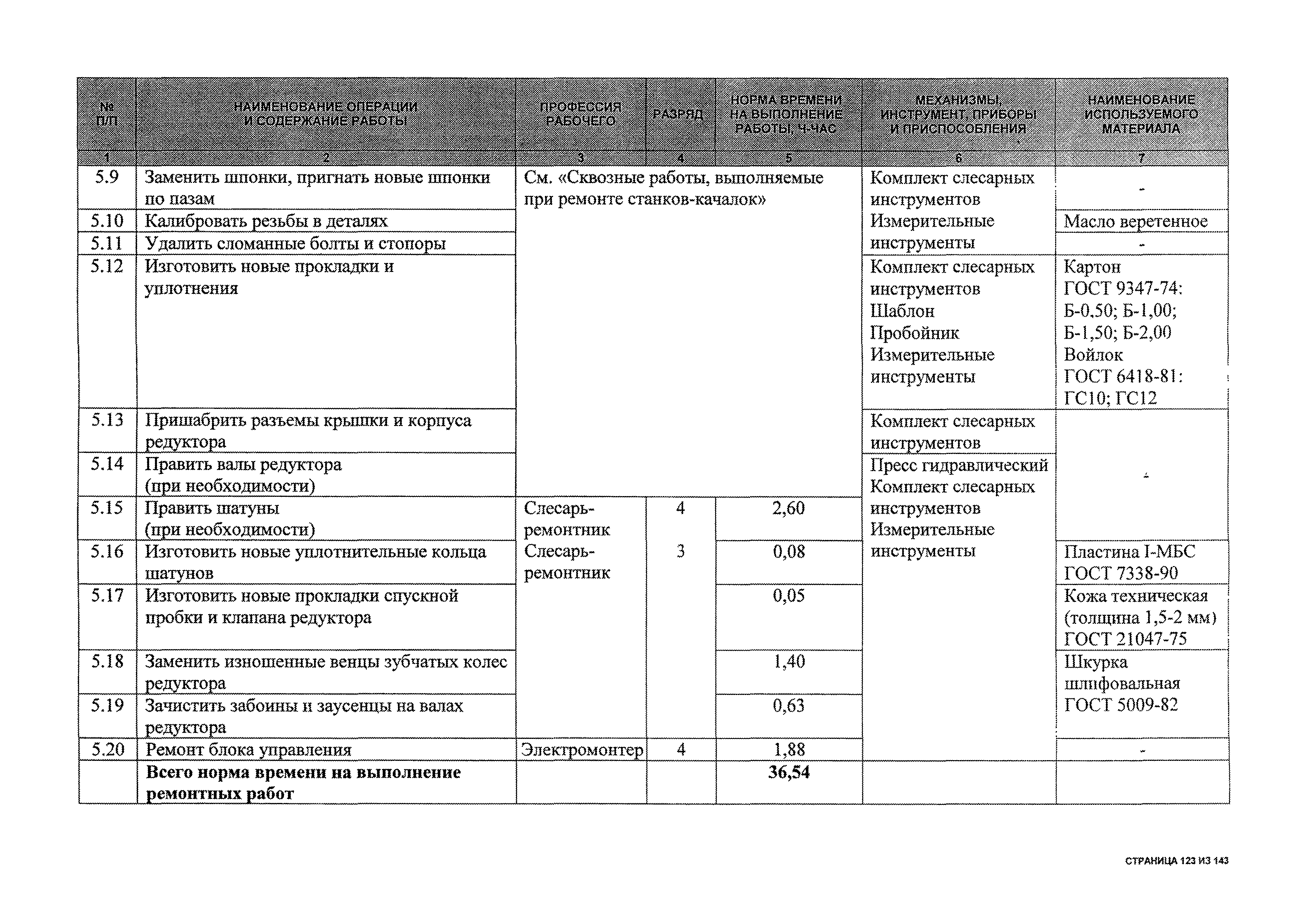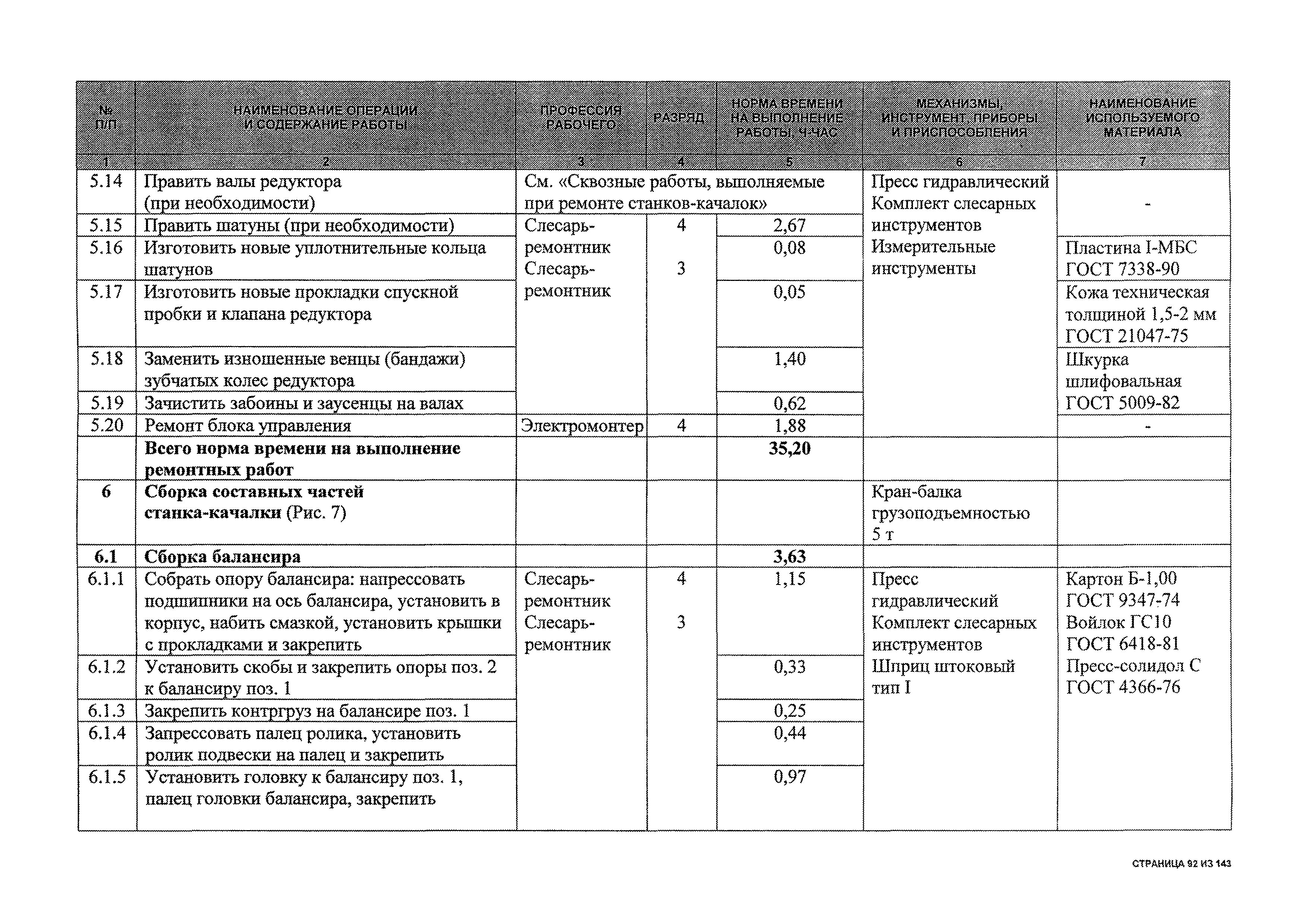 | Оглавление: | 1 Общая часть 2 Карты технического обслуживания, текущего и капитального ремонтов станков-качалок СК6-2,1-2500, СКД6-2,5-2800 (с редуктором Ц2НШ-450) СК8-3,5-4000, СК12-2,5-4000, СКД8-3-4000 (с редуктором Ц2НШ-750) СКН5-3015 (с редуктором РН-2300) СКН10-3315 (с редуктором РН-4000) 3 Сквозные работы, выполняемые при ремонте станка-качалки 3.1 Нарезание резьбы на стержнях плашкой 3.2 Калибровка резьбы на стержнях плашкой 3.3 Нарезание резьбы в сквозных отверстиях вручную 3.4 Калибровка резьбы в сквозных отверстиях вручную 3.5 Вырубка прямоугольных, фасонных и круглых прокладок 3.6 Пробивка отверстий в прокладках 3.7 Удаление сломанных шпилек, болтов 3.8 Шабрение разъема корпуса редуктора 3.9 Подгонка и установка призматических шпонок 3.10 Правка вала 3.11 Восстановление деталей станка-качалки наплавкой электродами диаметром 4 мм 3.12 Покраска станка-качалки после ремонта |