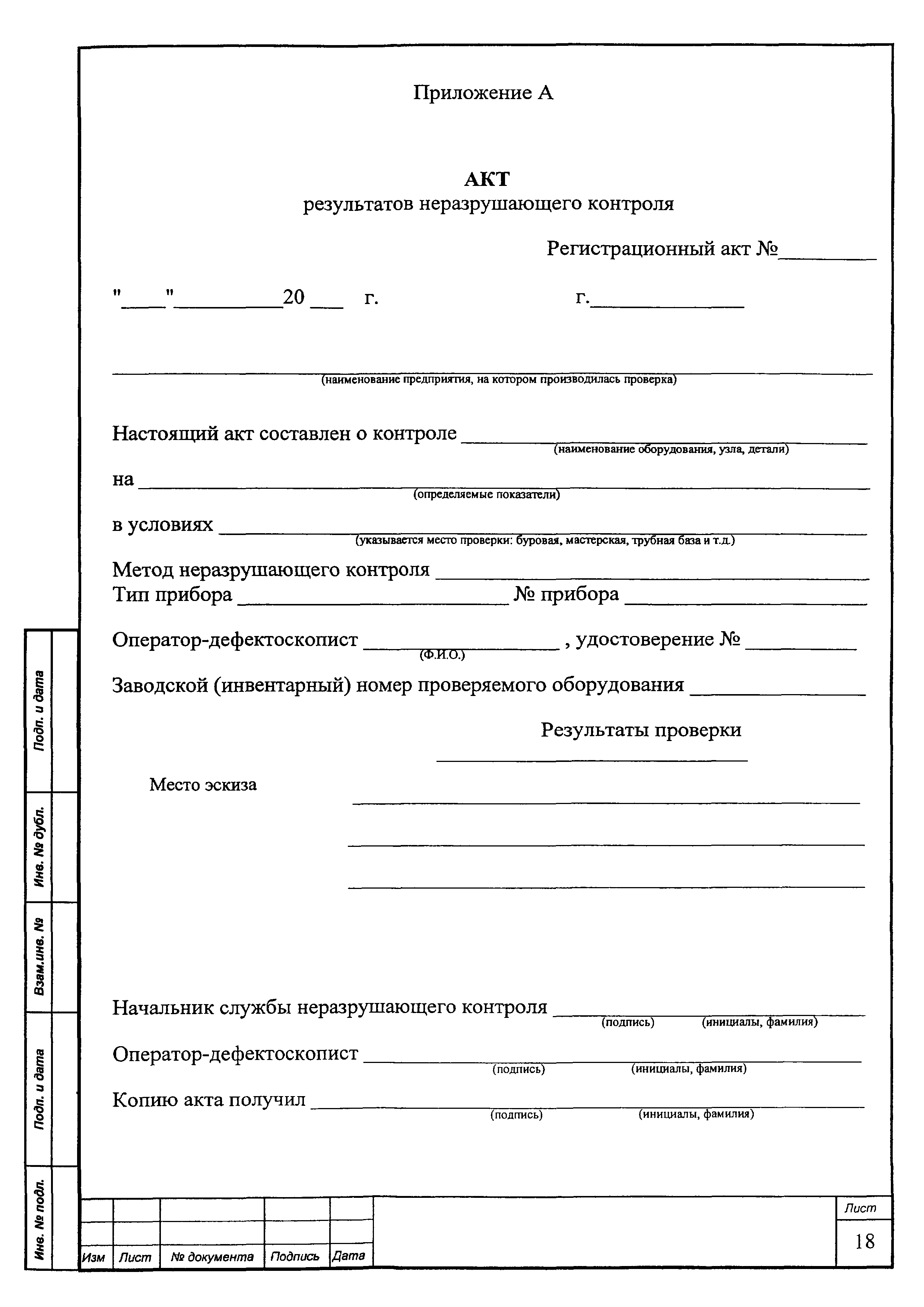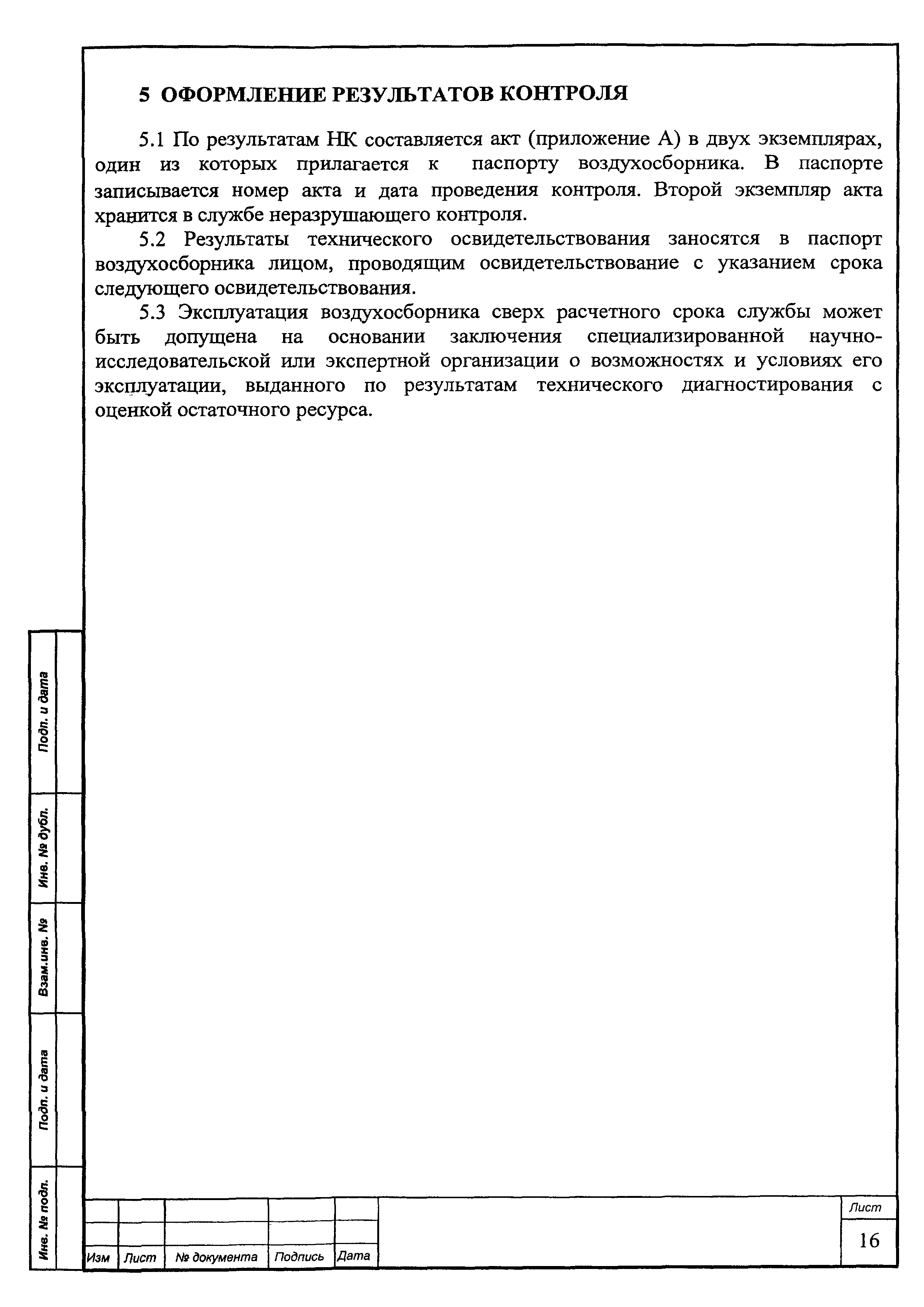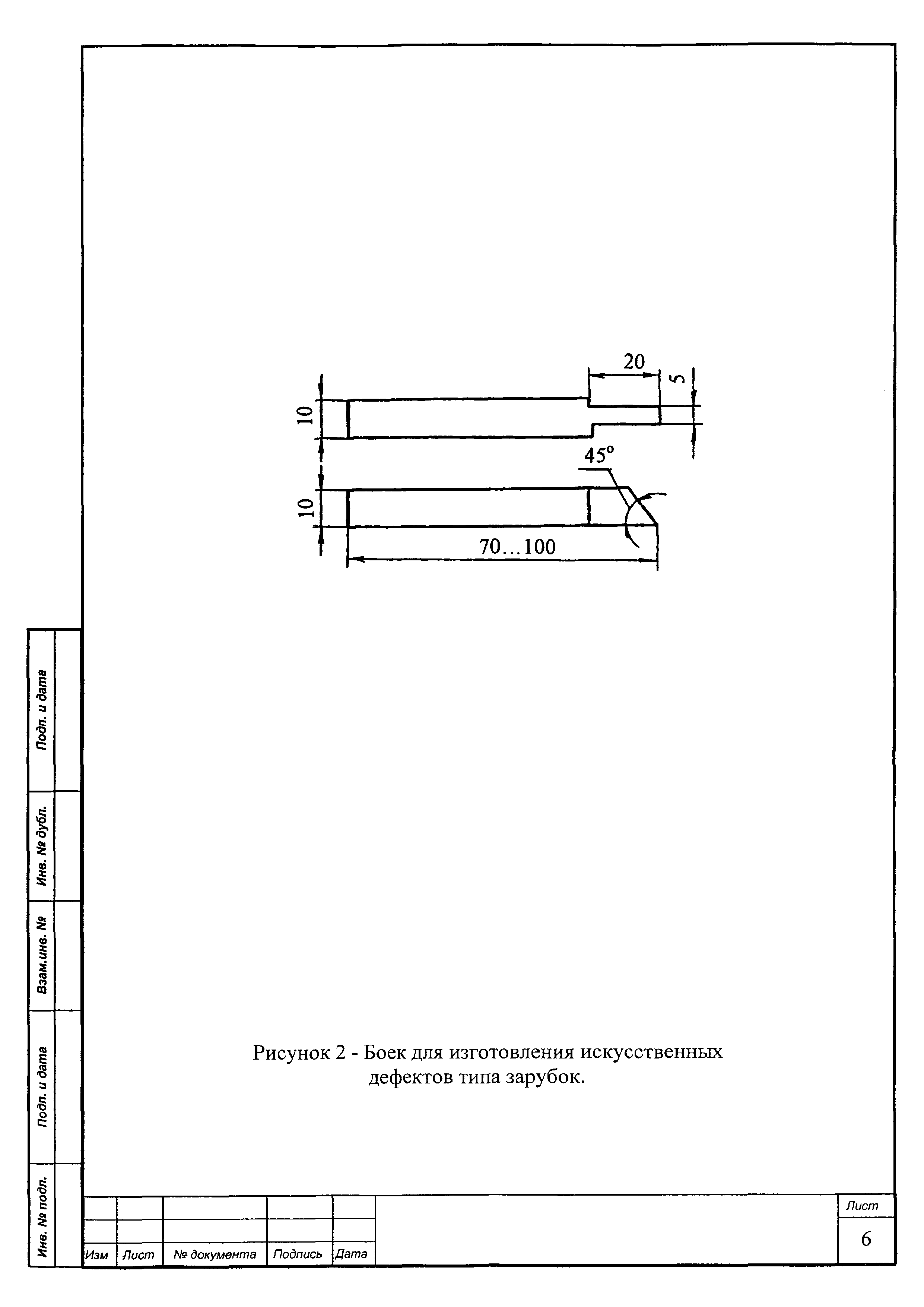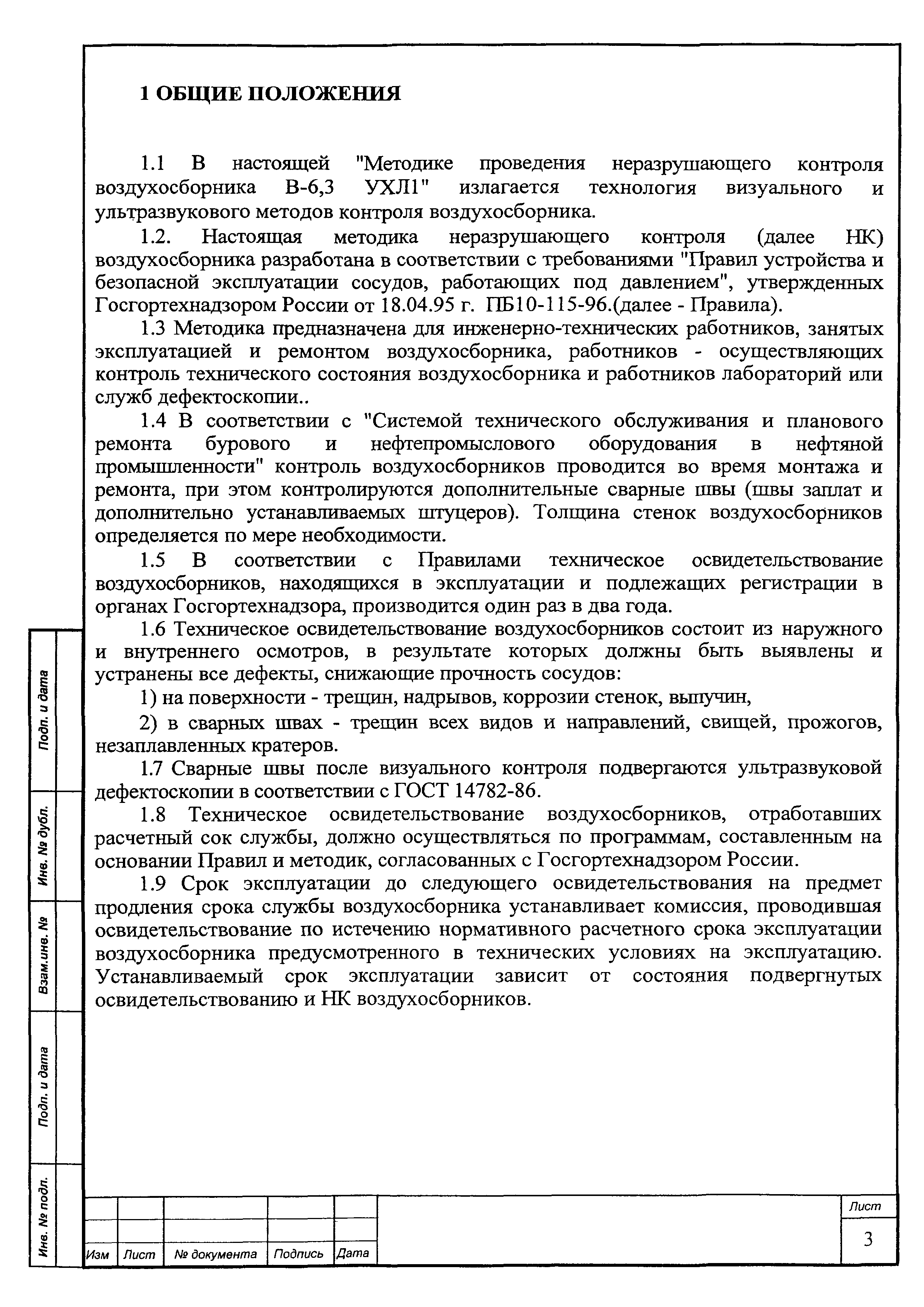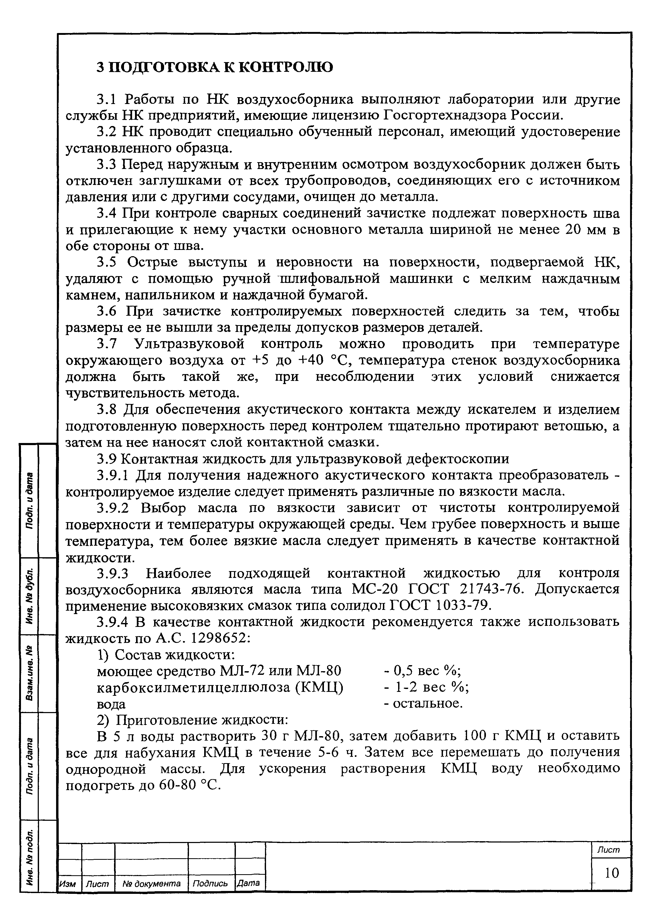Методика проведения неразрушающего контроля воздухосборника В-6,3 УХЛ1| Статус: | действует | | Название рус.: | Методика проведения неразрушающего контроля воздухосборника В-6,3 УХЛ1 | | Дата добавления в базу: | 01.10.2014 | | Дата актуализации: | 01.01.2021 | | Область применения: | В Методике излагается технология визуального и ультразвукового методов контроля воздухосборника. | | Оглавление: | 1 Общие положения 2 Аппаратура 3 Подготовка к контролю 4 Порядок контроля 5 Оформление результатов контроля 6 Техника безопасности Приложение А Приложение Б | | Разработан: | СПКТБ Нефтегазмаш