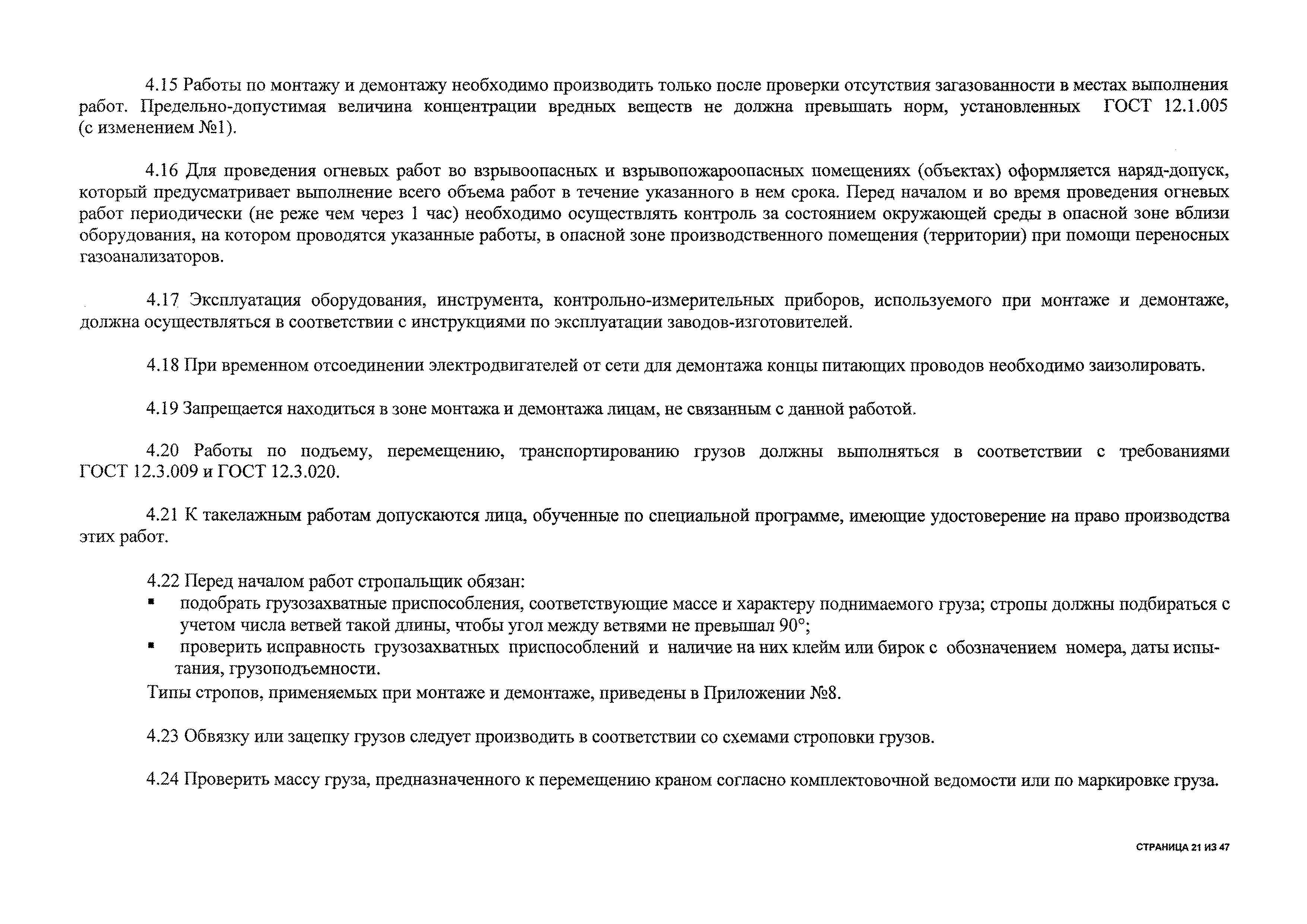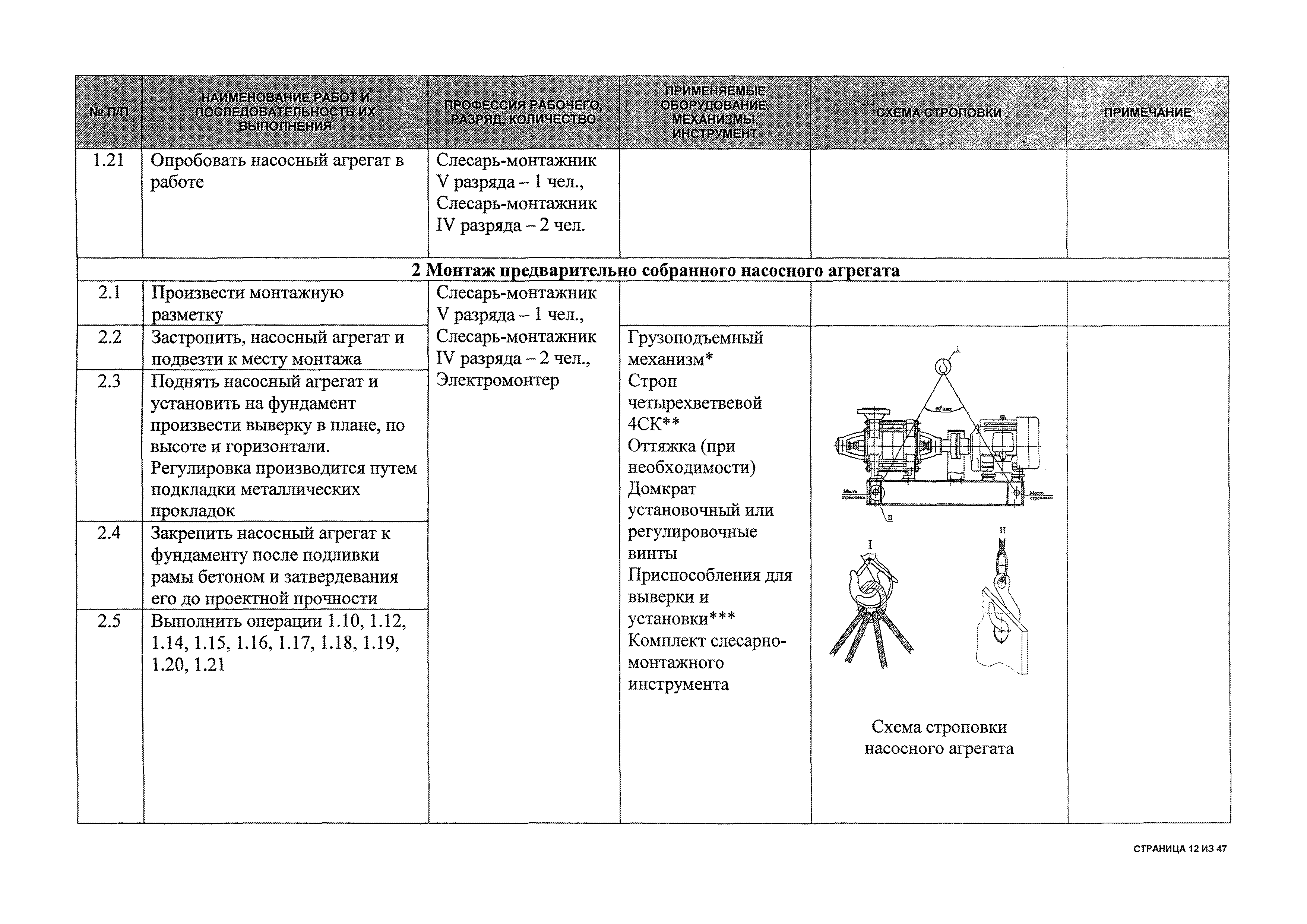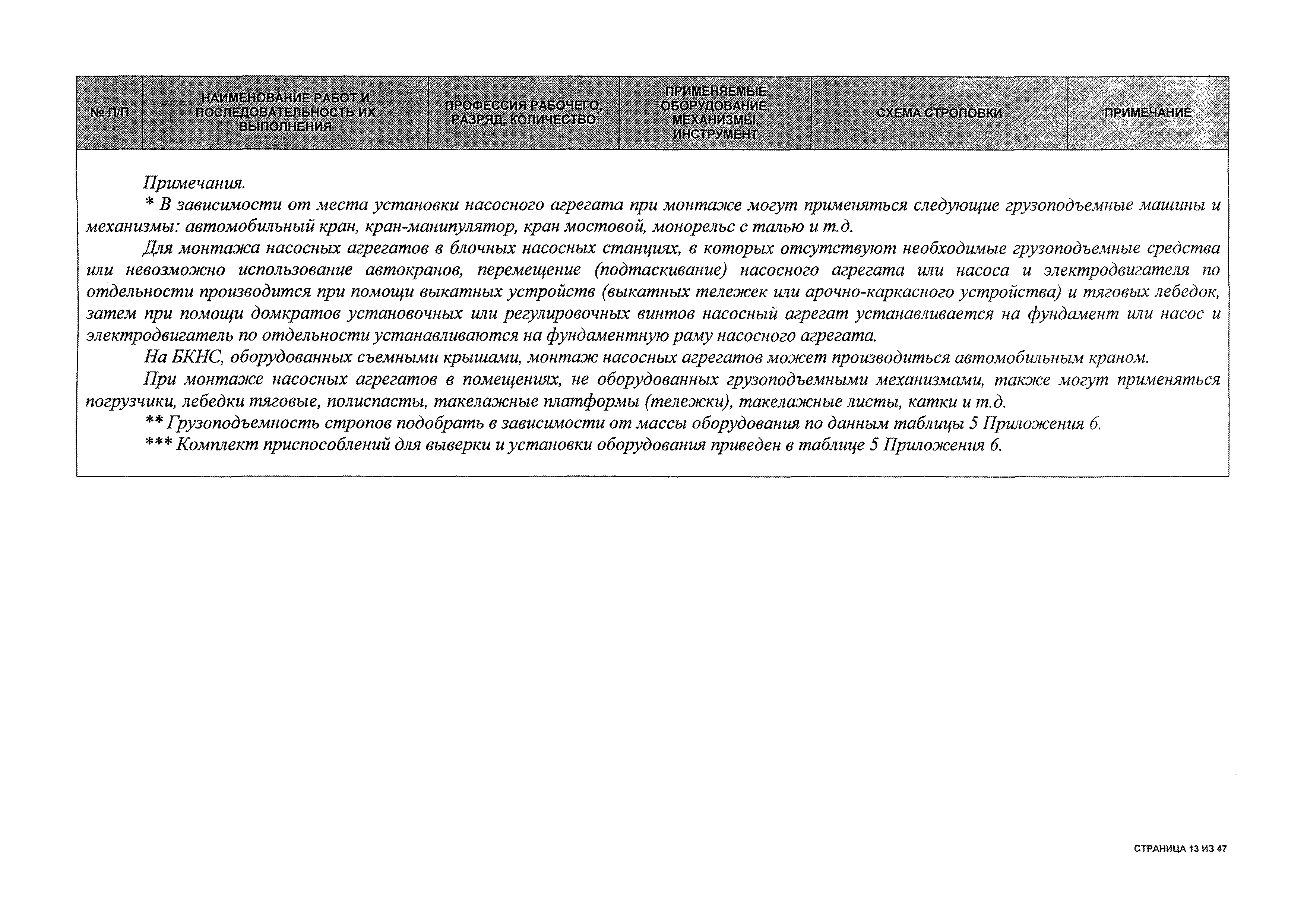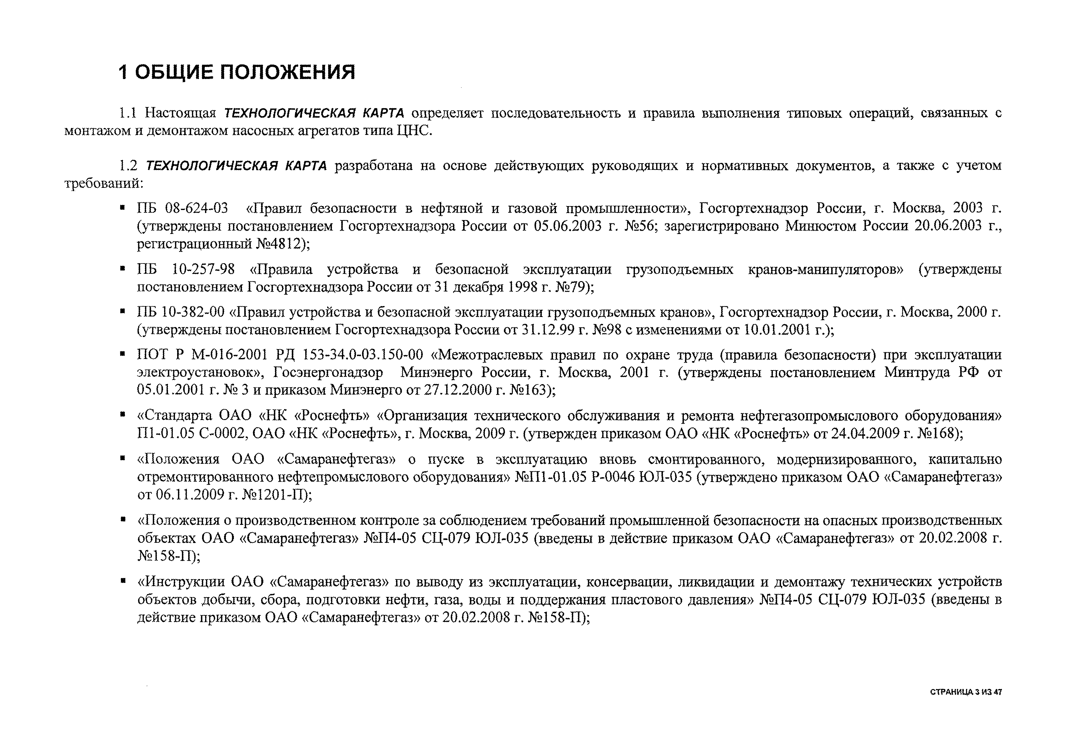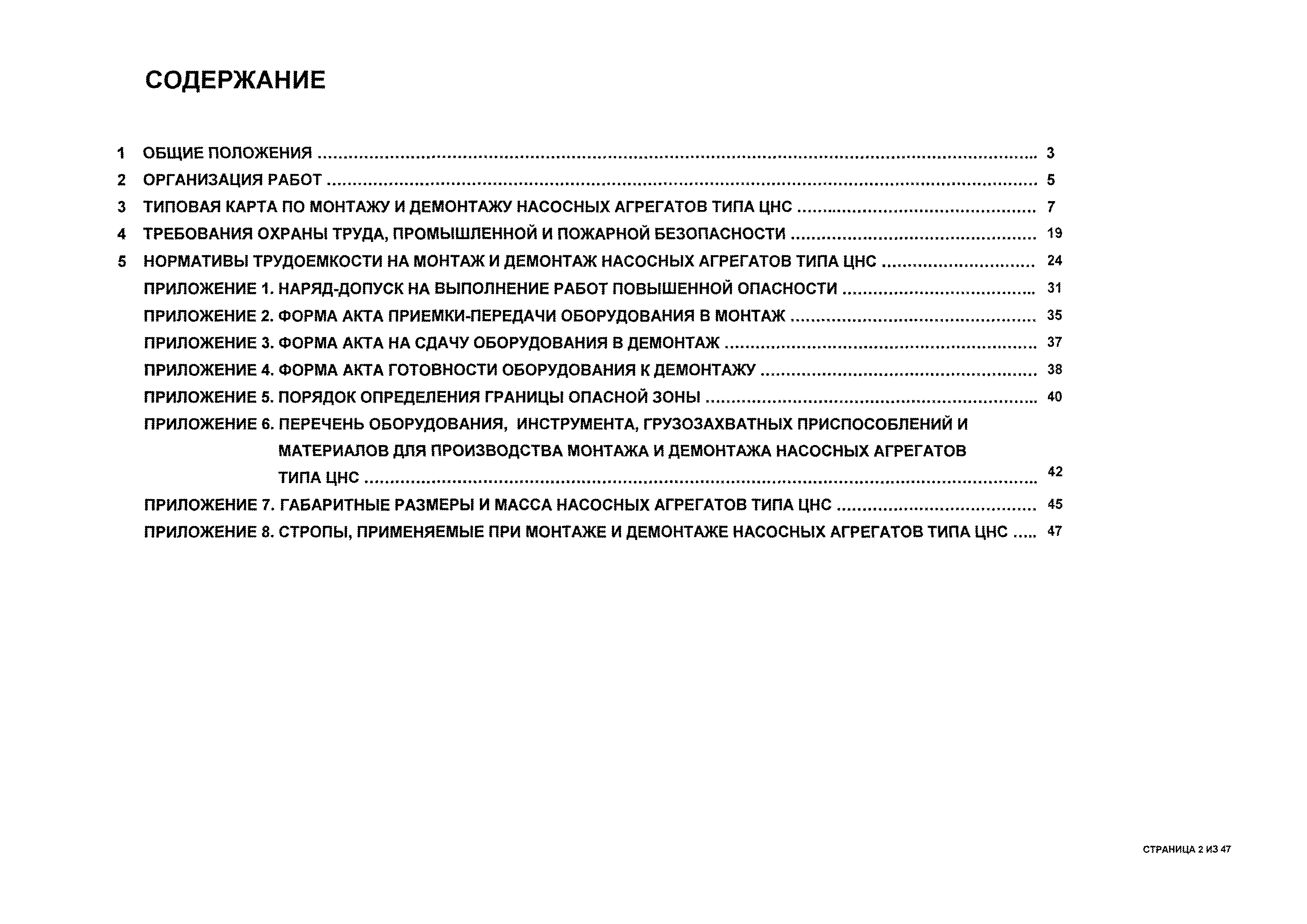 | Оглавление: | 1 Общие положения 2 Организация работ 3 Типовая карта по монтажу насосных агрегатов типа ЦНС 4 Требования охраны труда, промышленной и пожарной безопасности 5 Нормативы трудоемкости на монтаж и демонтаж насосных агрегатов типа ЦНС Приложение 1. Наряд-допуск на выполнение работ повышенной опасности Приложение 2. Форма акта приемки-передачи оборудования в монтаж Приложение 3. Форма акта на сдачу оборудования в демонтаж Приложение 4. Форма акта готовности оборудования к демонтажу Приложение 5. Порядок определения границы опасной зоны Приложение 6. Перечень оборудования, инструмента, грузозахватных приспособлений и материалов для производства монтажа и демонтажа насосных агрегатов типа ЦНС Приложение 7. Габаритные размеры и масса насосных агрегатов типа ЦНС Приложение 8. Стропы, применяемые при монтаже и демонтаже насосных агрегатов типа ЦНС |