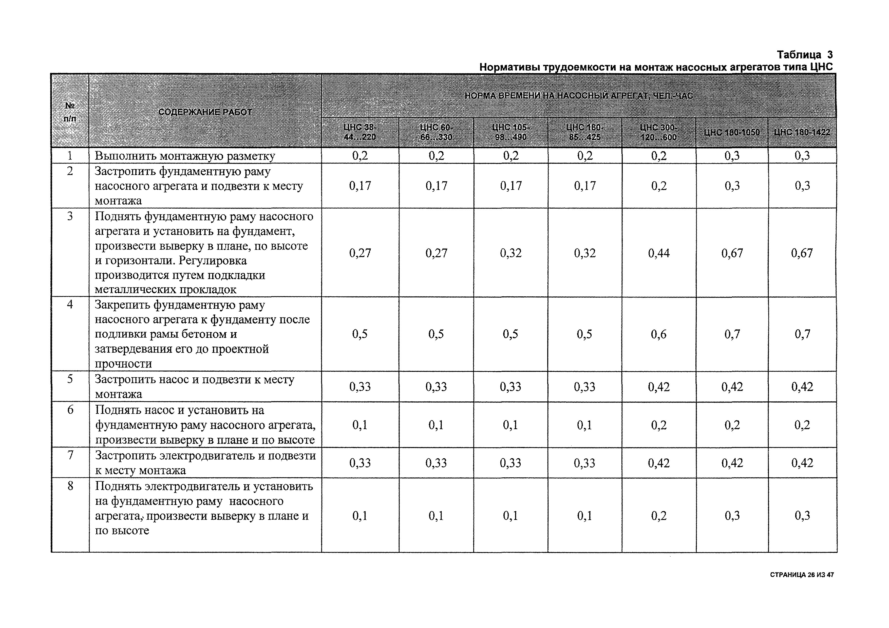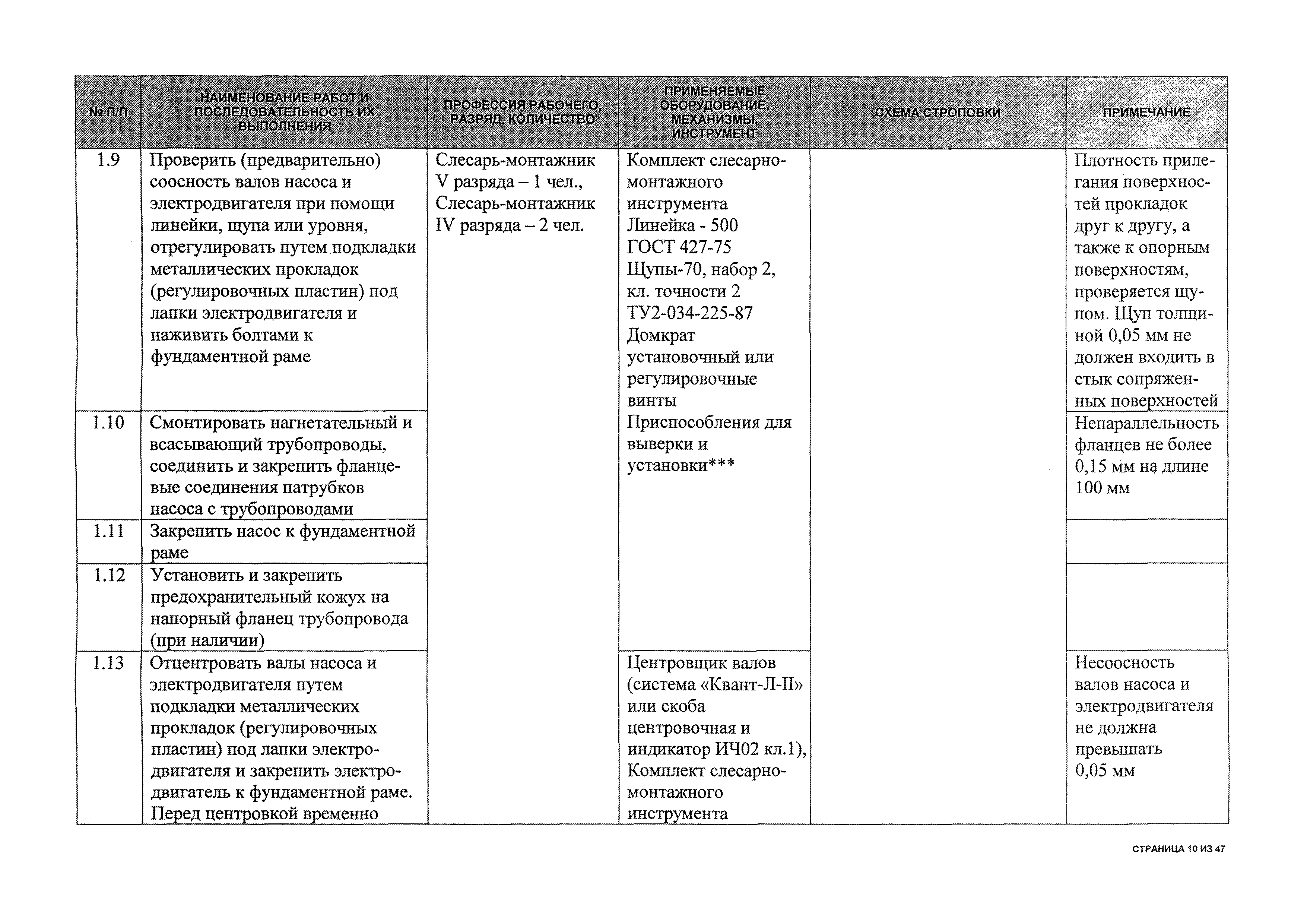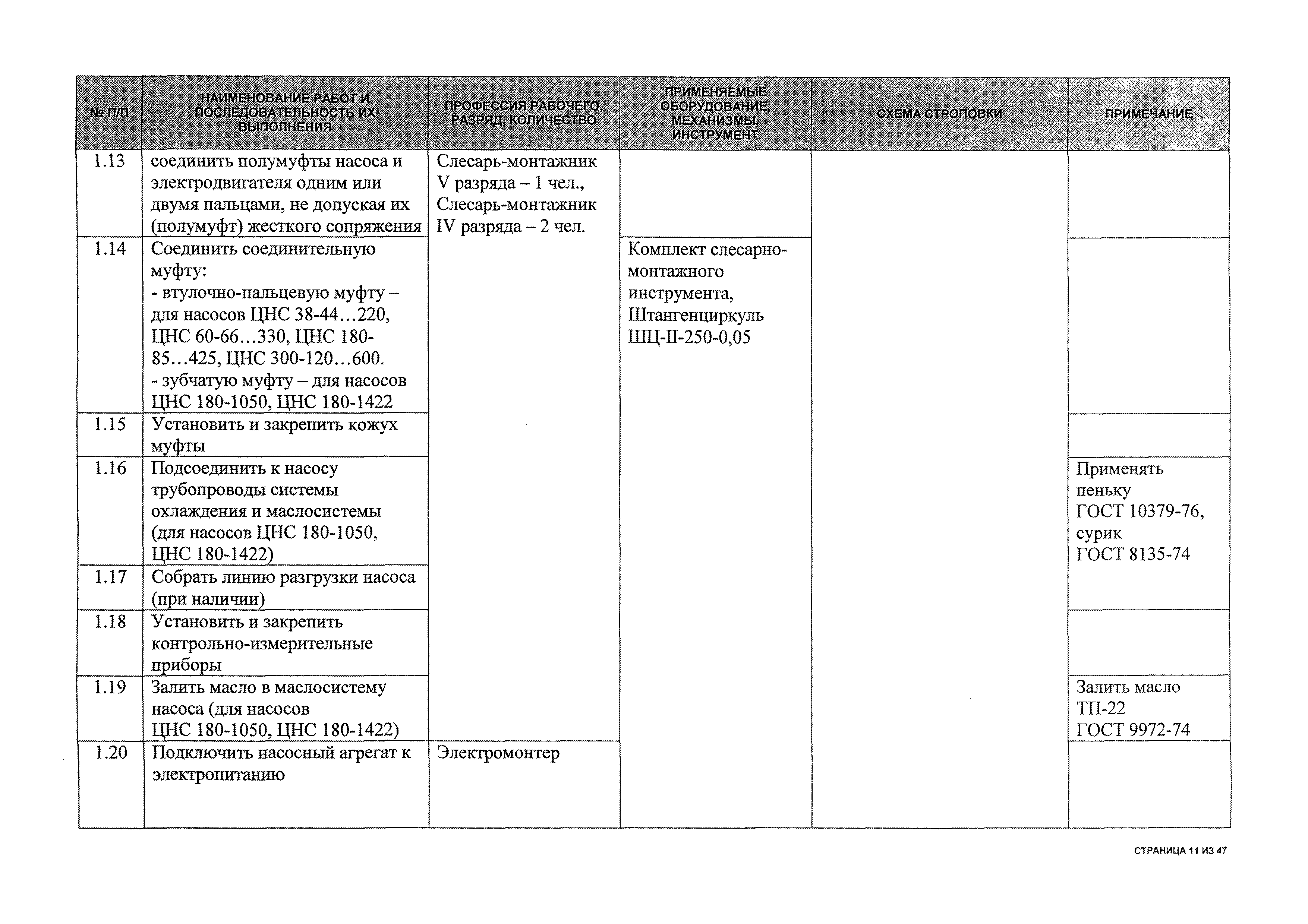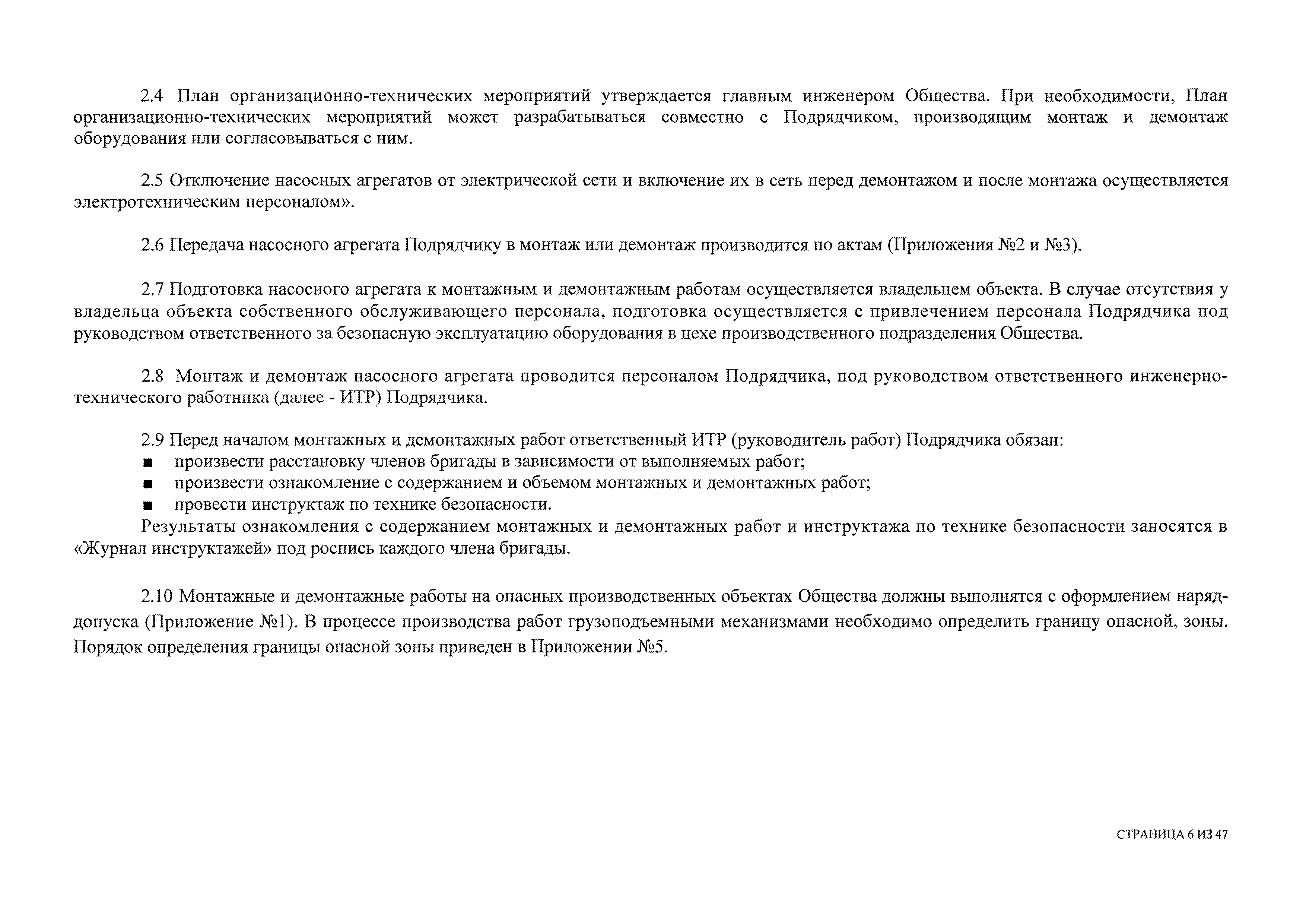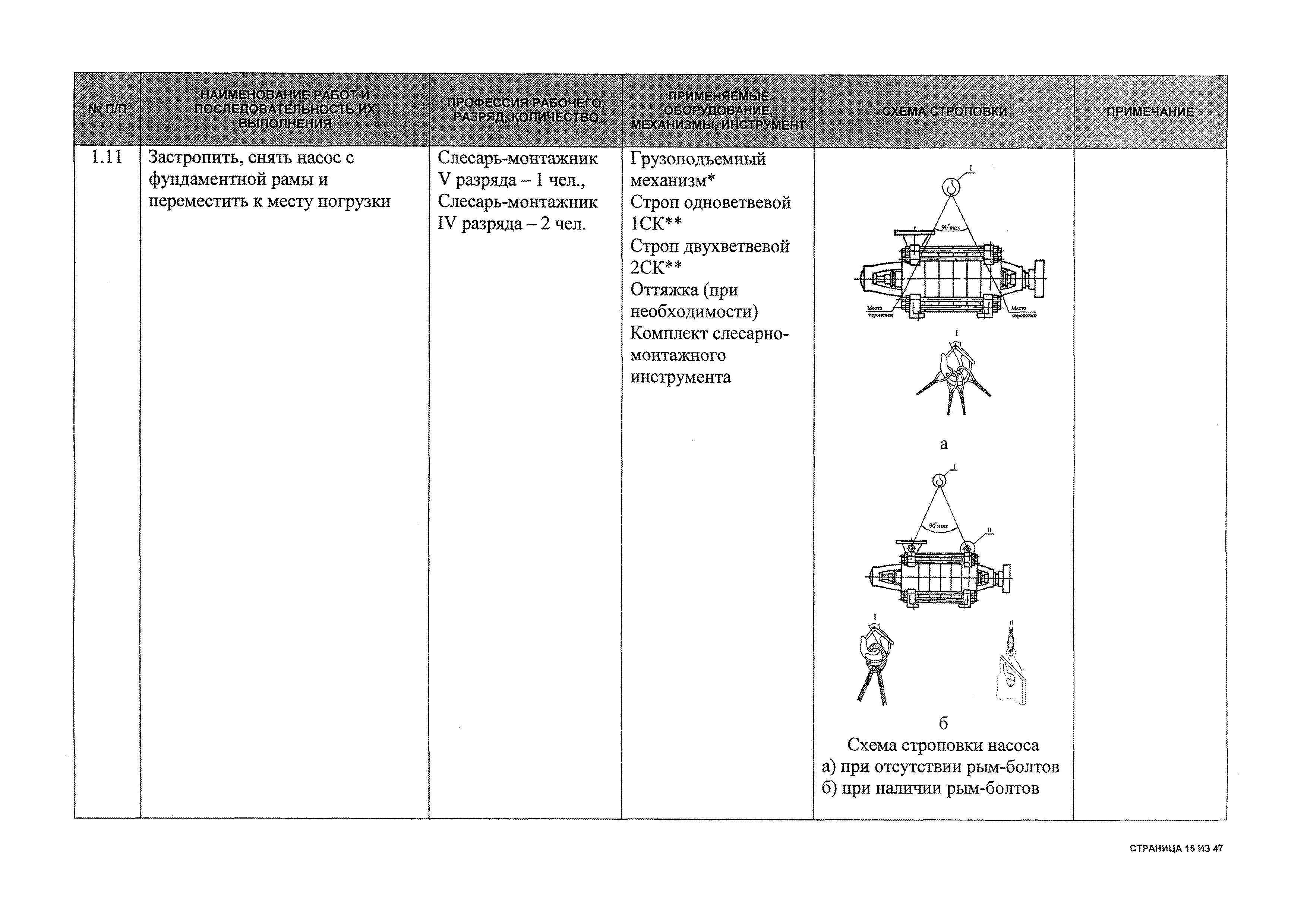| Оглавление: | 1 Общие положения 2 Организация работ 3 Типовая карта по монтажу насосных агрегатов типа ЦНС 4 Требования охраны труда, промышленной и пожарной безопасности 5 Нормативы трудоемкости на монтаж и демонтаж насосных агрегатов типа ЦНС Приложение 1. Наряд-допуск на выполнение работ повышенной опасности Приложение 2. Форма акта приемки-передачи оборудования в монтаж Приложение 3. Форма акта на сдачу оборудования в демонтаж Приложение 4. Форма акта готовности оборудования к демонтажу Приложение 5. Порядок определения границы опасной зоны Приложение 6. Перечень оборудования, инструмента, грузозахватных приспособлений и материалов для производства монтажа и демонтажа насосных агрегатов типа ЦНС Приложение 7. Габаритные размеры и масса насосных агрегатов типа ЦНС Приложение 8. Стропы, применяемые при монтаже и демонтаже насосных агрегатов типа ЦНС |