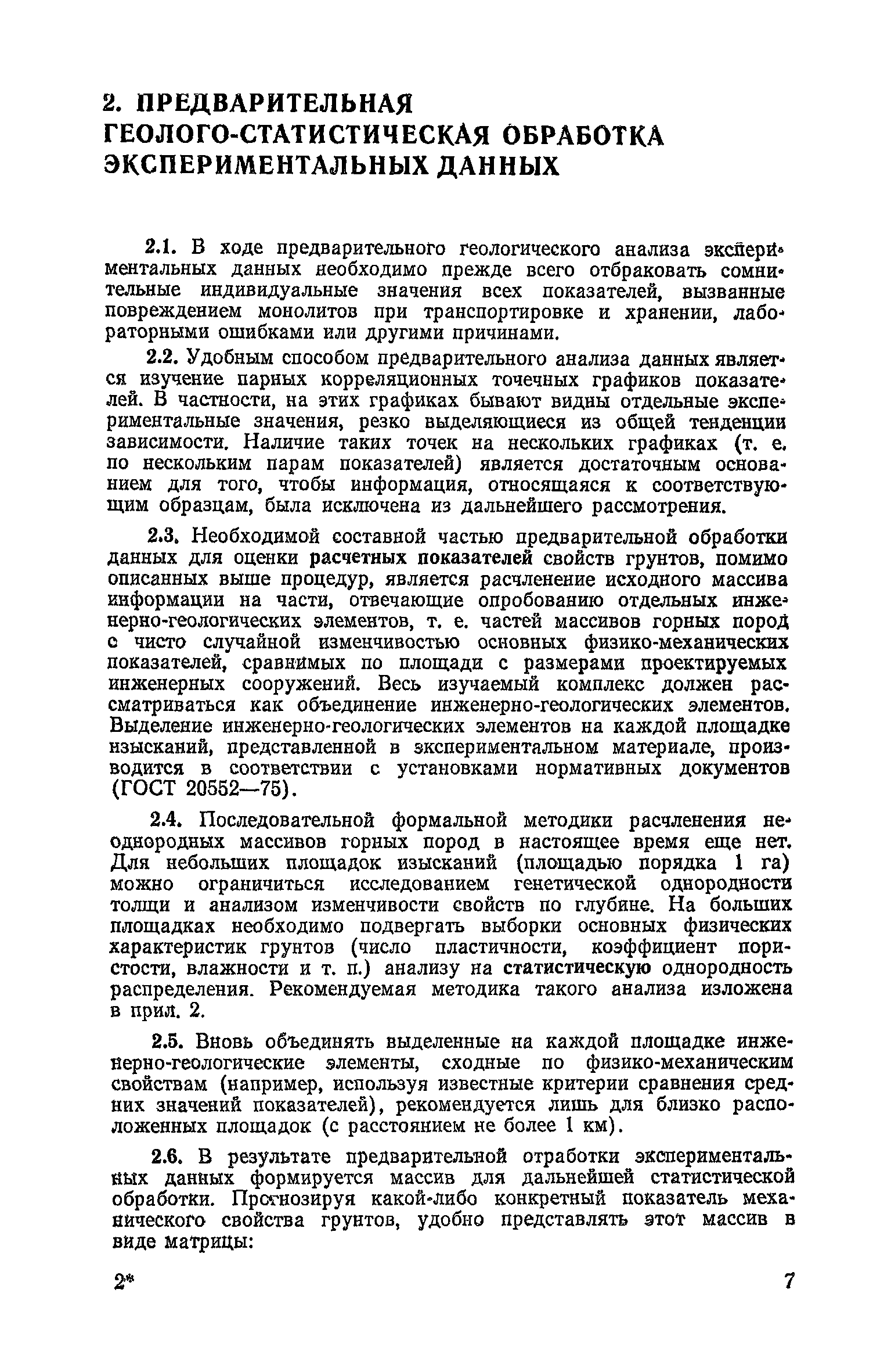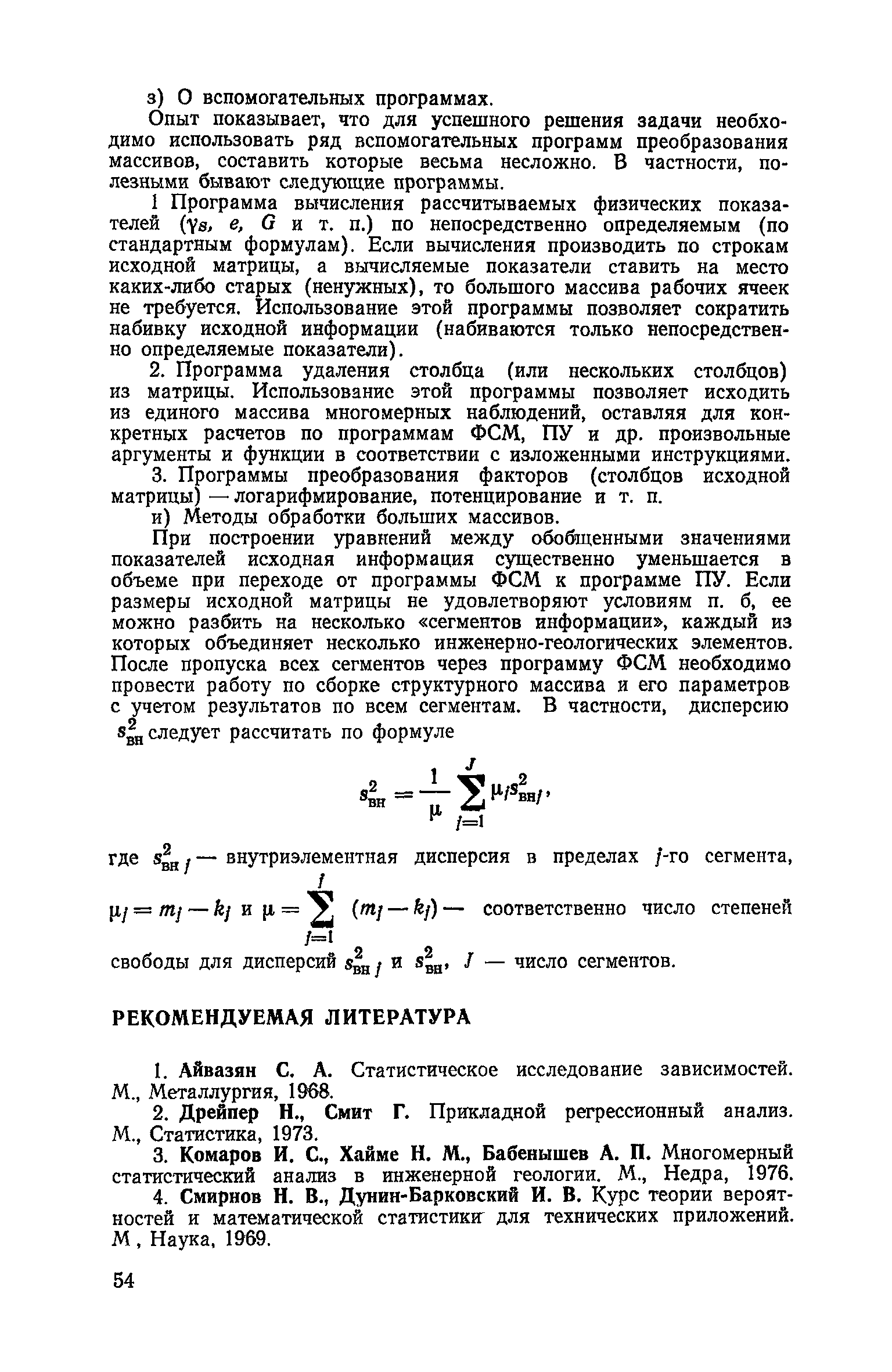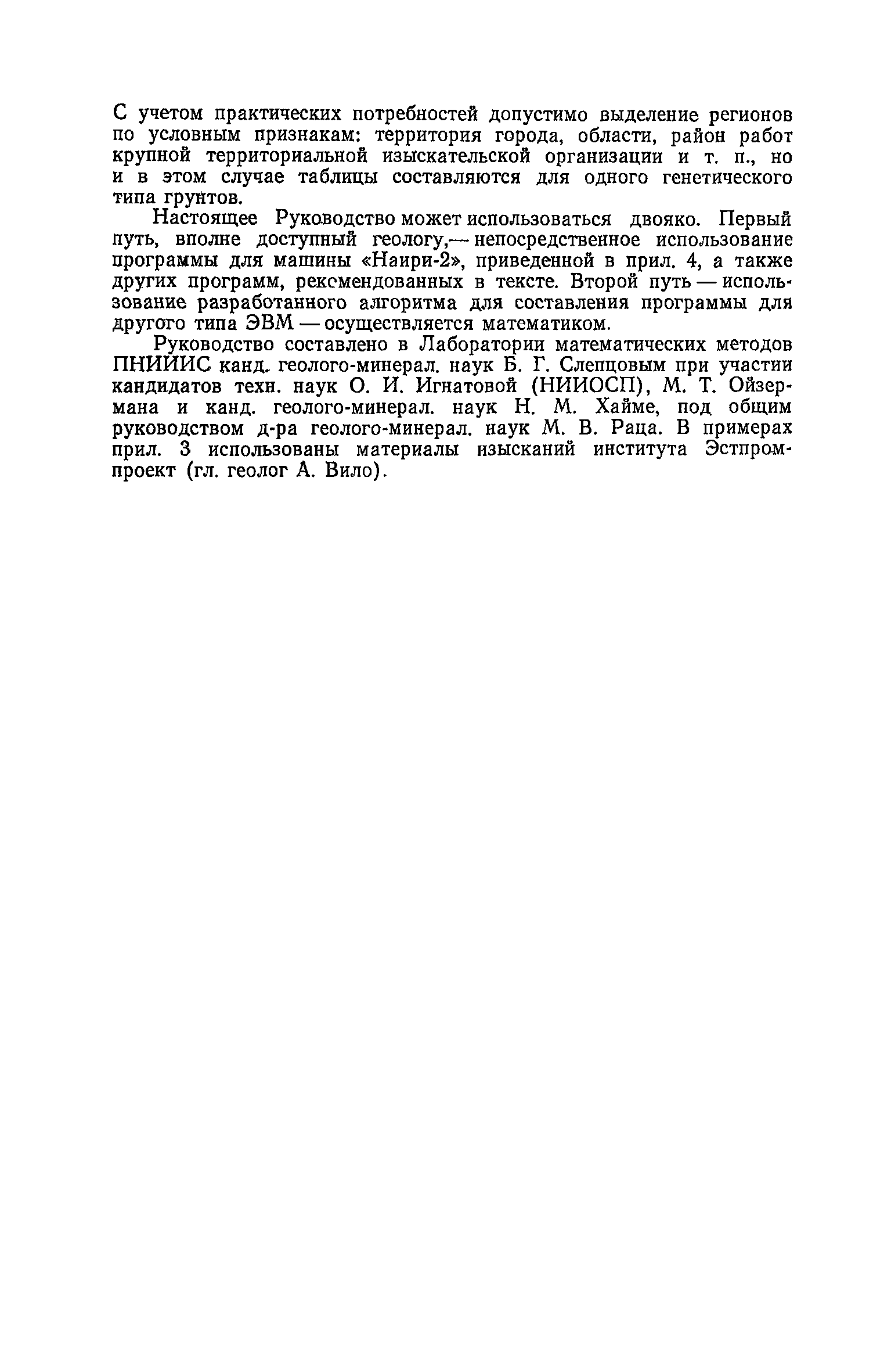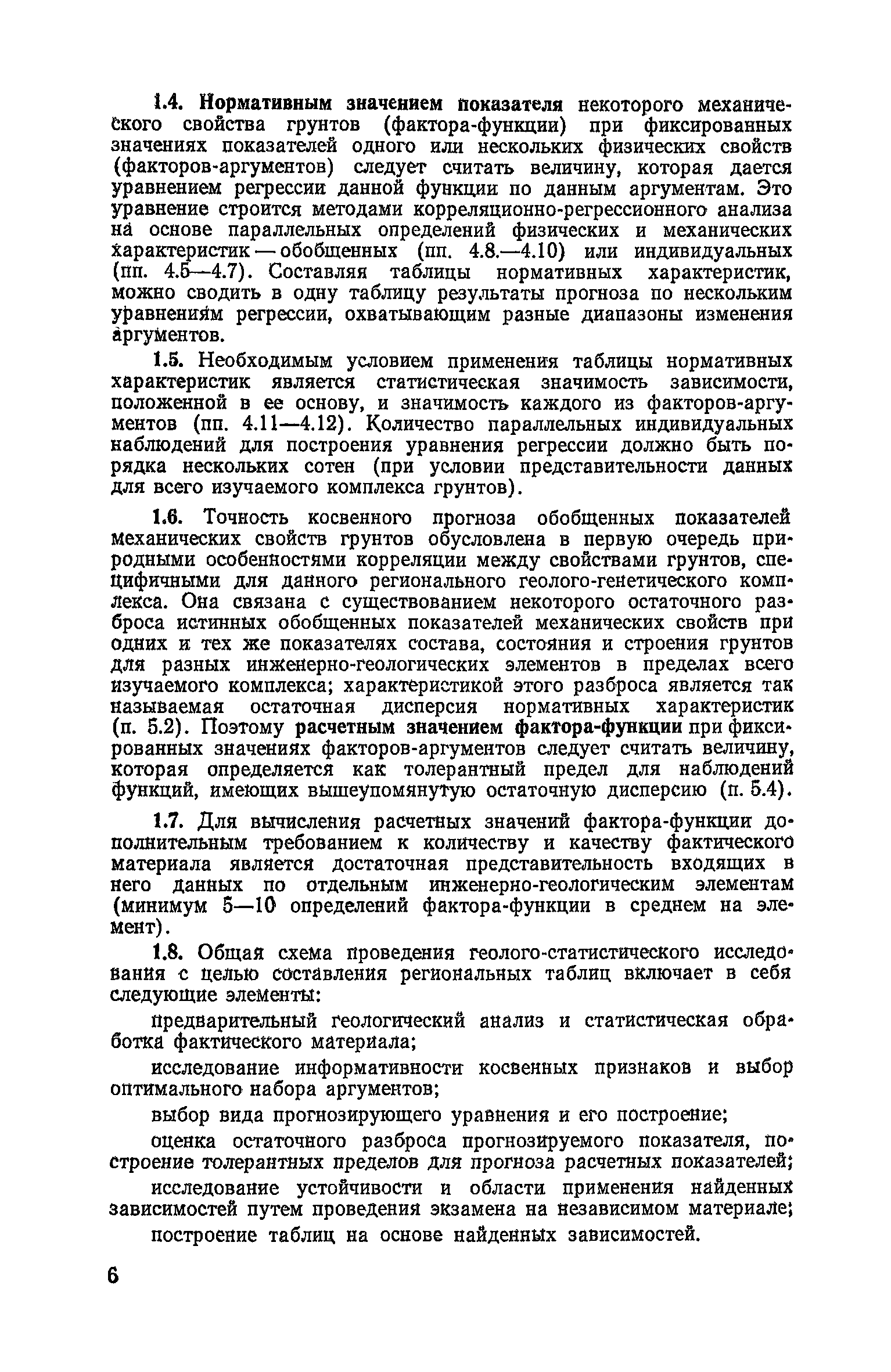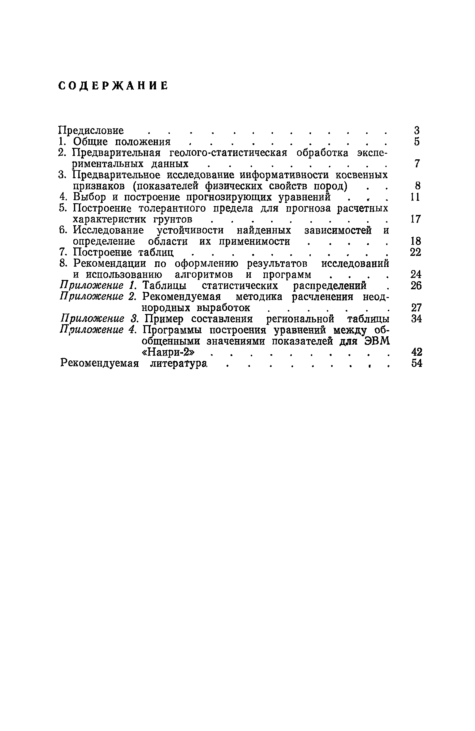 | Оглавление: | Предисловие 1. Общие положения 2. Предварительная геолого-статистическая обработка экспериментальных данных 3. Предварительное исследование информативности косвенных признаков (показателей физических свойств пород) 4. Выбор и построение прогнозирующих уравнений 5. Построение толерантного предела для прогноза расчетных характеристик грунтов 6. Исследование устойчивости найденных зависимостей и определение области их применимости 7. Построение таблиц 8. Рекомендации по оформлению результатов исследований и использованию алгоритмов и программ Приложение 1. Таблицы статистических распределений Приложение 2. Рекомендуемая методика расчленения неоднородных выработок Приложение 3. Пример составления региональной таблицы Приложение 4. Программы построения уравнений между обобщенными значениями показателей для ЭВМ "Наири-2" Рекомендуемая литература |