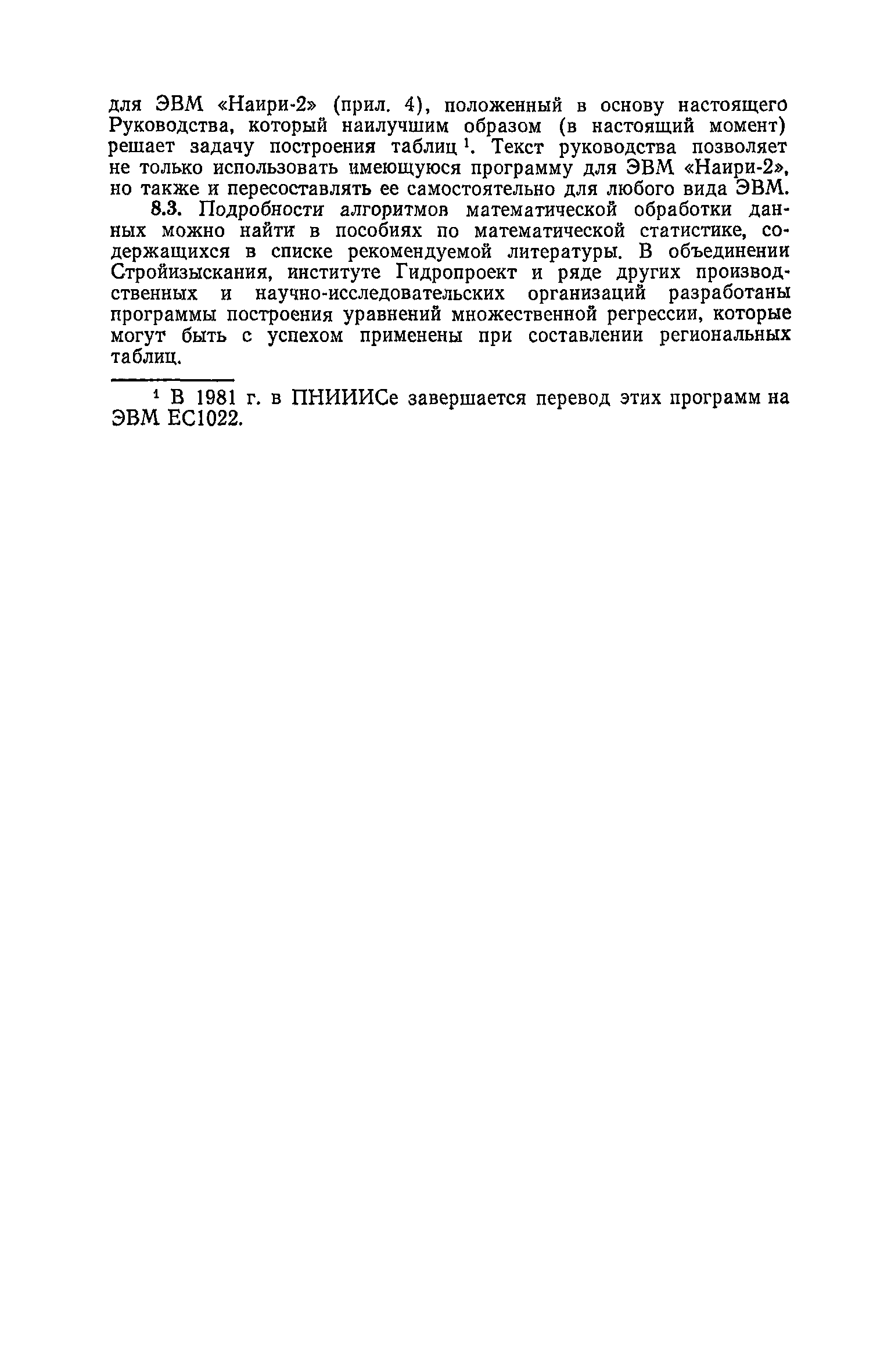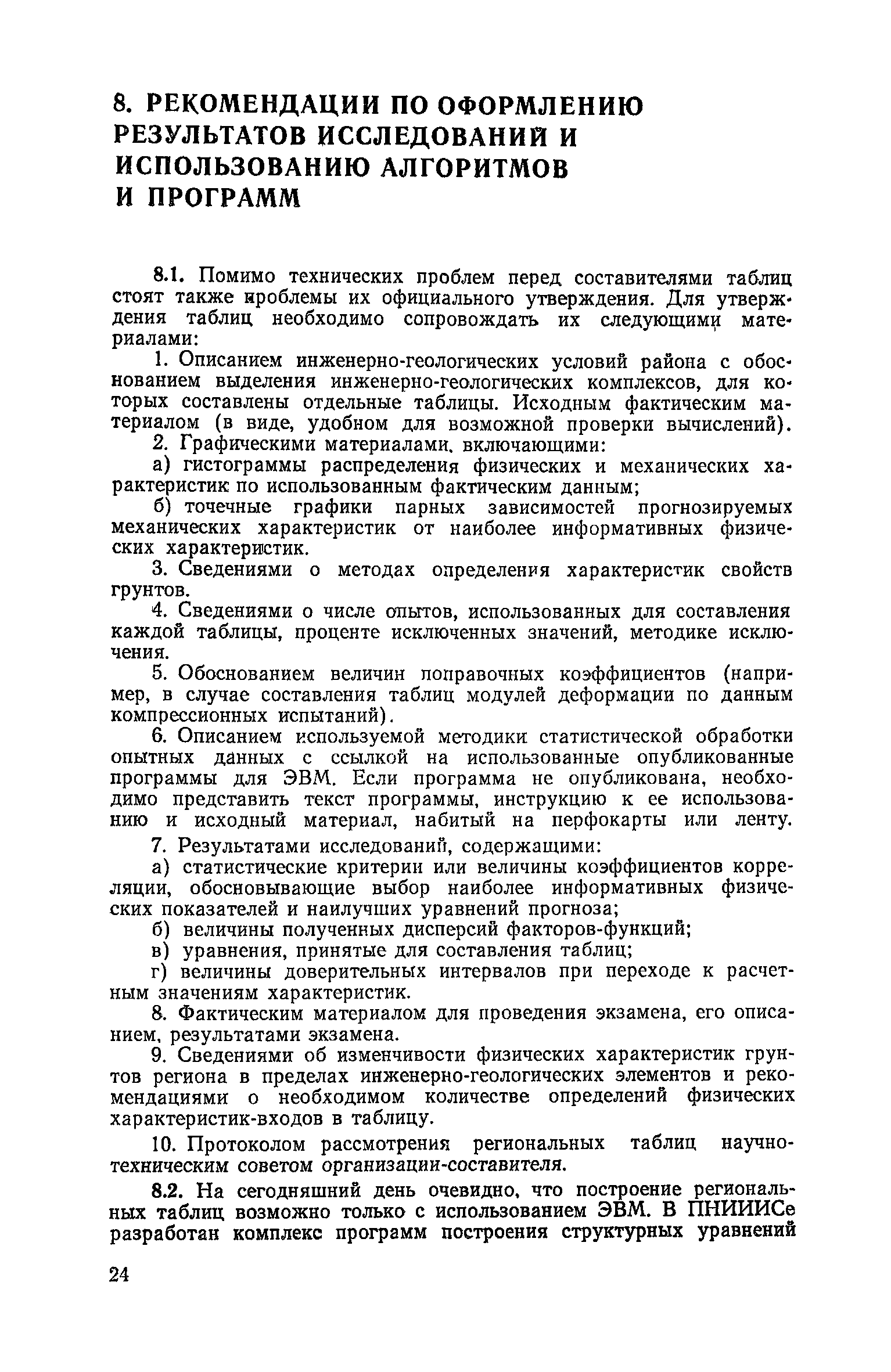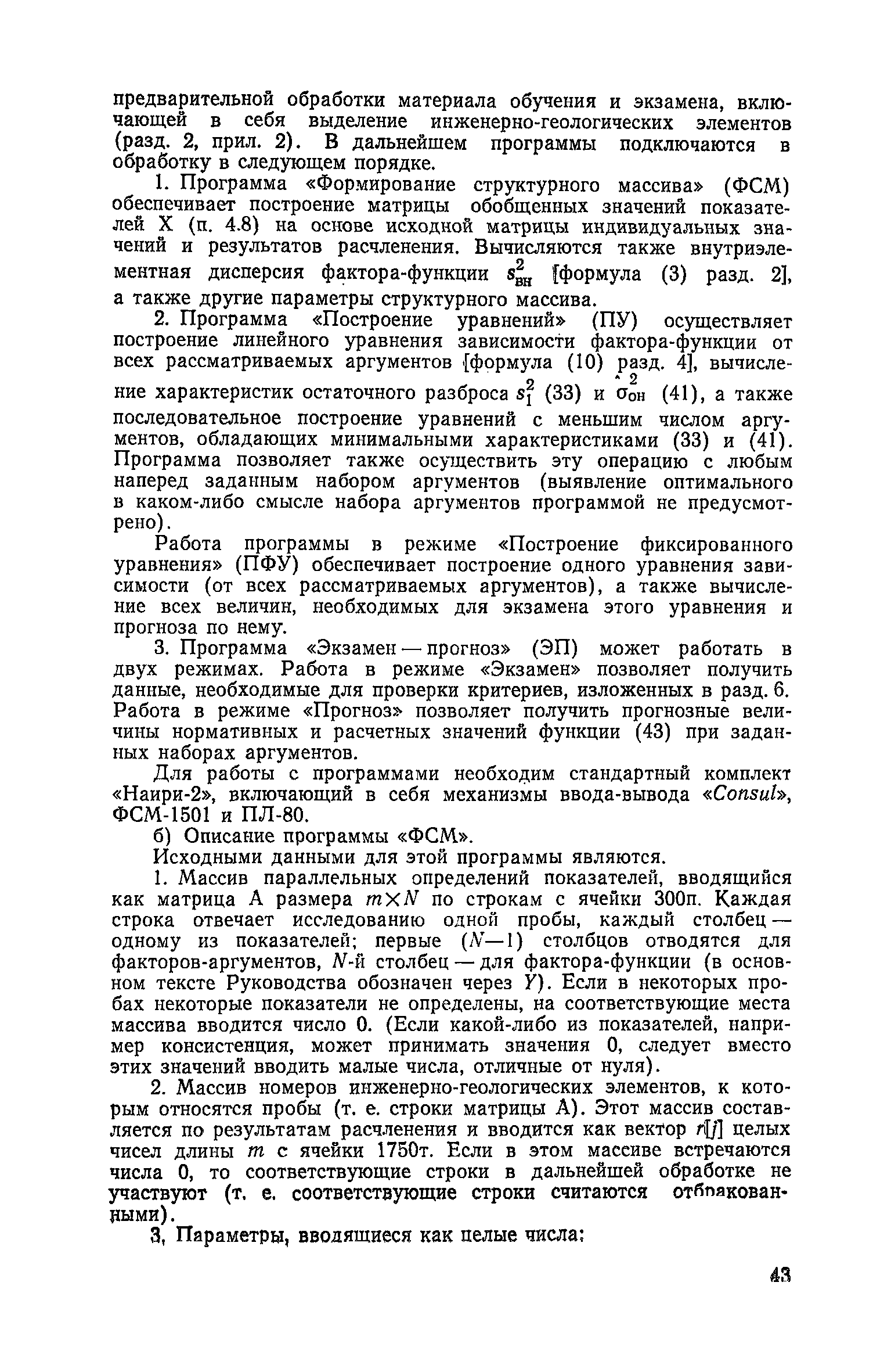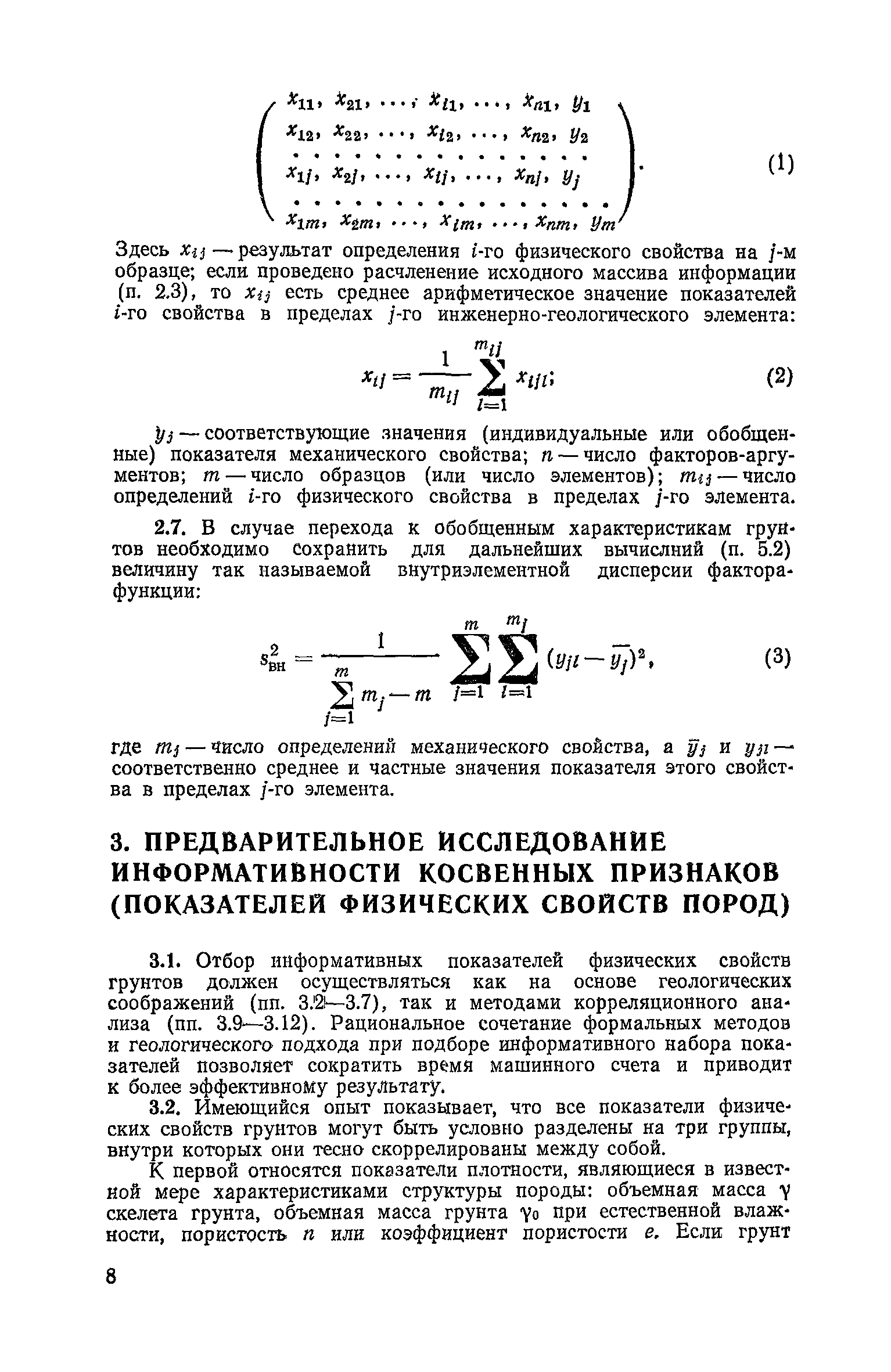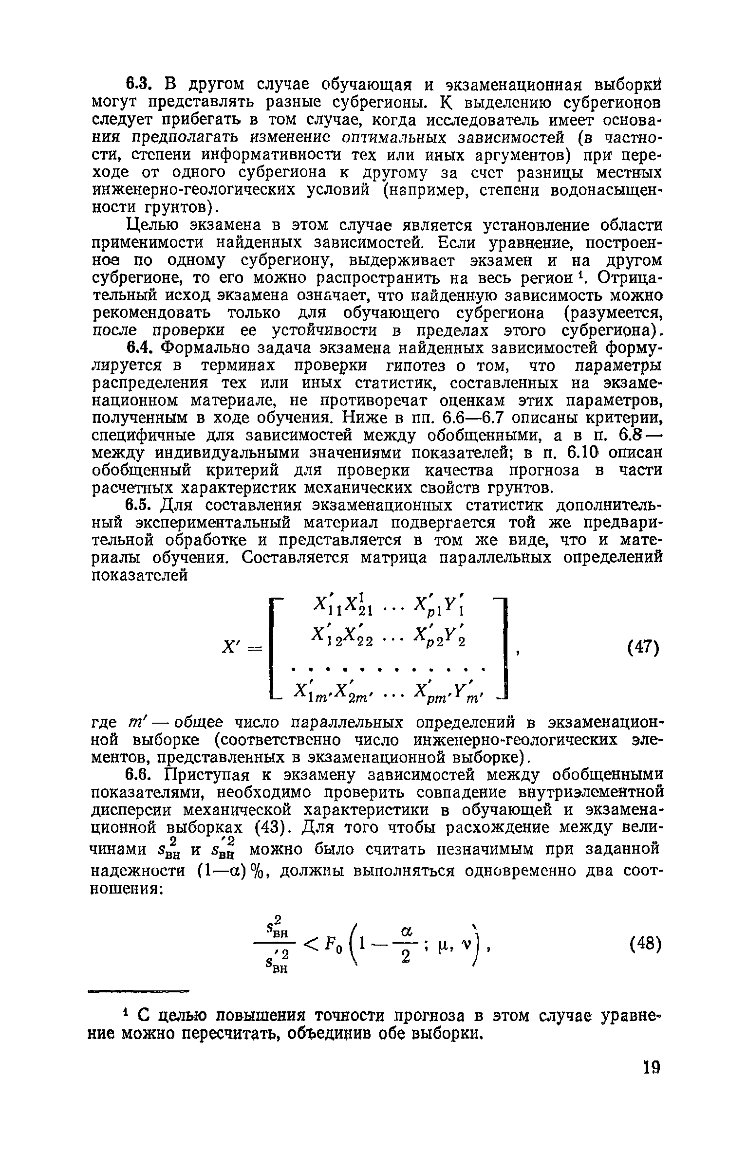 | Оглавление: | Предисловие 1. Общие положения 2. Предварительная геолого-статистическая обработка экспериментальных данных 3. Предварительное исследование информативности косвенных признаков (показателей физических свойств пород) 4. Выбор и построение прогнозирующих уравнений 5. Построение толерантного предела для прогноза расчетных характеристик грунтов 6. Исследование устойчивости найденных зависимостей и определение области их применимости 7. Построение таблиц 8. Рекомендации по оформлению результатов исследований и использованию алгоритмов и программ Приложение 1. Таблицы статистических распределений Приложение 2. Рекомендуемая методика расчленения неоднородных выработок Приложение 3. Пример составления региональной таблицы Приложение 4. Программы построения уравнений между обобщенными значениями показателей для ЭВМ "Наири-2" Рекомендуемая литература |