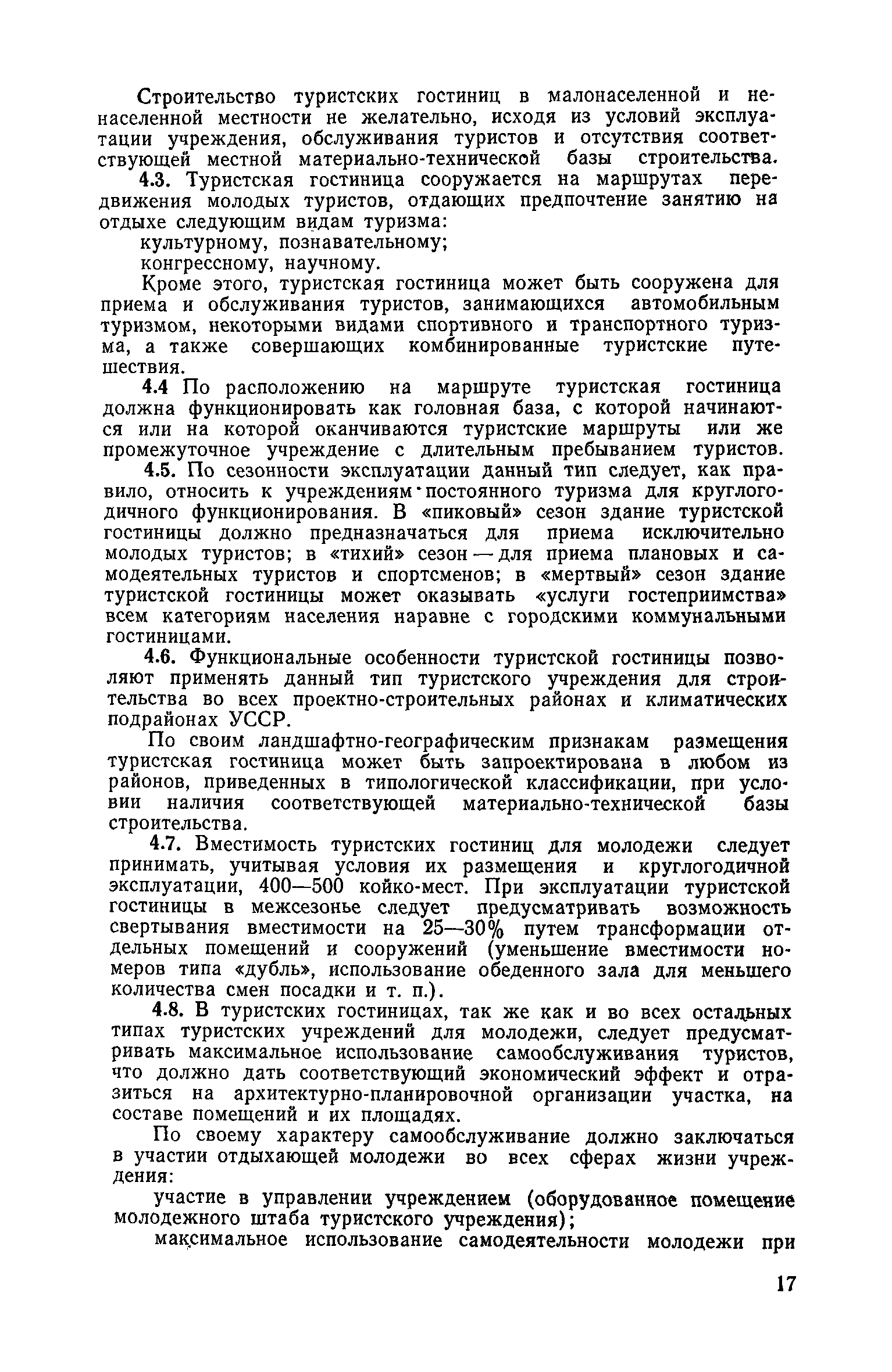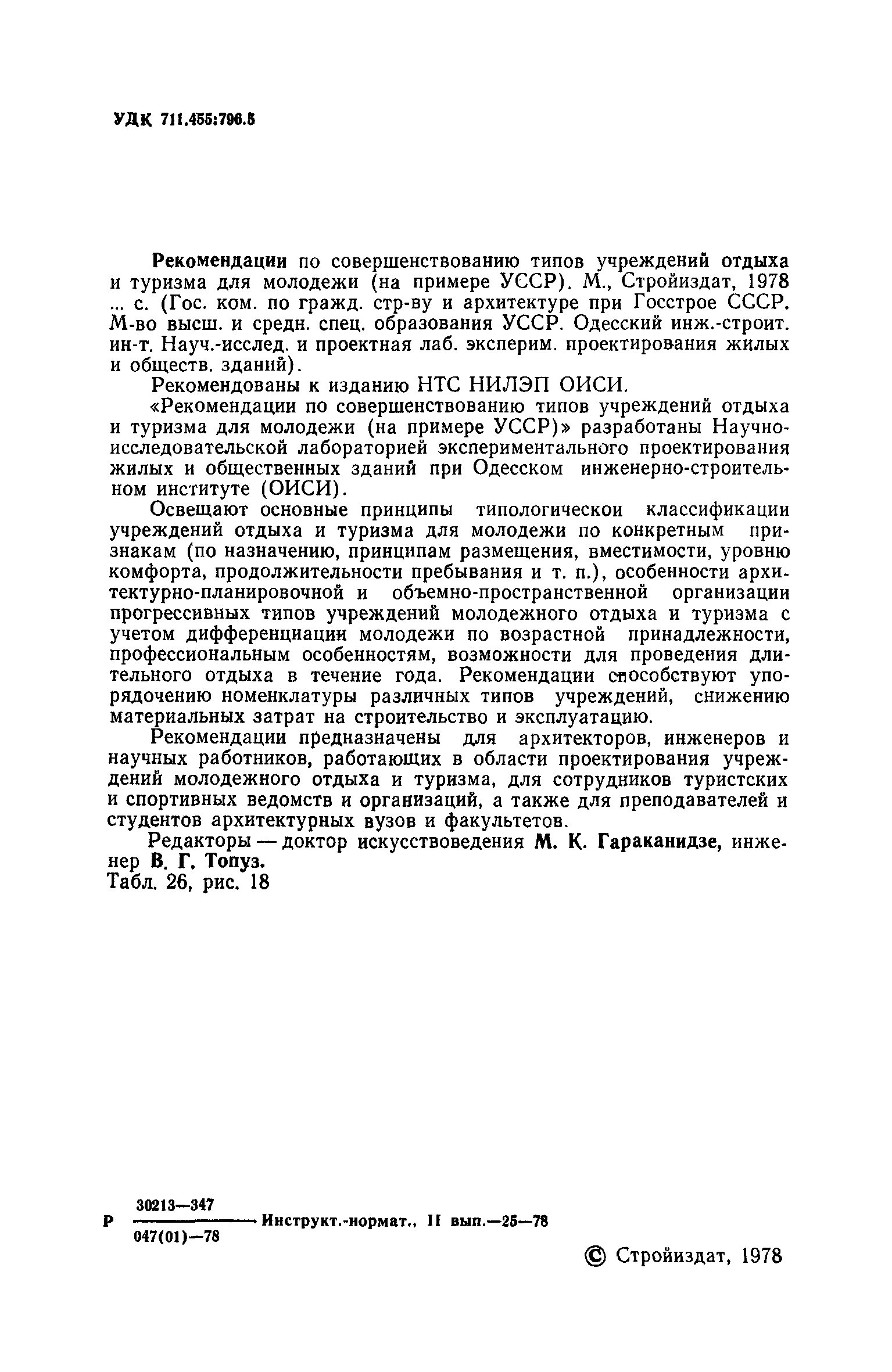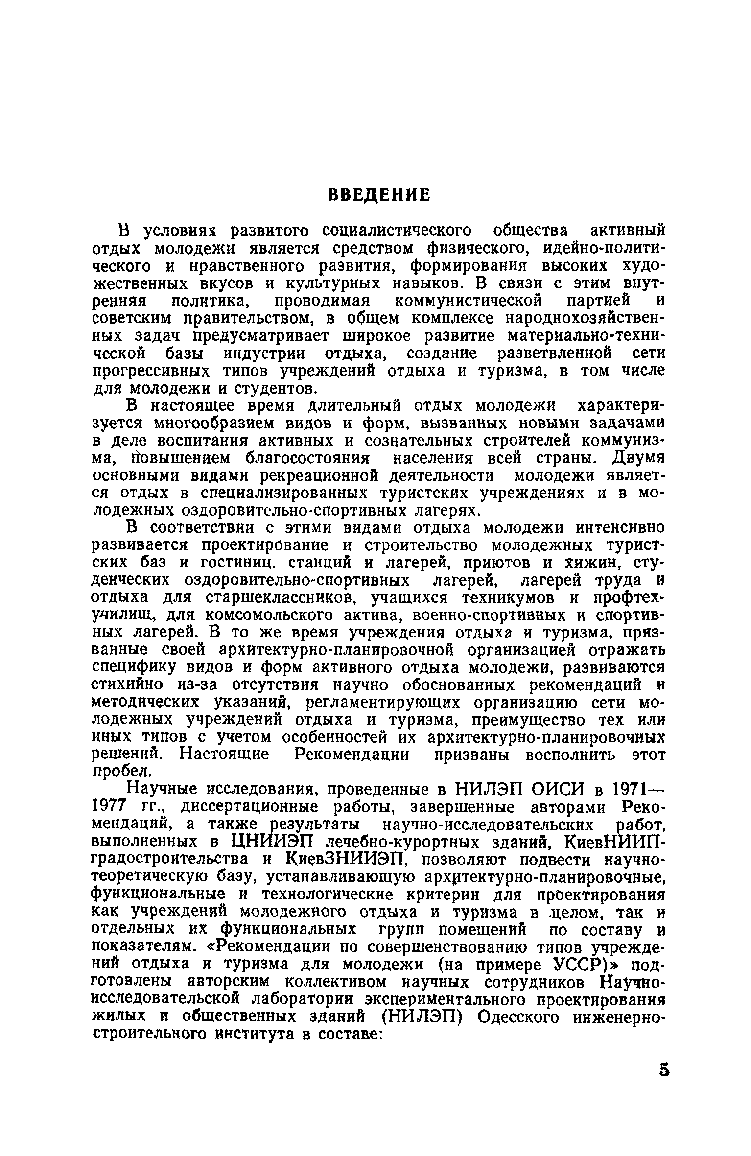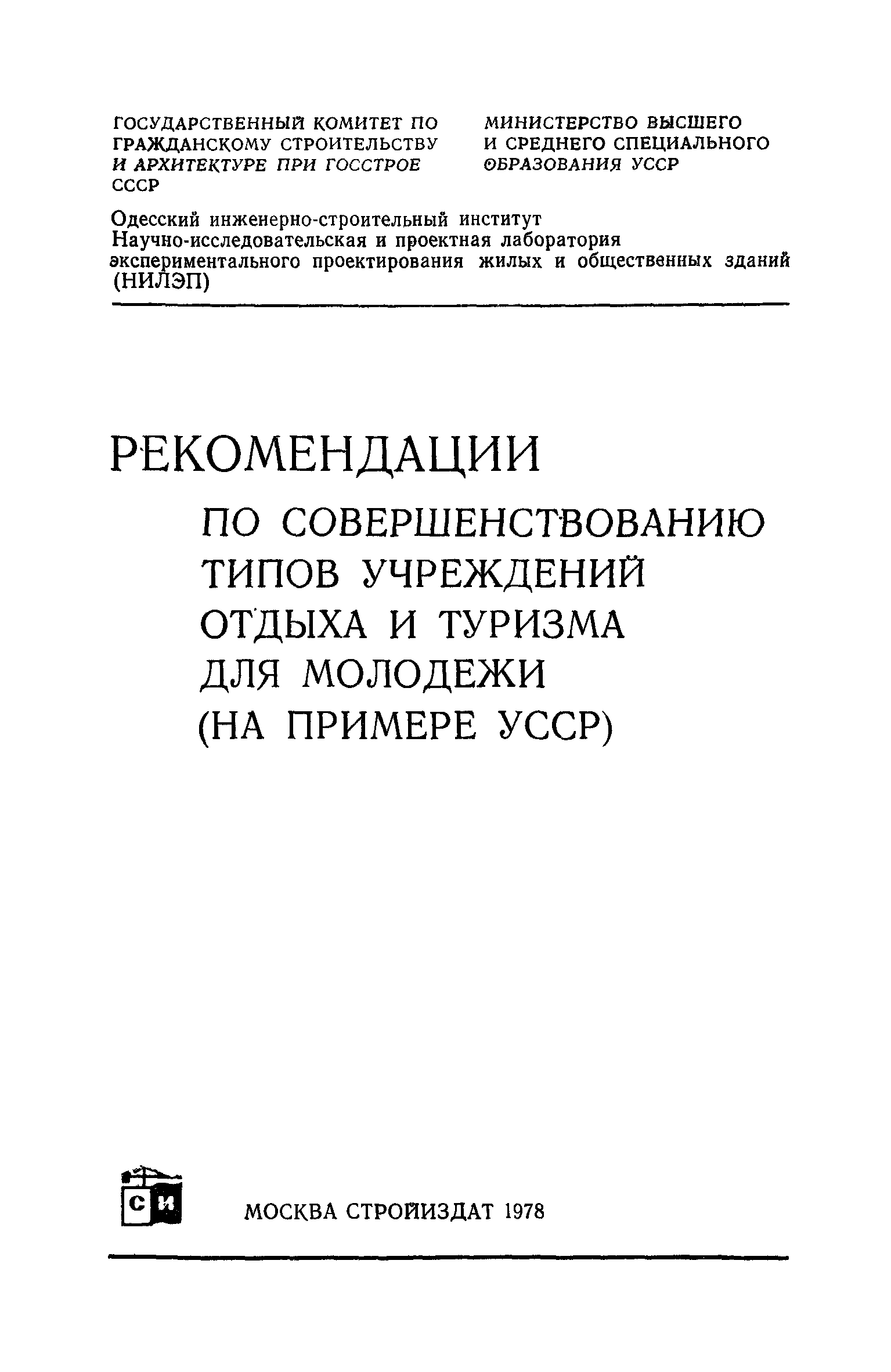 Рекомендации по совершенствованию типов учреждений отдыха и туризма для молодежи (на примере УССР)| Статус: | справочные материалы, мп, тпр | | Название рус.: | Рекомендации по совершенствованию типов учреждений отдыха и туризма для молодежи (на примере УССР) | | Дата добавления в базу: | 01.10.2014 | | Дата актуализации: | 01.01.2021 | | Область применения: | Документ освещает основные принципы типологической классификации учреждений отдыха и туризма для молодежи по конкретным признакам (по назначению, принципам размещения, вместимости, уровню комфорта, продолжительности пребывания и т. п.), особенности архитектурно-планировочной и объемно-пространственной организации прогрессивных типов учреждений молодежного отдыха и туризма с учетом дифференциации молодежи по возрастной принадлежности, профессиональным особенностям, возможности для проведения длительного отдыха в течение года. Рекомендации способствуют упорядочению номенклатуры различных типов учреждений, снижению материальных затрат на строительство и эксплуатацию. Рекомендации предназначены для архитекторов, инженеров и научных работников, работающих в области проектирования учреждений молодежного отдыха и туризма, для сотрудников туристских и спортивных ведомств и организаций, а также для преподавателей и студентов архитектурных вузов и факультетов. | | Оглавление: | Введение 1. Общие положения 2. Классификация типов учреждений отдыха и туризма для молодежи 3. Типы учреждений отдыха для молодежи и студентов 4. Типы учреждений туризма для молодежи 5. Учет природно-климатических условий при проектировании учреждений отдыха и туризма для молодежи на территории Украинской ССР 6. Архитектурно-планировочная организация территории учреждений отдыха и туризма для молодежи 7. Выбор рациональных планово-композиционных приемов и объемно-пространственных решений основных зданий и помещений 8. Принципы трансформации в учреждениях отдыха и туризма для молодежи 9. Применение современных конструктивных решений при проектировании учреждений отдыха и туризма для молодежи 10. Инженерное оборудование и сети | | Разработан: | НИЛЭП ОИСИ Одесский инженерно-строительный институт (ОИСИ)