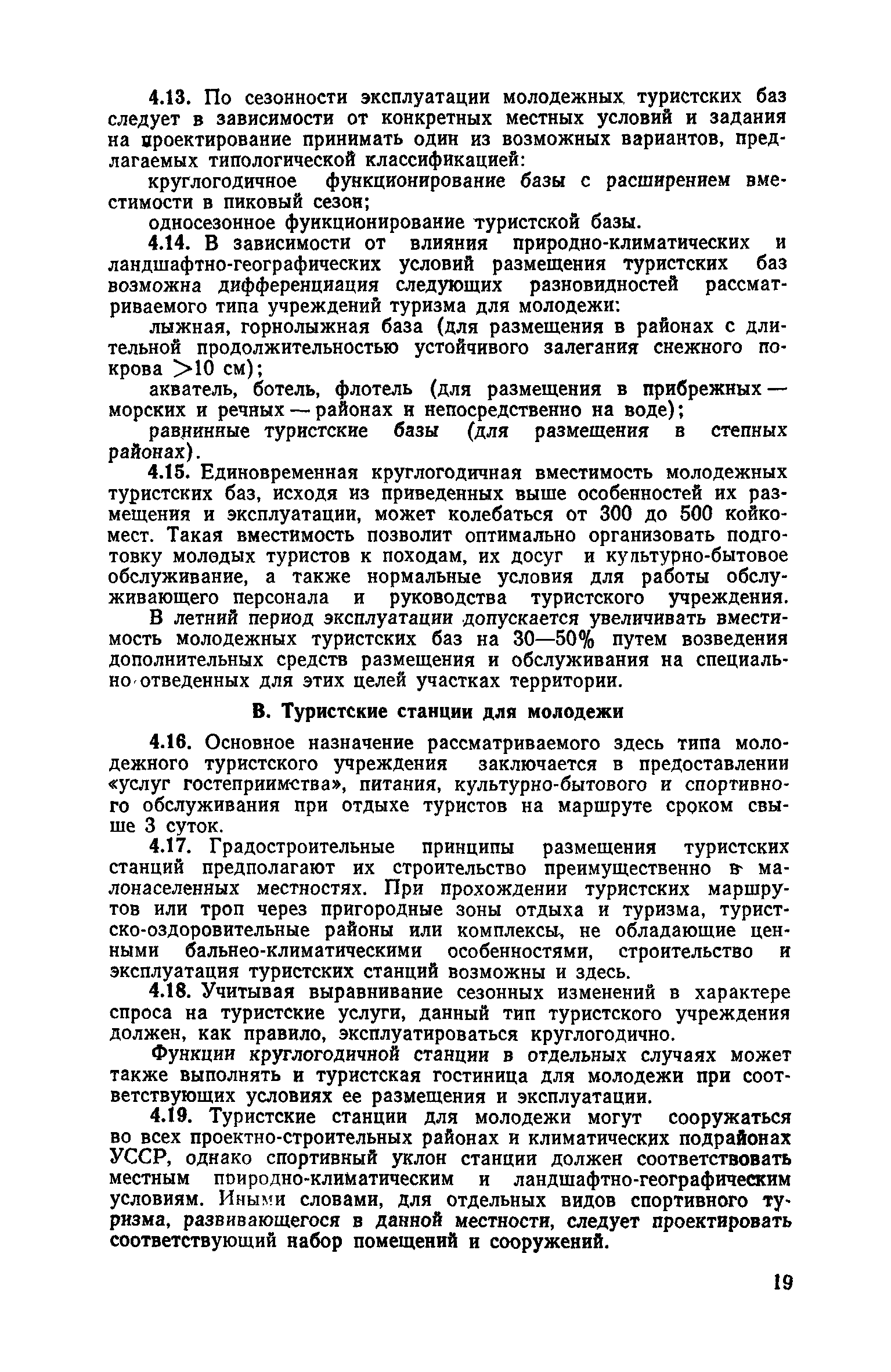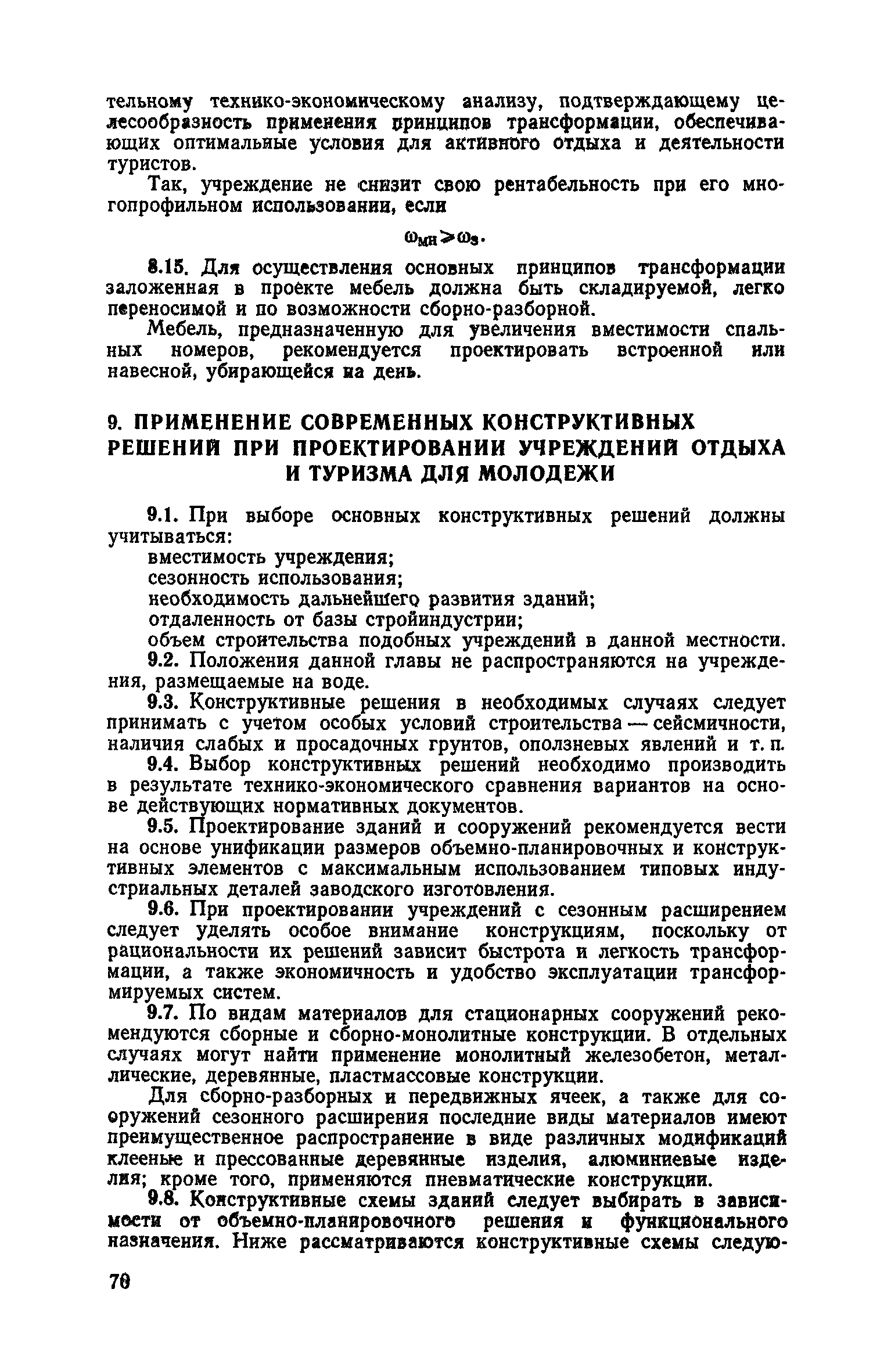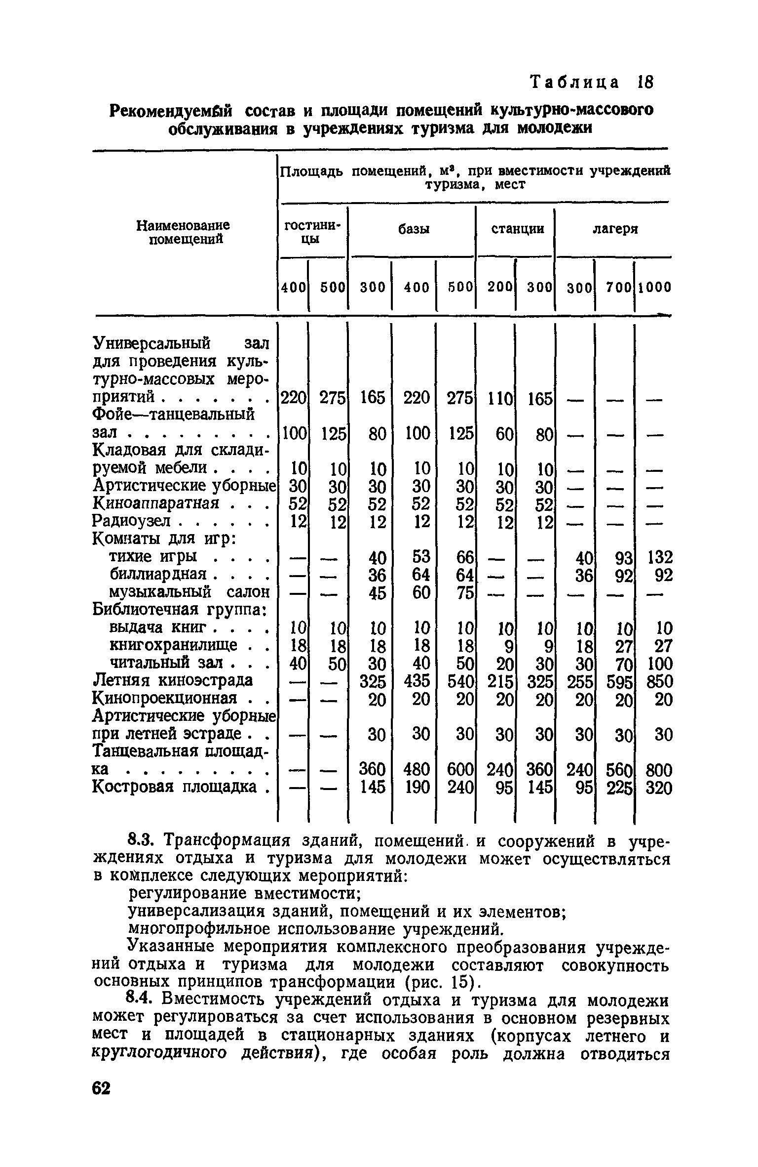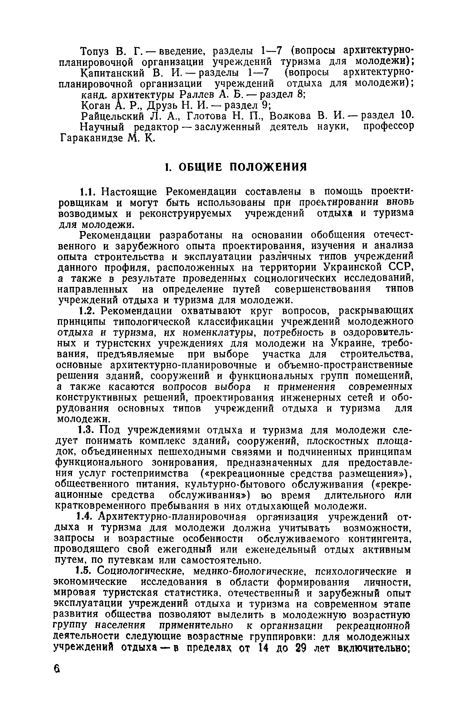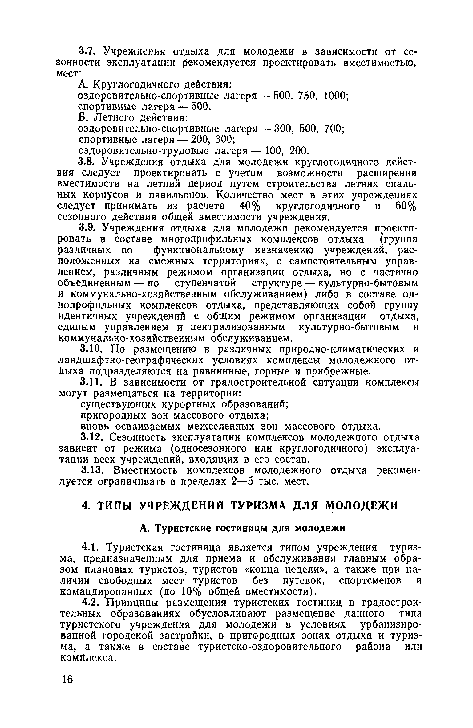 Рекомендации по совершенствованию типов учреждений отдыха и туризма для молодежи (на примере УССР)| Статус: | справочные материалы, мп, тпр | | Название рус.: | Рекомендации по совершенствованию типов учреждений отдыха и туризма для молодежи (на примере УССР) | | Дата добавления в базу: | 01.10.2014 | | Дата актуализации: | 01.01.2021 | | Область применения: | Документ освещает основные принципы типологической классификации учреждений отдыха и туризма для молодежи по конкретным признакам (по назначению, принципам размещения, вместимости, уровню комфорта, продолжительности пребывания и т. п.), особенности архитектурно-планировочной и объемно-пространственной организации прогрессивных типов учреждений молодежного отдыха и туризма с учетом дифференциации молодежи по возрастной принадлежности, профессиональным особенностям, возможности для проведения длительного отдыха в течение года. Рекомендации способствуют упорядочению номенклатуры различных типов учреждений, снижению материальных затрат на строительство и эксплуатацию. Рекомендации предназначены для архитекторов, инженеров и научных работников, работающих в области проектирования учреждений молодежного отдыха и туризма, для сотрудников туристских и спортивных ведомств и организаций, а также для преподавателей и студентов архитектурных вузов и факультетов. | | Оглавление: | Введение 1. Общие положения 2. Классификация типов учреждений отдыха и туризма для молодежи 3. Типы учреждений отдыха для молодежи и студентов 4. Типы учреждений туризма для молодежи 5. Учет природно-климатических условий при проектировании учреждений отдыха и туризма для молодежи на территории Украинской ССР 6. Архитектурно-планировочная организация территории учреждений отдыха и туризма для молодежи 7. Выбор рациональных планово-композиционных приемов и объемно-пространственных решений основных зданий и помещений 8. Принципы трансформации в учреждениях отдыха и туризма для молодежи 9. Применение современных конструктивных решений при проектировании учреждений отдыха и туризма для молодежи 10. Инженерное оборудование и сети | | Разработан: | НИЛЭП ОИСИ Одесский инженерно-строительный институт (ОИСИ)