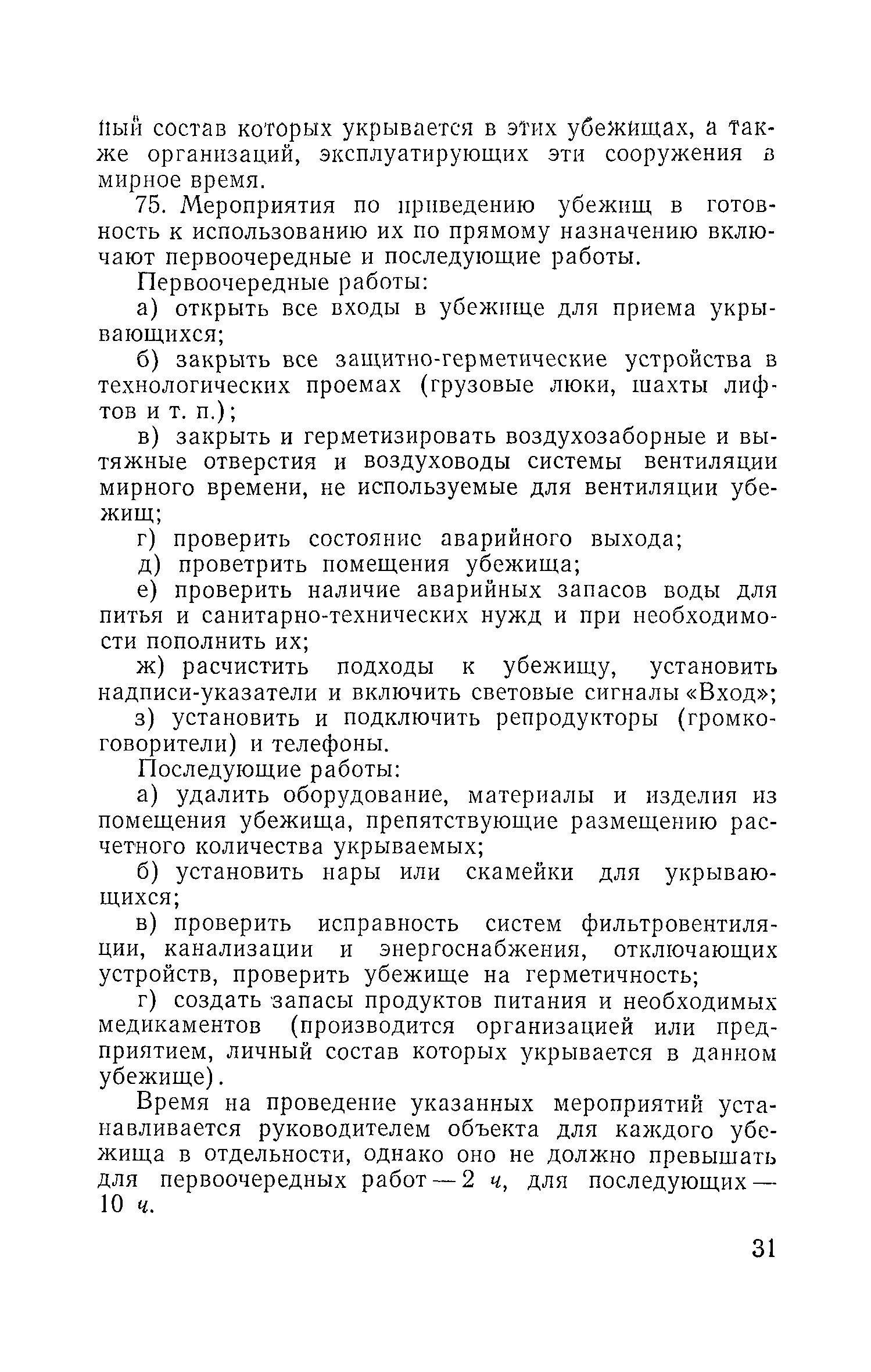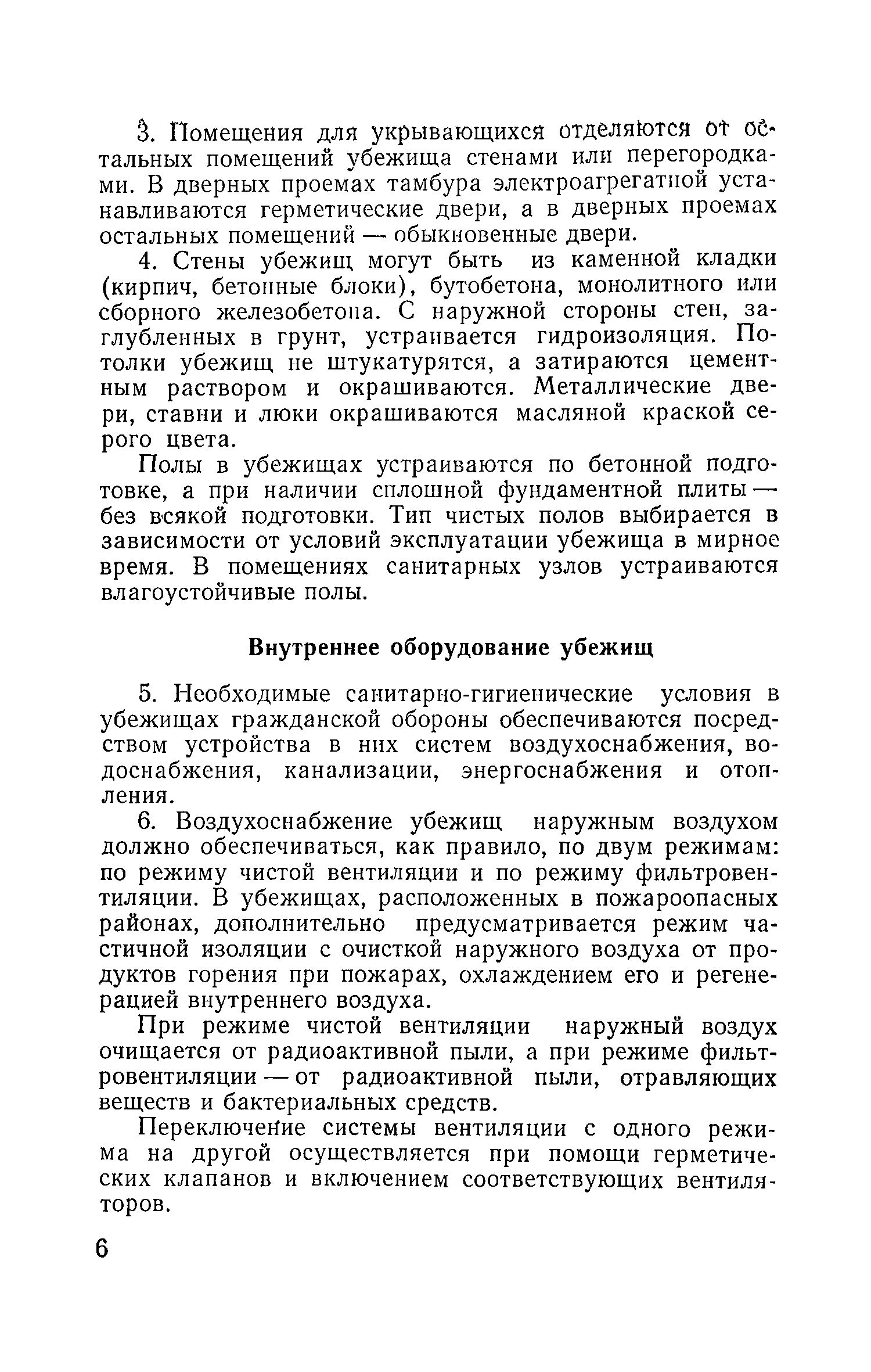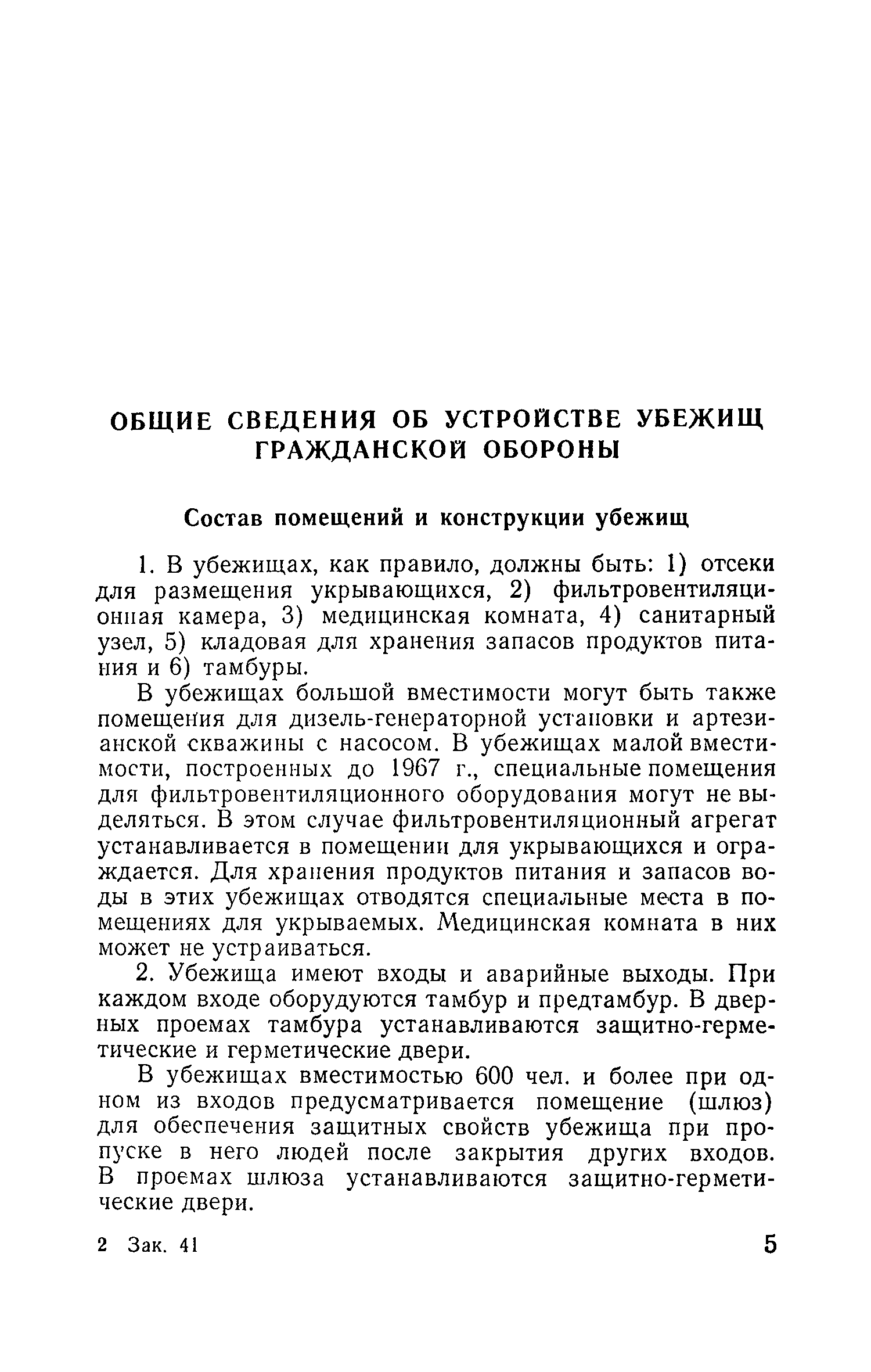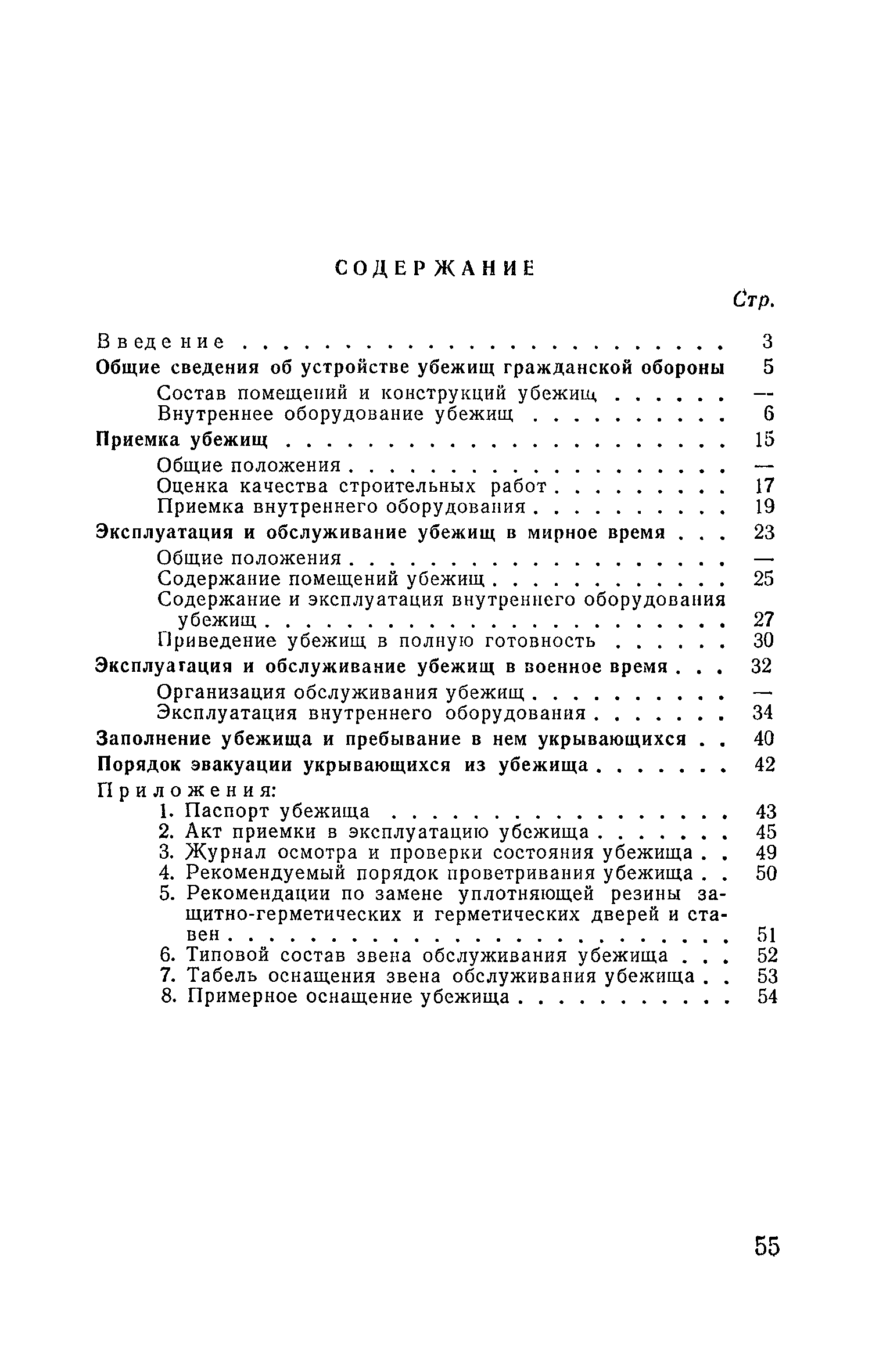 | Оглавление: | Введение Общие сведения об устройстве убежищ гражданской обороны Состав помещений и конструкций убежищ Внутреннее оборудование убежищ Приемка убежищ Общие положения Оценка качества строительных работ Приемка внутреннего оборудования Эксплуатация и обслуживание убежищ в мирное время Общие положения Содержание помещений убежищ Содержание и эксплуатация внутреннего оборудования убежищ Приведение убежищ в полную готовность Эксплуатация и обслуживание убежищ в военное время Организация обслуживания убежищ Эксплуатация внутреннего оборудования Заполнение убежища и пребывание в нем укрывающихся Порядок эвакуации укрывающихся из убежища Приложение 1. Паспорт убежища Приложение 2. Акт приемки в эксплуатацию убежища Приложение 3. Журнал осмотра и проверки состояния убежища Приложение 4. Рекомендуемый порядок проветривания убежища Приложение 5. Рекомендации по замене уплотняющей резины защитно-герметических и герметических дверей и ставен Приложение 6. Типовой состав звена обслуживания убежища Приложение 7. Табель оснащения звена обслуживания убежища Приложение 8. Примерное оснащение убежища |