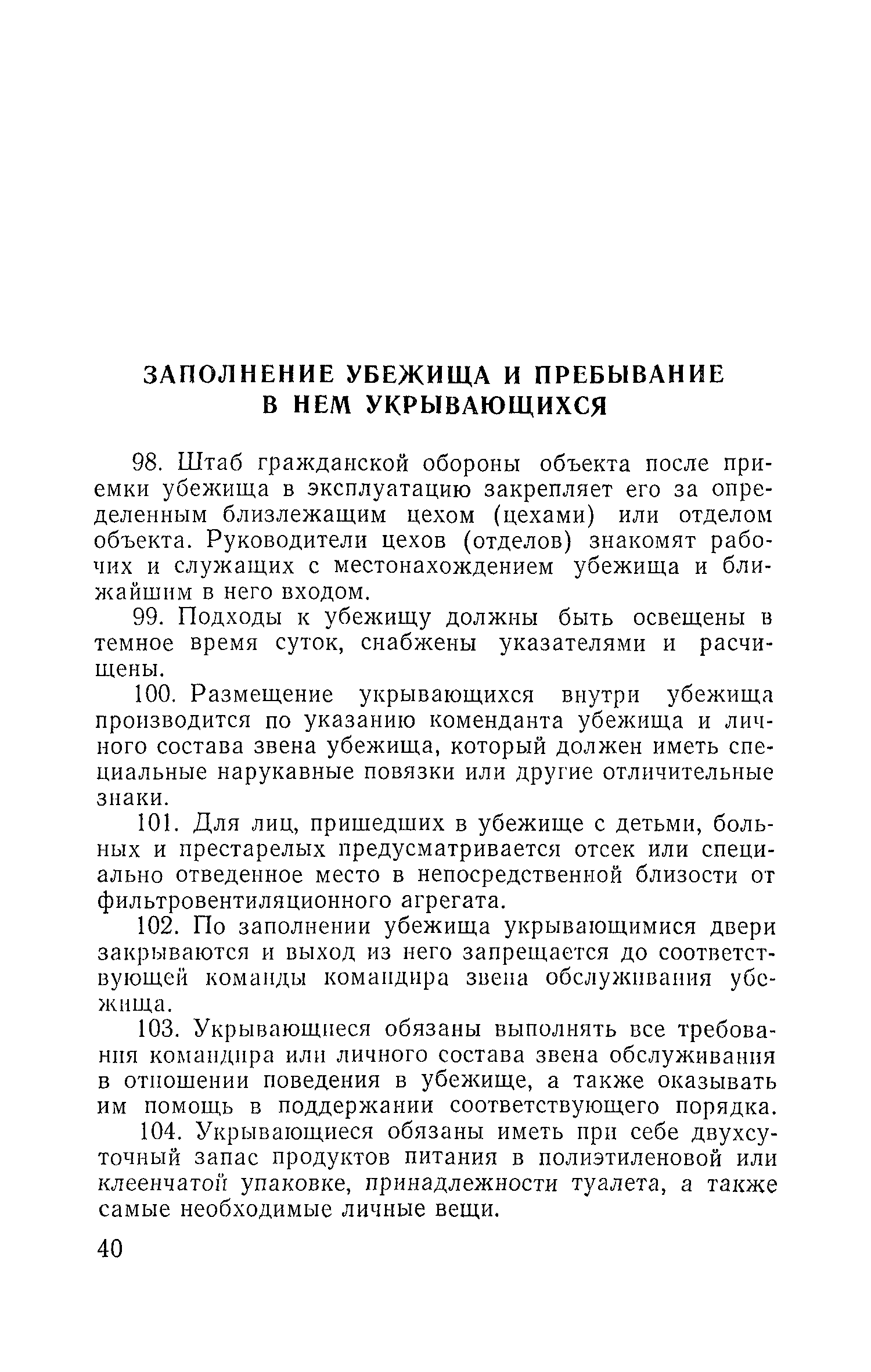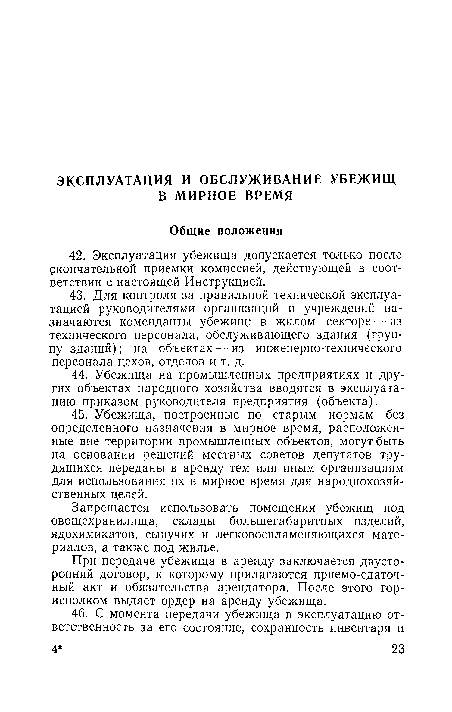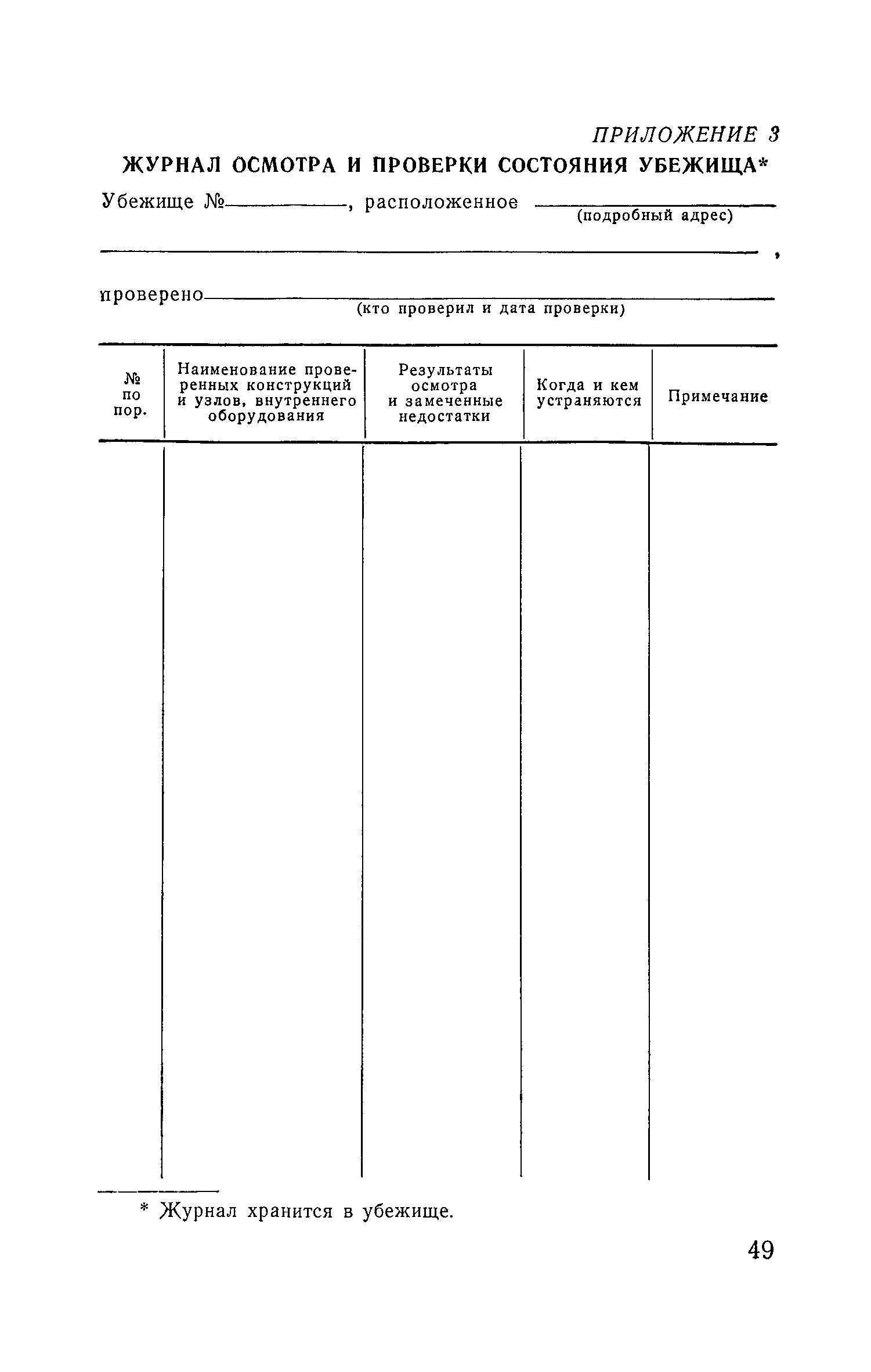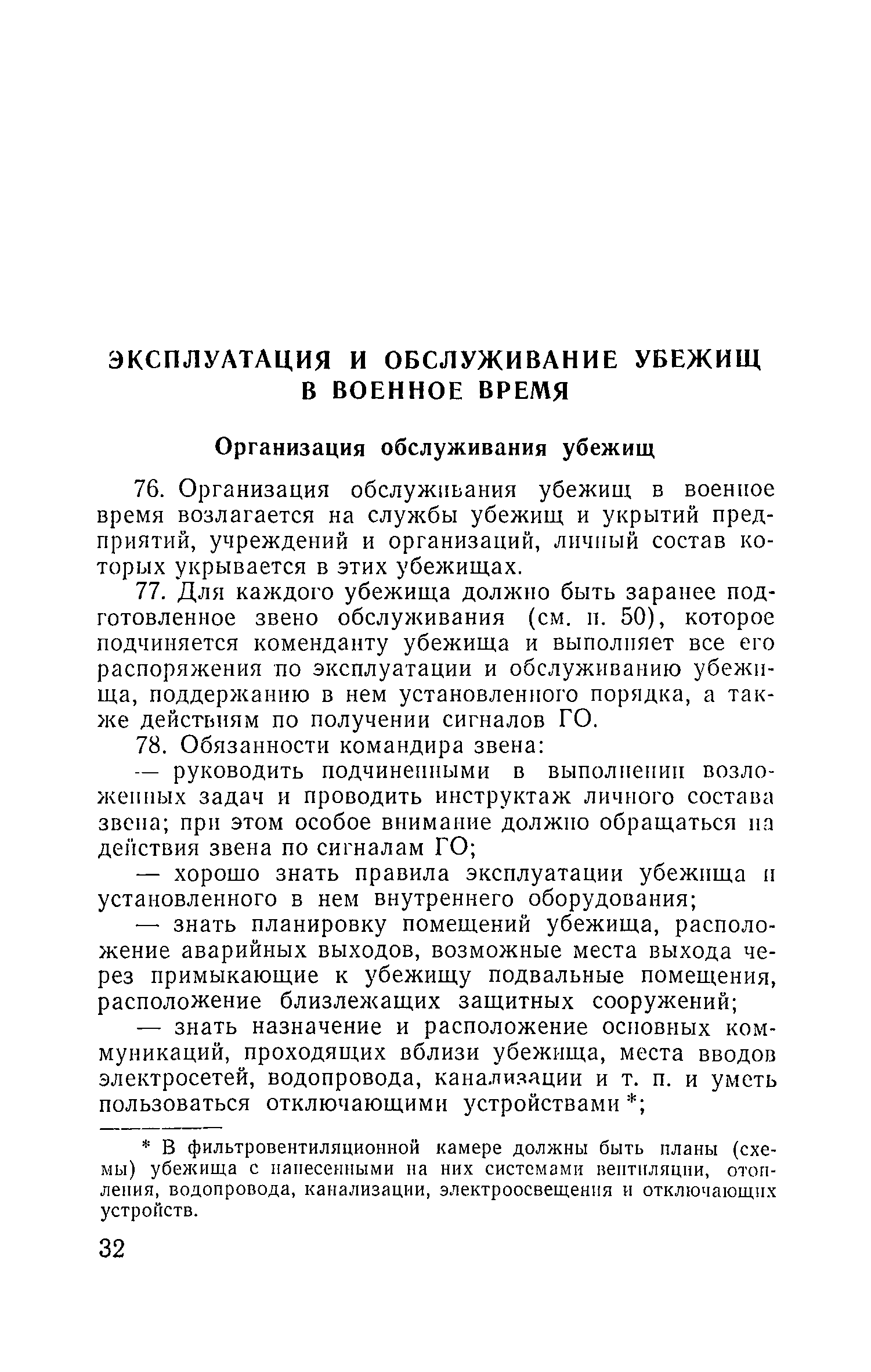 | Оглавление: | Введение Общие сведения об устройстве убежищ гражданской обороны Состав помещений и конструкций убежищ Внутреннее оборудование убежищ Приемка убежищ Общие положения Оценка качества строительных работ Приемка внутреннего оборудования Эксплуатация и обслуживание убежищ в мирное время Общие положения Содержание помещений убежищ Содержание и эксплуатация внутреннего оборудования убежищ Приведение убежищ в полную готовность Эксплуатация и обслуживание убежищ в военное время Организация обслуживания убежищ Эксплуатация внутреннего оборудования Заполнение убежища и пребывание в нем укрывающихся Порядок эвакуации укрывающихся из убежища Приложение 1. Паспорт убежища Приложение 2. Акт приемки в эксплуатацию убежища Приложение 3. Журнал осмотра и проверки состояния убежища Приложение 4. Рекомендуемый порядок проветривания убежища Приложение 5. Рекомендации по замене уплотняющей резины защитно-герметических и герметических дверей и ставен Приложение 6. Типовой состав звена обслуживания убежища Приложение 7. Табель оснащения звена обслуживания убежища Приложение 8. Примерное оснащение убежища |