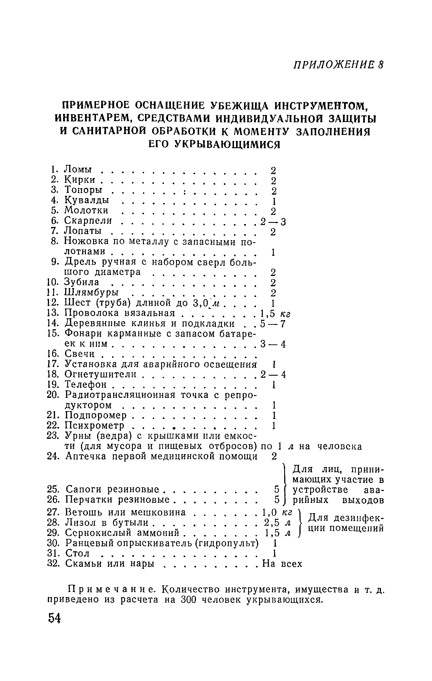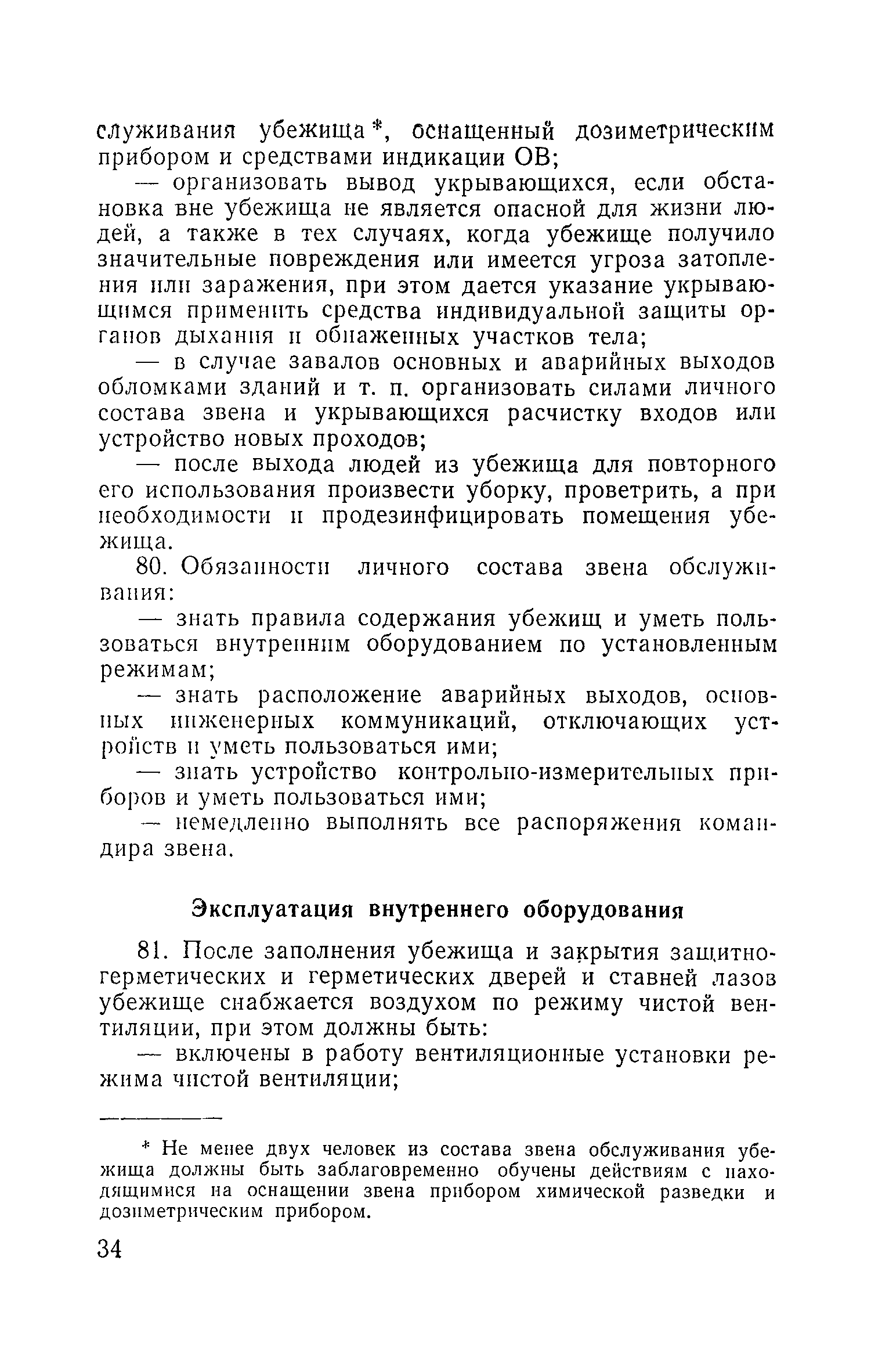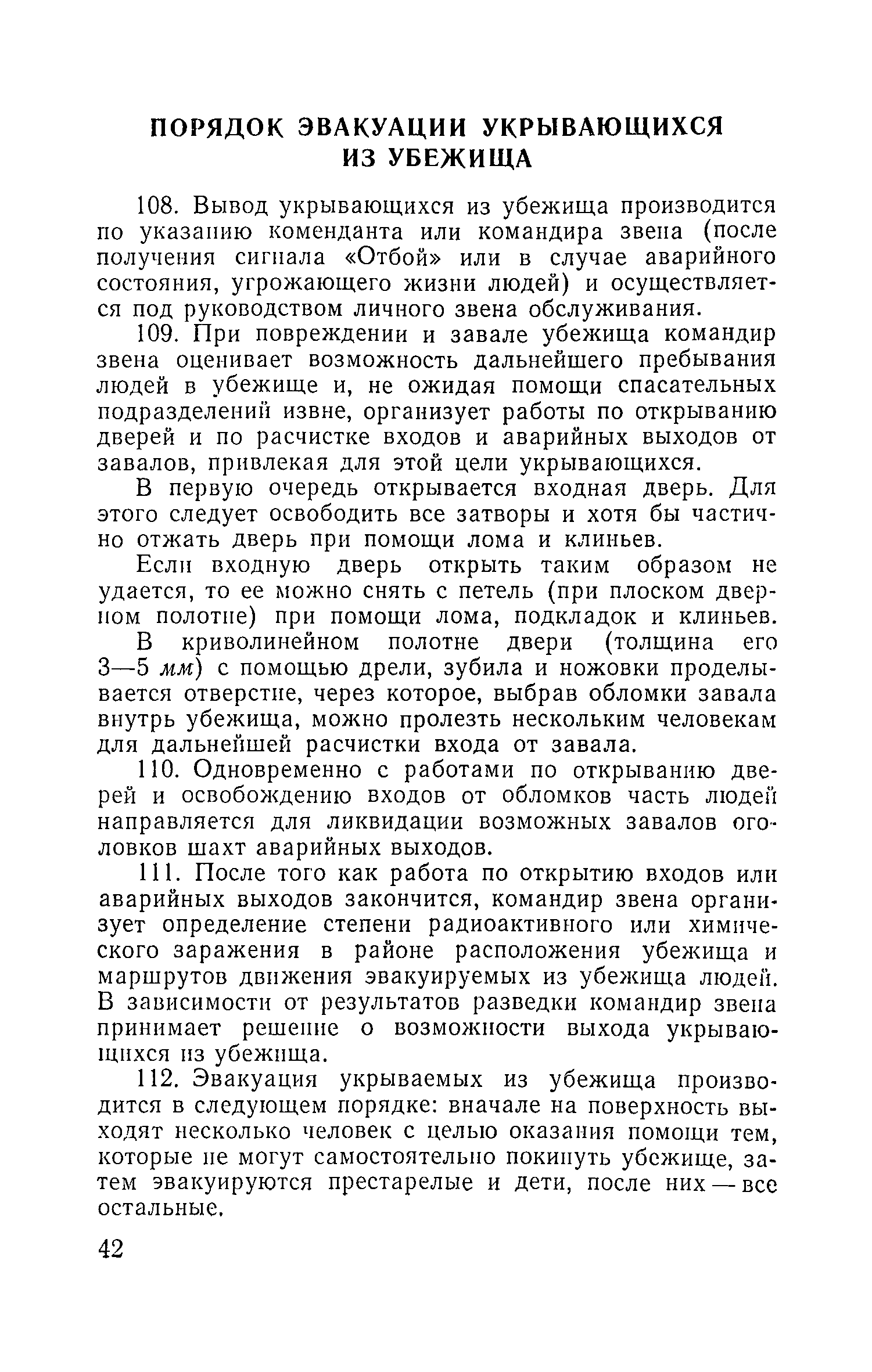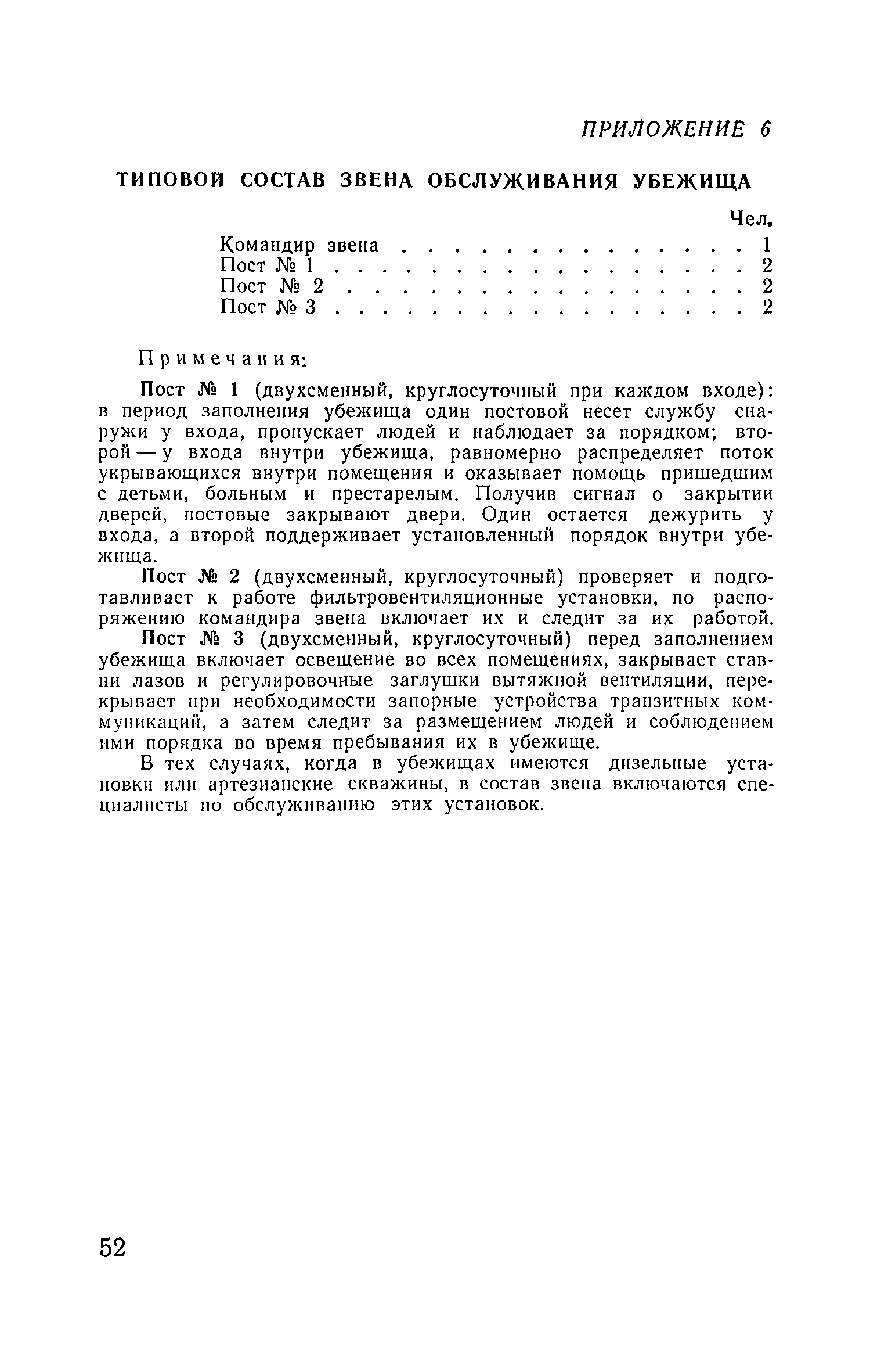 | Оглавление: | Введение Общие сведения об устройстве убежищ гражданской обороны Состав помещений и конструкций убежищ Внутреннее оборудование убежищ Приемка убежищ Общие положения Оценка качества строительных работ Приемка внутреннего оборудования Эксплуатация и обслуживание убежищ в мирное время Общие положения Содержание помещений убежищ Содержание и эксплуатация внутреннего оборудования убежищ Приведение убежищ в полную готовность Эксплуатация и обслуживание убежищ в военное время Организация обслуживания убежищ Эксплуатация внутреннего оборудования Заполнение убежища и пребывание в нем укрывающихся Порядок эвакуации укрывающихся из убежища Приложение 1. Паспорт убежища Приложение 2. Акт приемки в эксплуатацию убежища Приложение 3. Журнал осмотра и проверки состояния убежища Приложение 4. Рекомендуемый порядок проветривания убежища Приложение 5. Рекомендации по замене уплотняющей резины защитно-герметических и герметических дверей и ставен Приложение 6. Типовой состав звена обслуживания убежища Приложение 7. Табель оснащения звена обслуживания убежища Приложение 8. Примерное оснащение убежища |