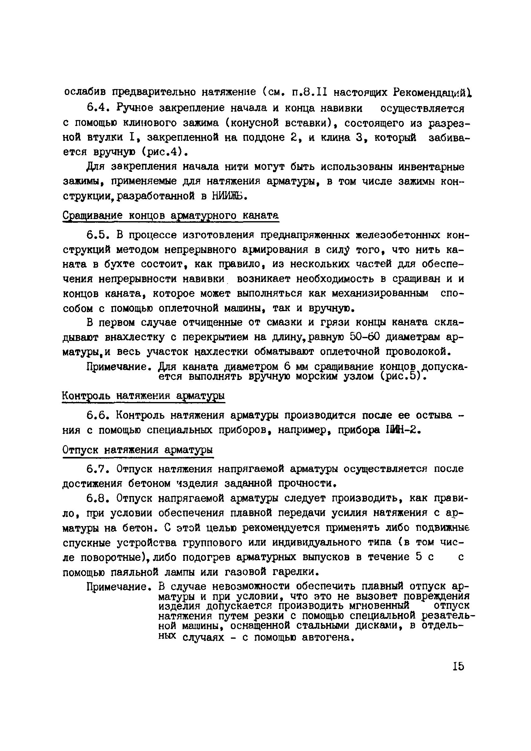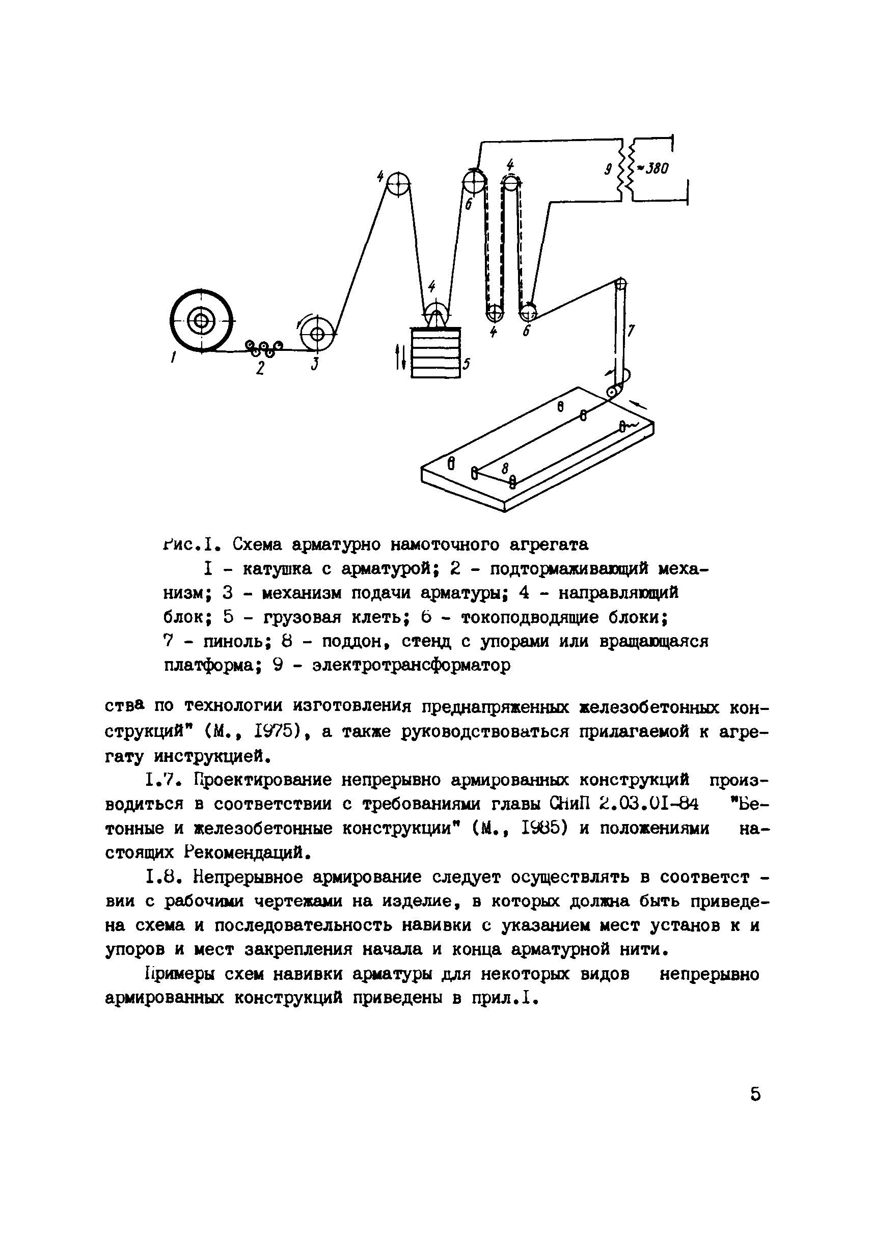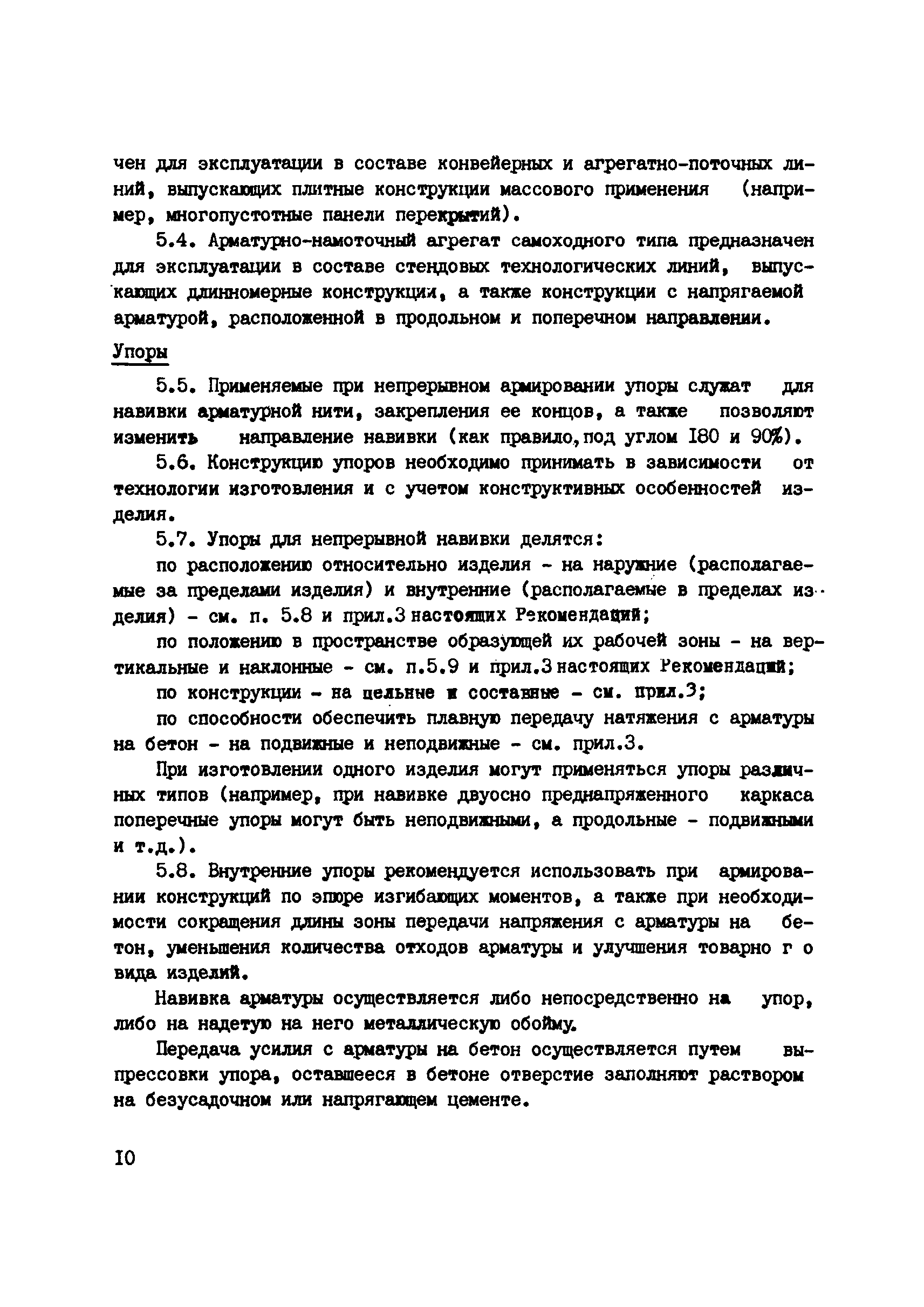 | Оглавление: | Предисловие 1. Основные положения 2. Номенклатура конструкций, изготовляемых методом непрерывного армирования 3. Материалы Арматура Бетон 4. Основные технологические схемы производства непрерывно армированных железобетонных конструкций Конвейерное производство Агрегатно-поточное производство Стендовое производство 5. Основное оборудование технологической линии Упоры Формы 6. Основные технологические переделы Закрепление начала и конца навивки Сращивание концов арматурного каната Контроль натяжения арматура Отпуск натяжения арматуры 7. Расчет параметров механического и электротермического натяжения арматуры 8. Техника безопасности Приложение 1. Схемы навивки арматурного каркаса с помощью арматурно-намоточных агрегатов Приложение 2. Арматурно-намоточные агрегаты Приложение 3. Конструкции упоров |