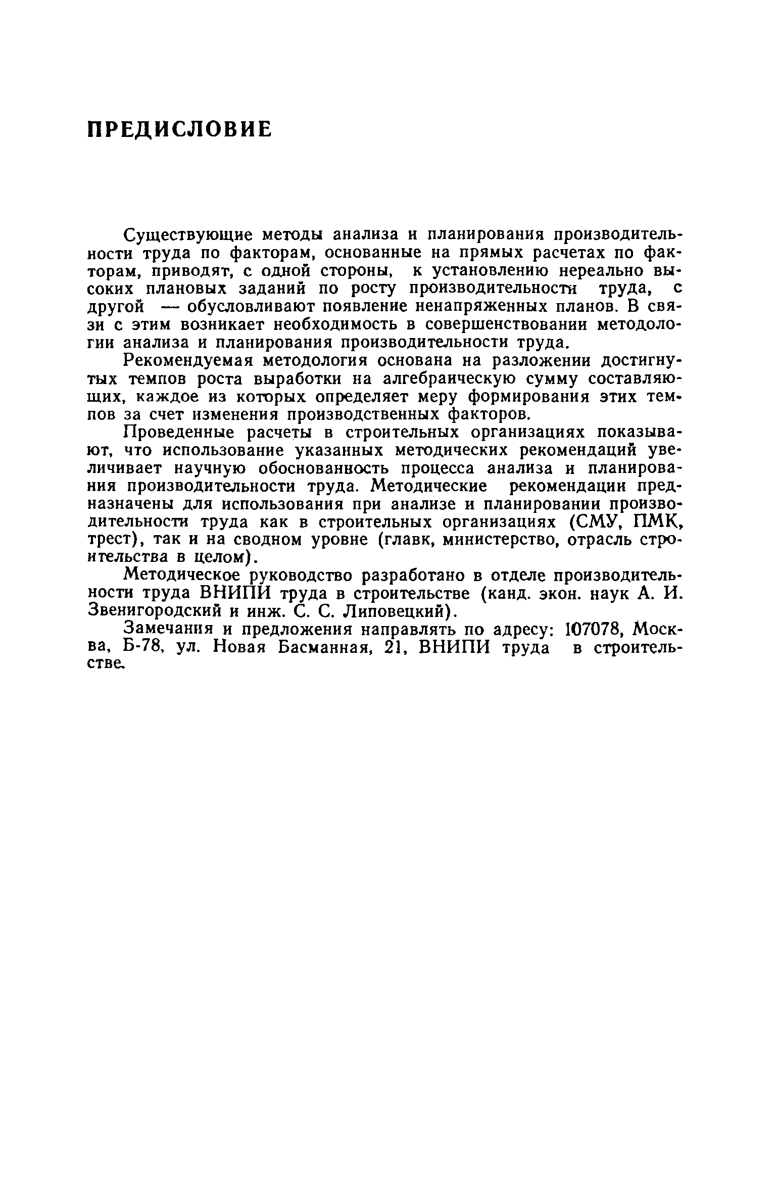 | Оглавление: | Предисловие 1. Общие положения 2. Исходные данные 3. Основные методические принципы системы анализа и планирования производительности труда 4. Алгоритм выполнения расчетов 5. Учет отраслевых и регионально-климатических особенностей в расчетах на сводном уровне 6. Примеры расчетов Приложение 1. Предложения по учету показателей, характеризующих численность рабочих, занятых на строительно-монтажных работах и в подсобном производстве Приложение 2. Оценка сменной производительности труда в натуральных показателях Приложение 3. Алгоритм расчетов |