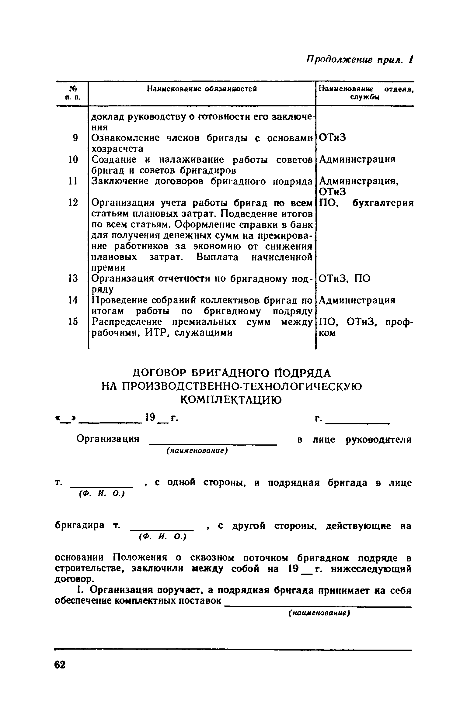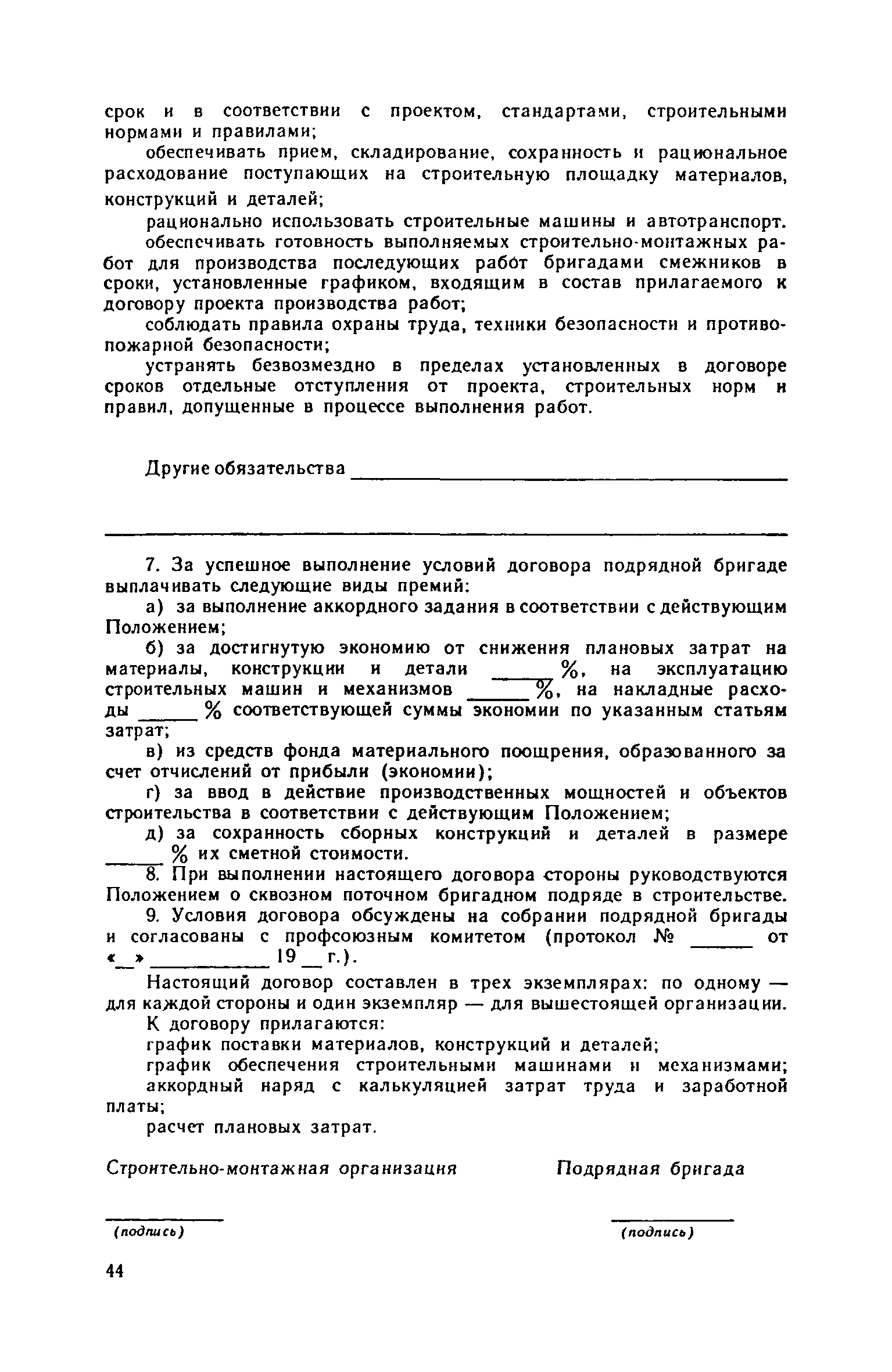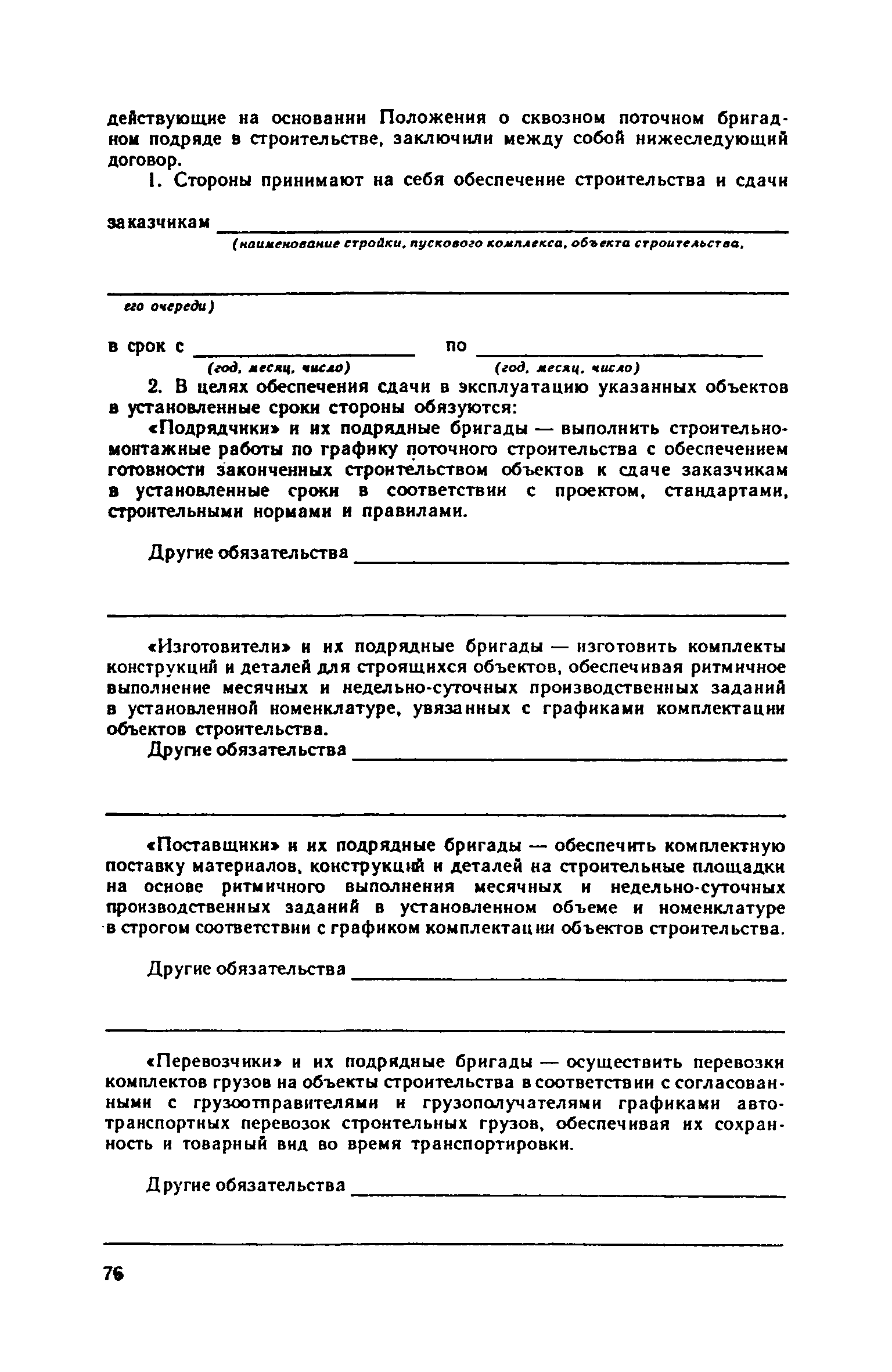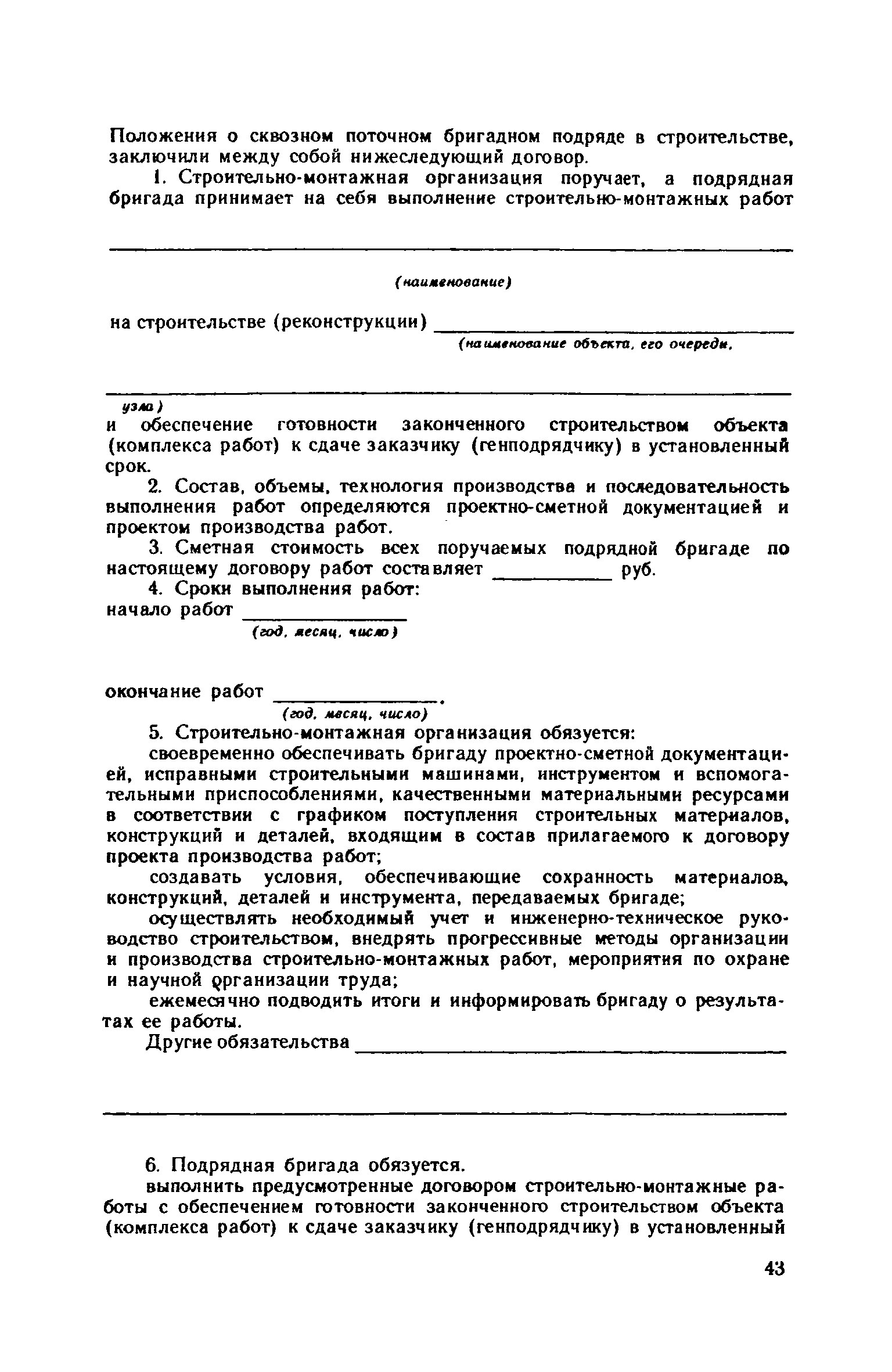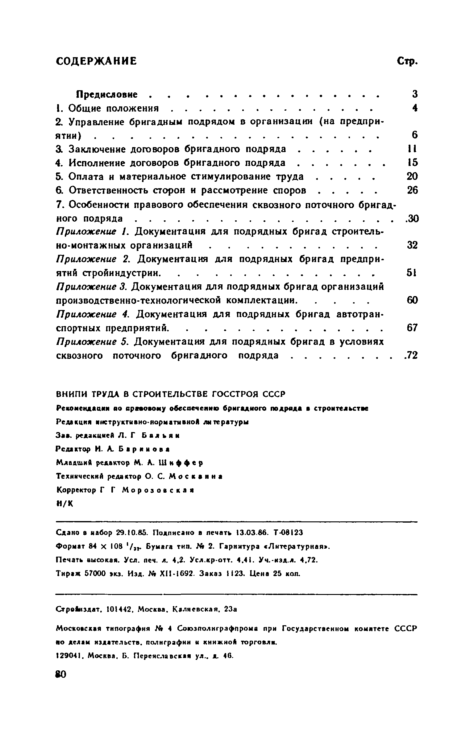 | Оглавление: | Предисловие 1. Общие положения 2. Управление бригадным подрядом в организация (на предприятии) 3. Заключение договоров бригадного подряда 4. Исполнение договоров бригадного подряда 5. Оплата и материальное стимулирование труда 6. Ответственность сторон и рассмотрение споров 7. Особенности правового обеспечения сквозного поточного бригадного подряда Приложение 1. Документация для подрядных бригад строительно-монтажных организаций Приложение 2. Документация для подрядных бригад предприятий стройиндустрии Приложение 3. Документация для подрядных бригад организаций производственно-технологической комплектации Приложение 4. Документация для подрядных бригад автотранспортных предприятий Приложение 5. Документация для подрядных бригад в условиях сквозного поточного бригадного подряда |