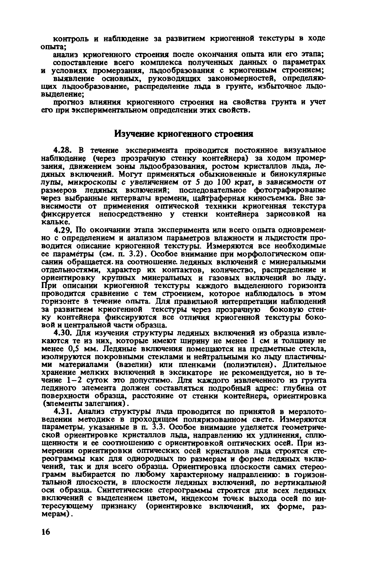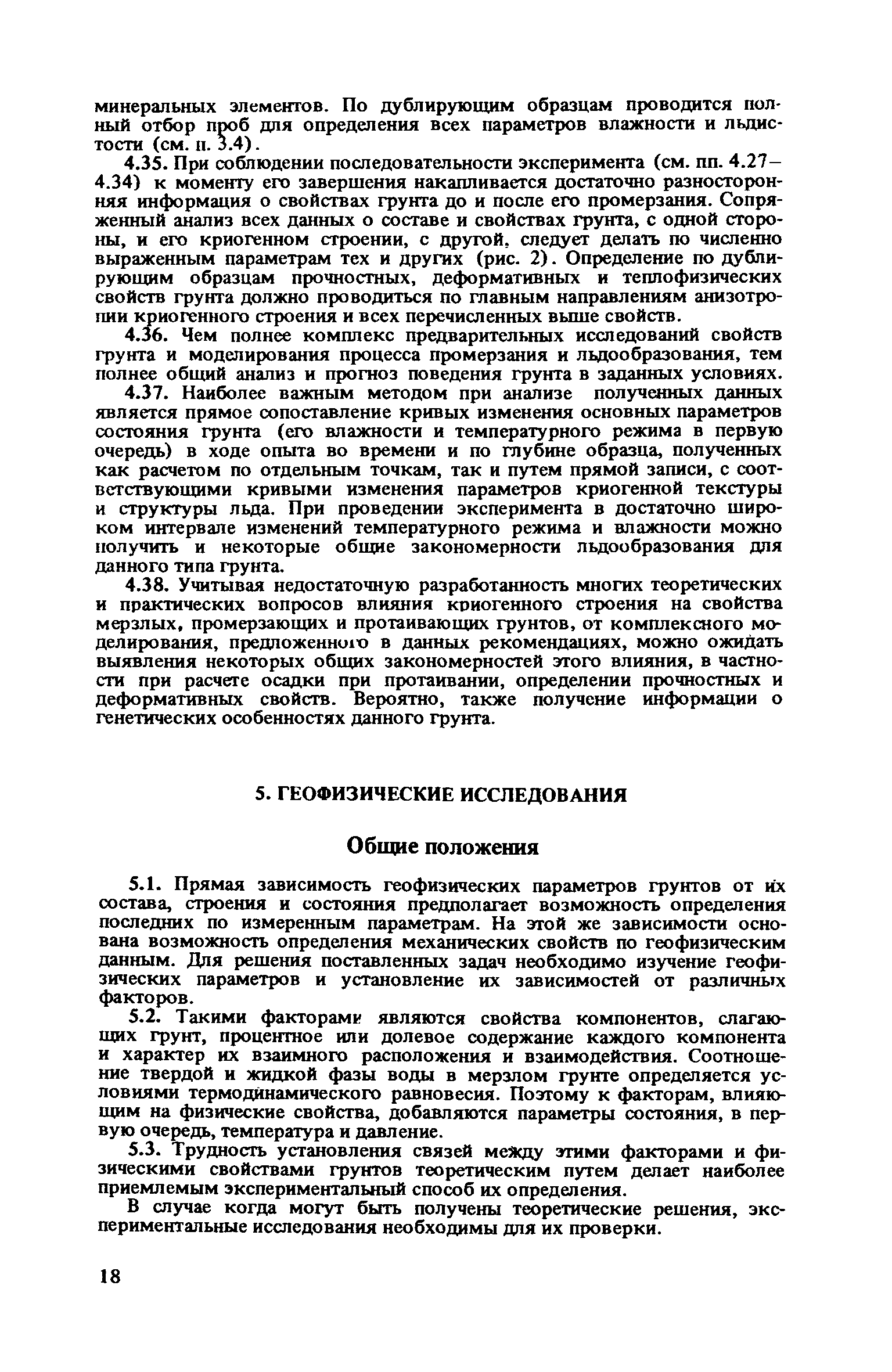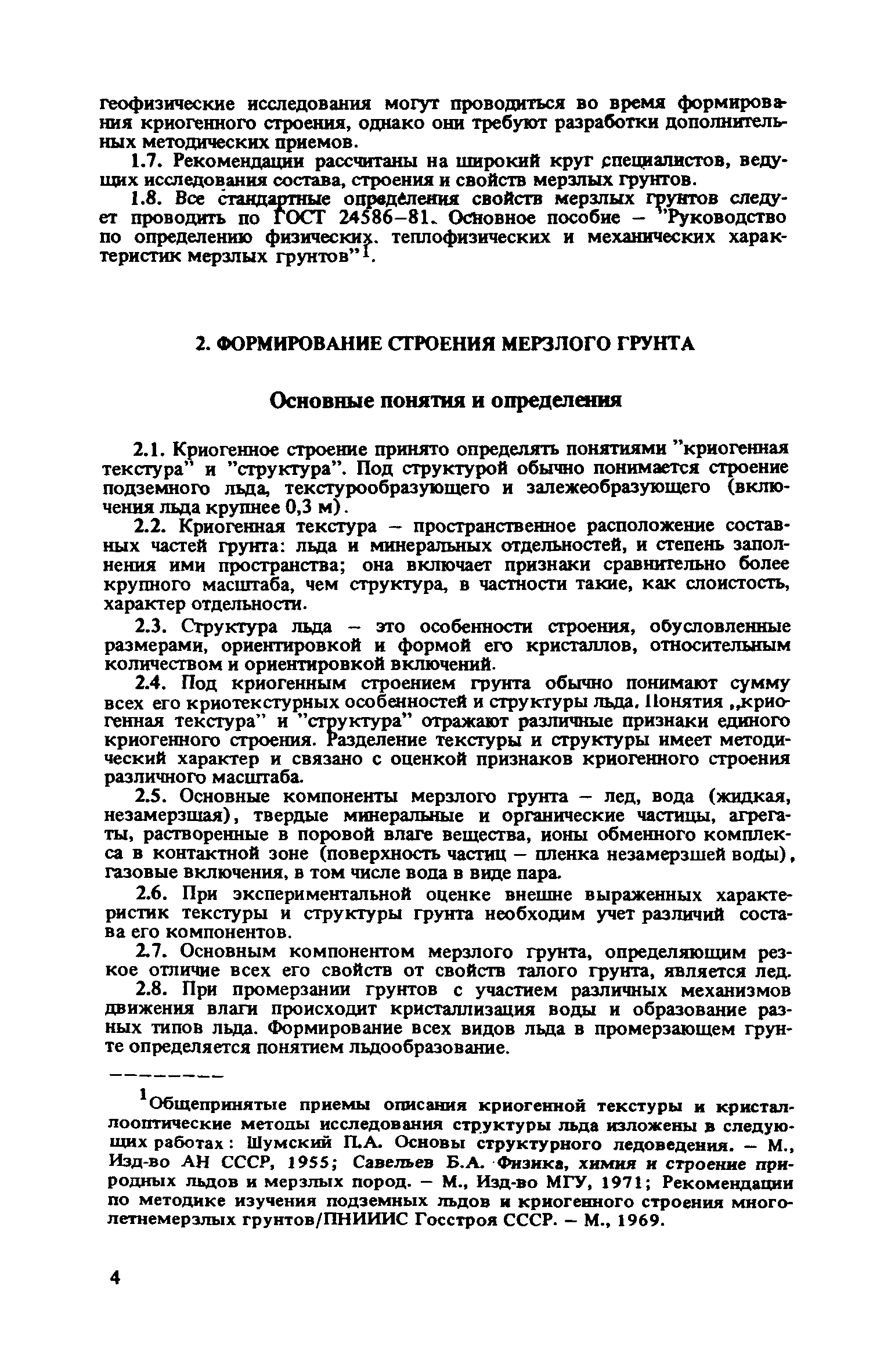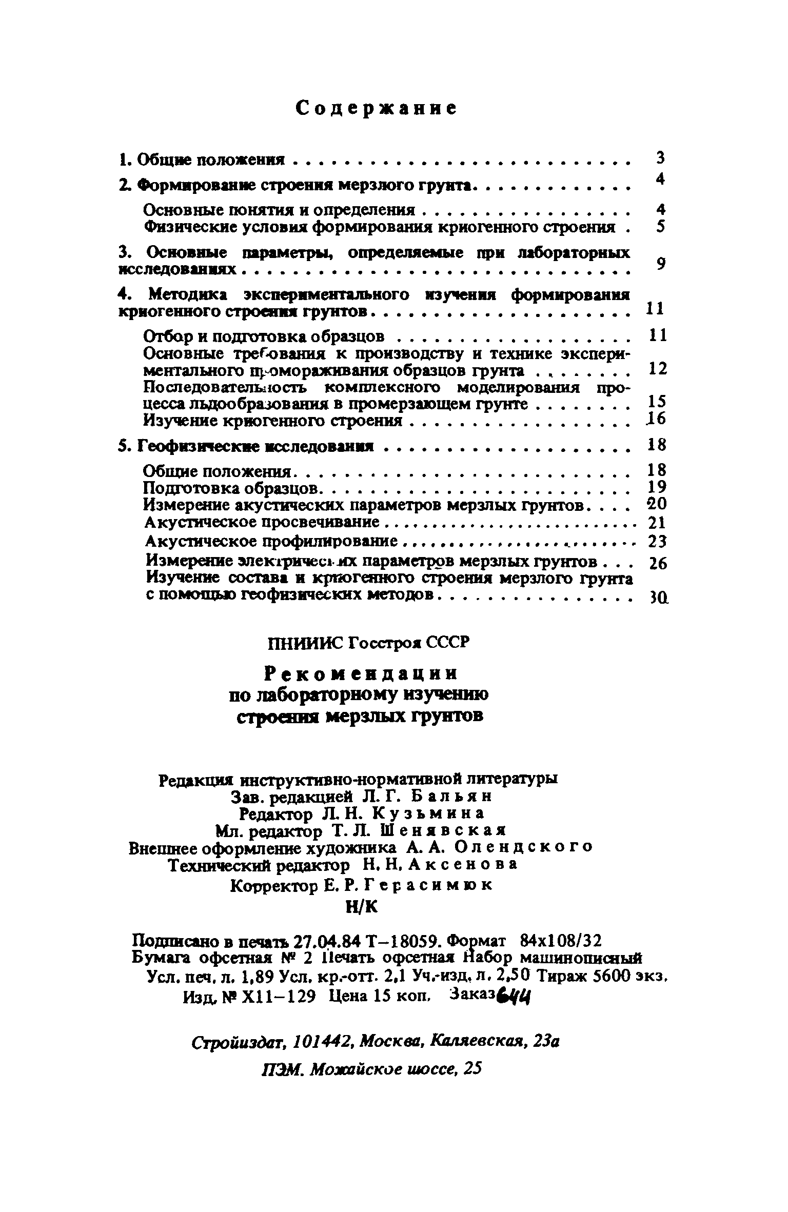 | Оглавление: | 1. Общие положения 2. Формирование строения мерзлого грунта Основные понятия и определения Физические условия формирования криогенного строения 3. Основные параметры, определяемые при лабораторных исследованиях 4. Методика экспериментального изучения формирования криогенного строения грунтов Отбор и подготовка образцов Основные требования к производству и технике экспериментального промораживания образцов грунта Последовательность комплексного моделирования процесса льдообразования в промерзающем грунте Изучение криогенного строения 5. Геофизические исследования Общие положения Подготовка образцов Измерение акустических параметров мерзлых грунтов Акустическое просвечивание Акустическое профилирование Измерение электрических параметров мерзлых грунтов Изучение состава и криогенного строения мерзлого грунта с помощью геофизических методов |