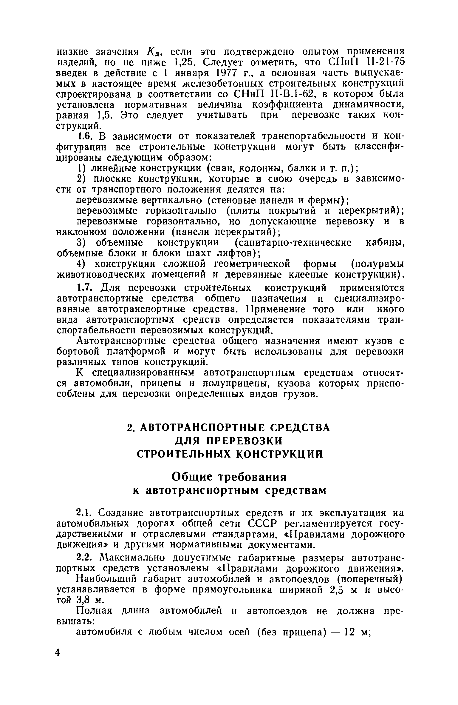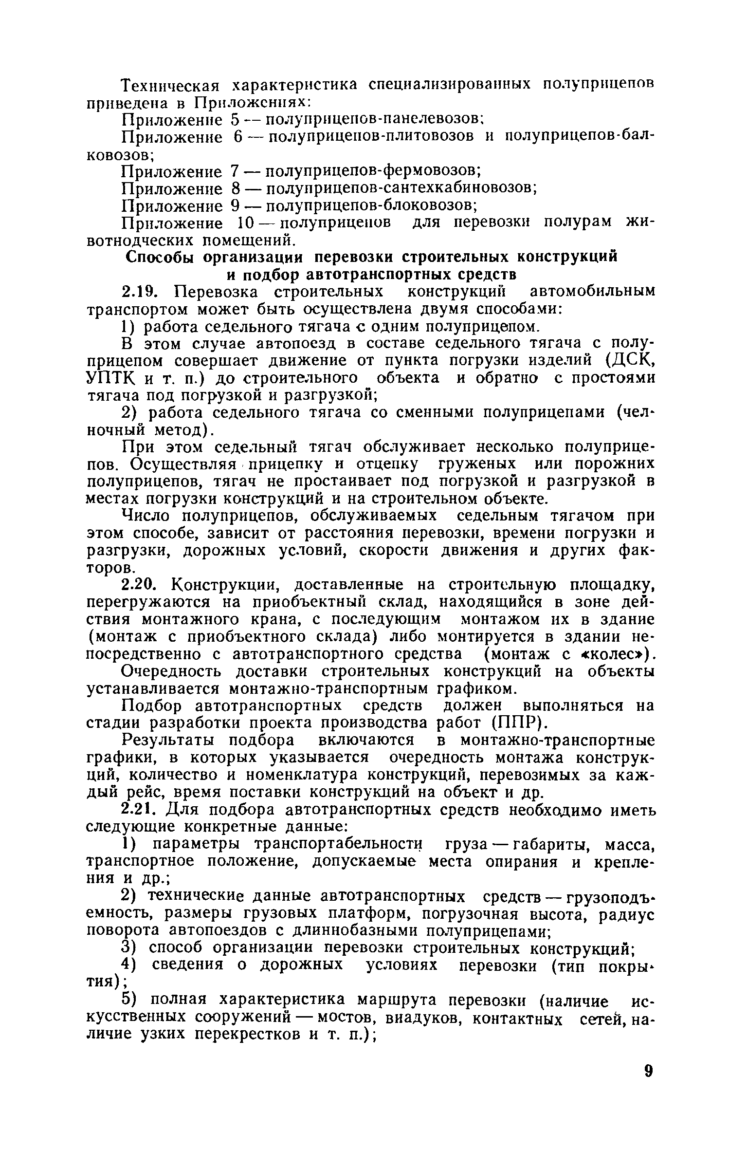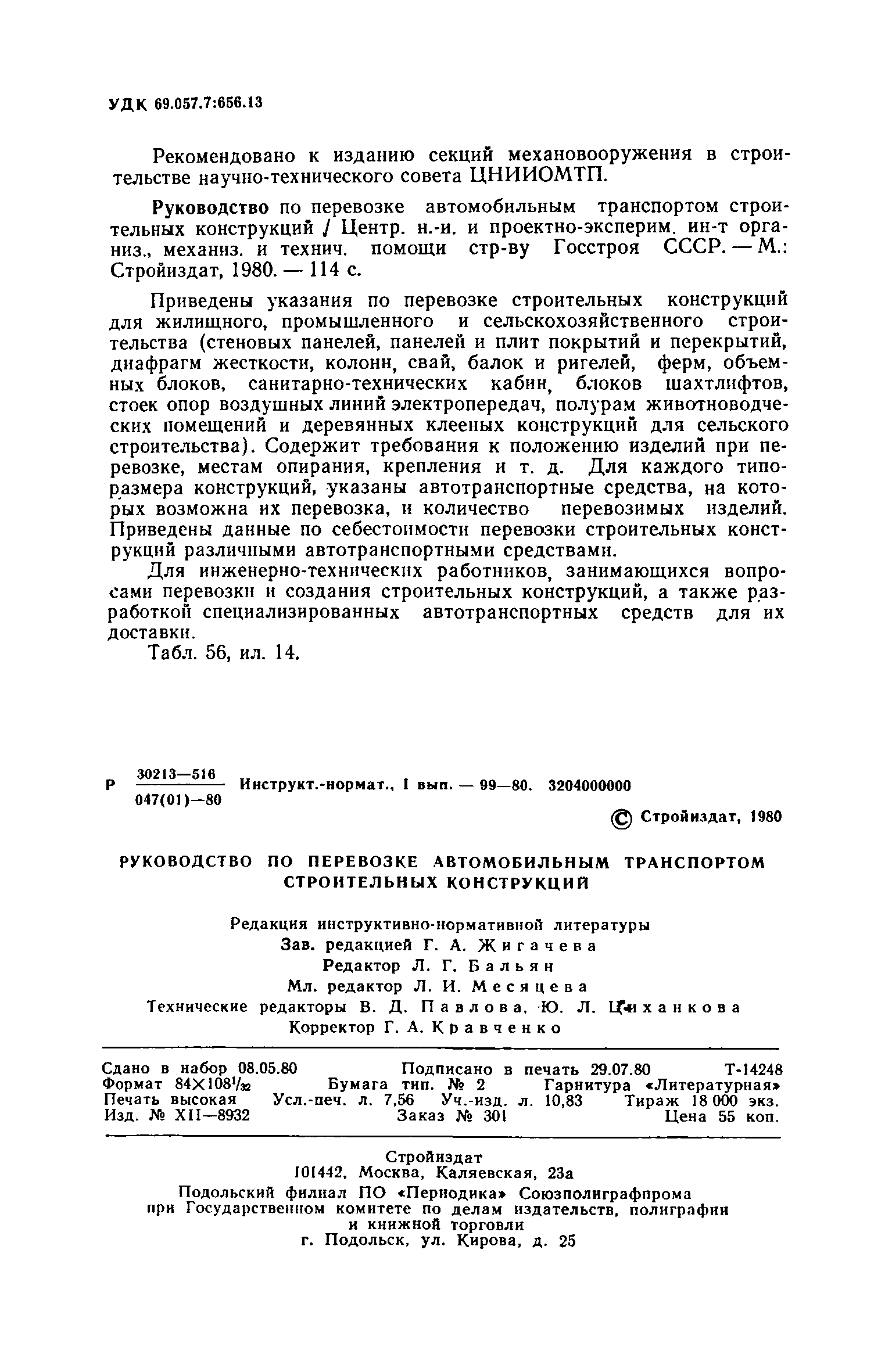 Для инженерно-технических работников, занимающихся вопросами перевозки и создания строительных конструкций, а также разработкой специализированных автотранспортных средств для их доставки. | | Оглавление: | 1. Общие положения 2. Автотранспортные средства для перевозки строительных конструкций Общие требования к автотранспортным средствам Автотранспортные средства общего назначения Специализированные автотранспортные средства Способы организации перевозки строительных конструкций и подбор автотранспортных средств Определение производительности автотранспортных средств и себестоимости перевозки строительных конструкций 3. Перевозка строительных конструкций Общие положения Стеновые панели Стеновые и перегородочные панели для цилиндрических и прямоугольных сооружений Диафрагмы жесткости Панели и плиты перекрытий и покрытий Колонны Сваи Балки и ригели Стойки опор воздушных линий электропередач ВЛ 35 кВ Фермы Объемные блоки Санитарно-технические кабины. Блоки шахт лифтов Железобетонные полурамы животноводческих помещений Клееные деревянные несущие конструкции для сельского строительства Приложение 1. Техническая характеристика грузовых автомобилей с бортовой платформой Приложение 2. Техническая характеристика прицепов общего назначения Приложение 3. Техническая характеристика седельных тягачей Приложение 4. Техническая характеристика полуприцепов общего назначения Приложение 5. Техническая характеристика полуприцепов панелевозов Приложение 6. Техническая характеристика полуприцепов плитовозов и полуприцепов-балковозов Приложение 7. Техническая характеристика полуприцепов фермовозов Приложение 8. Техническая характеристика полуприцепов сантехкабиновозов Приложение 9. Техническая характеристика полуприцепов блоковозов Приложение 10. Техническая характеристика полуприцепов для перевозки железобетонных полурам животноводческих помещений Приложение 11. Организации-разработчики технической документации на типовые специализированные полуприцепы Приложение 12. Себестоимость перевозки 1 т строительных конструкций автотранспортными средствами | | Разработан: | ЦНИИОМТП Госстроя СССР