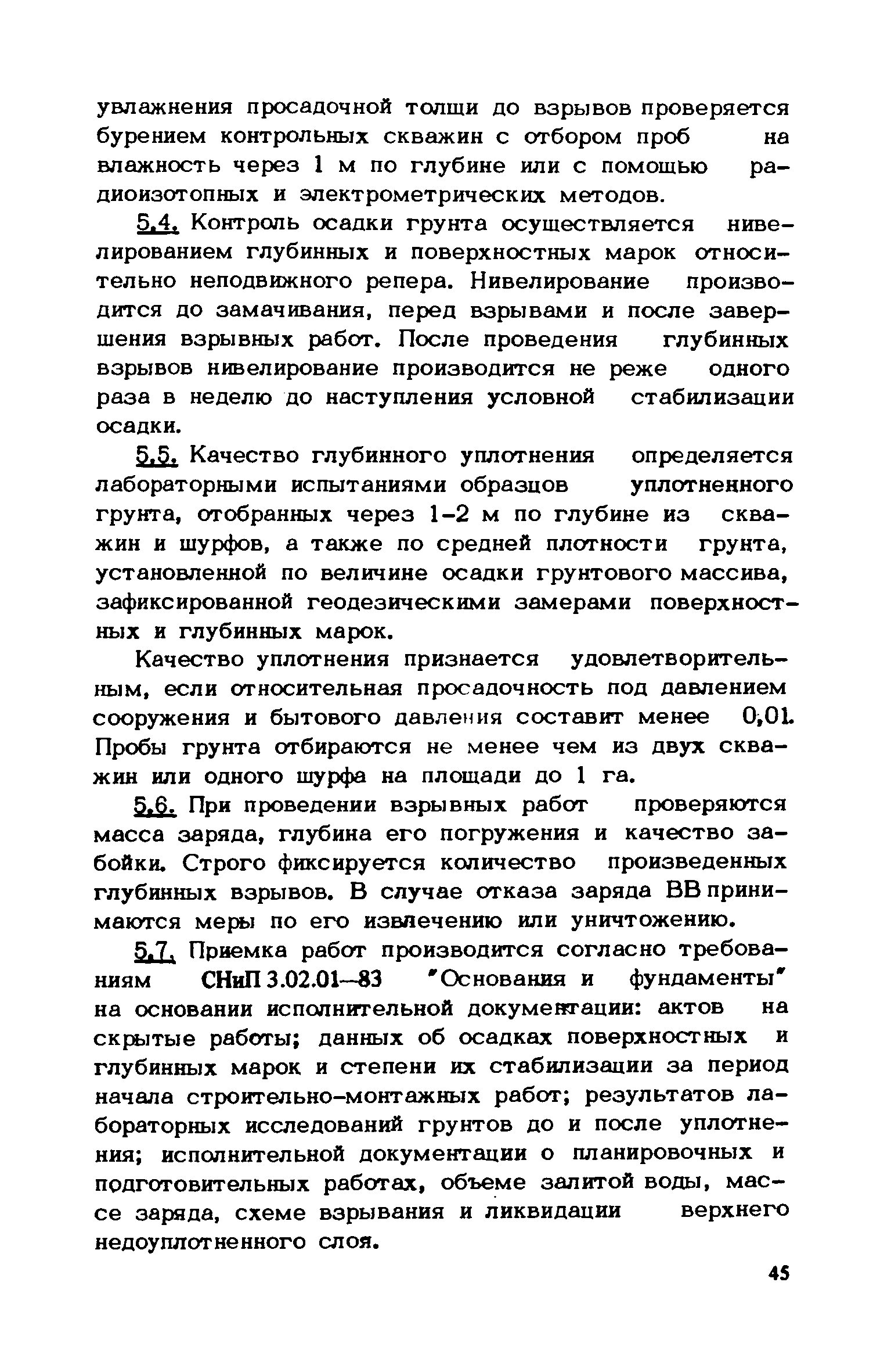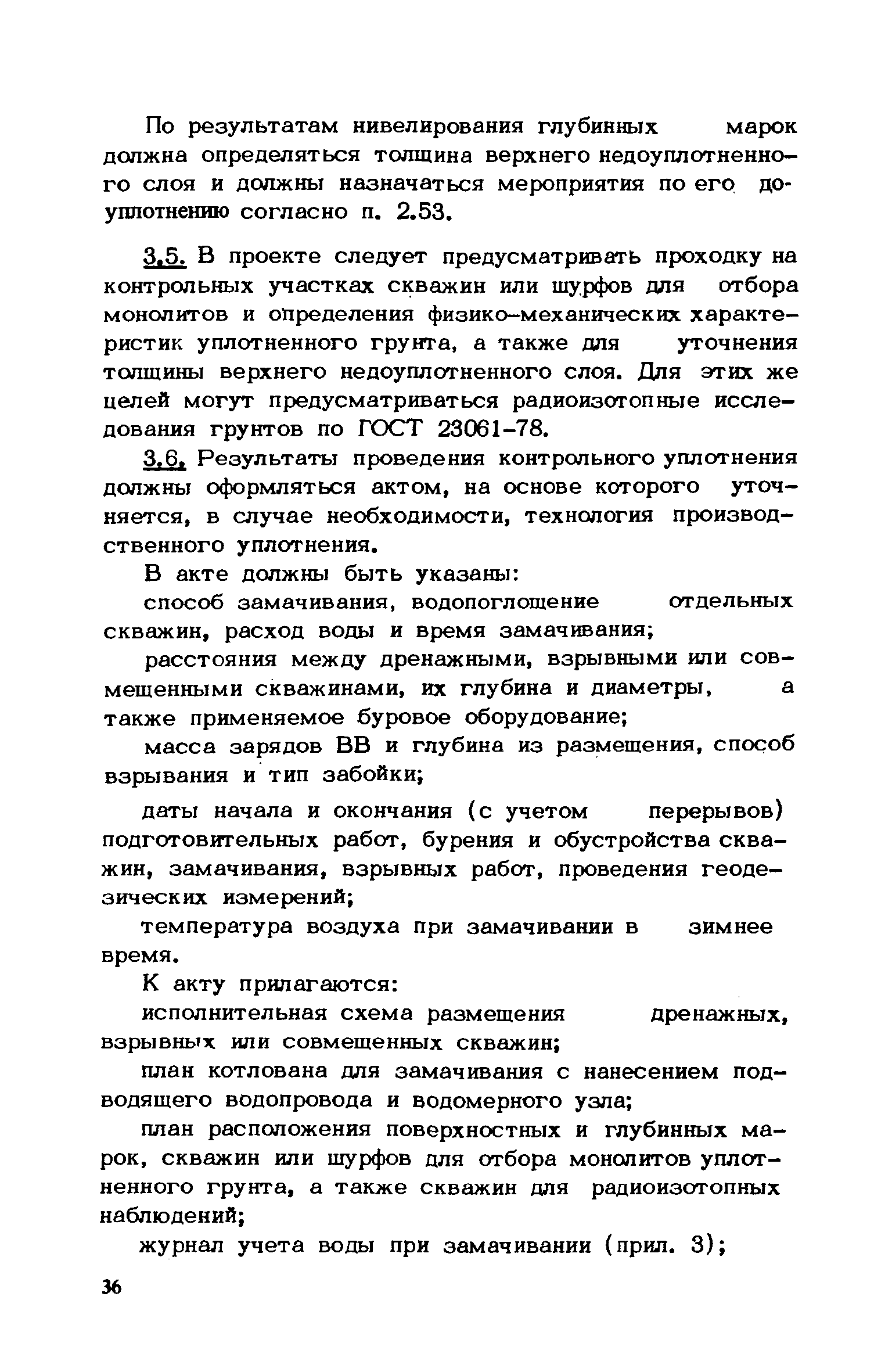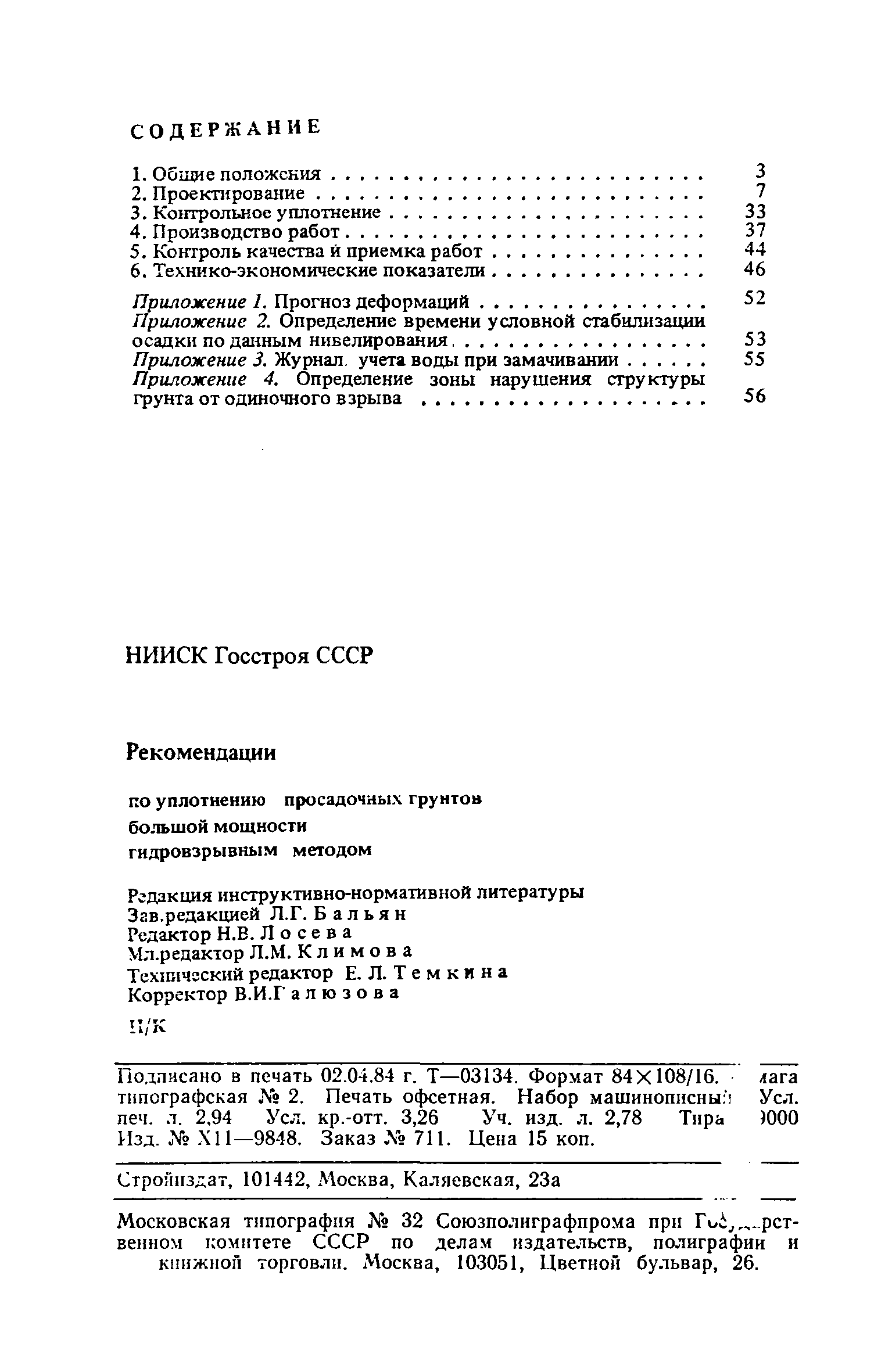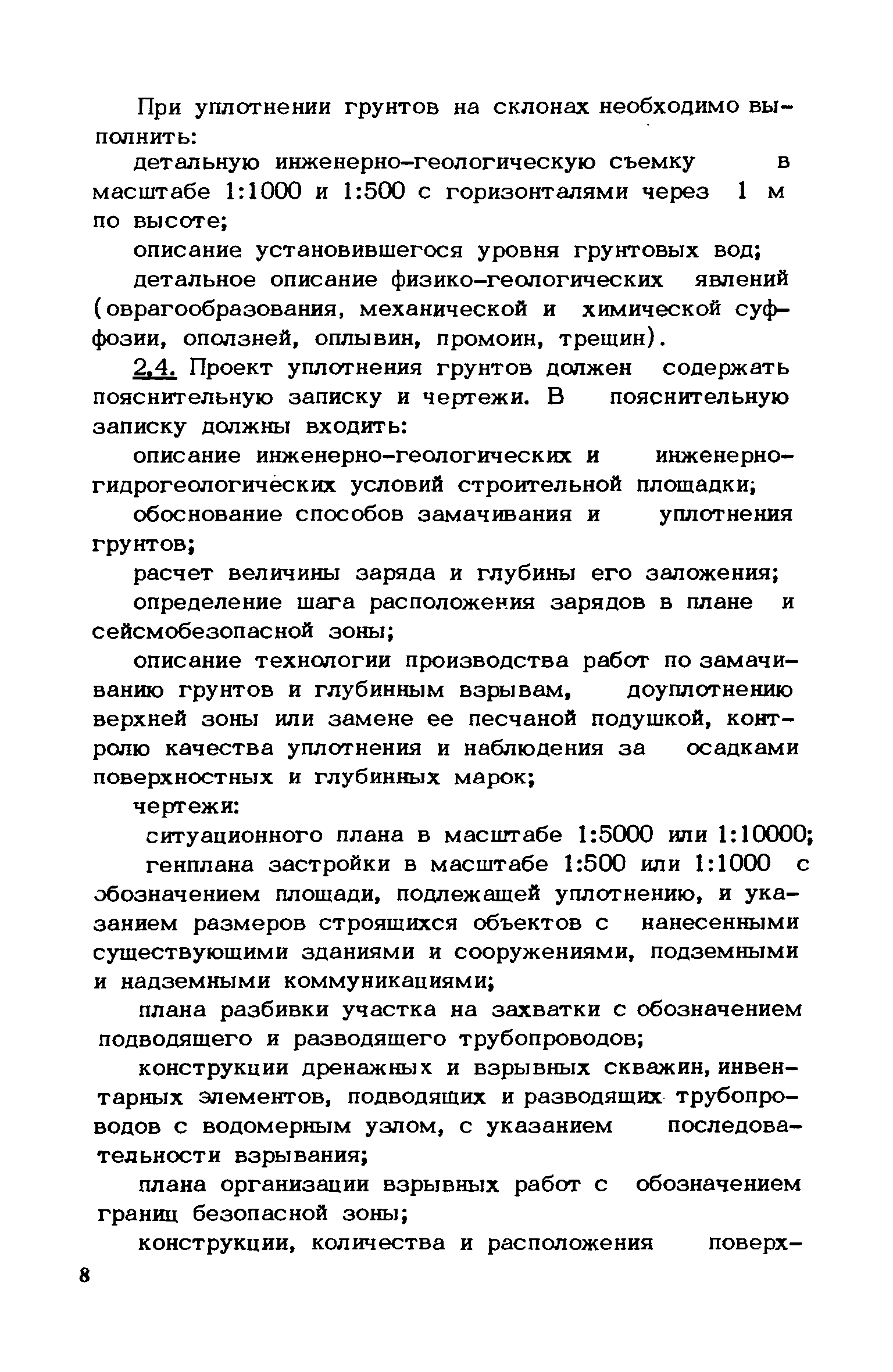 | Оглавление: | 1. Общие положения 2. Проектирование 3. Контрольное уплотнение 4. Производство работ 5. Контроль качества и приемка работ 6. Технико-экономические показатели Приложение 1. Прогноз деформаций Приложение 2. Определение времени условной стабилизации осадки по данным нивелирования Приложение 3. Журнал учета воды при замачивании Приложение 4. Определение зоны нарушения структуры грунта от одиночного взрыва |