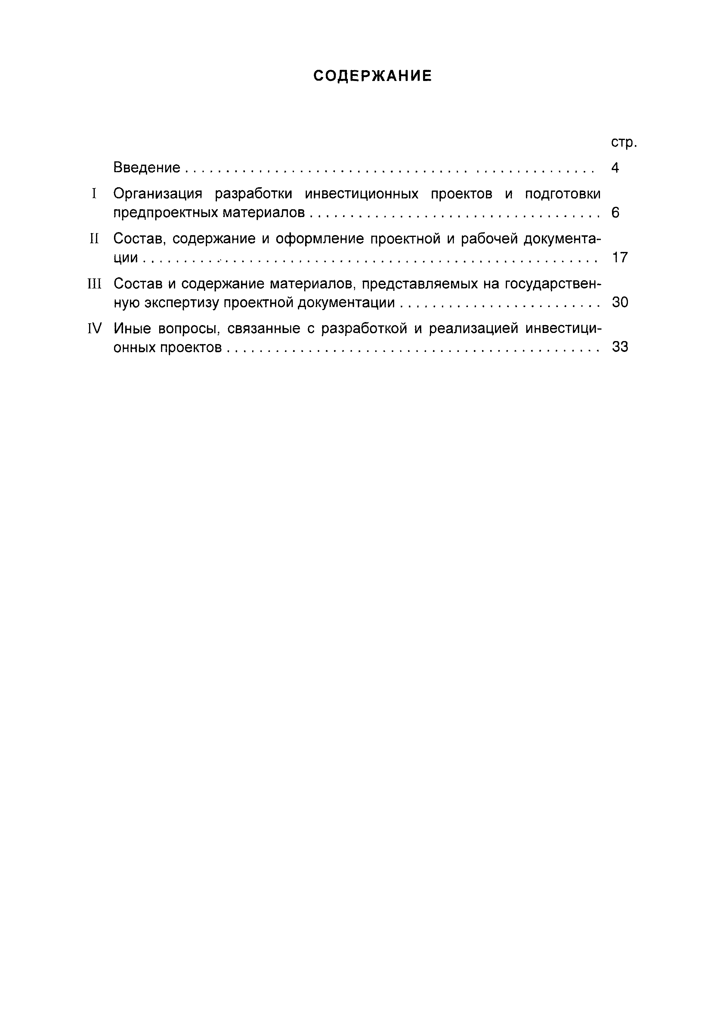 Введение I Организация разработки инвестиционных проектов и подготовки предпроектных материалов II Состав, содержание и оформление проектной и рабочей документации III Состав и содержание материалов, представляемых на государственную экспертизу проектной документации IV Иные вопросы, связанные с разработкой и реализацией инвестиционных проектов