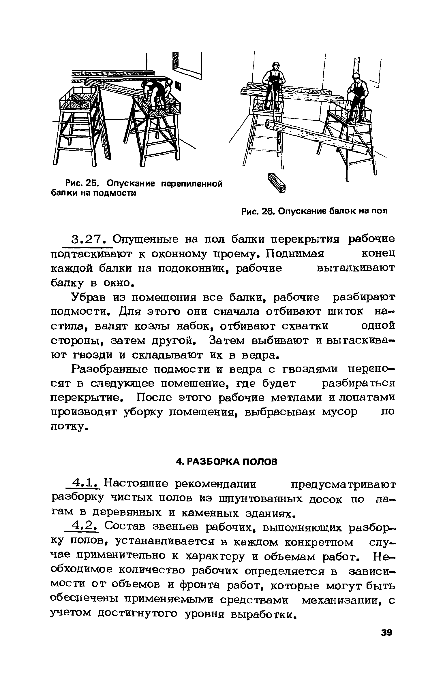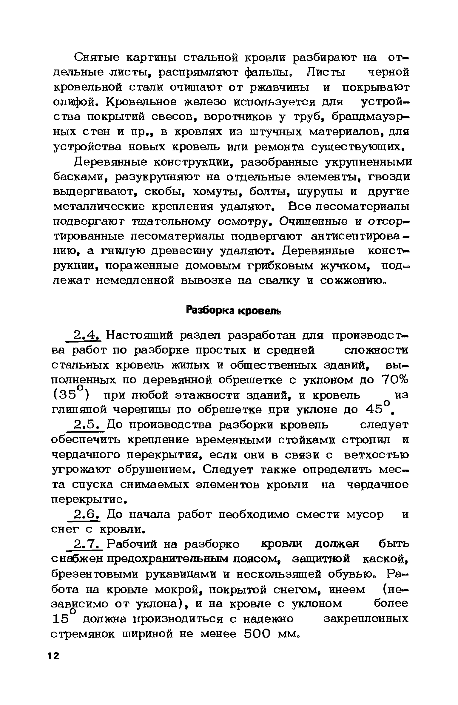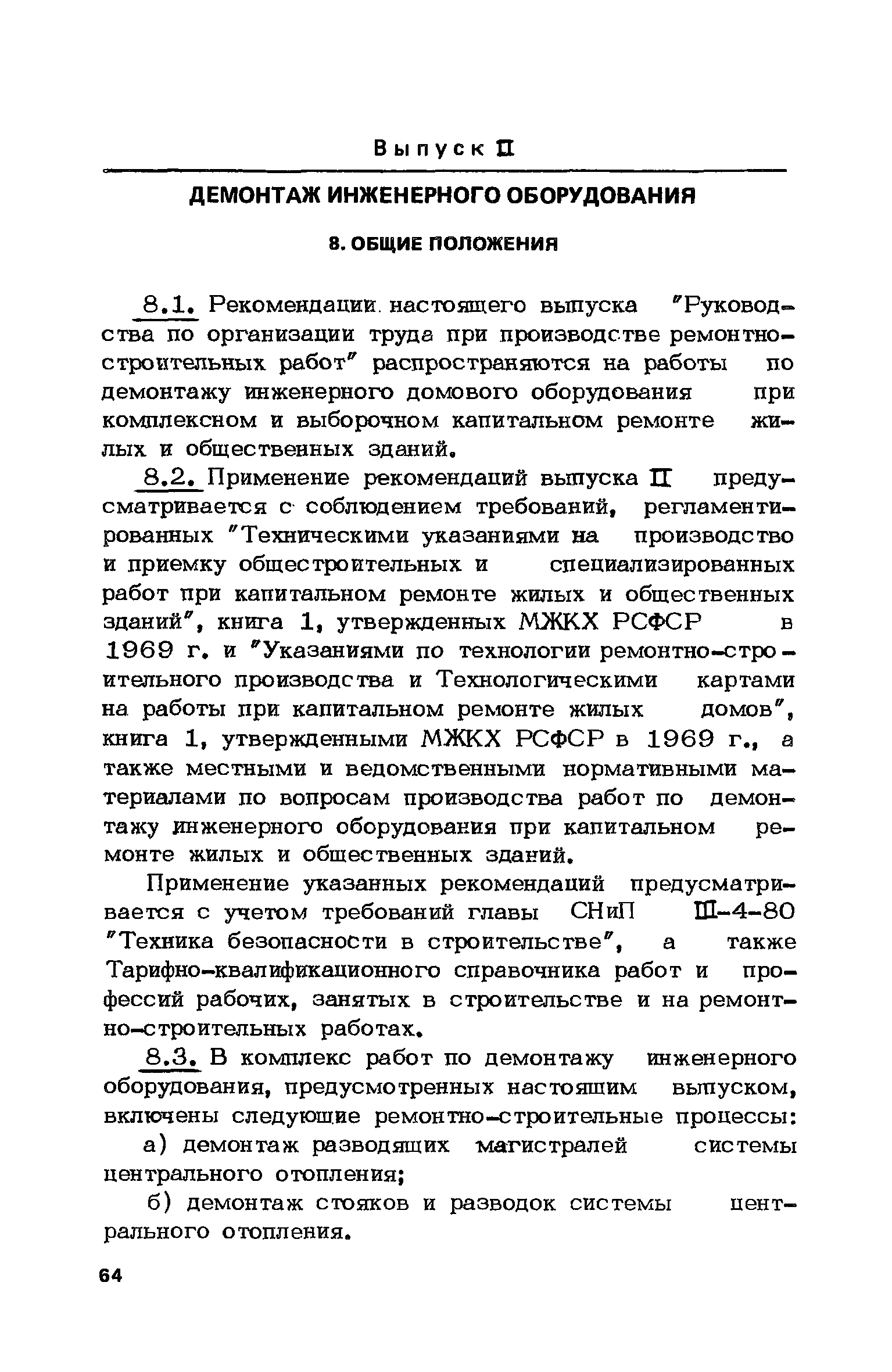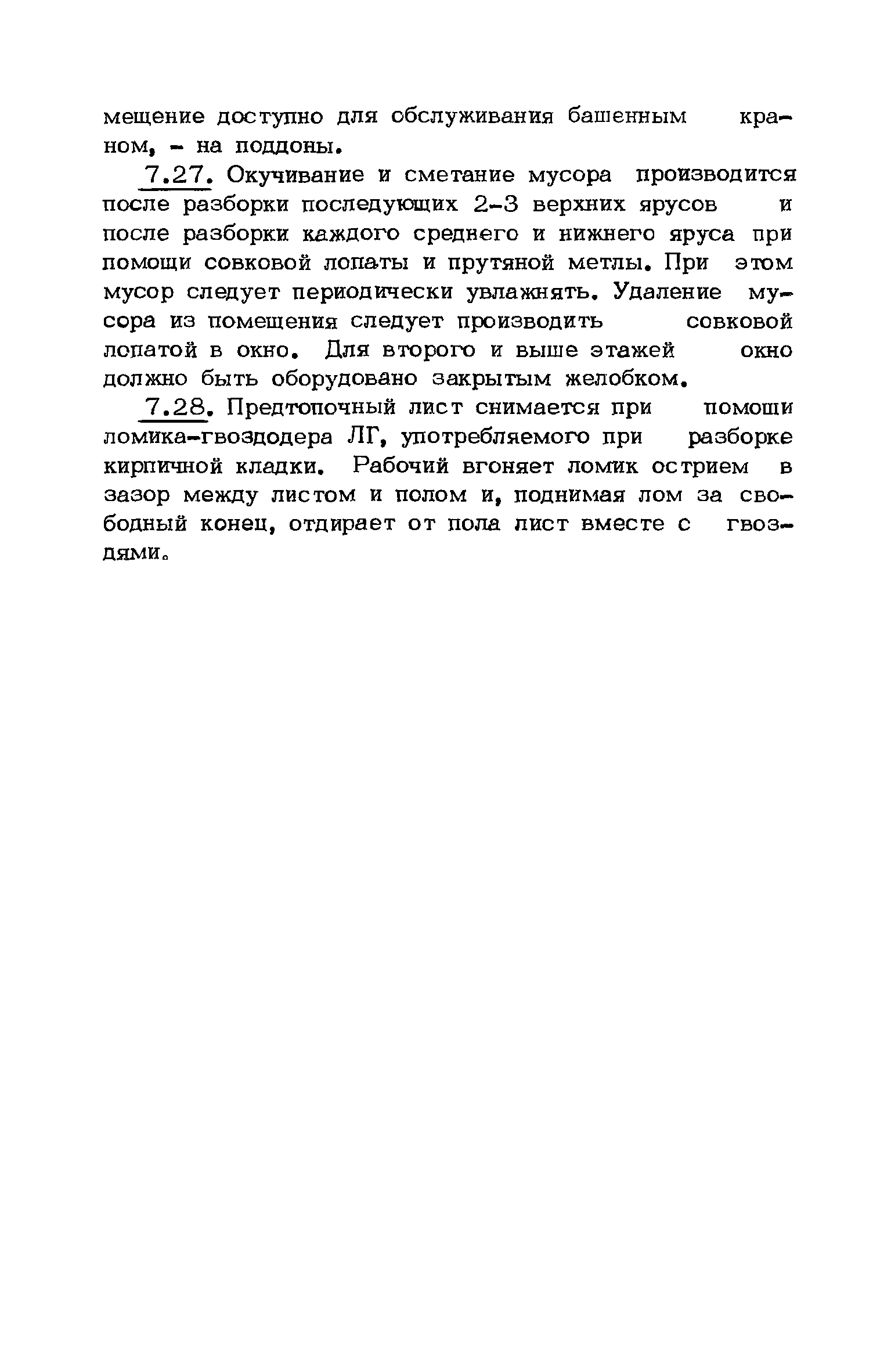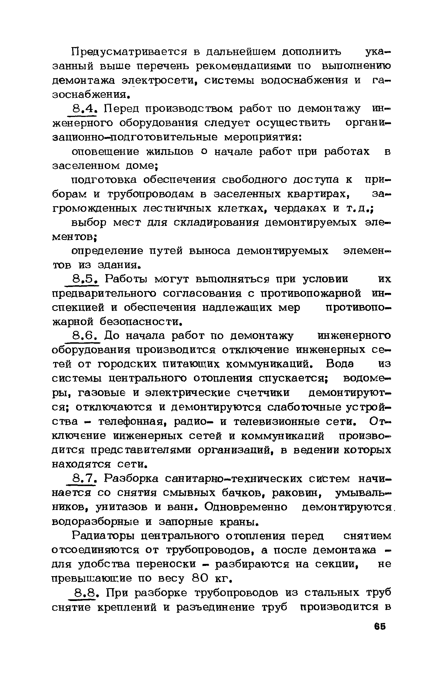 | Оглавление: | Введение Выпуск 1. Разборка строительных конструкций 1. Общие положения 2. Разборка крыш 3. Разборка перекрытий 4. Разборка полов 5. Разборка деревянных перекрытий 6. Разборка оконных заполнений 7. Разборка печей Выпуск II. Демонтаж инженерного оборудования 8. Общие положения 9. Демонтаж разводящих магистралей системы центрального отопления 10. Демонтаж стояков и разводок системы центрального отопления |