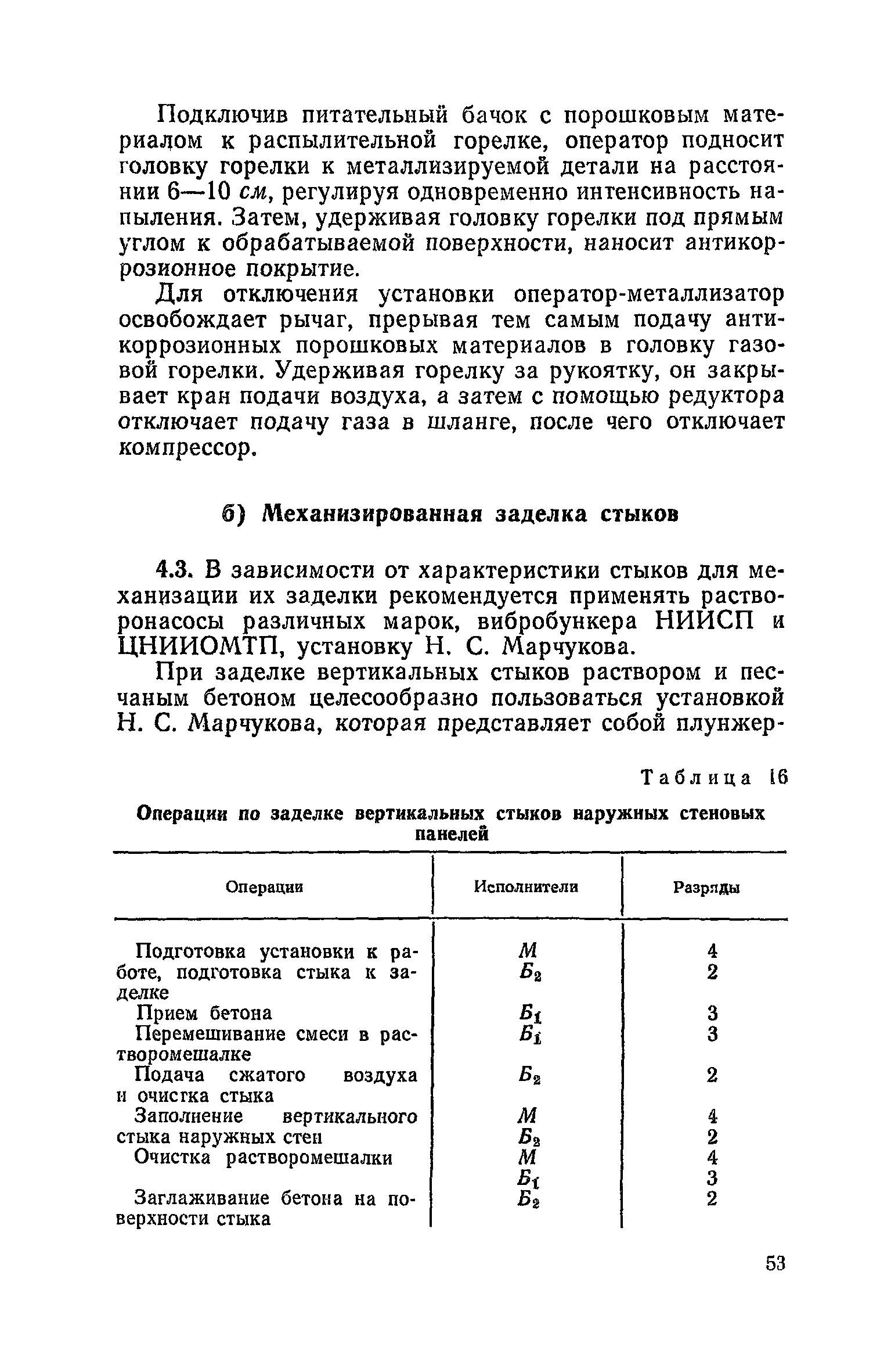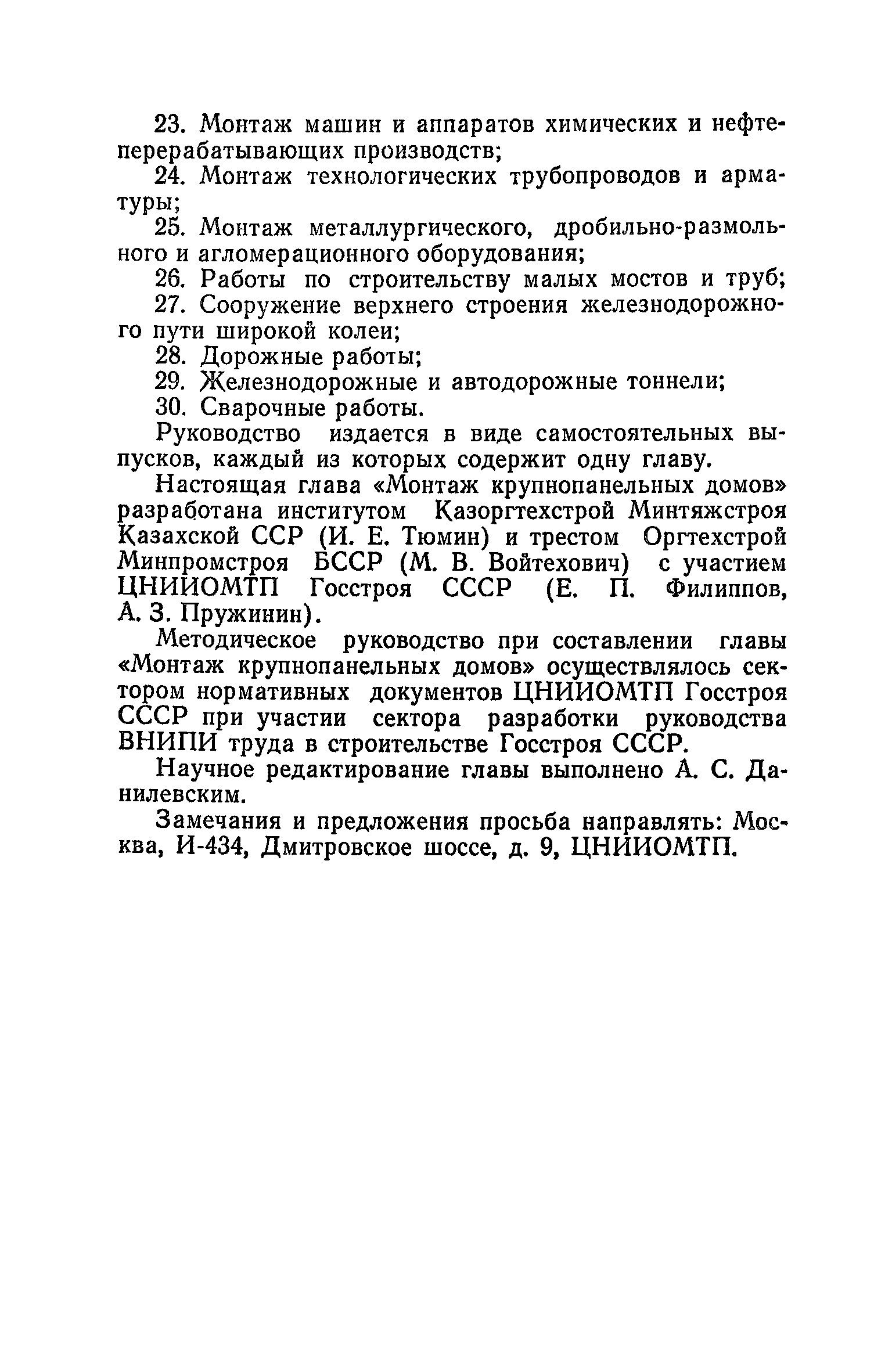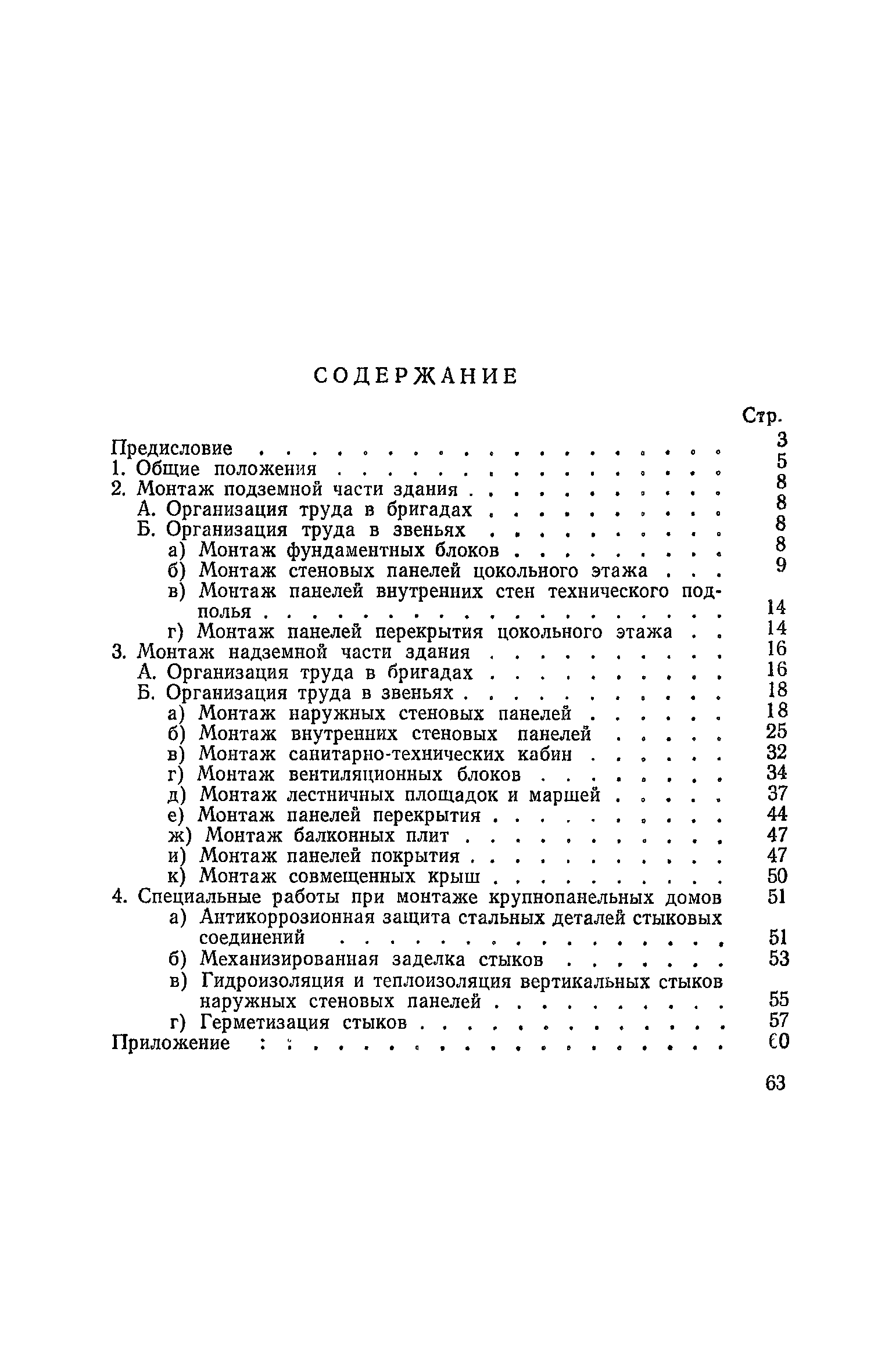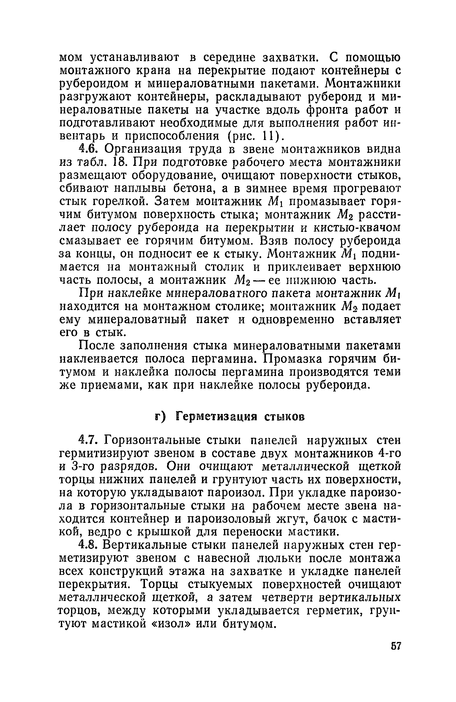 | Оглавление: | Предисловие 1. Общие положения 2. Монтаж подземной части здания А. Организация труда в бригадах Б. Организация труда в звеньях а) Монтаж фундаментных блоков б) Монтаж стеновых панелей цокольного этажа в) Монтаж панелей внутренних стен технического подполья г) Монтаж панелей перекрытия цокольного этажа 3. Монтаж надземной части здания А. Организация труда в бригадах Б. Организация труда в звеньях а) Монтаж наружных стеновых панелей б) Монтаж внутренних стеновых панелей в) Монтаж санитарно-технических кабин г) Монтаж вентиляционных блоков д) Монтаж лестничных площадок и маршей е) Монтаж панелей перекрытия ж) Монтаж балконных плит и) Монтаж панелей покрытия к) Монтаж совмещенных крыш 4. Специальные работы при монтаже крупнопанельных домов а) Антикоррозионная защита стальных деталей стыковых соединений б) Механизированная заделка стыков в) Гидроизоляция и теплоизоляция вертикальных стыков наружных стеновых панелей г) Герметизация стыков Приложение. Рекомендуемое оборудование, инструменты, приспособления и инвентарь для комплексной бригады монтажников |