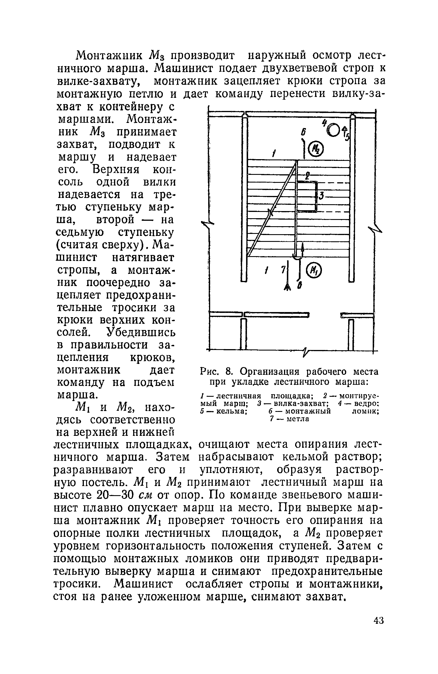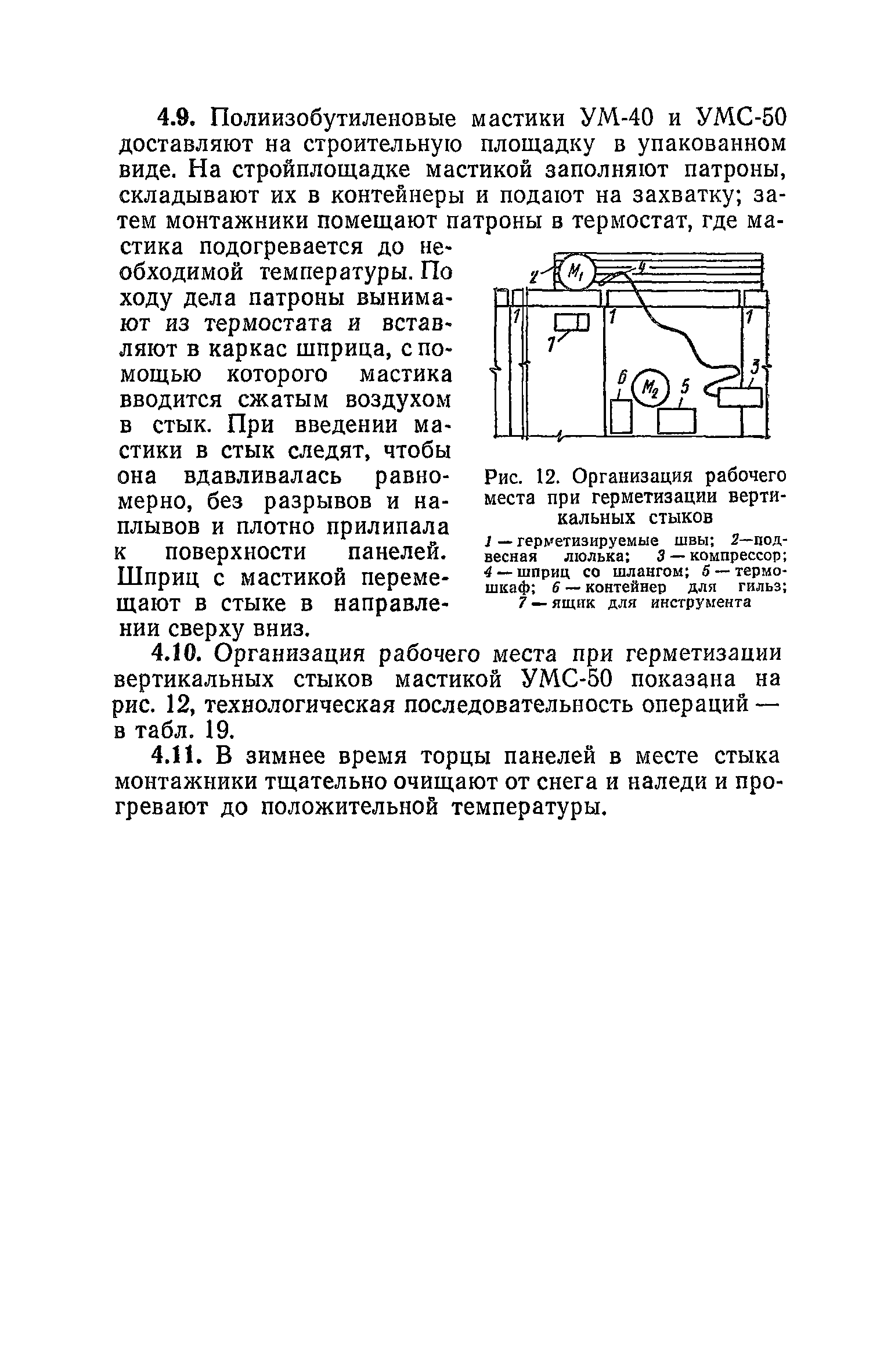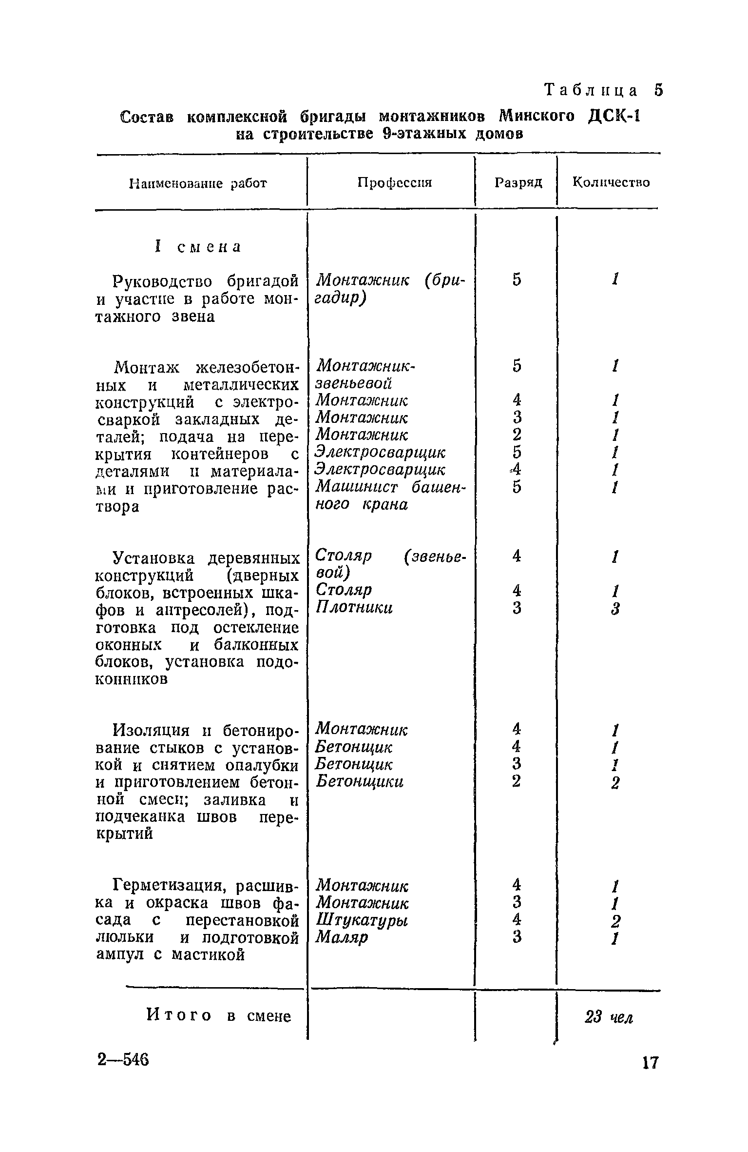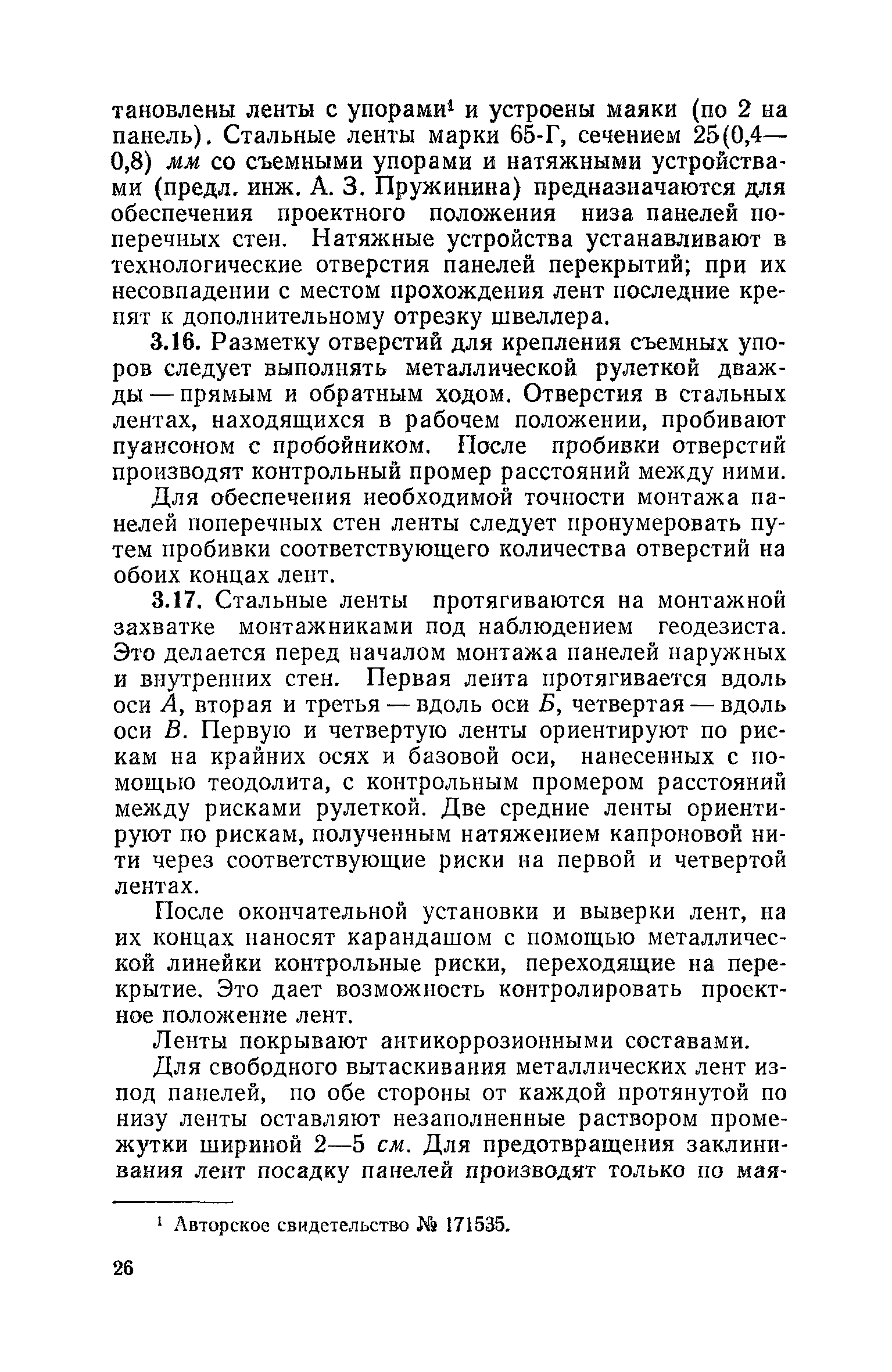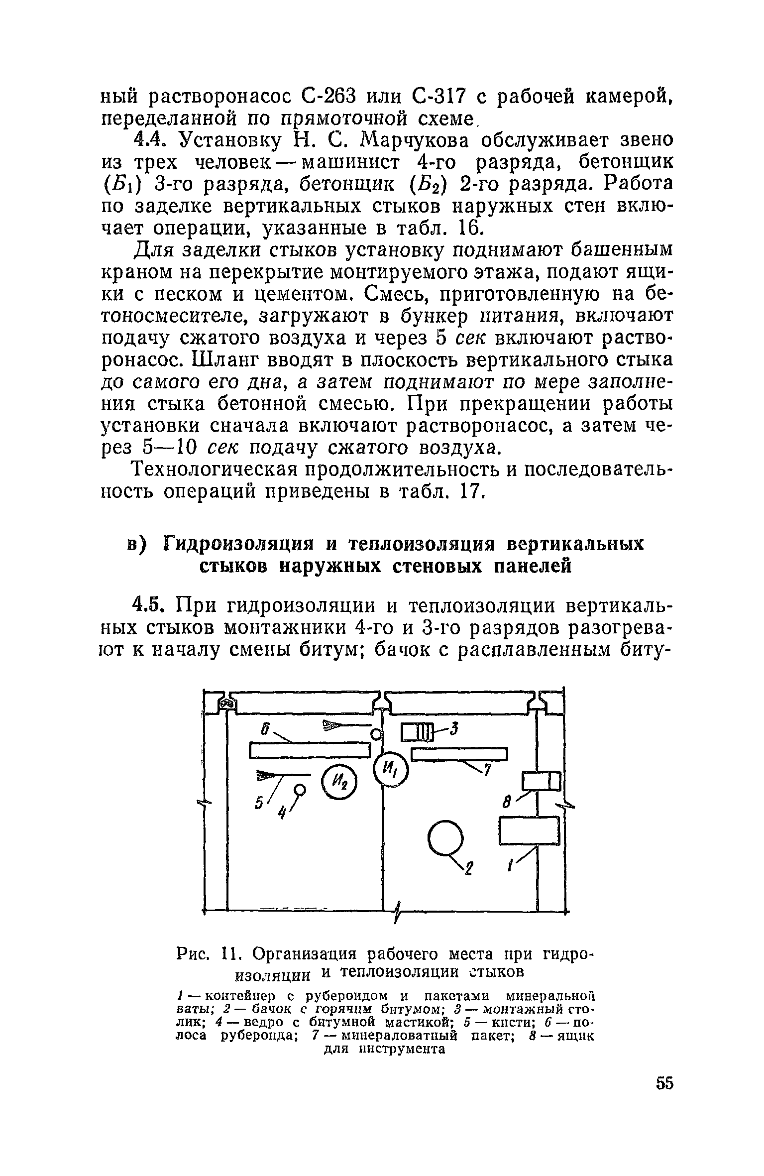 | Оглавление: | Предисловие 1. Общие положения 2. Монтаж подземной части здания А. Организация труда в бригадах Б. Организация труда в звеньях а) Монтаж фундаментных блоков б) Монтаж стеновых панелей цокольного этажа в) Монтаж панелей внутренних стен технического подполья г) Монтаж панелей перекрытия цокольного этажа 3. Монтаж надземной части здания А. Организация труда в бригадах Б. Организация труда в звеньях а) Монтаж наружных стеновых панелей б) Монтаж внутренних стеновых панелей в) Монтаж санитарно-технических кабин г) Монтаж вентиляционных блоков д) Монтаж лестничных площадок и маршей е) Монтаж панелей перекрытия ж) Монтаж балконных плит и) Монтаж панелей покрытия к) Монтаж совмещенных крыш 4. Специальные работы при монтаже крупнопанельных домов а) Антикоррозионная защита стальных деталей стыковых соединений б) Механизированная заделка стыков в) Гидроизоляция и теплоизоляция вертикальных стыков наружных стеновых панелей г) Герметизация стыков Приложение. Рекомендуемое оборудование, инструменты, приспособления и инвентарь для комплексной бригады монтажников |