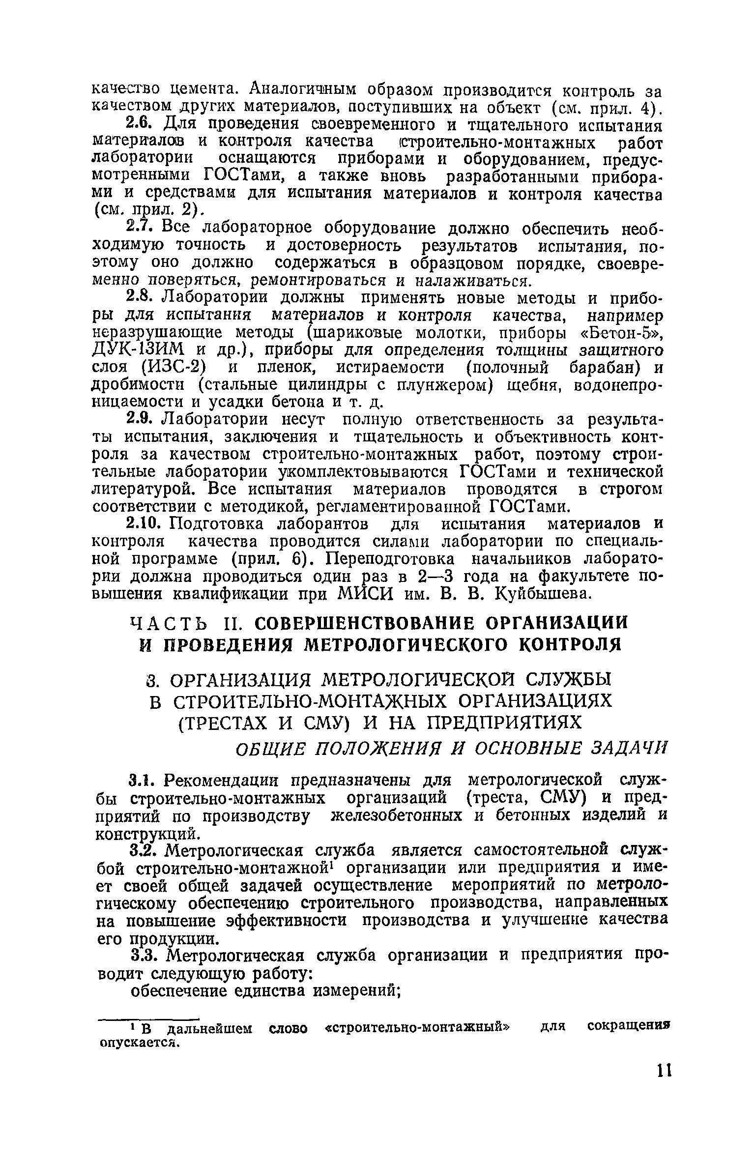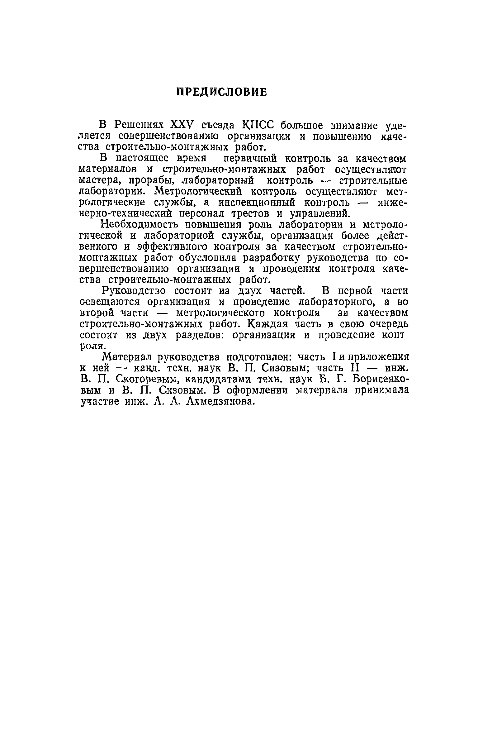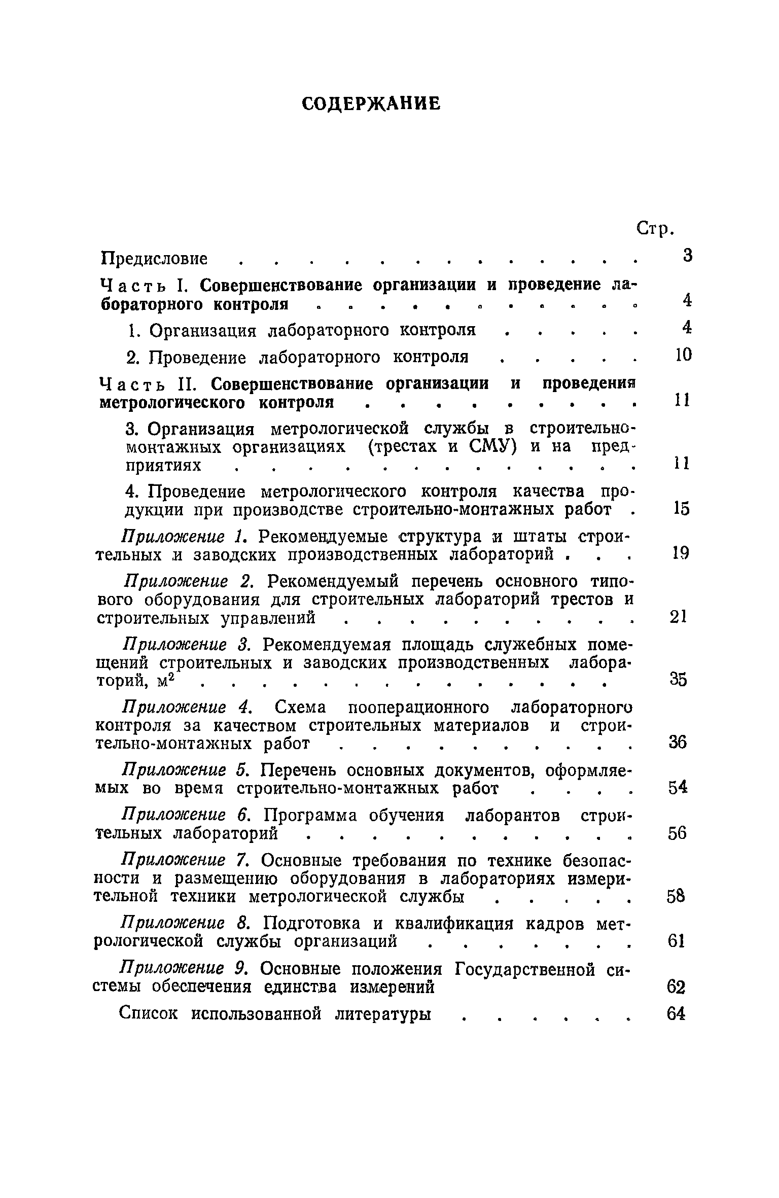 | Оглавление: | Предисловие Часть 1. Совершенствование организации и проведение лабораторного контроля 1. Организация лабораторного контроля 2. Проведение лабораторного контроля Часть II. Совершенствование организации и проведения метрологического контроля 3. Организация метрологической службы в строительно-монтажных организациях (трестах и СМУ) и на предприятиях 4. Проведение метрологического контроля качества продукции при производстве строительно-монтажных работ Приложение 1. Рекомендуемые структура и штаты строительных и заводских производственных лабораторий Приложение 2. Рекомендуемый перечень основного типового оборудования для строительных лабораторий трестов и строительных управлений Приложение 3. Рекомендуемая площадь служебных помещений строительных и заводских производственных лабораторий, м2 Приложение 4. Схема пооперационного лабораторного контроля за качеством строительных материалов и строительно-монтажных работ Приложение 5. Перечень основных документов, оформляемых во время строительно-монтажных работ Приложение 6. Программа обучения лаборантов строительных лабораторий Приложение 7. Основные требования по технике безопасности и размещению оборудования в лабораториях измерительной техники метрологической службы Приложение 8. Подготовка и квалификация кадров метрологической службы организаций Приложение 9. Основные положения Государственной системы обеспечения единства измерений Список использованной литературы |