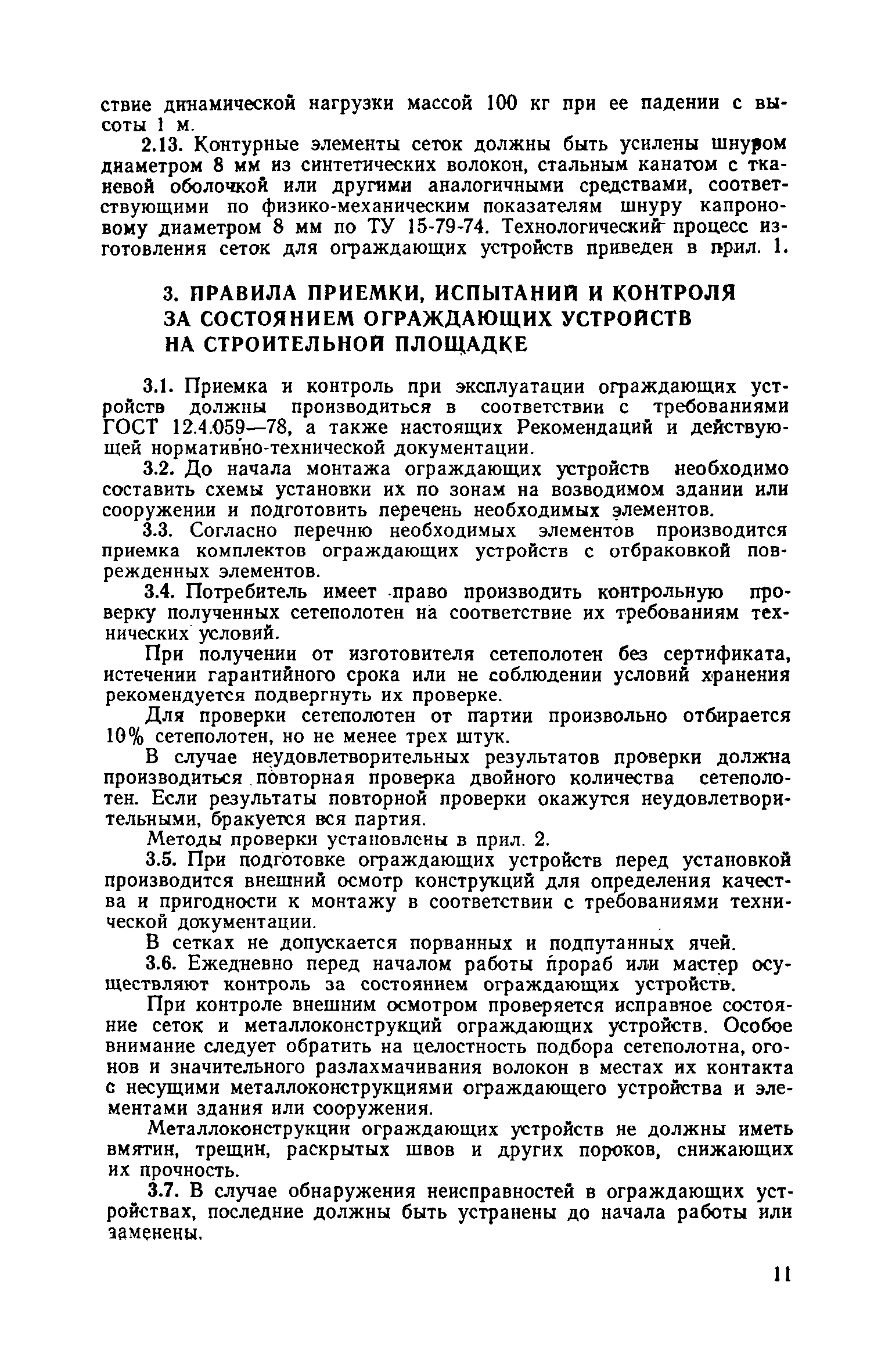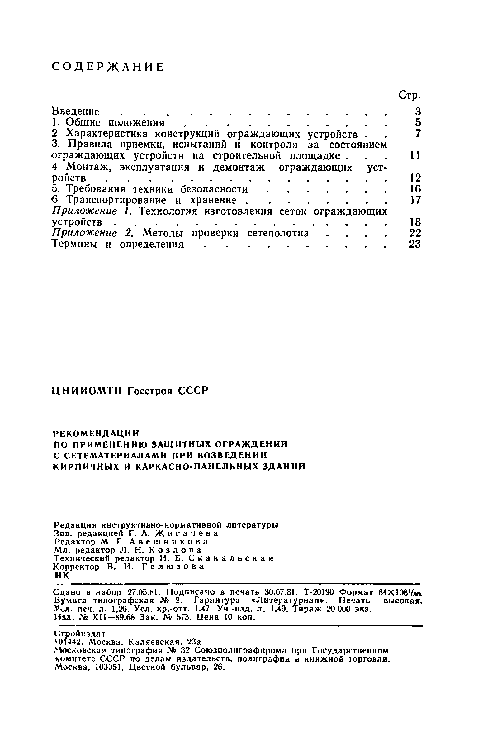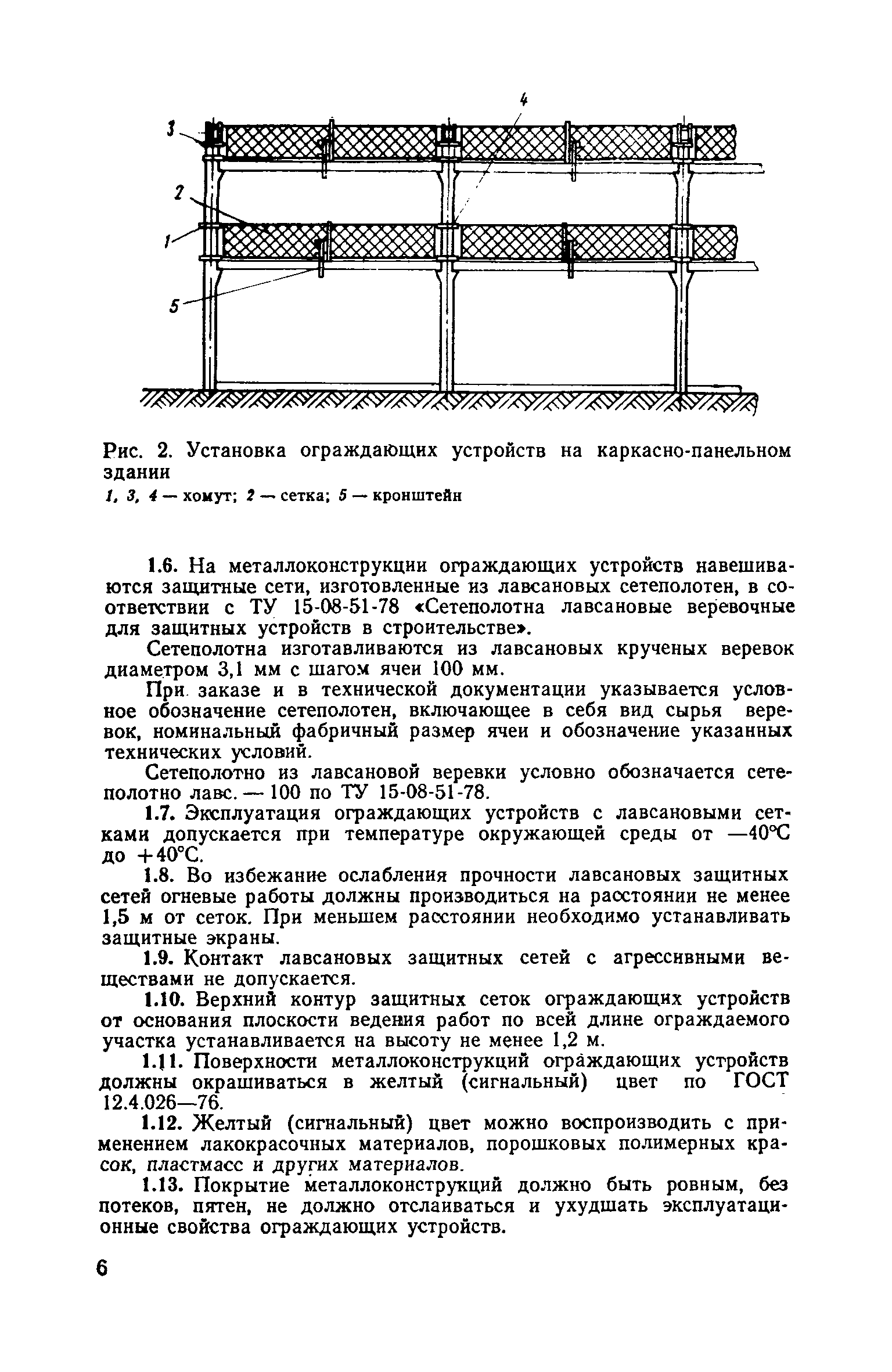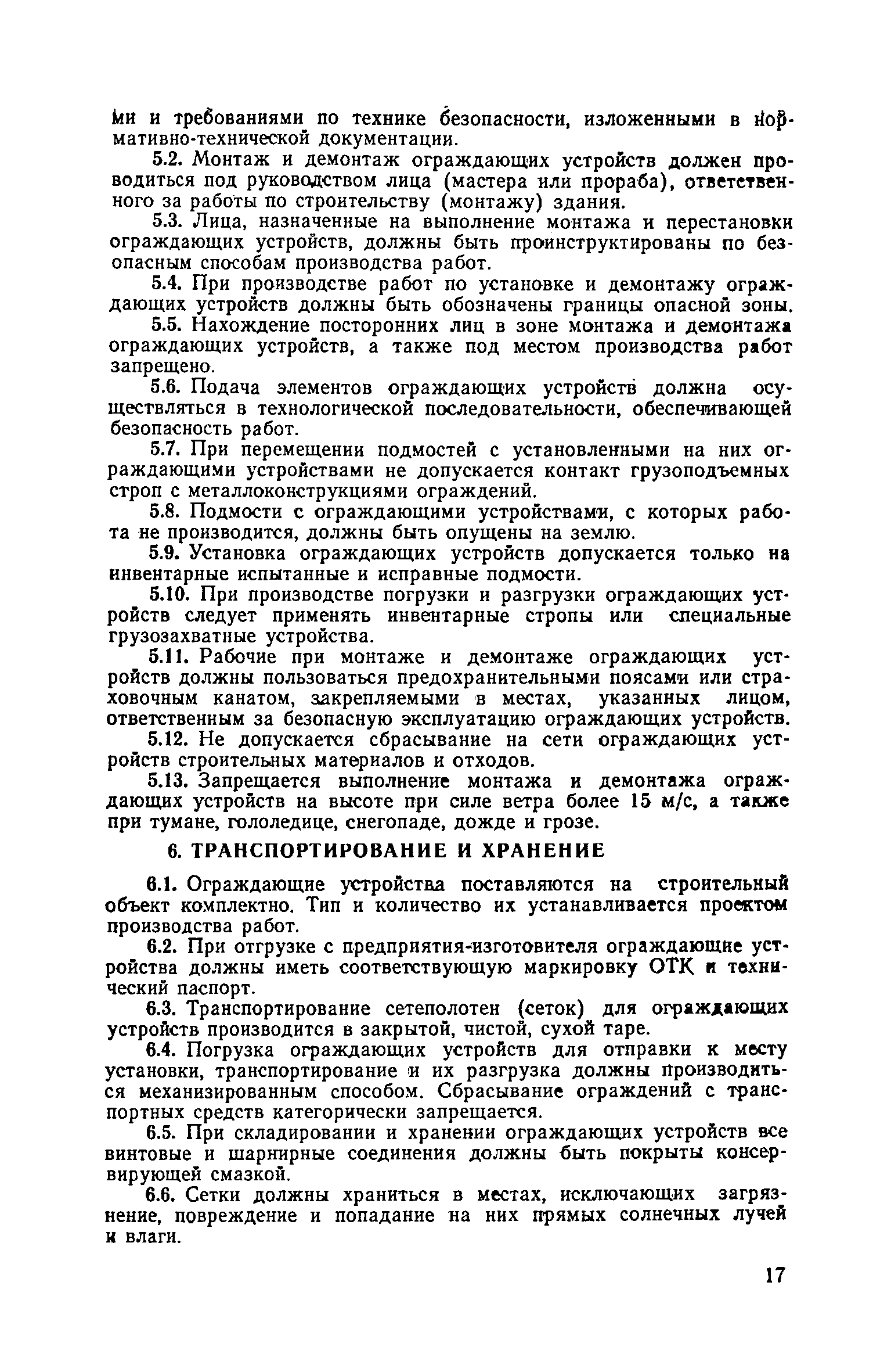 | Оглавление: | Введение 1. Общие положения 2. Характеристика конструкций ограждающих устройств . 3. Правила приемки, испытаний и контроля за состоянием ограждающих устройств на строительной площадке 4. Монтаж, эксплуатация и демонтаж ограждающих устройств 5. Требования техники безопасности 6. Транспортирование и хранение Приложение 1. Технология изготовления сеток ограждающих устройств Приложение 2. Методы проверки сетеполотна Термины и определения |