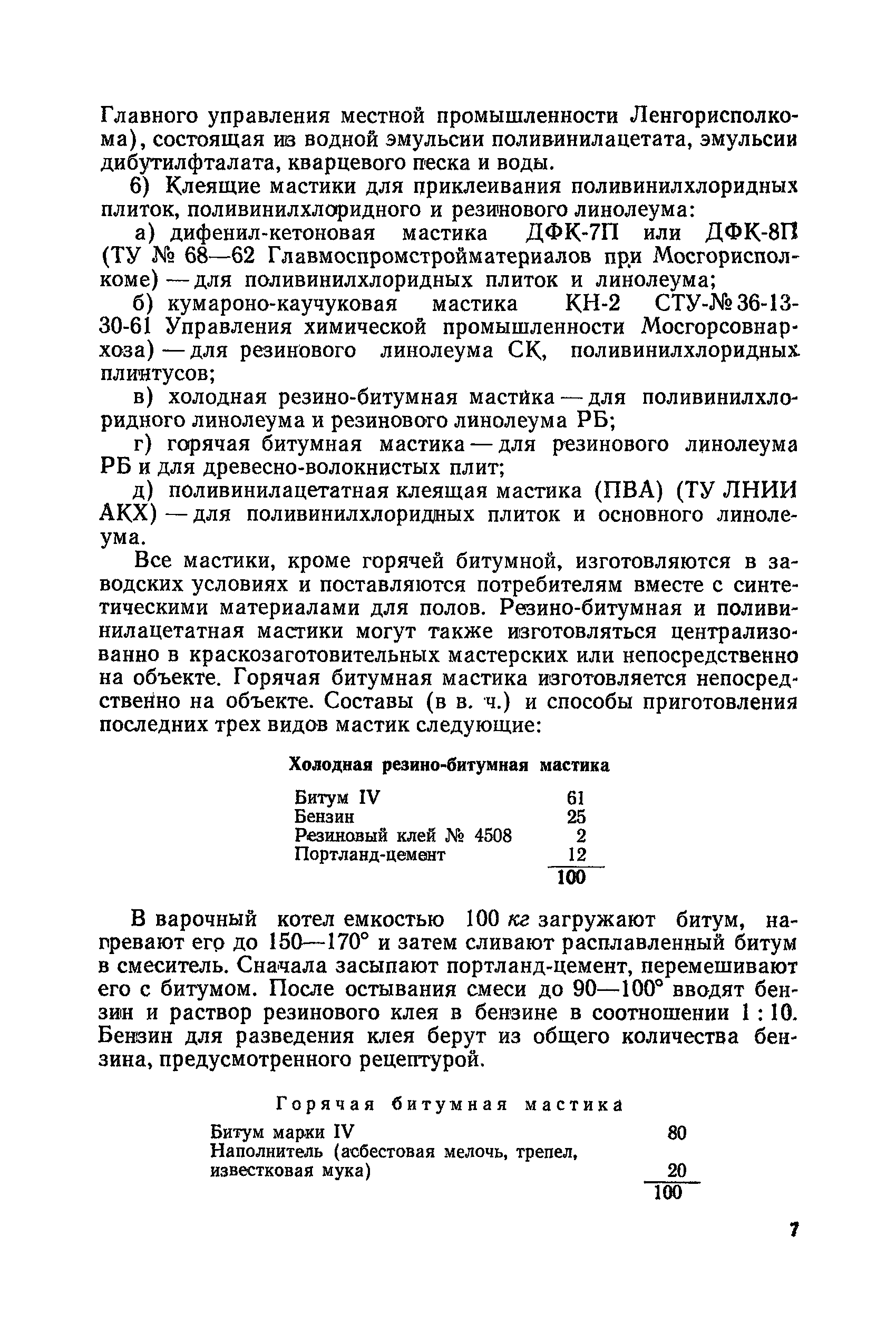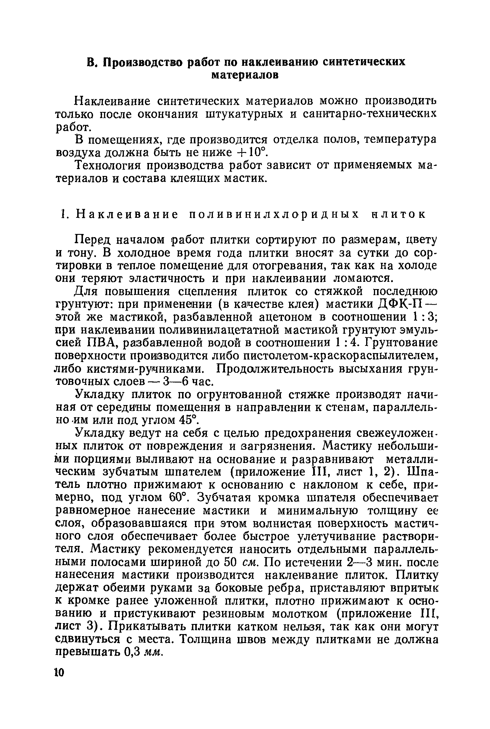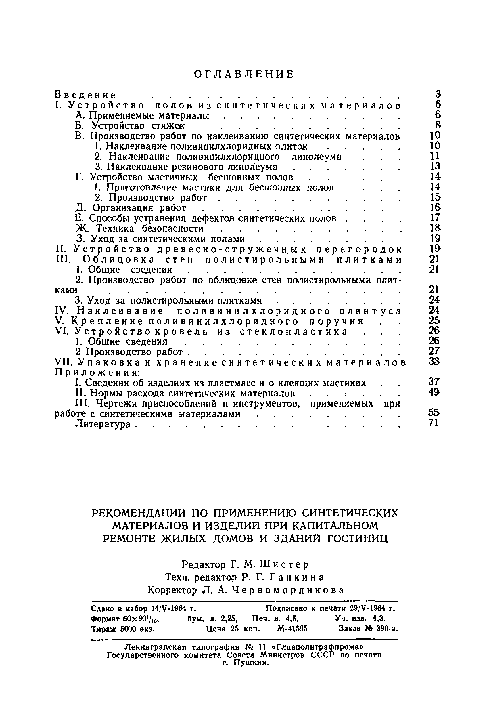 | Оглавление: | Введение 1. Устройство полов из синтетических материалов А. Применяемые материалы Б. Устройство стяжек В. Производство работ по наклеиванию синтетических материалов 1. Наклеивание поливинилхлоридных плиток 2. Наклеивание поливинилхлоридного линолеума 3. Наклеивание резинового линолеума Г. Устройство мастичных бесшовных полов 1. Приготовление мастики для бесшовных полов 2. Производство работ Д. Организация работ Е. Способы устранения дефектов синтетических полов Ж. Техника безопасности З. Уход за синтетическими полами II. Устройство древесно-стружечных перегородок III. Облицовка стен полистирольными плитками 1. Общие сведения 2. Производство работ по облицовке стен полистирольными плитками 3. Уход за полистирольными плитками IV. Наклеивание поливинилхлоридного плинтуса V. Крепление поливинилхлоридного поручня VI. Устройство кровель из стеклопластика 1. Общие сведения 2 Производство работ VII.Упаковка и хранение синтетических материалов Приложение 1. Сведения об изделиях из пластмасс и о клеящих мастиках . Приложение II. Нормы расхода синтетических материалов Приложение III. Чертежи приспособлений и инструментов, применяемых при работе с синтетическими материалами Литература |