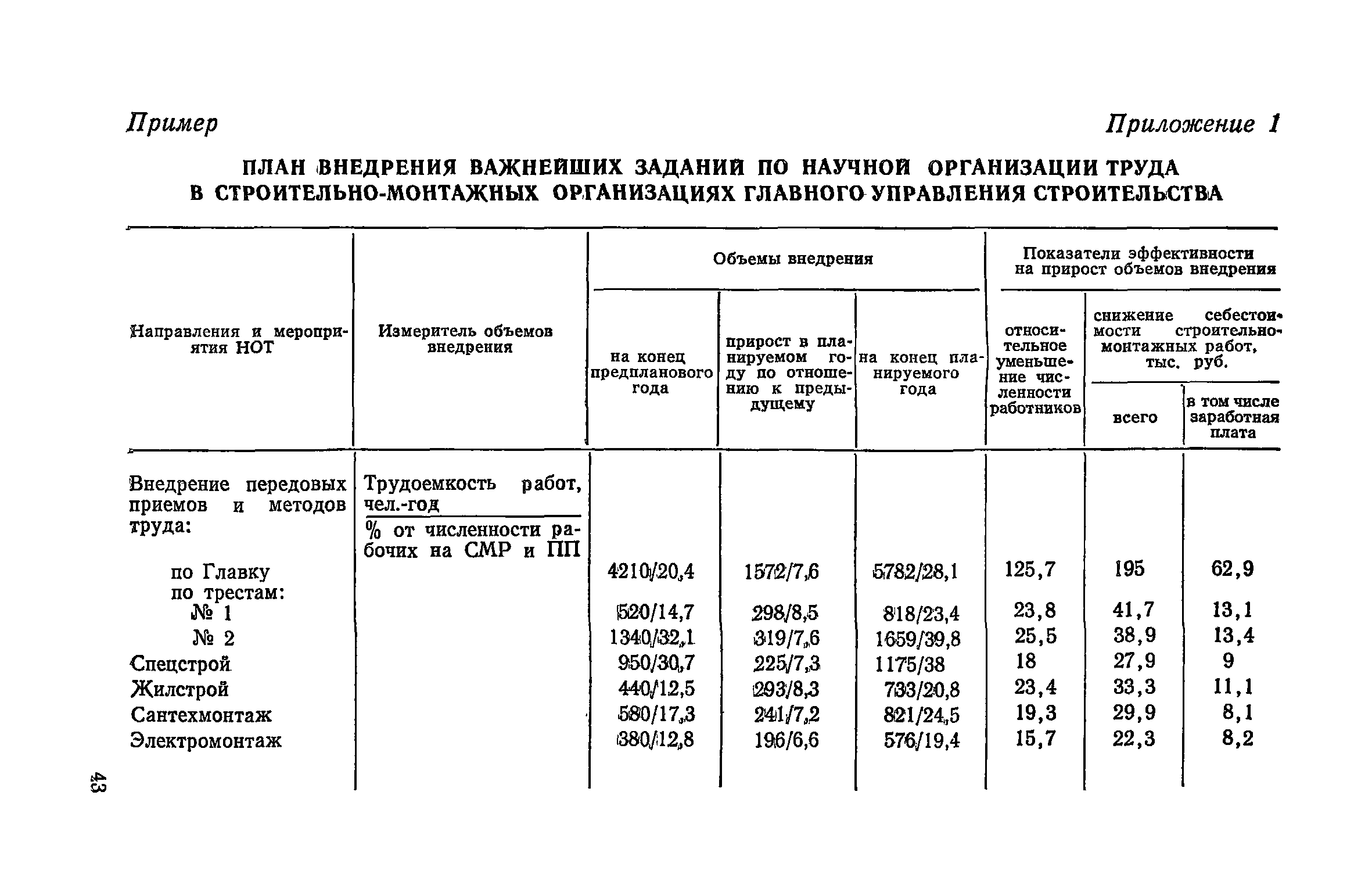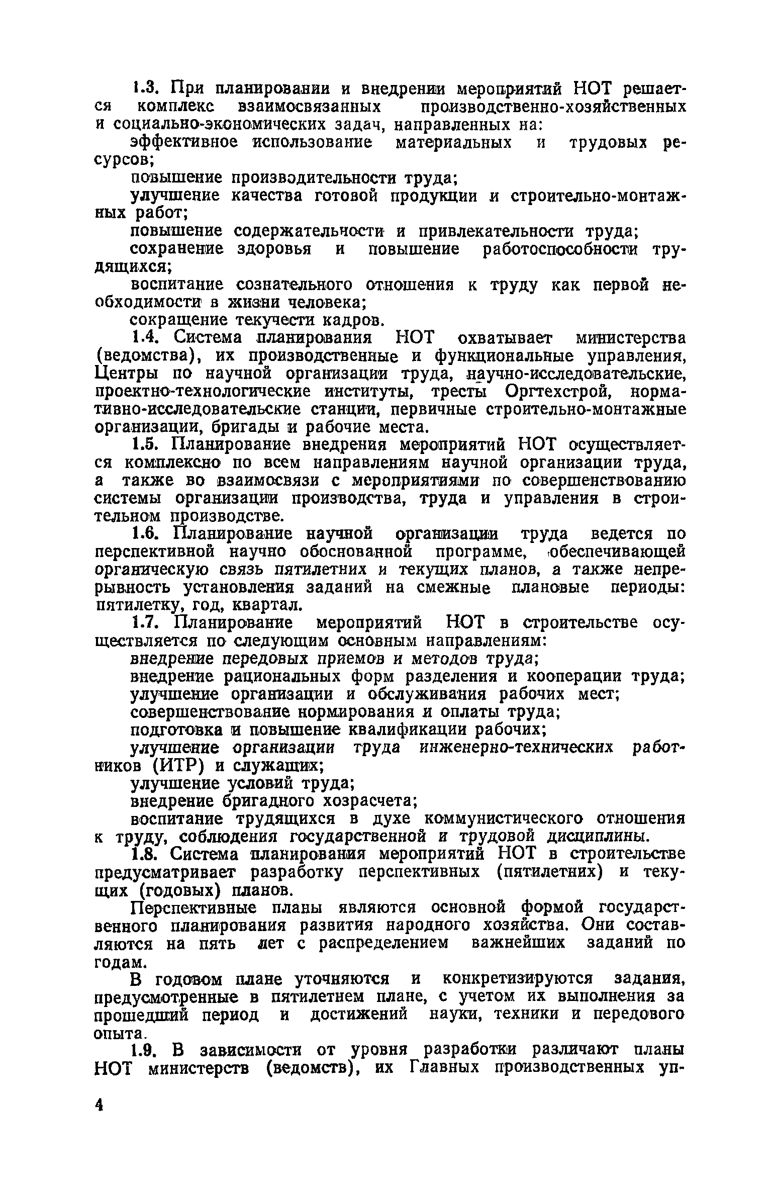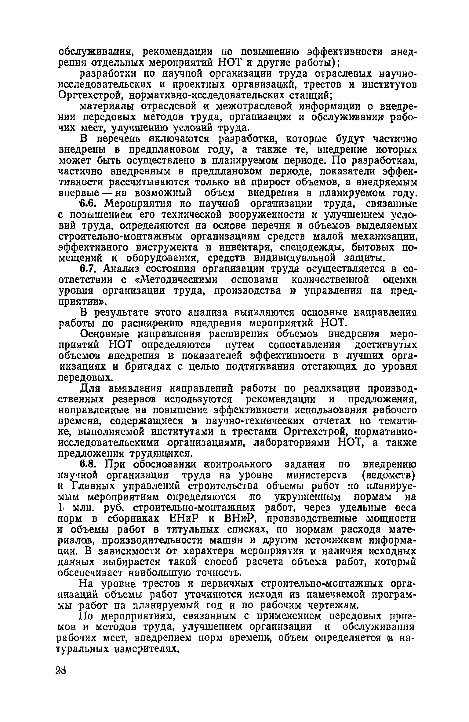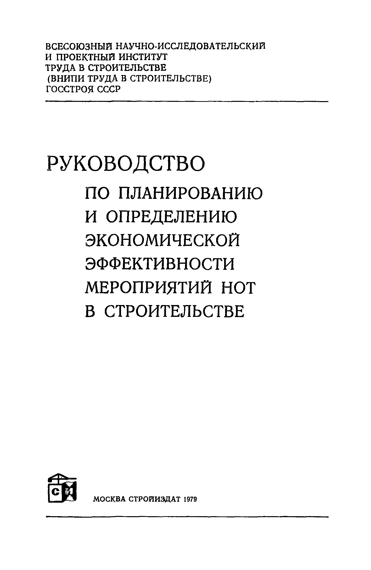 Руководство по планированию и определению экономической эффективности мероприятий НОТ в строительстве| Статус: | справочные материалы, мп, тпр | | Название рус.: | Руководство по планированию и определению экономической эффективности мероприятий НОТ в строительстве | | Дата добавления в базу: | 01.10.2014 | | Дата актуализации: | 01.01.2021 | | Область применения: | Руководство предназначено для инженерно-технических работников строительных подразделений, нормативно-исследовательских станций, институтов и трестов Оргтехстрой, занимающихся планированием и внедрением мероприятий по научной организации труда. | | Оглавление: | Введение 1. Общие положения 2. Виды и содержание планов НОТ 3. Основные этапы разработки планов НОТ 4. Обязанности структурных подразделений и должностных лиц по планированию и внедрению НОТ 5. Определение экономической эффективности мероприятий НОТ 6. Разработка контрольных заданий по внедрению мероприятий НОТ 7. Разработка проектов планов по научной организации труда 8. Разработка планов внедрения мероприятий по научной организации труда 9. Внедрение, учет и отчетность мероприятий НОТ в строительно-монтажных организациях 10. Материальное стимулирование внедрения мероприятий Приложение 1. План внедрения важнейших заданий по научной организации труда в строительно-монтажных организациях Главного управления строительства Приложение 2. План материально-технического обеспечения внедрения мероприятий НОТ в строительно-монтажных организациях Главного Управления строительства Приложение 3. План перспективных научно-исследовательских, нормативных и проектных работ по научной организации труда в Главном управлении строительства Приложение 4. План проведения школ передового опыта в строительно-монтажных организациях Главного управления строительства Приложение 5. План внедрения мероприятий по научной организации труда в строительно-монтажном управлении Приложение 6. План внедрения мероприятий по научной организации труда в тресте Приложение 7. План организационно-технических мероприятий по обеспечению внедрения научной организации труда в строительно-монтажном управлении Приложение 8. План повышения квалификации и обучения рабочих передовым методам труда в строительно-монтажном управлении Приложение 9. Расчет ожидаемого повышения производительности труда за счет внедрения законченных научно-исследовательских, проектных и нормативных разработок в строительно-монтажных организациях министерства Приложение 10. Расчет ожидаемого повышения производительности труда в результате выделения материально-технических средств для внедрения мероприятий НОТ .... Приложение 11. Расчет ожидаемого повышения производительности труда за счет расширения объемов и повышения эффективности внедрения мероприятий НОТ в строительно-монтажных организациях министерства Приложение 12. Перечень научно-исследовательских, нормативных и проектных разработок, рекомендуемых к внедрению в строительно-монтажных организациях министерства Приложение 13. Показатели количественной оценки уровня организации труда в бригадах Приложение 14. Акт о внедрении мероприятий по научной организации труда (НОТ) Приложение 15. Ведомость учета работы бригады штукатуров Приложение 16. Учет внедрения новых и пересмотра действующих местных норм