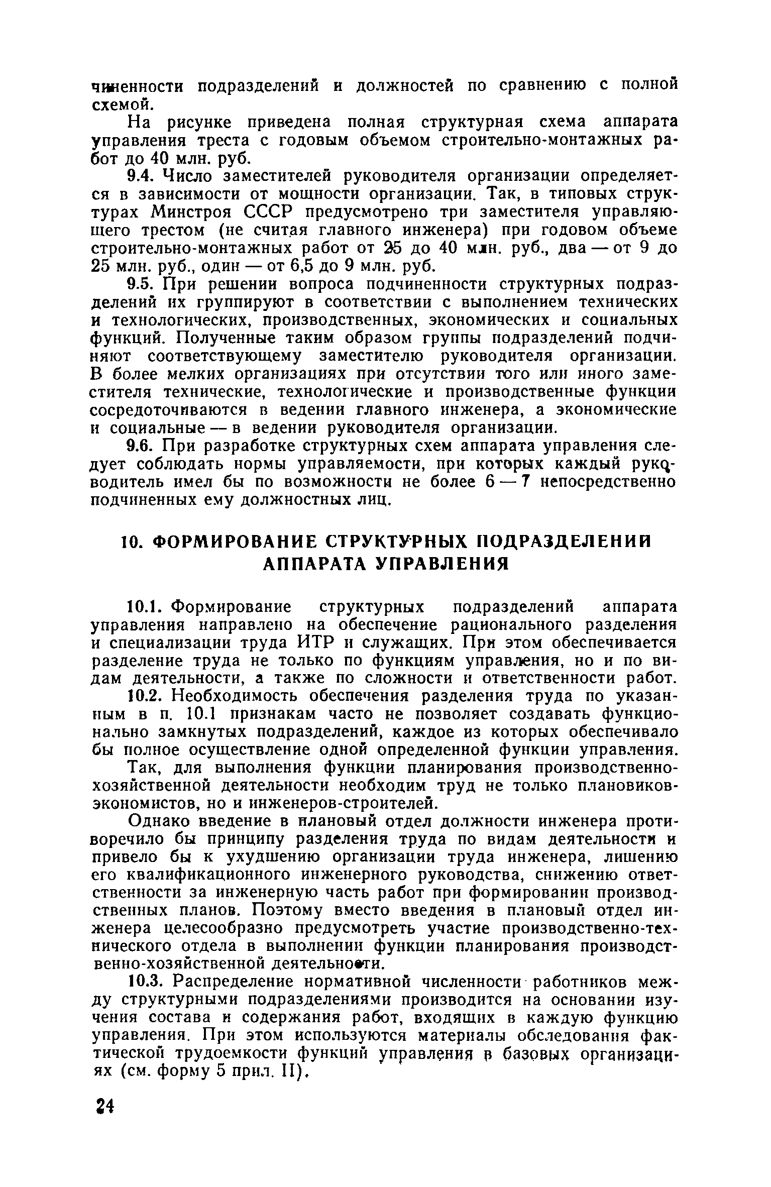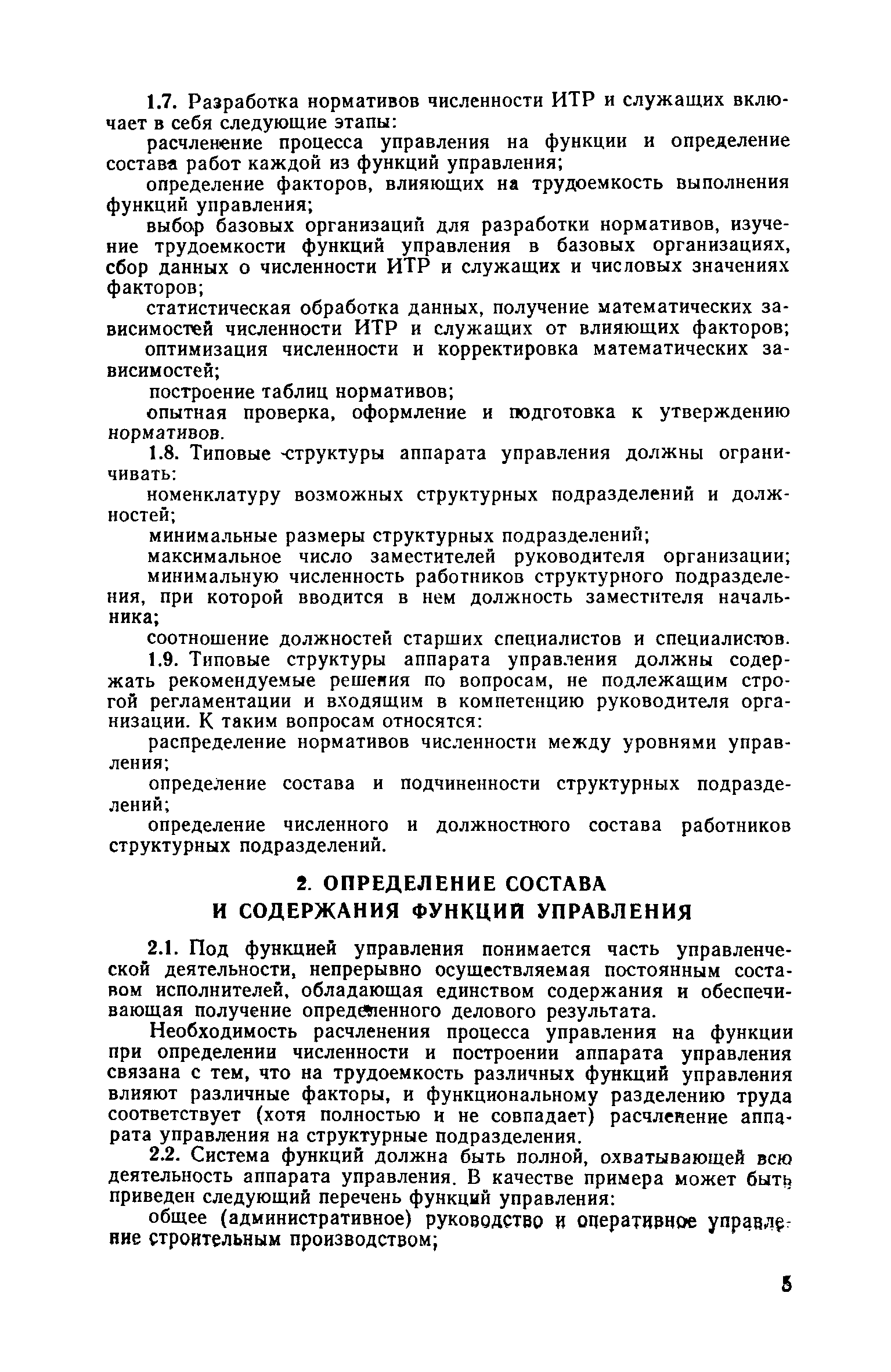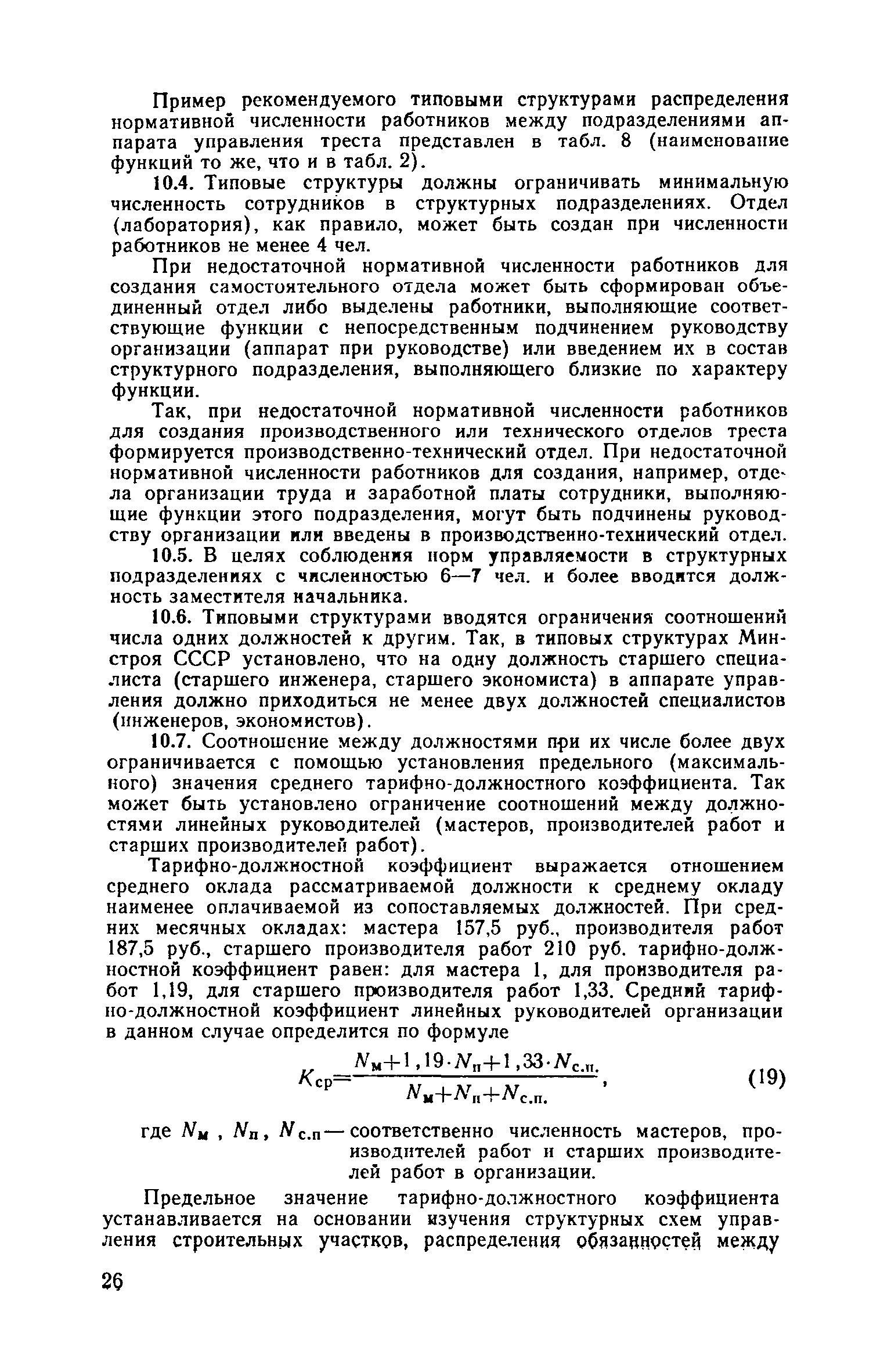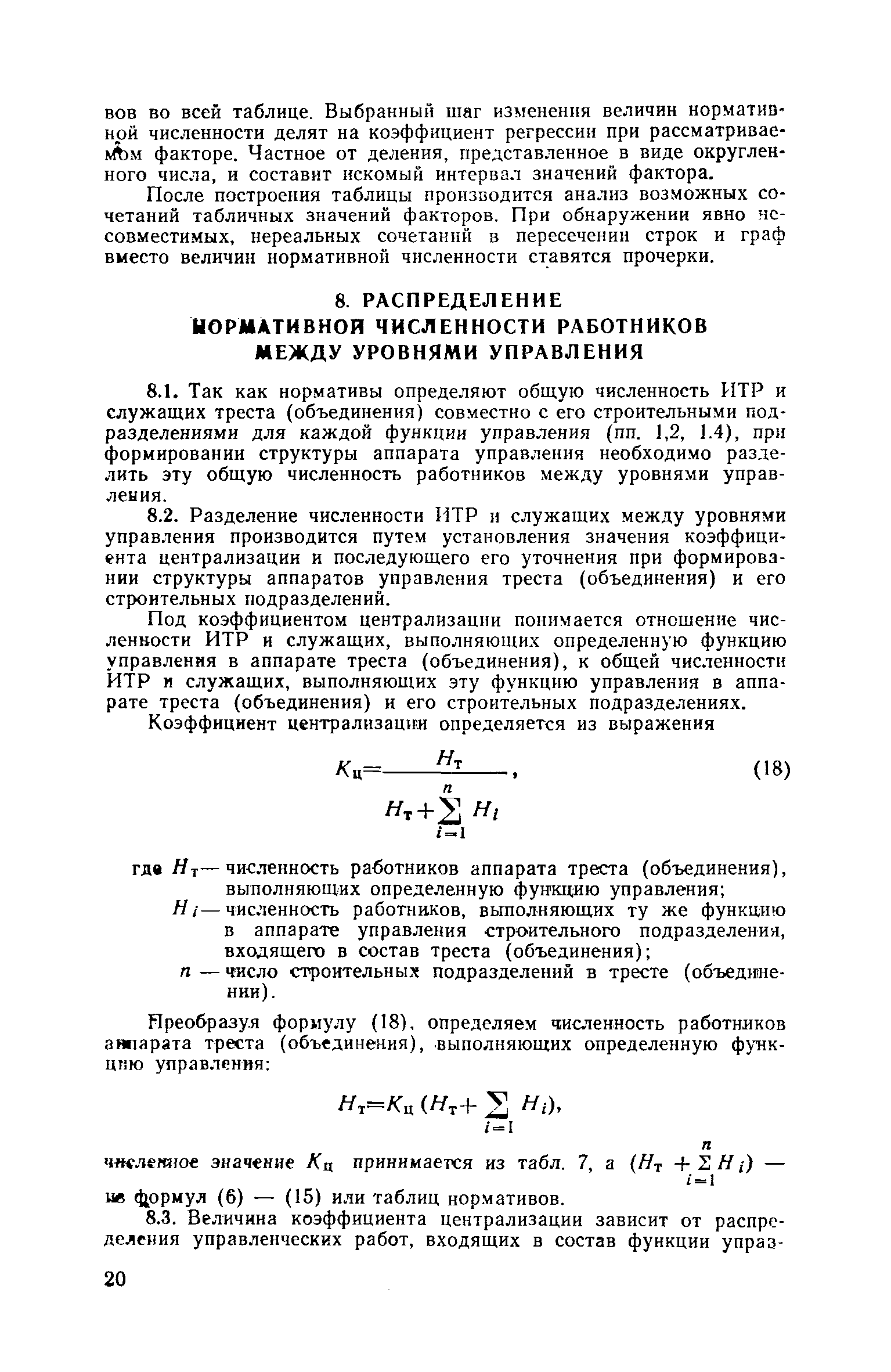 | Оглавление: | Введение 1. Общие положения 2. Определение состава и содержания функций управления 3. Определение факторов, влияющих на численность ИТР и служащих 4. Исходные данные для разработки нормативов численности, их сбор и обработка 5. Получение нормативных формул и их интерпретация 6. Оптимизация численности ИТР и служащих 7. Построение таблиц нормативов 8. Распределение нормативной численности работников между уровнями управления 9. Построение структурных схем аппарата управления 10. Формирование структурных подразделений аппарата управления 11. Опытная проверка проекта нормативов численности ИТР и служащих Приложение I. Перечень функций управления н входящих в их состав работ аппарата треста и СУ Приложение II. Формы запроса исходных данных и обследования работы аппарата управления Приложение III. Таблицы обработки исходных данных |