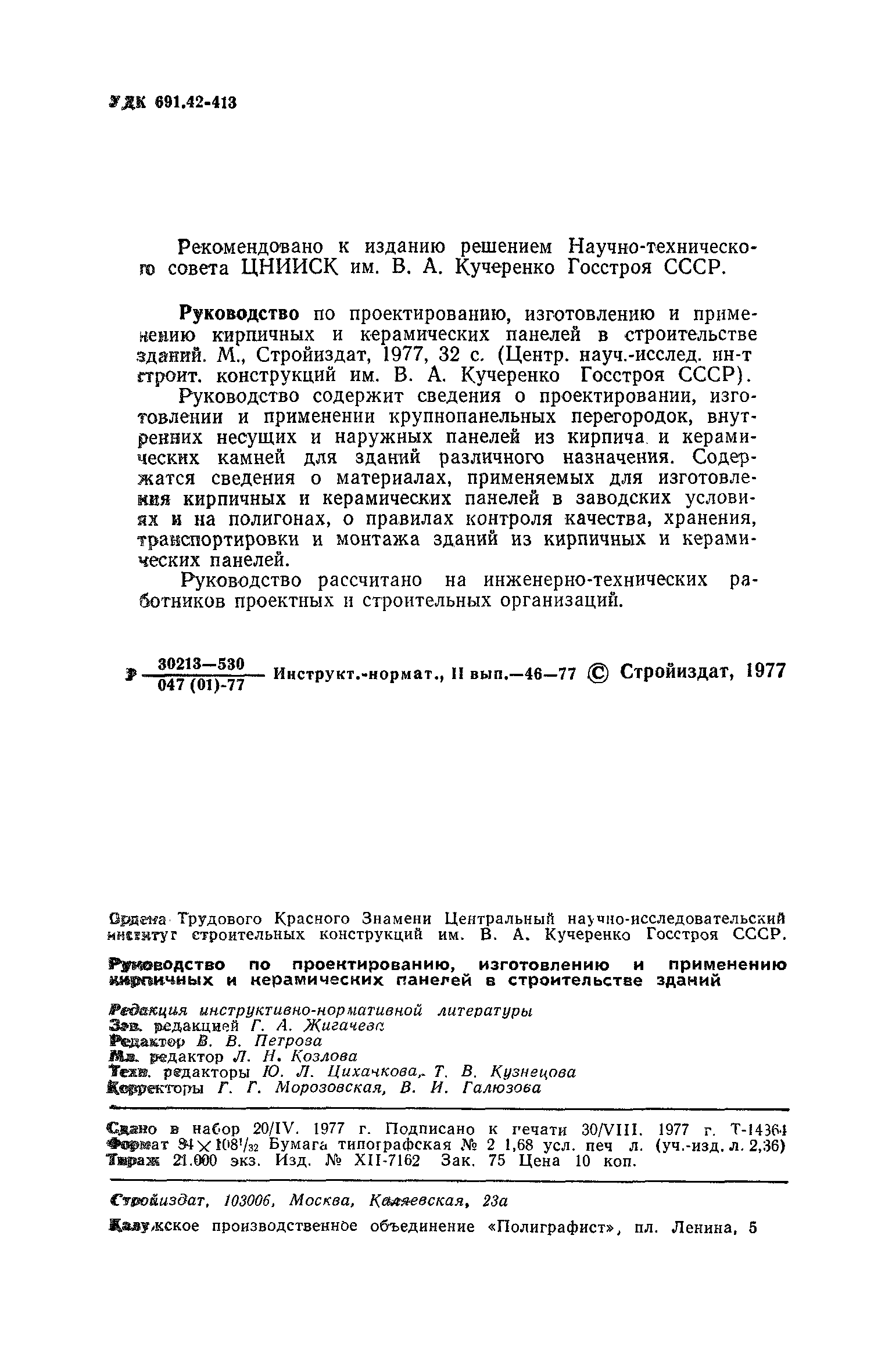 | Область применения: | Руководство распространяется на проектирование, изготовление и монтаж ограждающих конструкций на кирпичных и керамических панелей жилых зданий высотой до 12 этажей общественных, производственных и сельскохозяйственных зданий. Руководство содержит сведения о проектировании, изготовлении и применении крупнопанельных перегородок, внутренних несущих и наружных панелей из кирпича и керамических камней для зданий различного назначения. Содержатся сведения о материалах, применяемых для изготовления кирпичных и керамических панелей в заводских условиях и на полигонах, о правилах контроля качества, хранения, транспортировки и монтажа зданий из кирпичных и керамических панелей. Руководство рассчитано на инженерно-технических работников проектных и строительных организаций. |