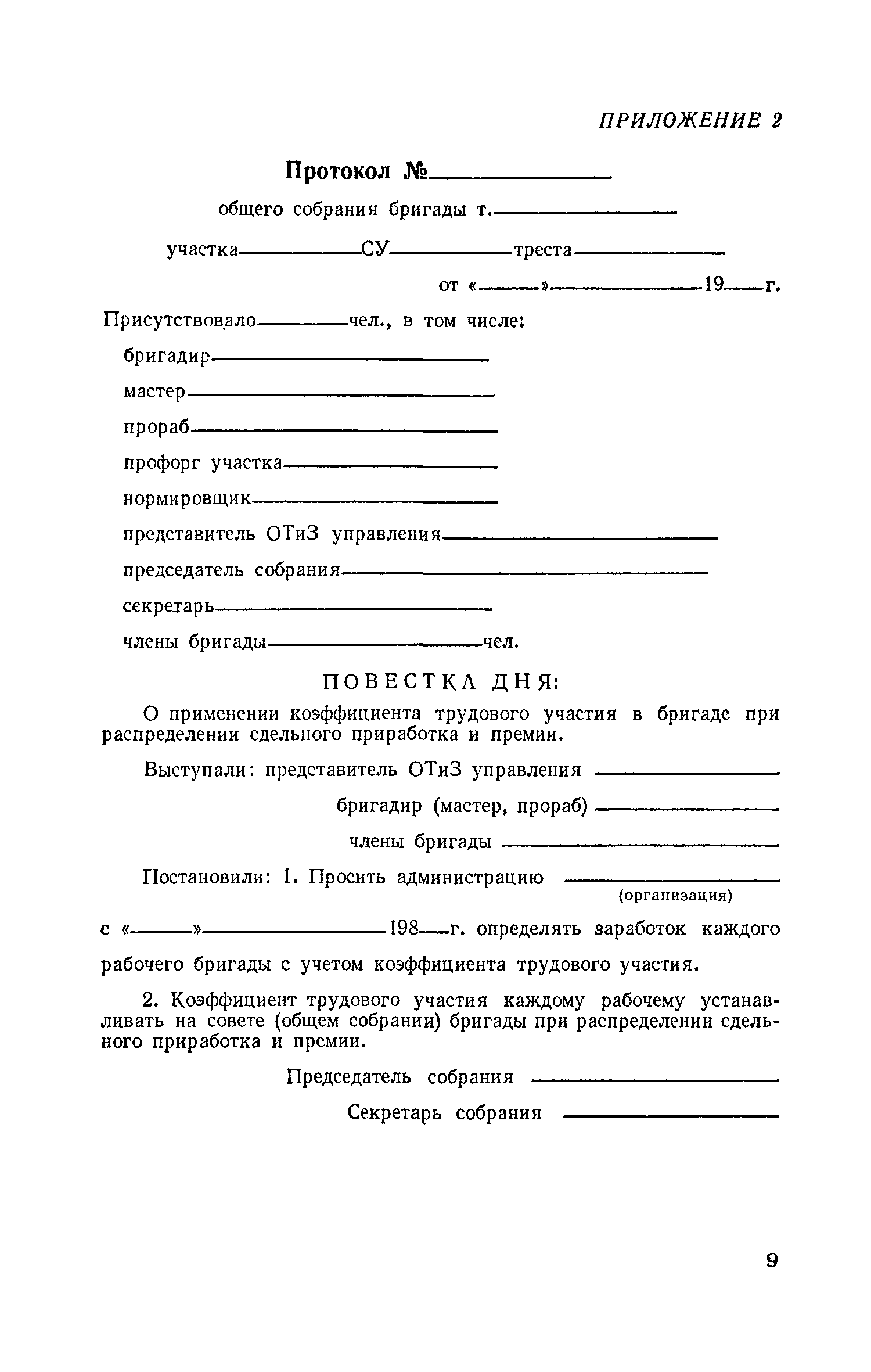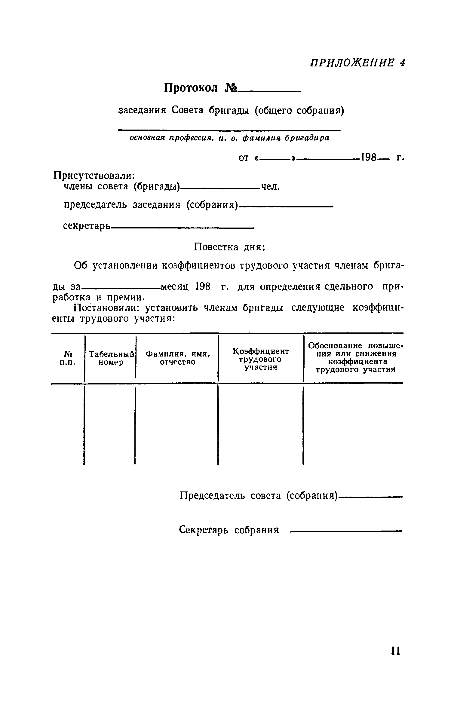 | Оглавление: | 1. Общие положения 2. Порядок применения коэффициентов трудового участия 3. Порядок определения коэффициентов трудового участия и заработной платы рабочих Приложение 1. Примерная шкала коэффициентов трудового участия Приложение 2. Протокол Приложение 3. Приказ Приложение 4. Протокол Приложение 5. Пример определения заработной платы рабочих бригады с применением коэффициентов трудового участия |