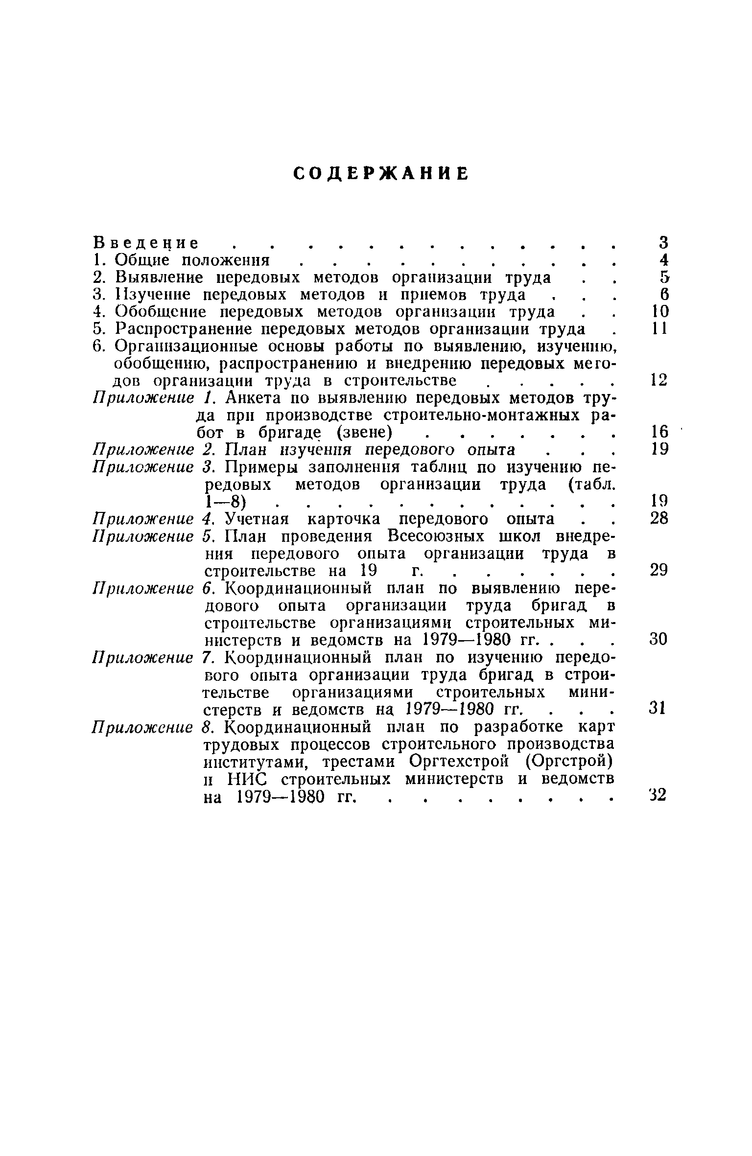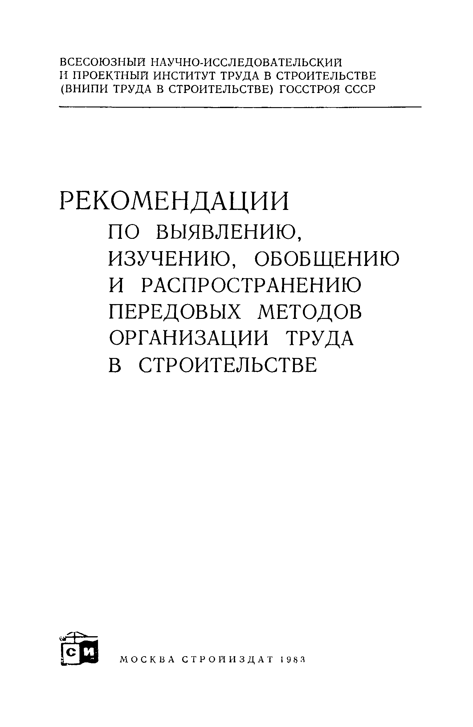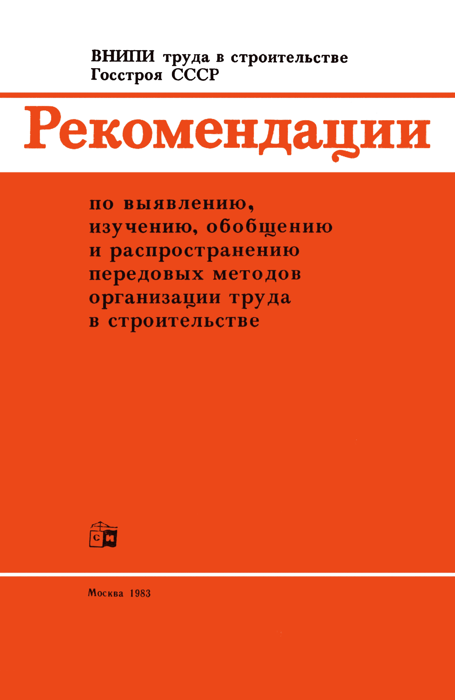 Рекомендации по выявлению, изучению, обобщению и распространению передовых методов организации труда в строительстве| Статус: | справочные материалы, мп, тпр | | Название рус.: | Рекомендации по выявлению, изучению, обобщению и распространению передовых методов организации труда в строительстве | | Дата добавления в базу: | 01.10.2014 | | Дата актуализации: | 01.01.2021 | | Область применения: | Документ содержит основные положения о проведении исследований по выявлению, изучению, обобщению и распространению передового опыта в строительных бригадах и звеньях и направлен на совершенствование организации трудовых процессов строительного производства. Предназначен для работников институтов и трестов Оргтехстрой, нормативно-исследовательских станций, центров НОТ, научно-исследовательских институтов и других организаций, занимающихся вопросами изучения, обобщения и распространения передовых методов труда в строительном производстве. | | Оглавление: | Введение 1. Общие положения 2. Выявление передовых методов организации труда 3. Изучение передовых методов и приемов труда 4. Обобщение передовых методов организации труда 5. Распространение передовых методов организации труда 6. Организационные основы работы по выявлению, изучению, обобщению, распространению и внедрению передовых методов организации труда в строительстве Приложение 1. Анкета по выявлению передовых методов труда при производстве строительно-монтажных работ в бригаде (звене) Приложение 2. План изучения передового опыта Приложение 3. Примеры заполнения таблиц по изучению передовых методов организации труда (табл. 1- 8) Приложение 4. Учетная карточка передового опыта Приложение 5. План проведения Всесоюзных школ внедрения передового опыта организации труда в строительстве Приложение 6. Координационный план по выявлению передового опыта организации труда бригад в строительстве организациями строительных министерств и ведомств на 1979-1980 гг. Приложение 7. Координационный план по изучению передового опыта организации труда бригад в строительстве организациями строительных министерств и ведомств на 1979-1980 гг. Приложение 8. Координационный план по разработке карт трудовых процессов строительного производства институтами, трестами Оргтехстрой (Оргстрой) и ППС строительных министерств и ведомств на 1979-1980 гг. | | Разработан: | ВНИПИ труда в строительстве Госстроя СССР
