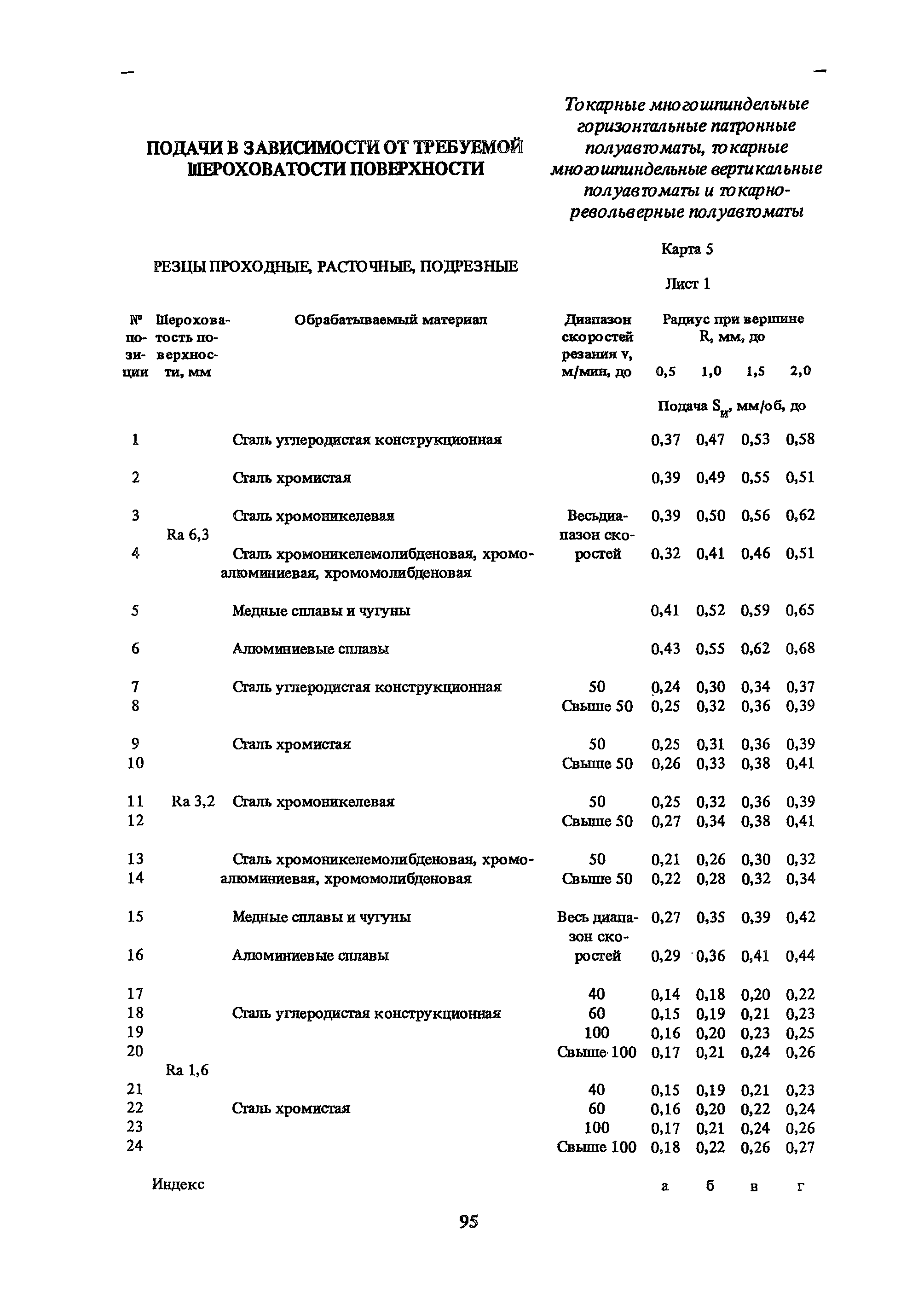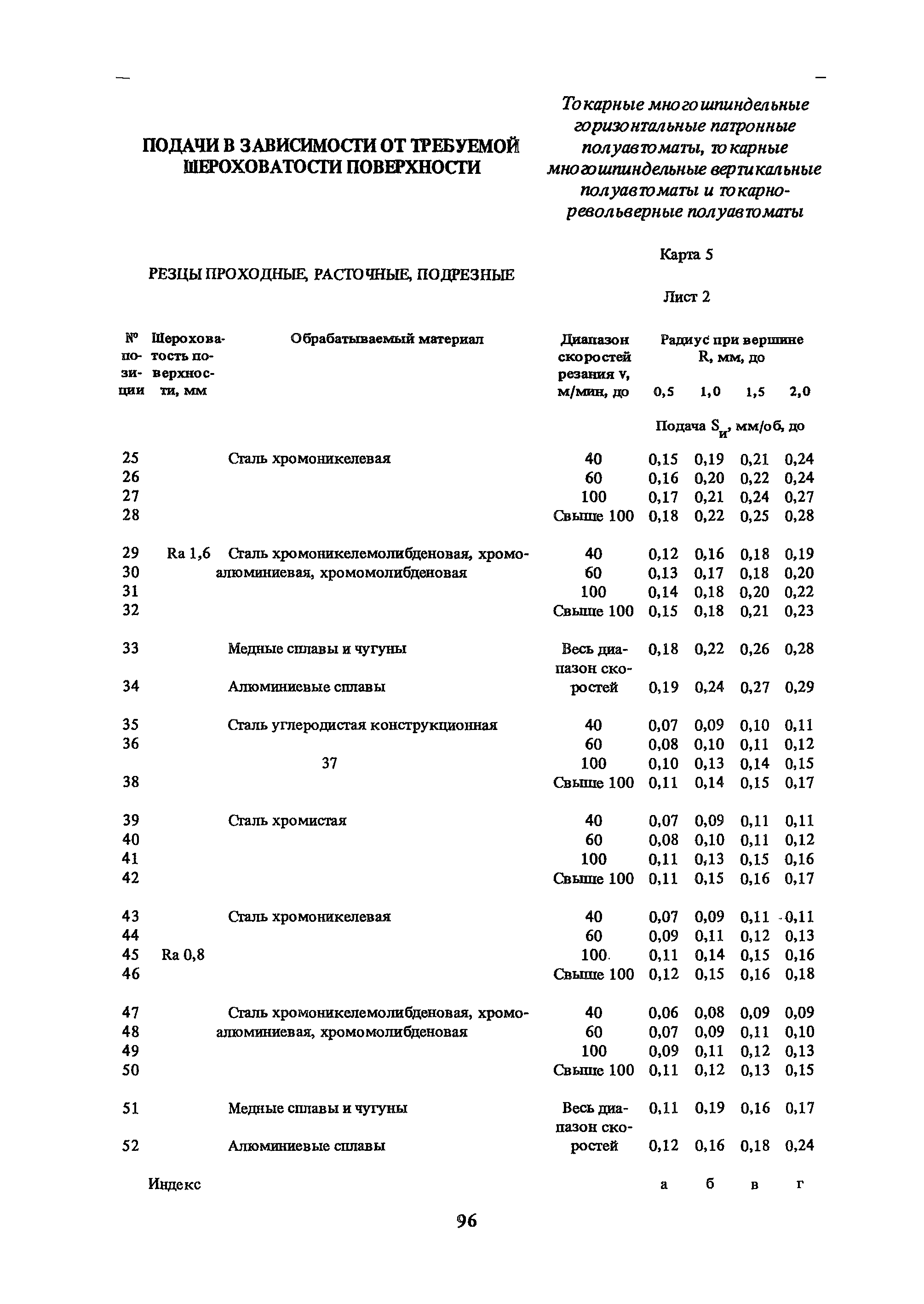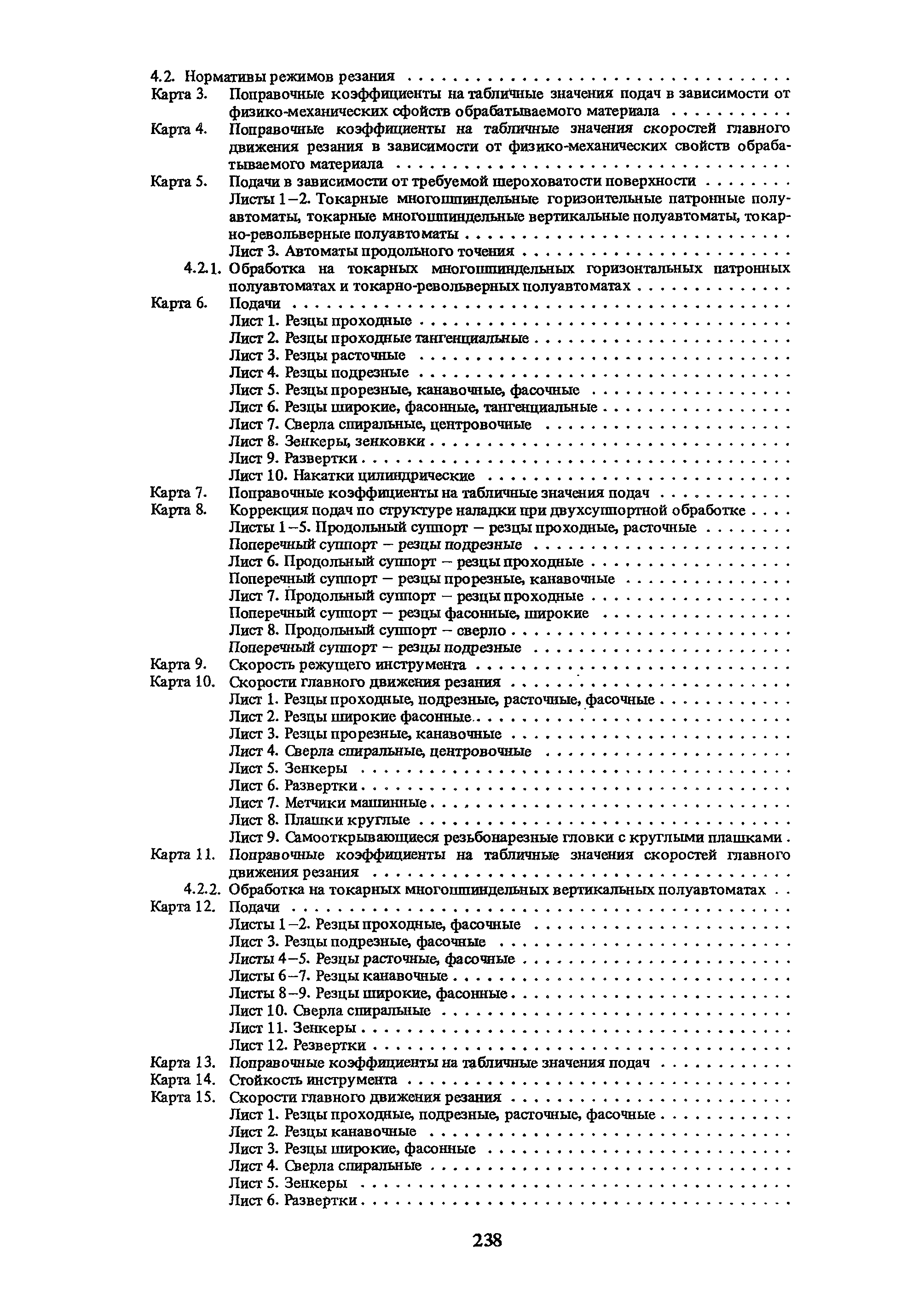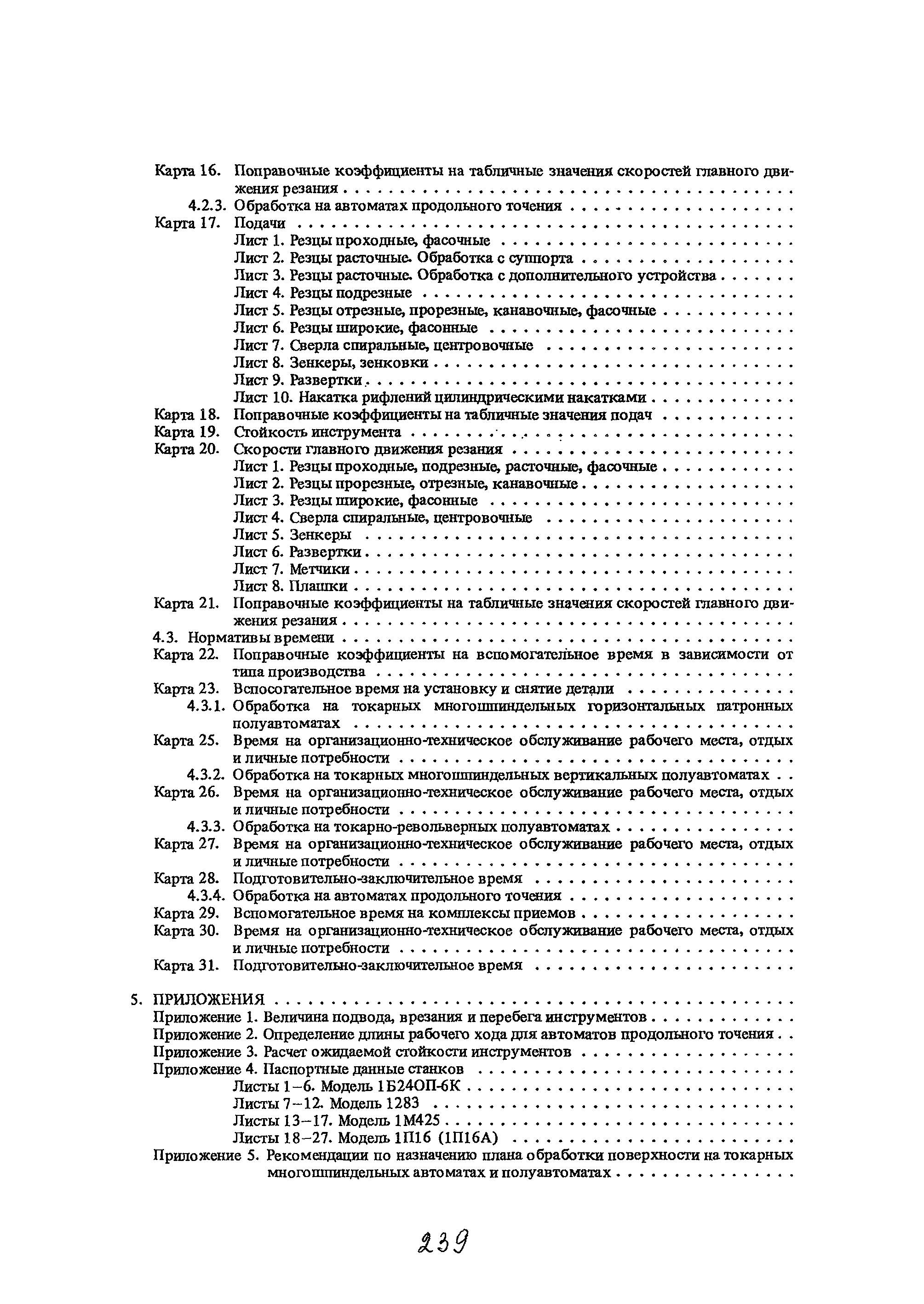 | Оглавление: | Условные обозначения 1. Общая часть 1.1. Назначение и структура нормативов 1.2. Общие технологические условия 1.3. Нормативы режимов резания 1.4. Нормативы времени 2. Методические указания 2.1. Инструкция по расчету режимов резания и нормы времени дня токарных многошпиндельных горизонтальных патронных полуавтоматов 2.2. Инструкция по расчету режимов резания и нормы времени дня токарных многошпиндельных вертикальных полуавтоматов 2.3. Инструкция по расчету режимов резания и нормы времени дня токарно-револьверных полуавтоматов 2.4. Инструкция по расчету режимов резания, нормы времени дня автоматов продольного точения 3. Примеры расчета режимов резания и норм времени 3.1. Пример расчета режимов резания и нормы времени при обработке детали на токарном многошпиндельном горизонтальном патронном полуавтомате 3.2. Пример расчета режимов резания и норм времени при обработке детали на токарном многошпиндельном вертикальном полуавтомате 3.3. Пример расчета режимов резания и норм времени при обработке детали на токарно-револьверном полуавтомате 3.4. Пример расчета режимов резания и норм времени при обработке детали на автомате продольного точения 4. Нормативная часть 4.1. Общие технологические условия 4.2. Нормативы режимов резания 4.3. Нормативы времени Приложение 1. Величина подвода, врезания и перебега инструментов Приложение 2. Определение длины рабочего хода для автоматов продольного точения. Приложение 3. Расчет ожидаемой стойкости инструментов Приложение 4. Паспортные данные станков Листы 1 - 6. Модель 1Б240П-6К Листы 7 - 12. Модель 1283 Листы 13 - 17. Модель 1М425 Листы 18 - 27. Модель 1П16 (1П16А) х Приложение 5. Рекомендация по назначению плана обработки поверхности на токарных многошпиндельных автоматах и полуавтоматах |