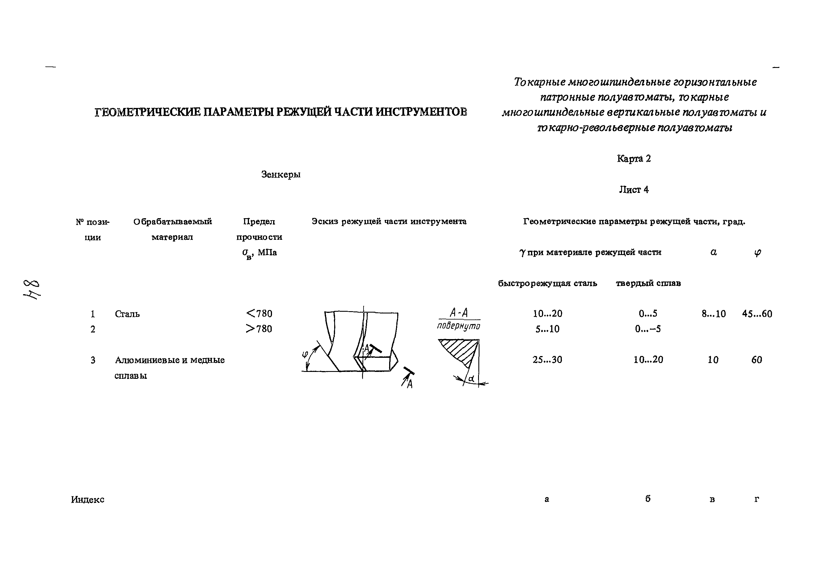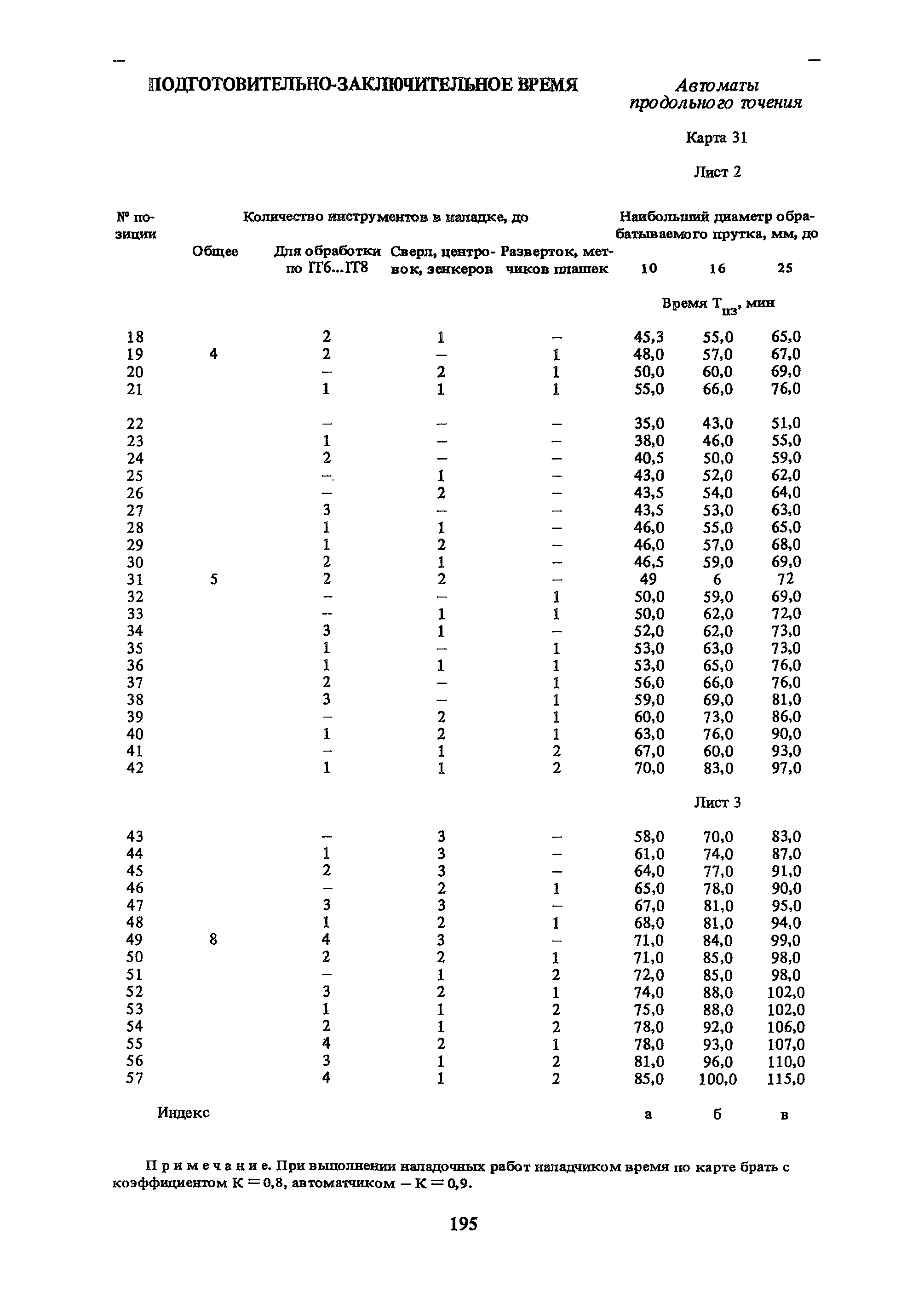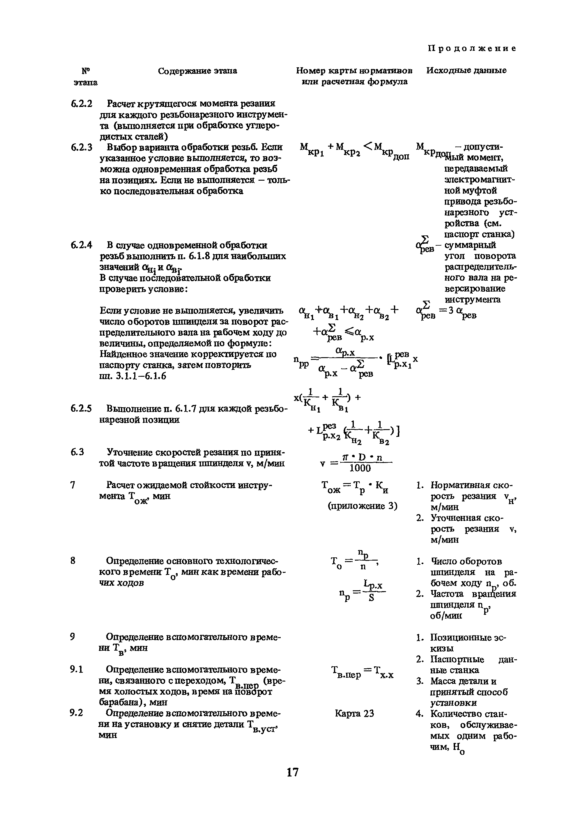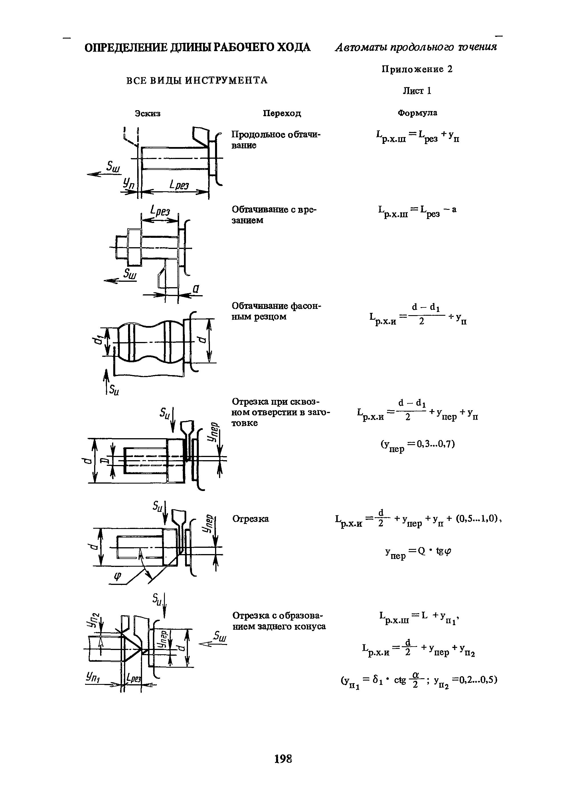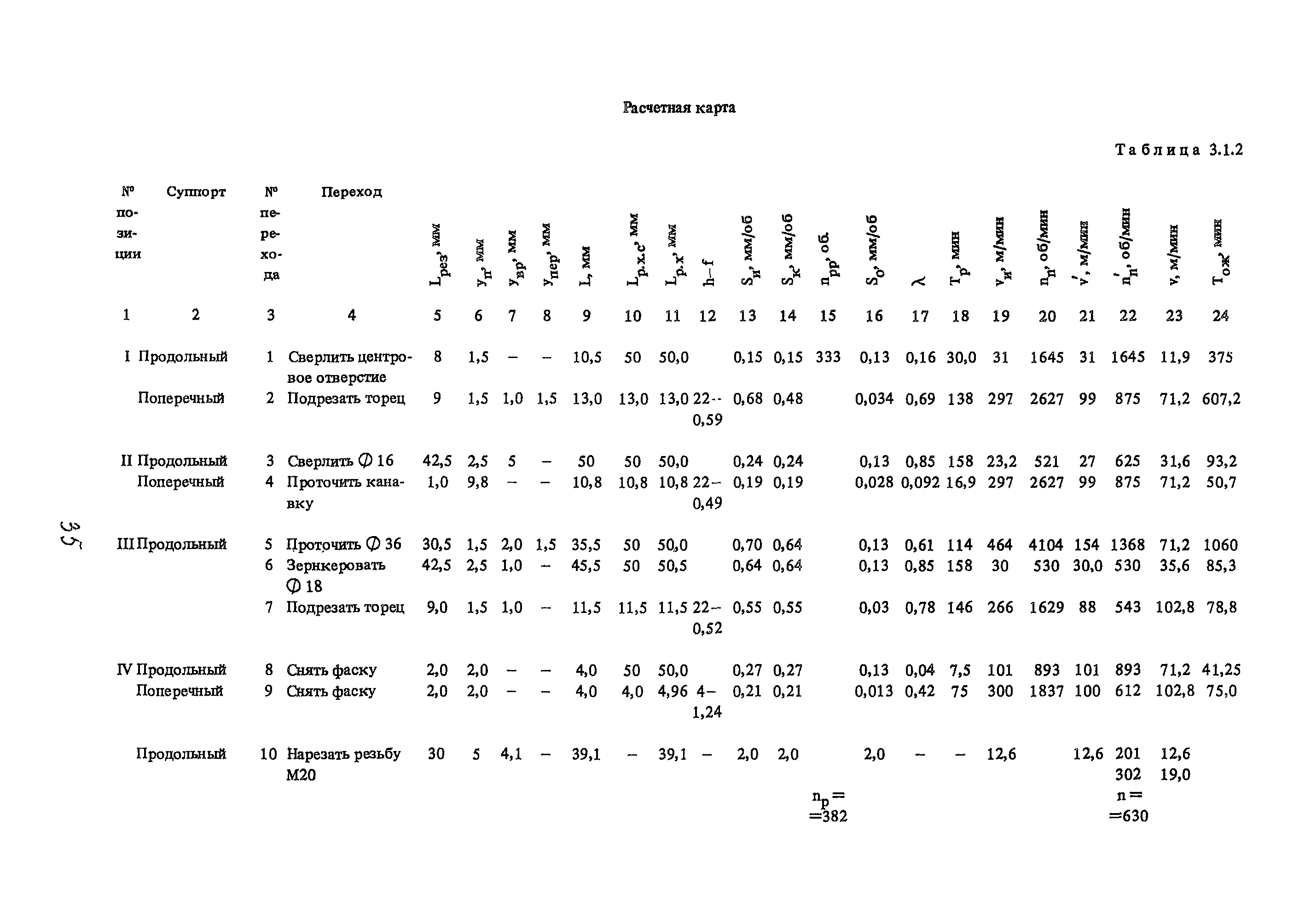 | Оглавление: | Условные обозначения 1. Общая часть 1.1. Назначение и структура нормативов 1.2. Общие технологические условия 1.3. Нормативы режимов резания 1.4. Нормативы времени 2. Методические указания 2.1. Инструкция по расчету режимов резания и нормы времени дня токарных многошпиндельных горизонтальных патронных полуавтоматов 2.2. Инструкция по расчету режимов резания и нормы времени дня токарных многошпиндельных вертикальных полуавтоматов 2.3. Инструкция по расчету режимов резания и нормы времени дня токарно-револьверных полуавтоматов 2.4. Инструкция по расчету режимов резания, нормы времени дня автоматов продольного точения 3. Примеры расчета режимов резания и норм времени 3.1. Пример расчета режимов резания и нормы времени при обработке детали на токарном многошпиндельном горизонтальном патронном полуавтомате 3.2. Пример расчета режимов резания и норм времени при обработке детали на токарном многошпиндельном вертикальном полуавтомате 3.3. Пример расчета режимов резания и норм времени при обработке детали на токарно-револьверном полуавтомате 3.4. Пример расчета режимов резания и норм времени при обработке детали на автомате продольного точения 4. Нормативная часть 4.1. Общие технологические условия 4.2. Нормативы режимов резания 4.3. Нормативы времени Приложение 1. Величина подвода, врезания и перебега инструментов Приложение 2. Определение длины рабочего хода для автоматов продольного точения. Приложение 3. Расчет ожидаемой стойкости инструментов Приложение 4. Паспортные данные станков Листы 1 - 6. Модель 1Б240П-6К Листы 7 - 12. Модель 1283 Листы 13 - 17. Модель 1М425 Листы 18 - 27. Модель 1П16 (1П16А) х Приложение 5. Рекомендация по назначению плана обработки поверхности на токарных многошпиндельных автоматах и полуавтоматах |
