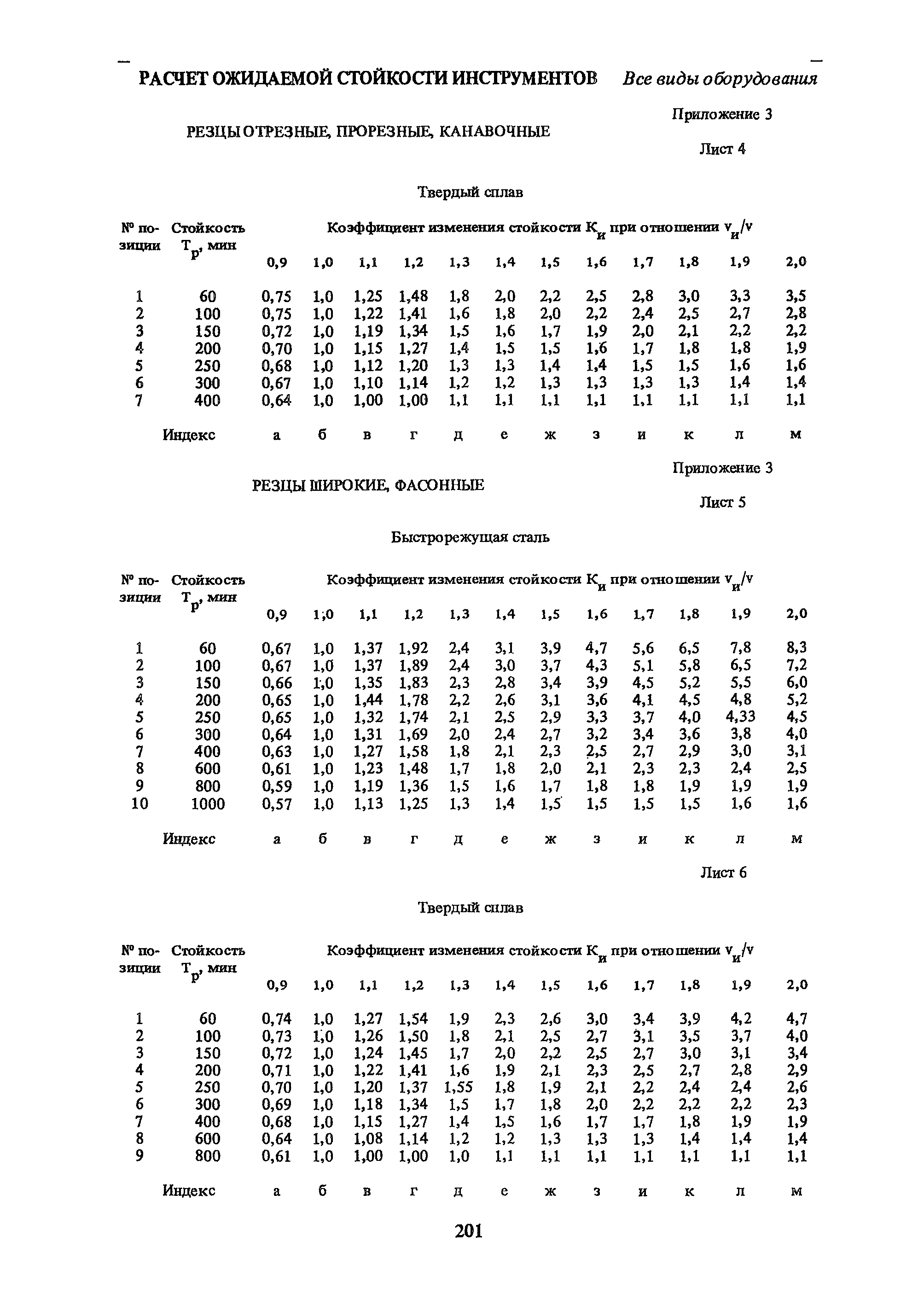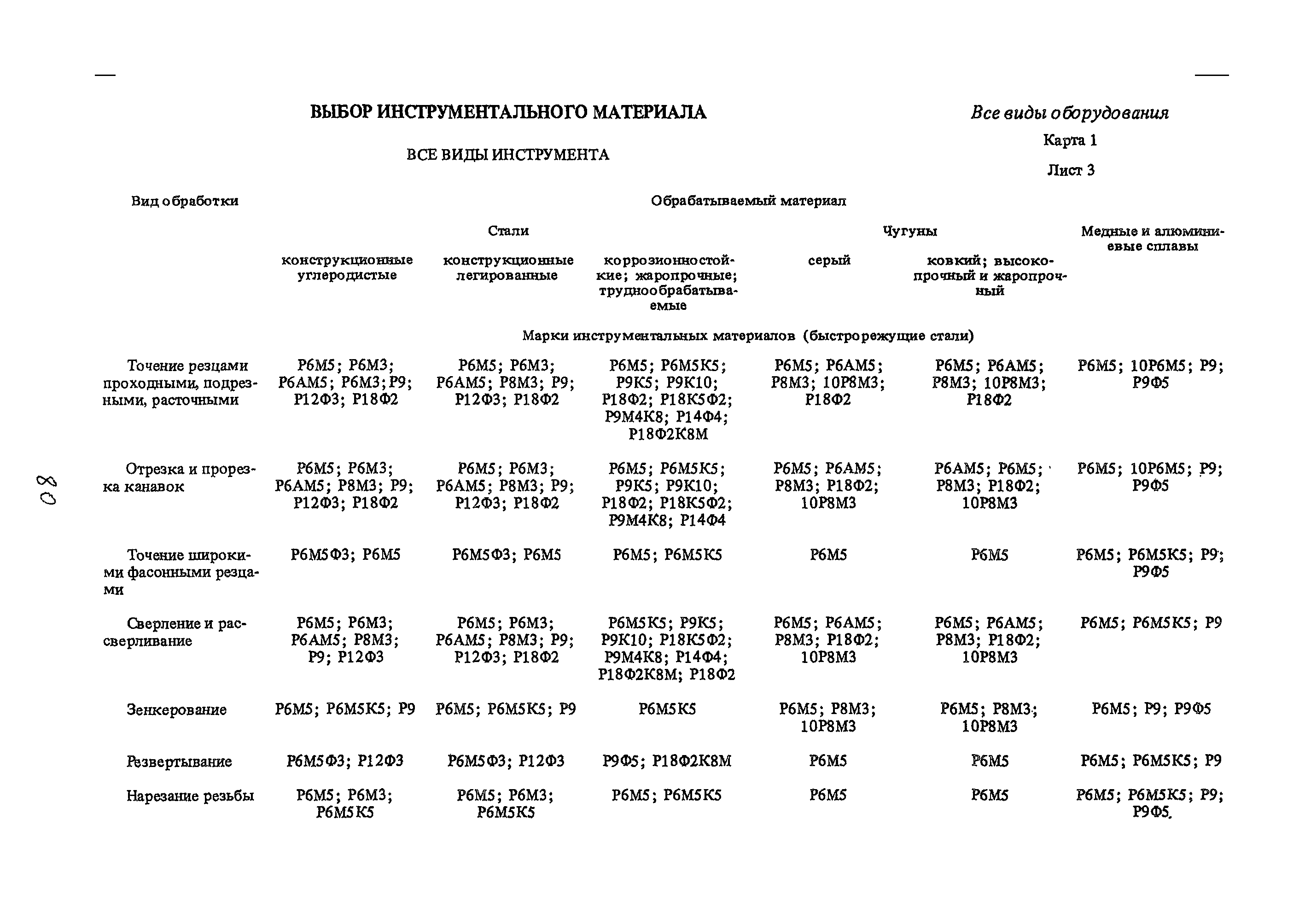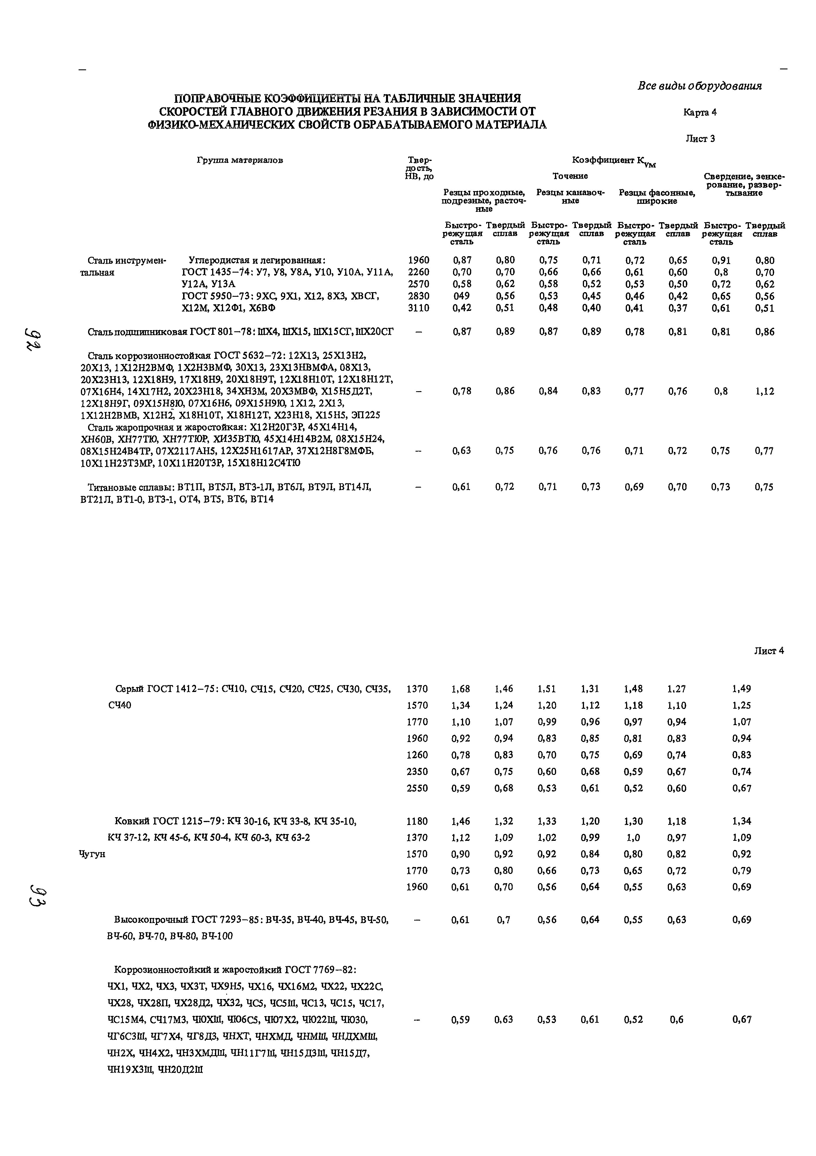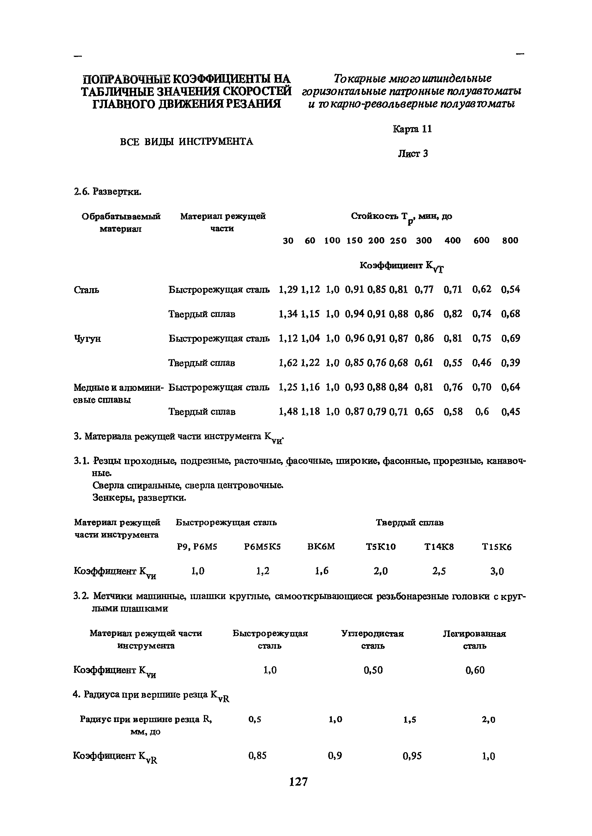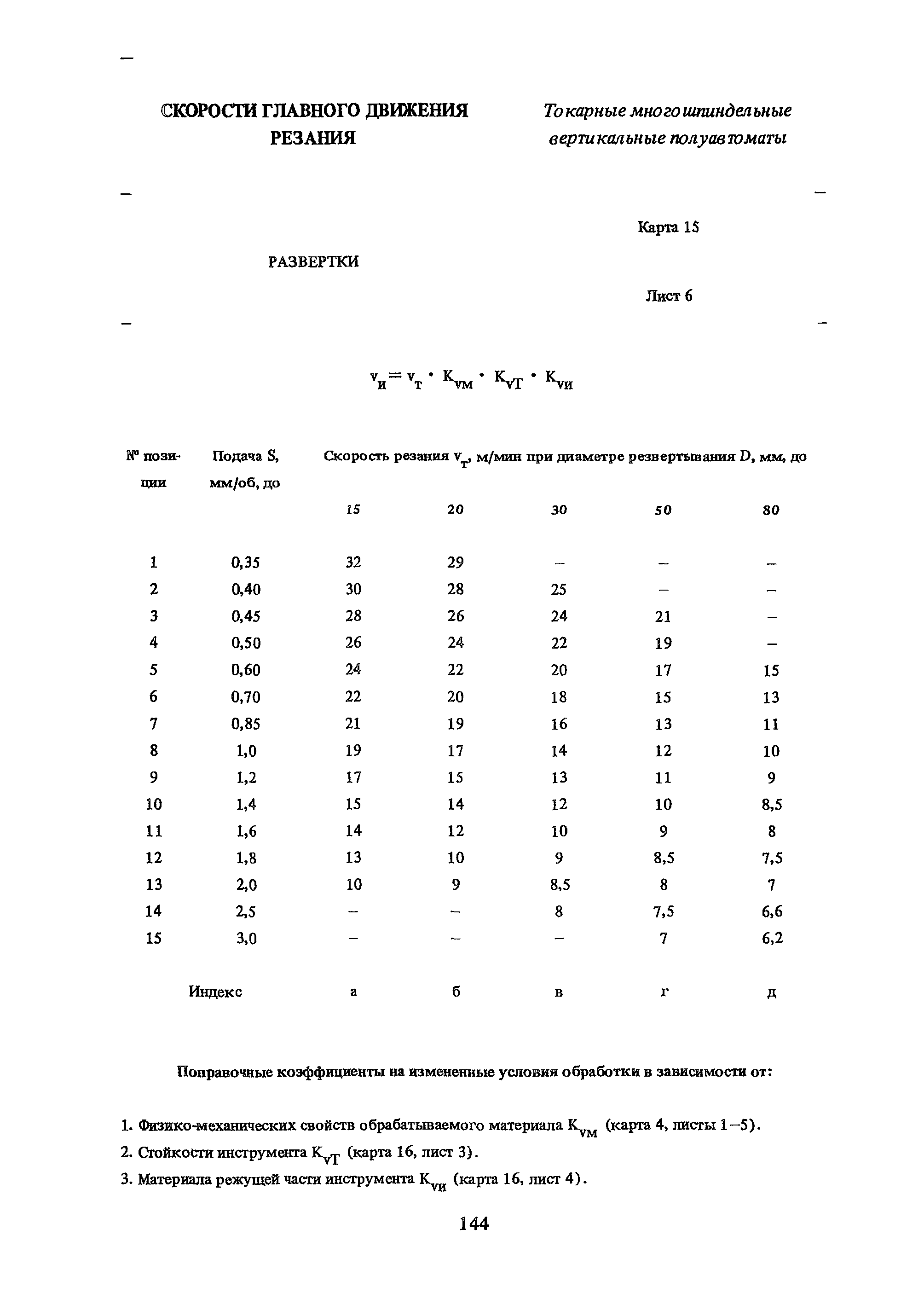| Оглавление: | Условные обозначения 1. Общая часть 1.1. Назначение и структура нормативов 1.2. Общие технологические условия 1.3. Нормативы режимов резания 1.4. Нормативы времени 2. Методические указания 2.1. Инструкция по расчету режимов резания и нормы времени дня токарных многошпиндельных горизонтальных патронных полуавтоматов 2.2. Инструкция по расчету режимов резания и нормы времени дня токарных многошпиндельных вертикальных полуавтоматов 2.3. Инструкция по расчету режимов резания и нормы времени дня токарно-револьверных полуавтоматов 2.4. Инструкция по расчету режимов резания, нормы времени дня автоматов продольного точения 3. Примеры расчета режимов резания и норм времени 3.1. Пример расчета режимов резания и нормы времени при обработке детали на токарном многошпиндельном горизонтальном патронном полуавтомате 3.2. Пример расчета режимов резания и норм времени при обработке детали на токарном многошпиндельном вертикальном полуавтомате 3.3. Пример расчета режимов резания и норм времени при обработке детали на токарно-револьверном полуавтомате 3.4. Пример расчета режимов резания и норм времени при обработке детали на автомате продольного точения 4. Нормативная часть 4.1. Общие технологические условия 4.2. Нормативы режимов резания 4.3. Нормативы времени Приложение 1. Величина подвода, врезания и перебега инструментов Приложение 2. Определение длины рабочего хода для автоматов продольного точения. Приложение 3. Расчет ожидаемой стойкости инструментов Приложение 4. Паспортные данные станков Листы 1 - 6. Модель 1Б240П-6К Листы 7 - 12. Модель 1283 Листы 13 - 17. Модель 1М425 Листы 18 - 27. Модель 1П16 (1П16А) х Приложение 5. Рекомендация по назначению плана обработки поверхности на токарных многошпиндельных автоматах и полуавтоматах |