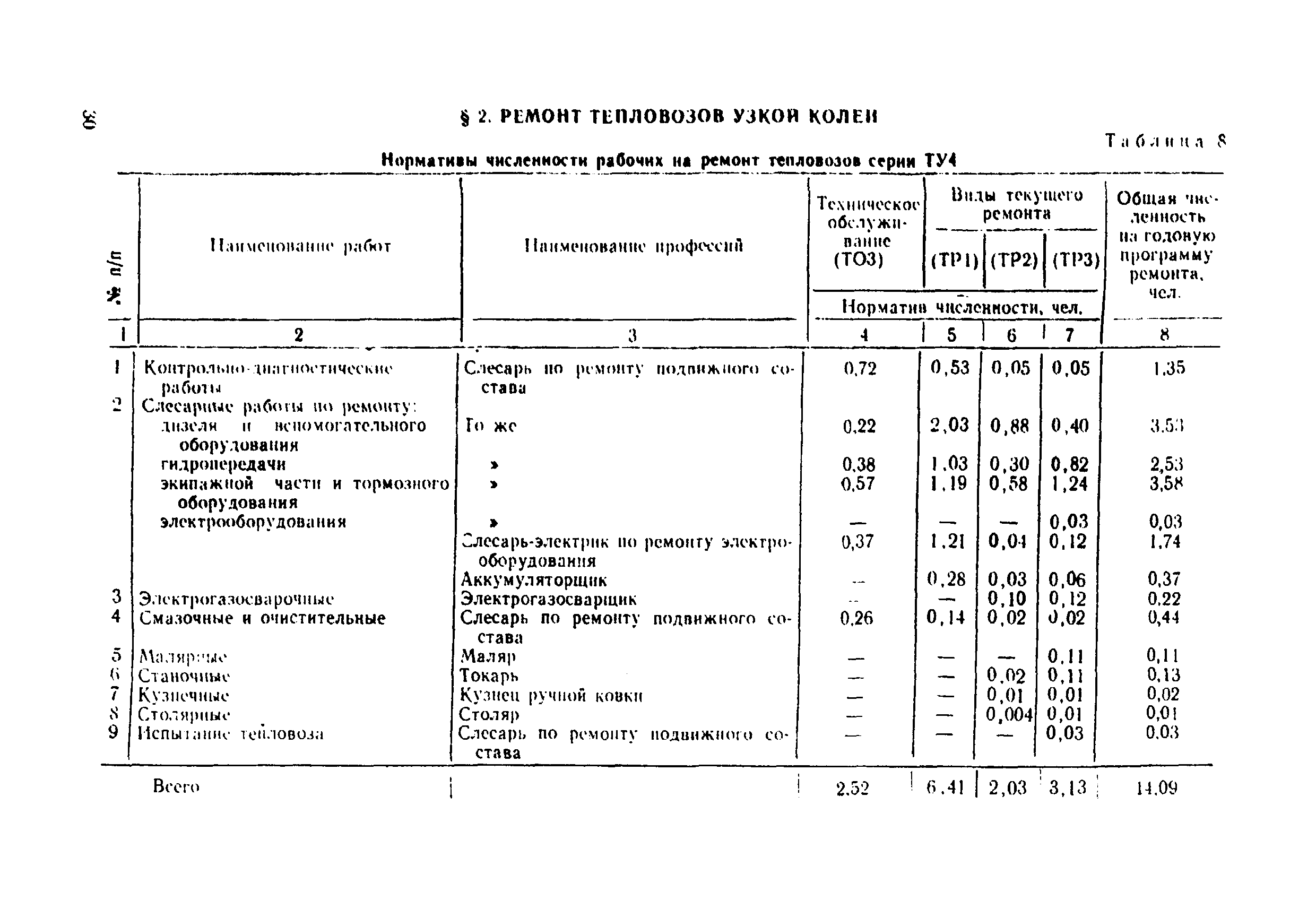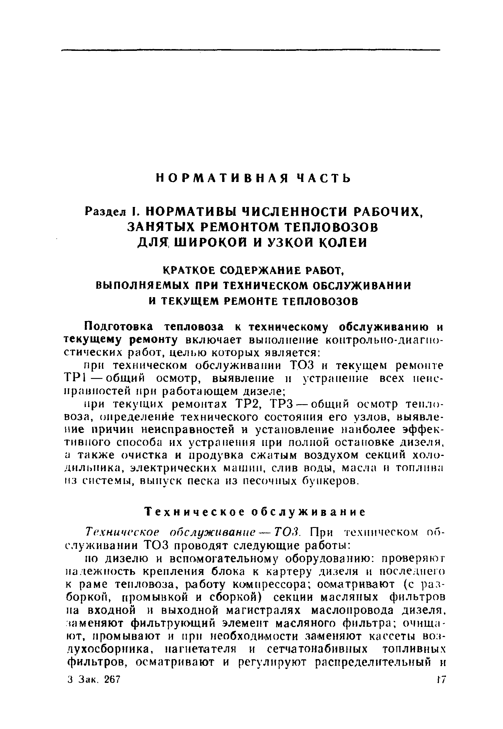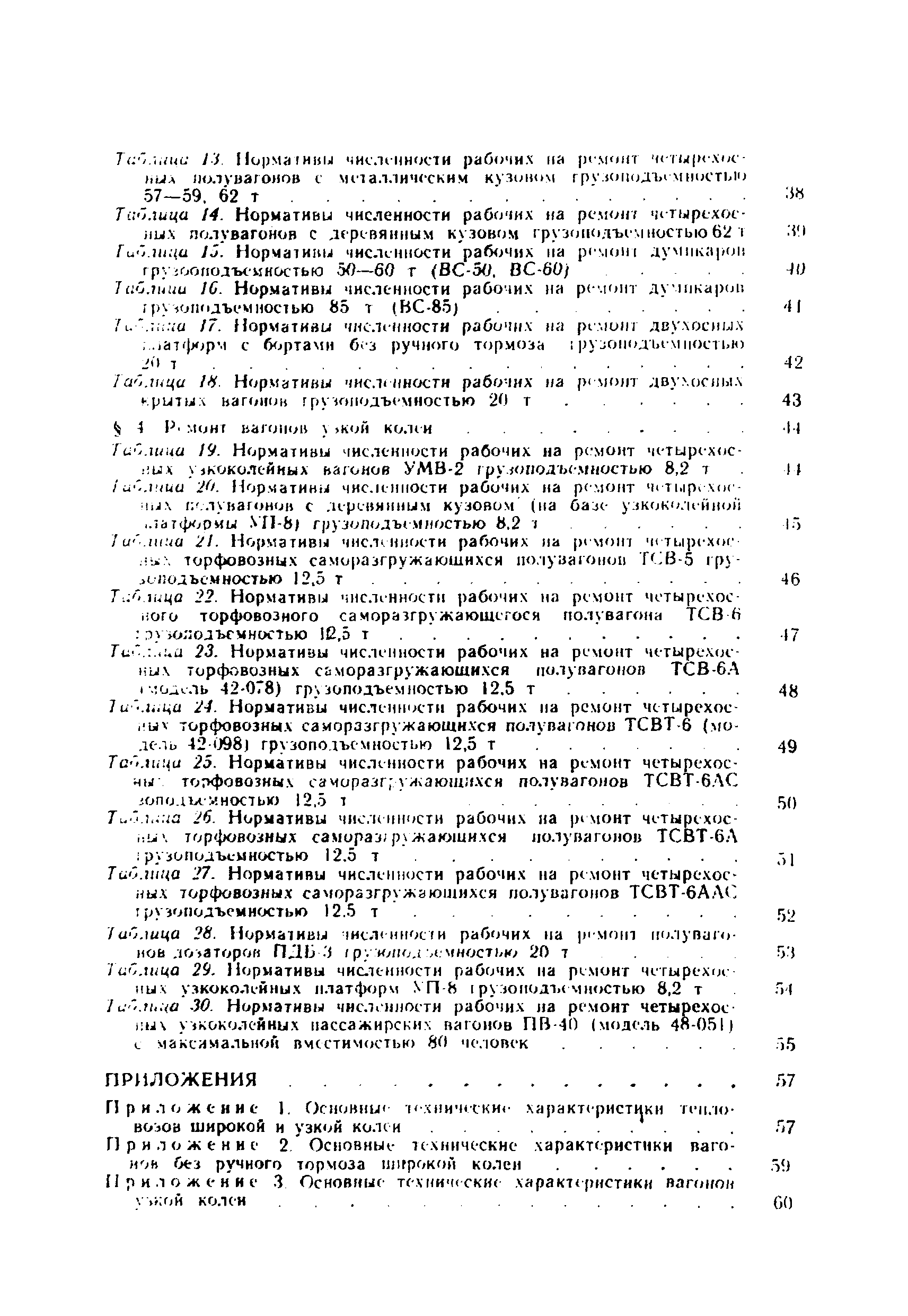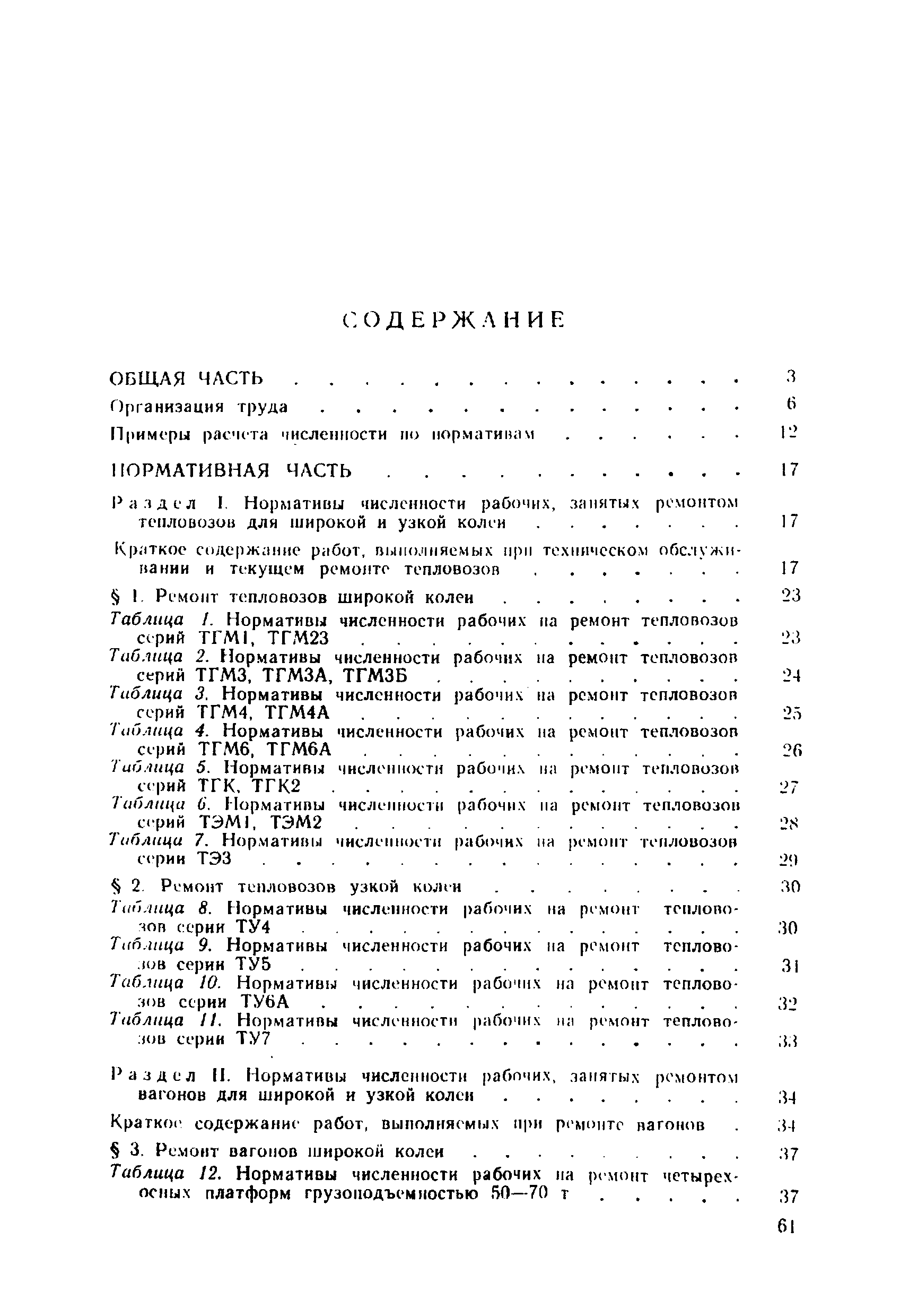 | Оглавление: | Общая часть Организация труда Примеры расчета численности по нормативам Нормативная часть Раздел 1. Нормативы численности рабочих, занятых ремонтом тепловозов для широкой и узкой колеи Краткое содержание работ, выполняемых при техническом обслуживании и текущем ремонте тепловозов Ремонт тепловозов широкой колеи Ремонт тепловозов узкой колеи Раздел 2. Нормативы численности рабочих, занятых ремонтом вагонов для широкой и узкой колеи Краткое содержание работ, выполняемых при ремонте вагонов Ремонт вагонов широкой колеи Ремонт вагонов узкой колеи Приложение 1. Основные технические характеристики тепловозов широкой и узкой колеи Приложение 2. Основные технические характеристики вагонов без ручного тормоза широкой колеи Приложение 3. Основные технические характеристики вагонов узкой колеи |