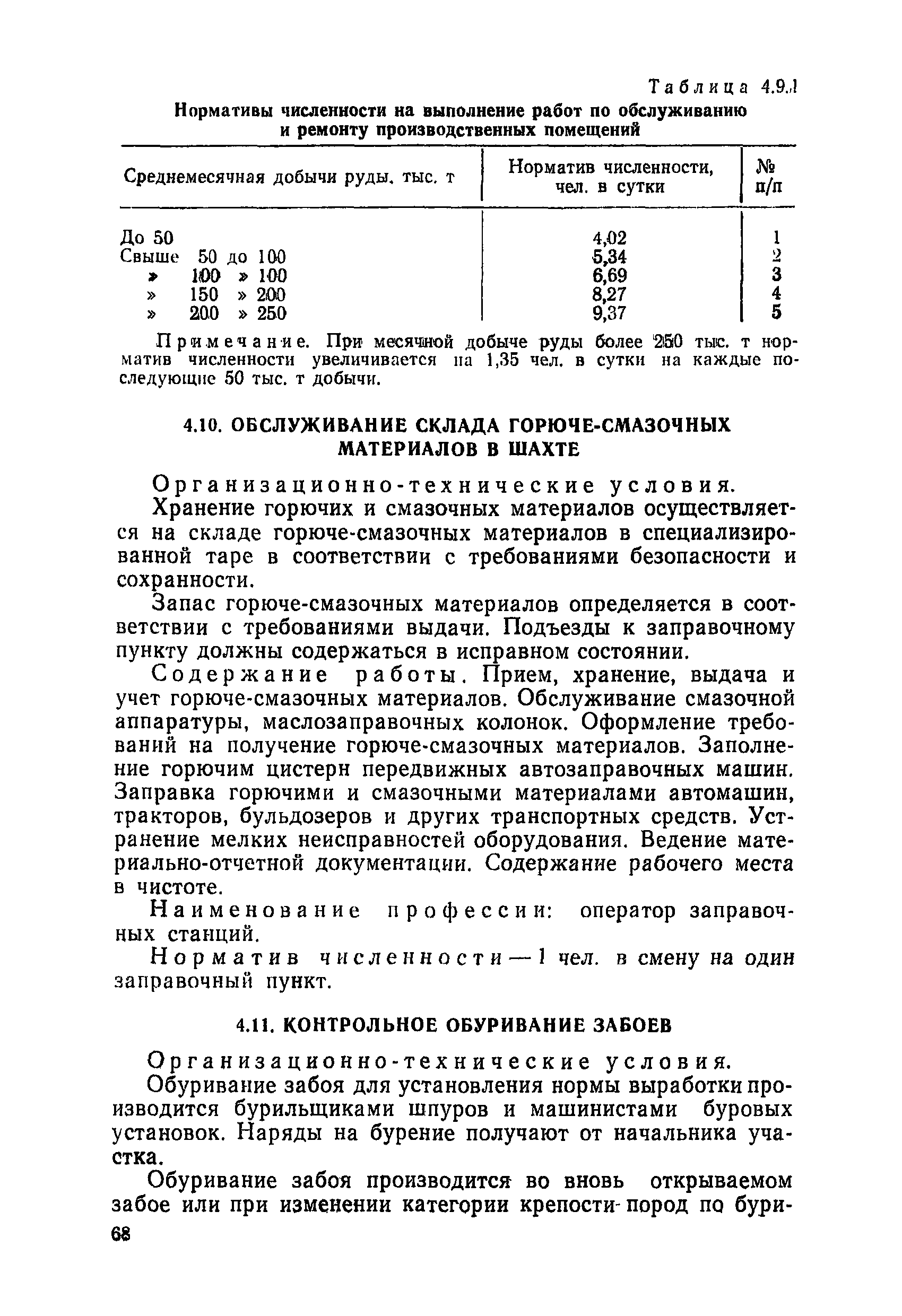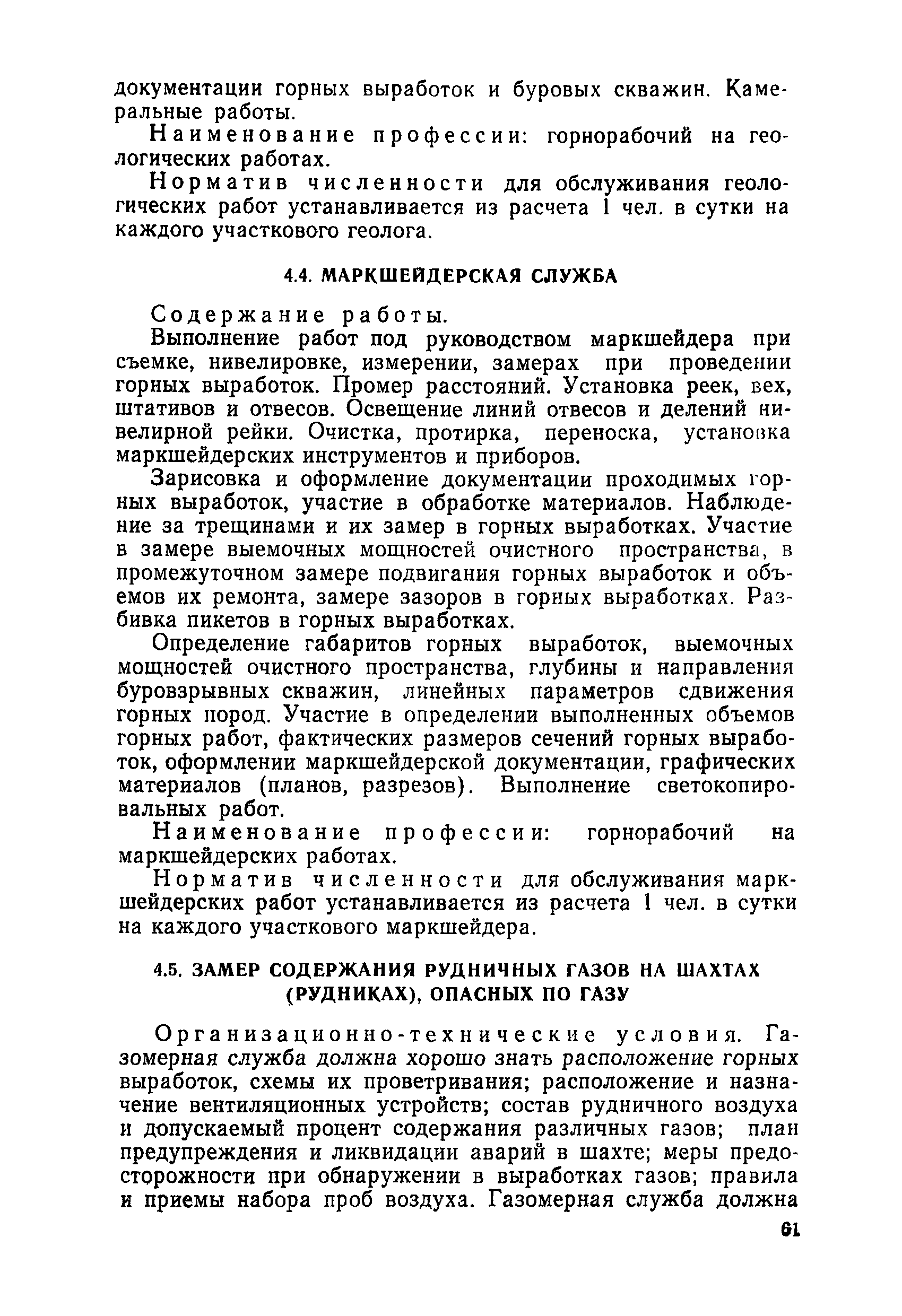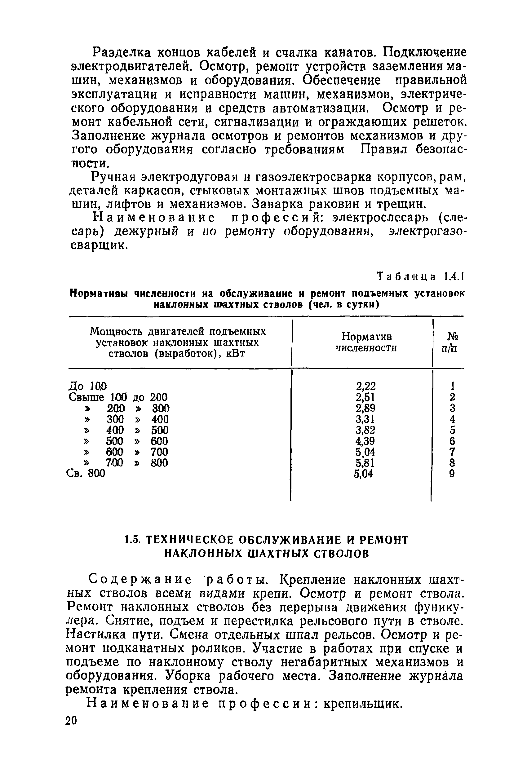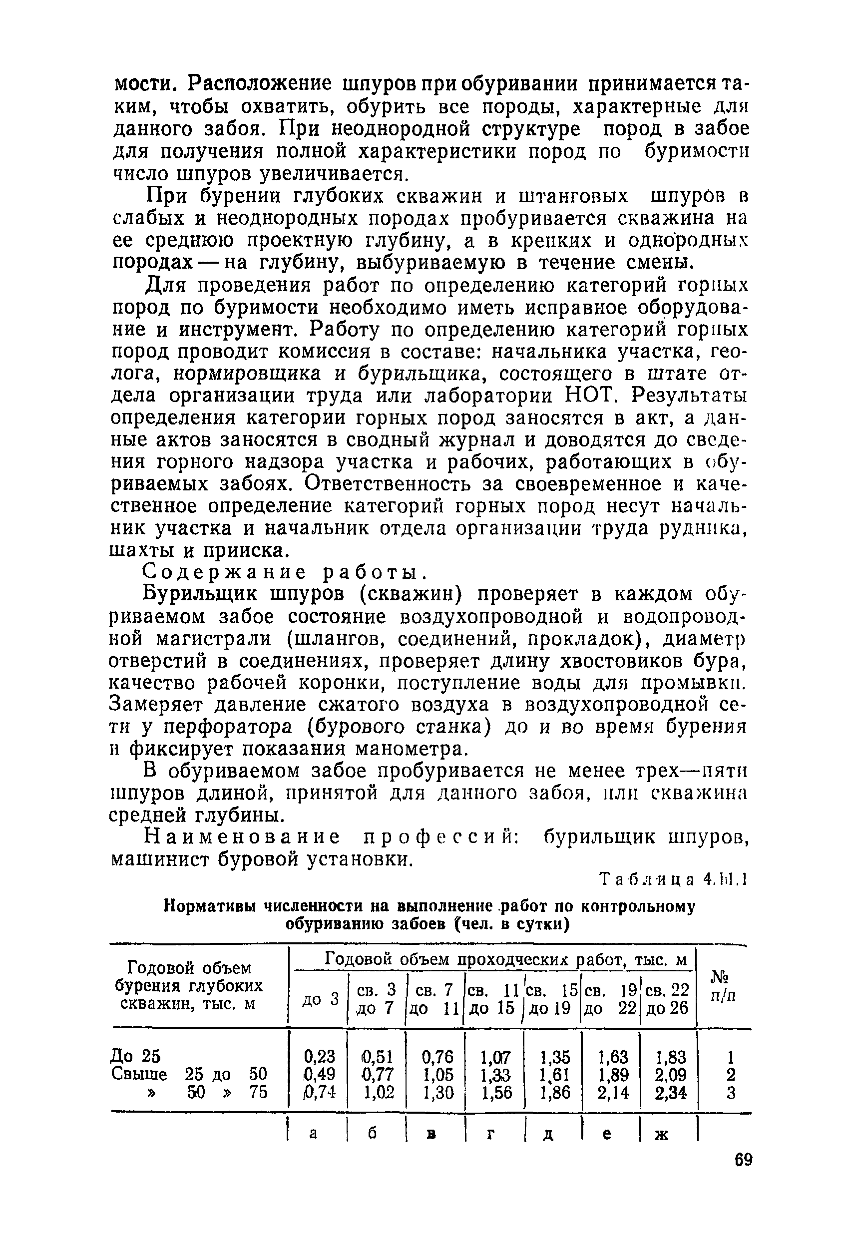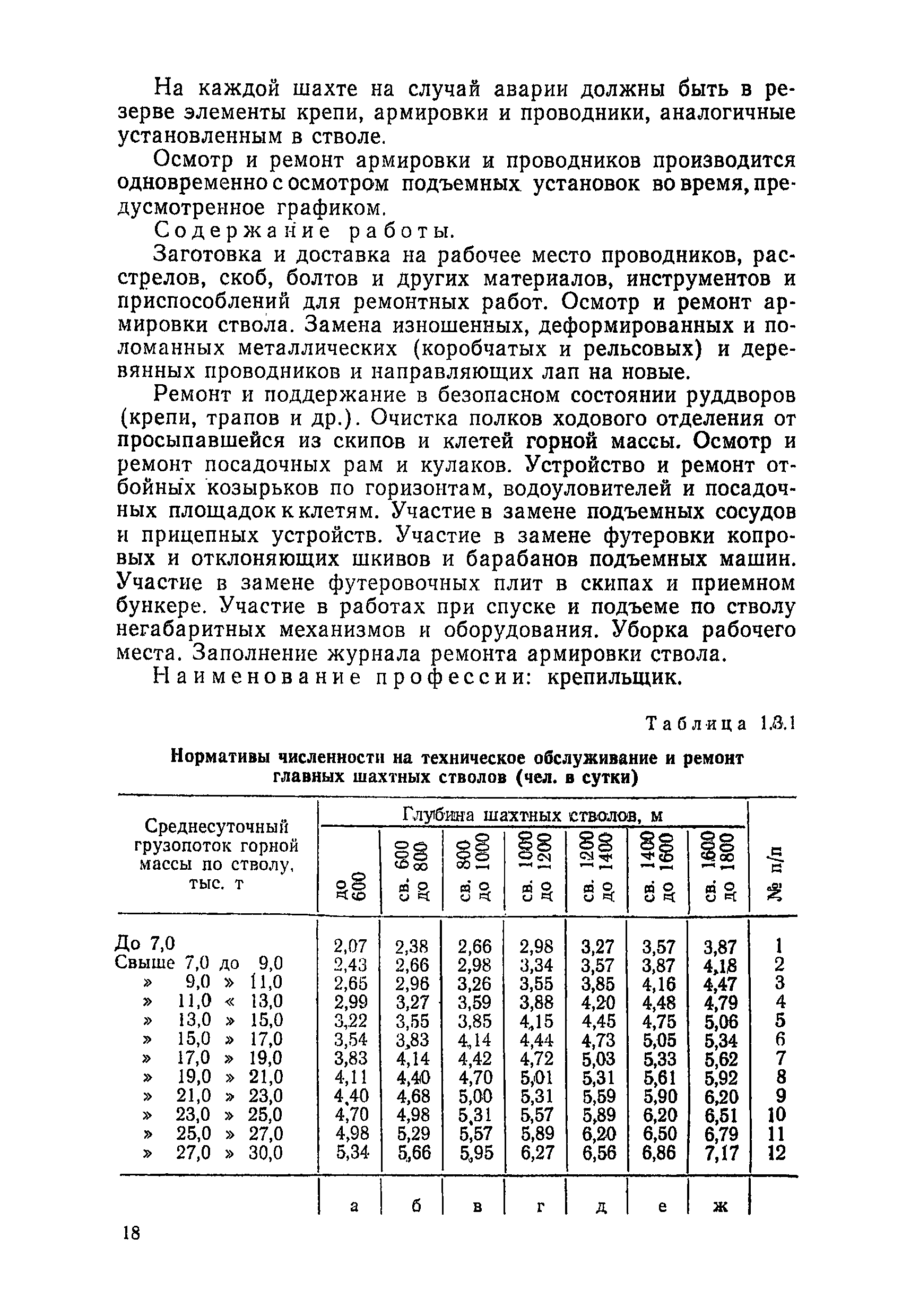 Нормативы численности рабочих, занятых обслуживанием и подготовкой производства на подземных горных работах| Статус: | не определен законодательством | | Название рус.: | Нормативы численности рабочих, занятых обслуживанием и подготовкой производства на подземных горных работах | | Дата добавления в базу: | 01.10.2014 | | Дата актуализации: | 01.01.2021 | | Область применения: | В сборнике содержатся нормативы численности на техническое внутрисменное обслуживание, плановый профилактический осмотр и текущий ремонт участкового и общешахтного оборудования. Нормативы сборника предназначены для определения численности рабочих, занятых обслуживанием и подготовкой производства на подземных горных работах, и их расстановки по рабочим местам, а также для составления нормировочных заданий. Настоящими нормативами могут пользоваться плановые и проектные организации. | | Оглавление: | Общая часть Нормативная часть 1. Электромеханическая служба 1.1. Техническое обслуживание, ремонт оборудования в шахте (руднике) 1.2. Техническое обслуживание и ремонт подъемных установок шахтных стволов 1.3. Техническое обслуживание н ремонт шахтных стволов 1.4. Техническое обслуживание и ремонт подъемных установок наклонных шахтных стволов 1.5. Техническое обслуживание и ремонт наклонных шахтных стволов 1.6. Техническое обслуживание и ремонт шахтных электровозов 1.7. Техническое обслуживание и ремонт шахтных вагонов 1.8. Техническое обслуживание и ремонт контактной сети 1.9. Техническое обслуживание и ремонт трубопроводов общешахтного назначения 1,10. Техническое обслуживание и ремонт погрузочных устройств 1.11. Зарядка батарей аккумуляторных электровозов 1.12. Техническое обслуживание и ремонт систем сигнализации, централизации и блокировки (СЦБ) 1.13. Техническое обслуживание и ремонт телефонной, селекторной и высокочастотной связи 1.14. Обслуживание телефонной станции ручной системы 2. Управление машинами и механизмами 2.1. Управление подъемными машинами 2.2. Управление и обслуживание опрокидывателей, толкателей, маневровых лебедок, прием и контроль качества рудной массы в шахте и на поверхности 2.3. Управление питателями и дробилками в шахте 2.4. Обслуживание дозаторных устройств для загрузки скипов 2.5. Управление вентиляторами 2.6. Управление насосами шахтного (рудничного) водоотлива и обслуживание электроподстанций и преобразовательных установок 2.7. Управление компрессорами 2.8. Управление лебедками в шахте и на поверхности 2.9. Управление конвейерами 2.10. Зачистка откаточных выработок погрузочными машинами 2.11. Зачистка горных выработок и разработка выпускных воронок на добыче скреперными лебедками 30ЛС-2С и 17ЛС-2С 2.12. Управление мостовыми кранами 3. Транспортирование грузов и перевозка людей 3.1. Перевозка людей и материалов в шахте 3.2. Доставка взрывчатых материалов на поверхности шахты (рудника) и в шахте (руднике) 3.3. Доставка крепежных материалов (песка, цемента, гравия, лесоматериалов) и оборудования в шахту (рудник) 3.4. Прием и выдача грузов у ствола в шахте и на поверхности 3.5. Обслуживание породных отвалов 3.6. Содержание и ремонт путевого хозяйства 3.7. Содержание и ремонт общешахтных выработок 4. Работы по хозяйственному обслуживанию шахт и рудников, прочие работы 4.1. Выдача и хранение взрывчатых материалов (ВМ) на подземном складе 4.2. Обслуживание инструментальных кл