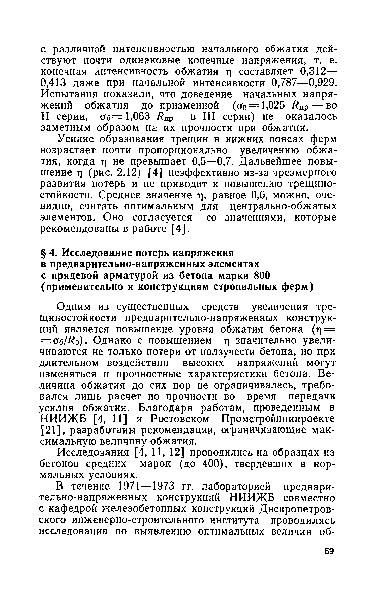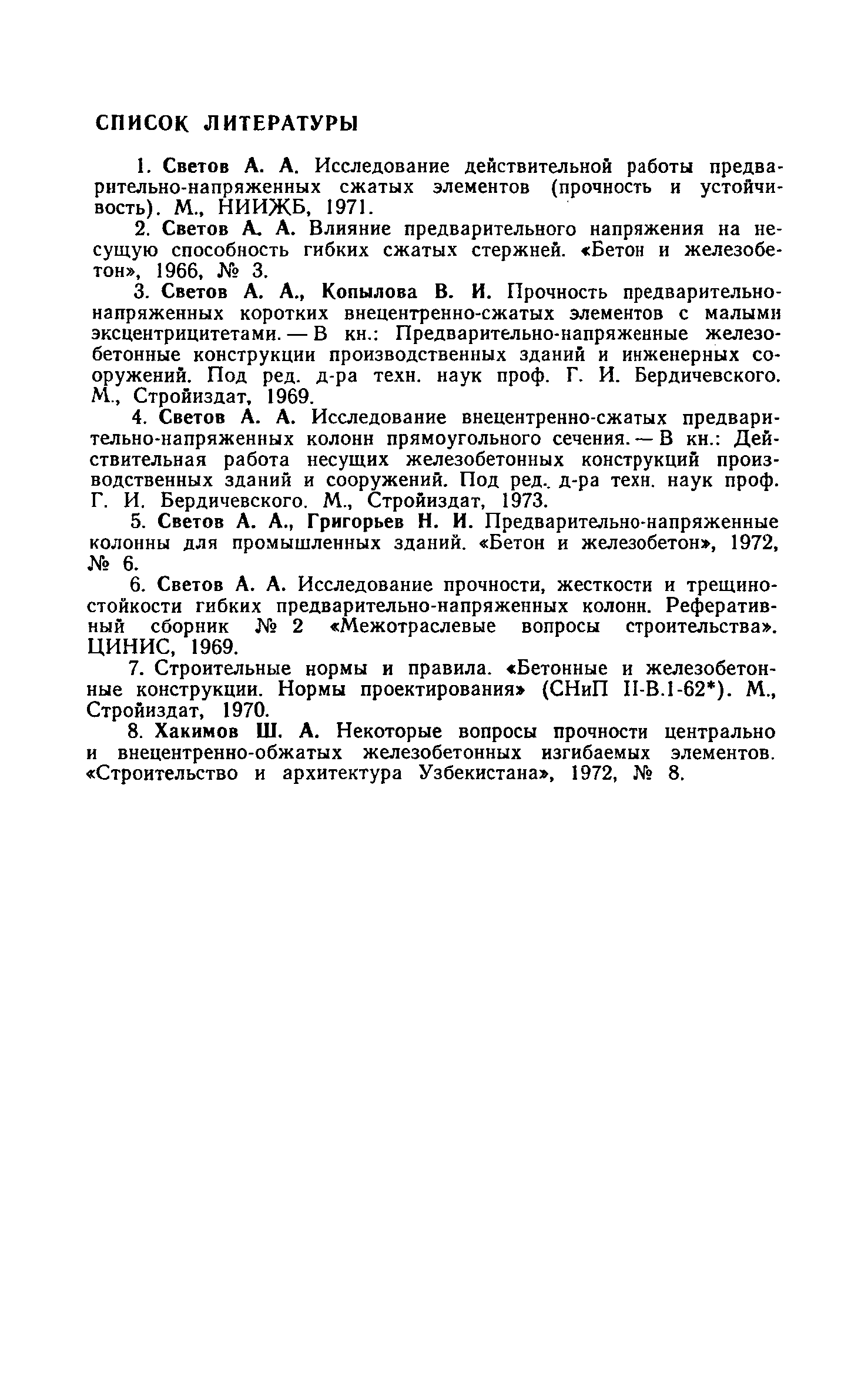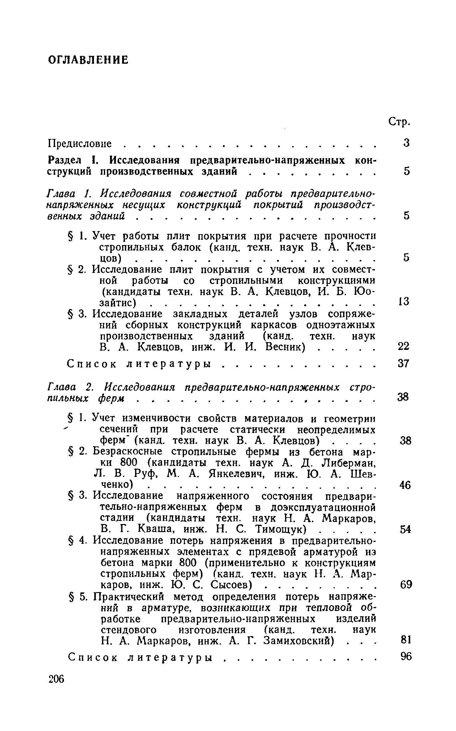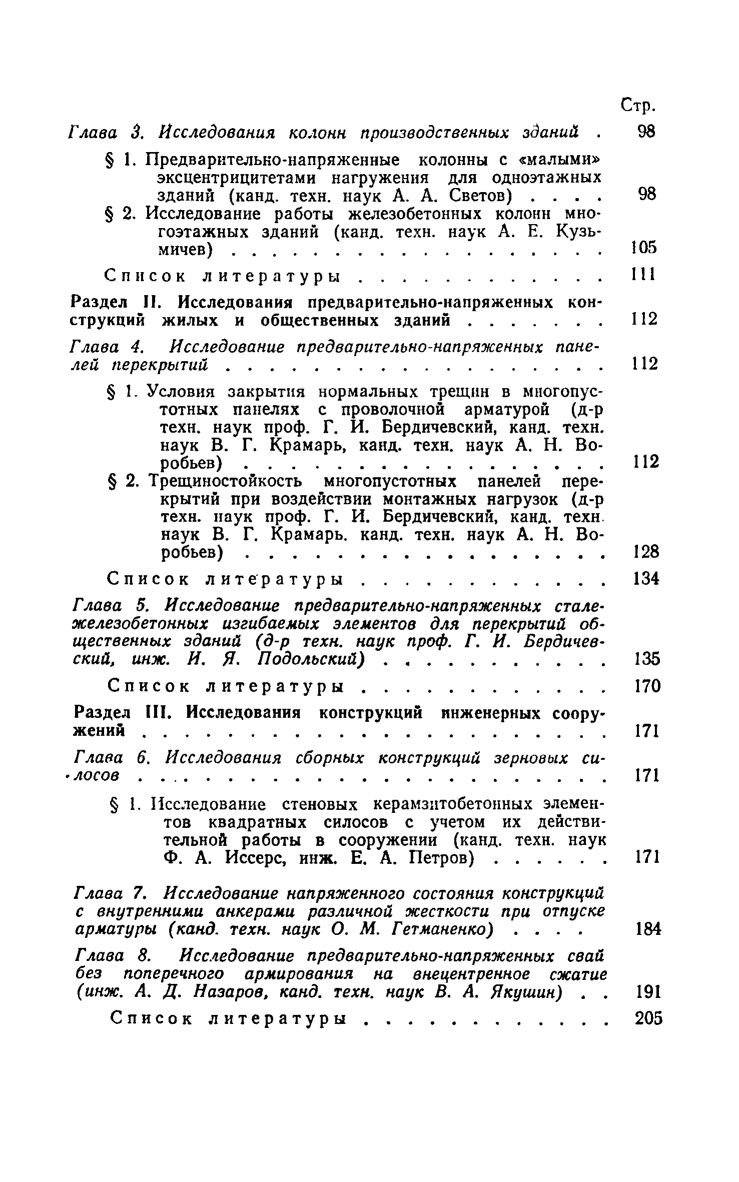 | Оглавление: | Предисловие Раздел I. Исследования предварительно-напряженных конструкций производственных зданий Глава 1. Исследования совместной работы предварительно-напряженных несущих конструкций покрытий производственных зданий § 1. Учет работы плит покрытия при расчете прочности стропильных балок § 2. Исследование плит покрытия с учетом их совместной работы со стропильными конструкциями § 3. Исследование закладных деталей узлов сопряжений сборных конструкций каркасов одноэтажных производственных зданий Список литературы Глава 2. Исследования предварительно-напряженных стропильных ферм § 1. Учет изменчивости свойств материалов и геометрии сечений при расчете статически неопределимых ферм § 2. Исследование плит покрытия с учетом их совместной работы со стропильными конструкциями § 3. Исследование напряженного состояния предварительно-напряженных ферм в доэксплуатационной стадии § 4. Исследование потерь напряжения в предварительно напряжённых элементах с прядевой арматурой из бетона марки 800 (применительно к конструкциям стропильных ферм) § 5. Практический метод определения потерь напряжений в арматуре, возникающих при тепловой обработке предварительно-напряженных изделий стендового изготовления Список литературы Глава 2. Исследования колонн производственных зданий . § 1. Предварительно-напряженные колонны с малыми эксцентриситетами нагруженная для одноэтажных зданий § 2. Исследование работы железобетонных колонн многоэтажных зданий Список литературы Раздел II. Исследования предварительно-напряженных конструкций жилых и общественных зданий Глава 4. Исследование предварительно-напряженных панелей перекрытий § 1. Условия закрытия нормальных трещин в многопустотных панелях с проволочной арматурой § 2. Трещиностойкость многопустотных панелей перекрытий при воздействии монтажных нагрузок Список литературы Глава 5. Исследование предварительно-напряженных сталежелезобетонных изгибаемых элементов для перекрытий общественных зданий Список литературы Раздел III. Исследования конструкций инженерных сооружений Глава 6. Исследования сборных конструкций зерновых силосов § 1. Исследование стеновых керамзитобетонных элементов квадратных силосов с учетом их действительной работы в сооружении Глава 7. Исследование напряженного состояния конструкций с внутренними анкерами различной жесткости при отпуске арматуры Глава 8. Исследование предварительно-напряженных свай без поперечного армирования на внецентренное сжатие Список литературы |