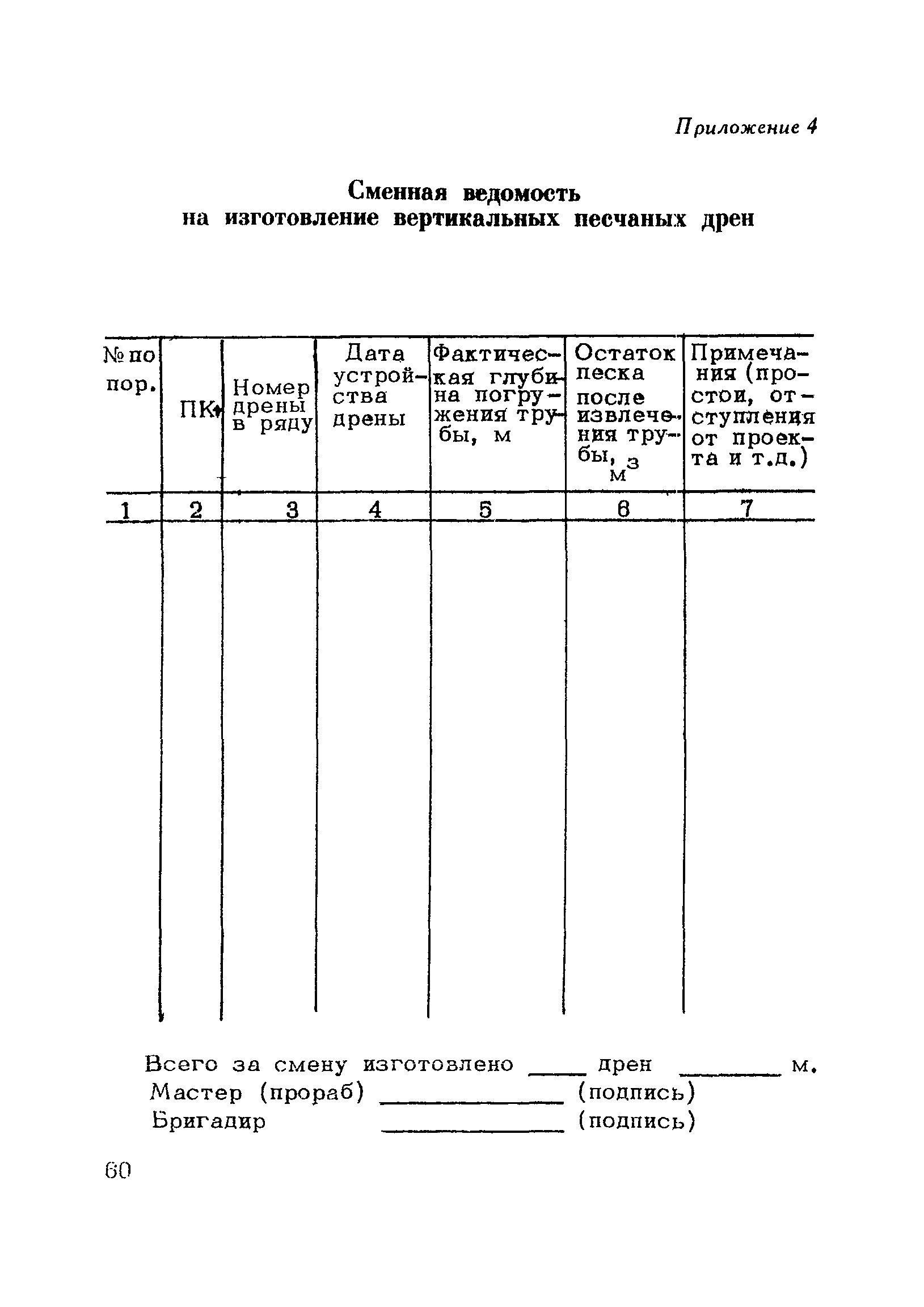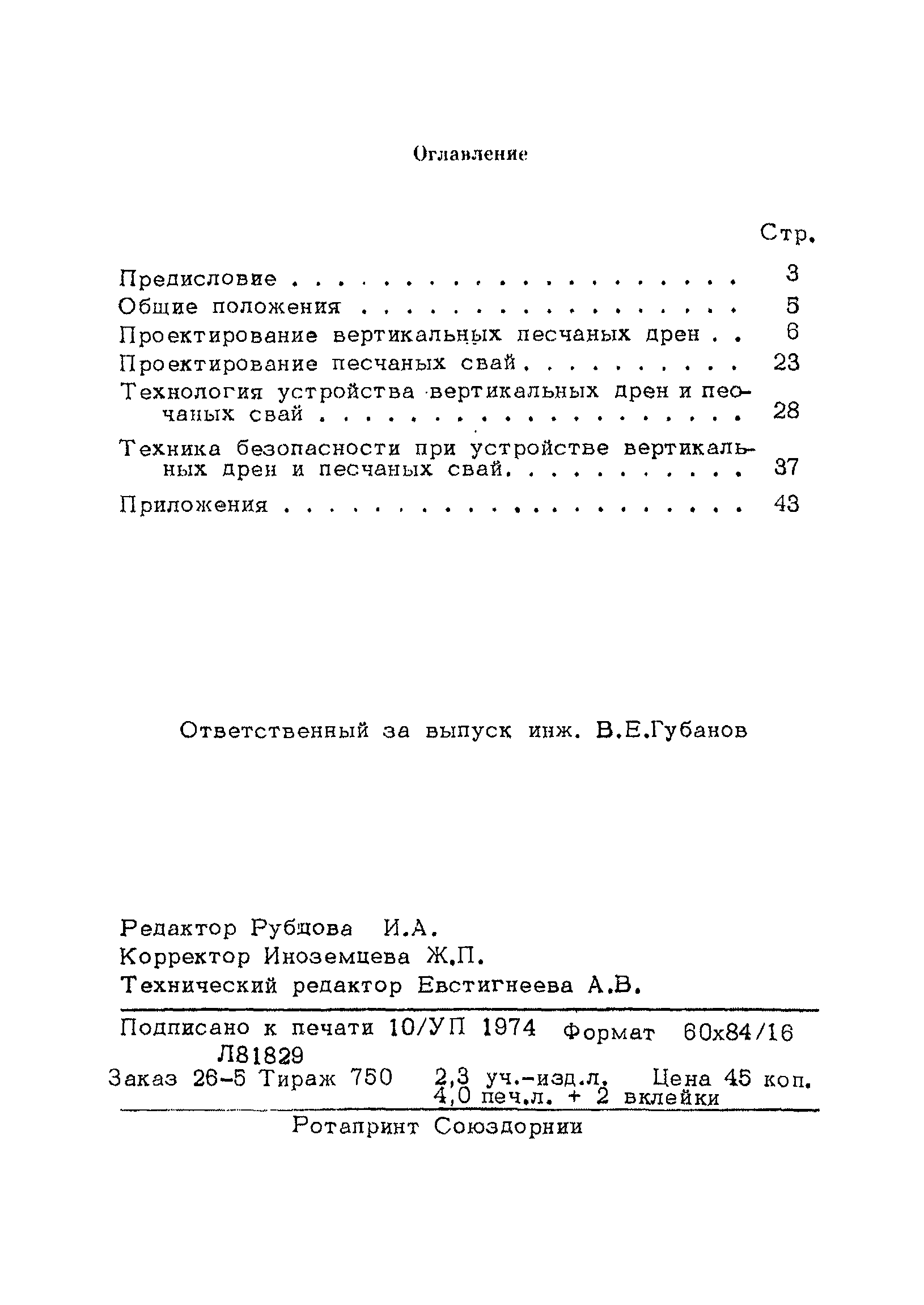 | Оглавление: | Предисловие Общие положения Проектирование вертикальных песчаных арен Проектирование песчаных свай Технологии устройства вертикальных арен и песчаных свай Техника безопасности при устройстве вертикальных арен и песчаных свай Приложение 1. Примеры расчета Приложение 2. Таблицы для расчета оснований с песчаными сваями Приложение 3. Форма журнала производства работ по устройству вертикальных дрен (свай) Приложение 4. Сменная ведомость на изготовление вертикальных песчаных дрен |