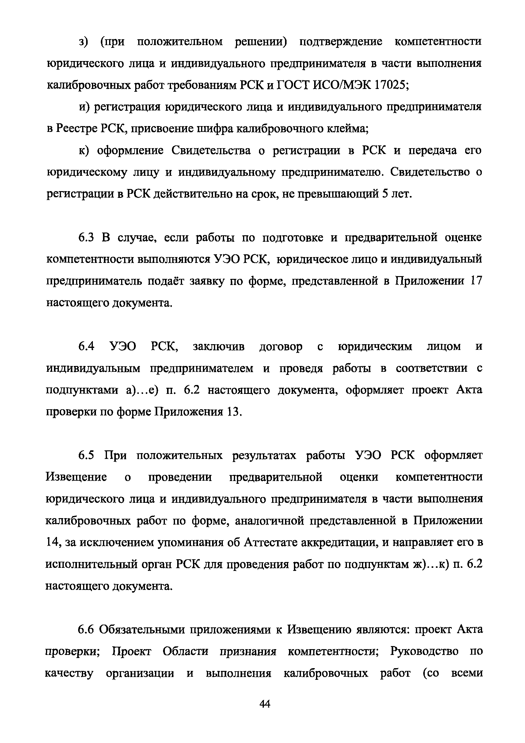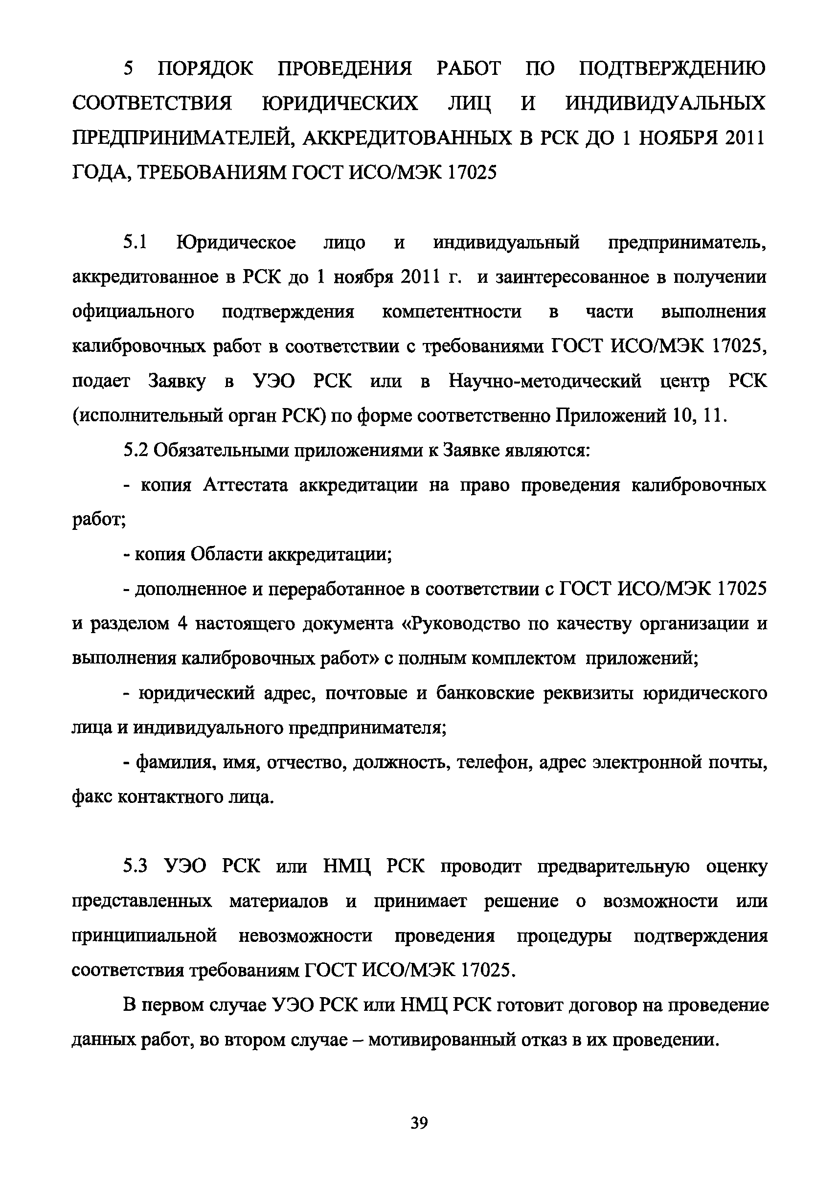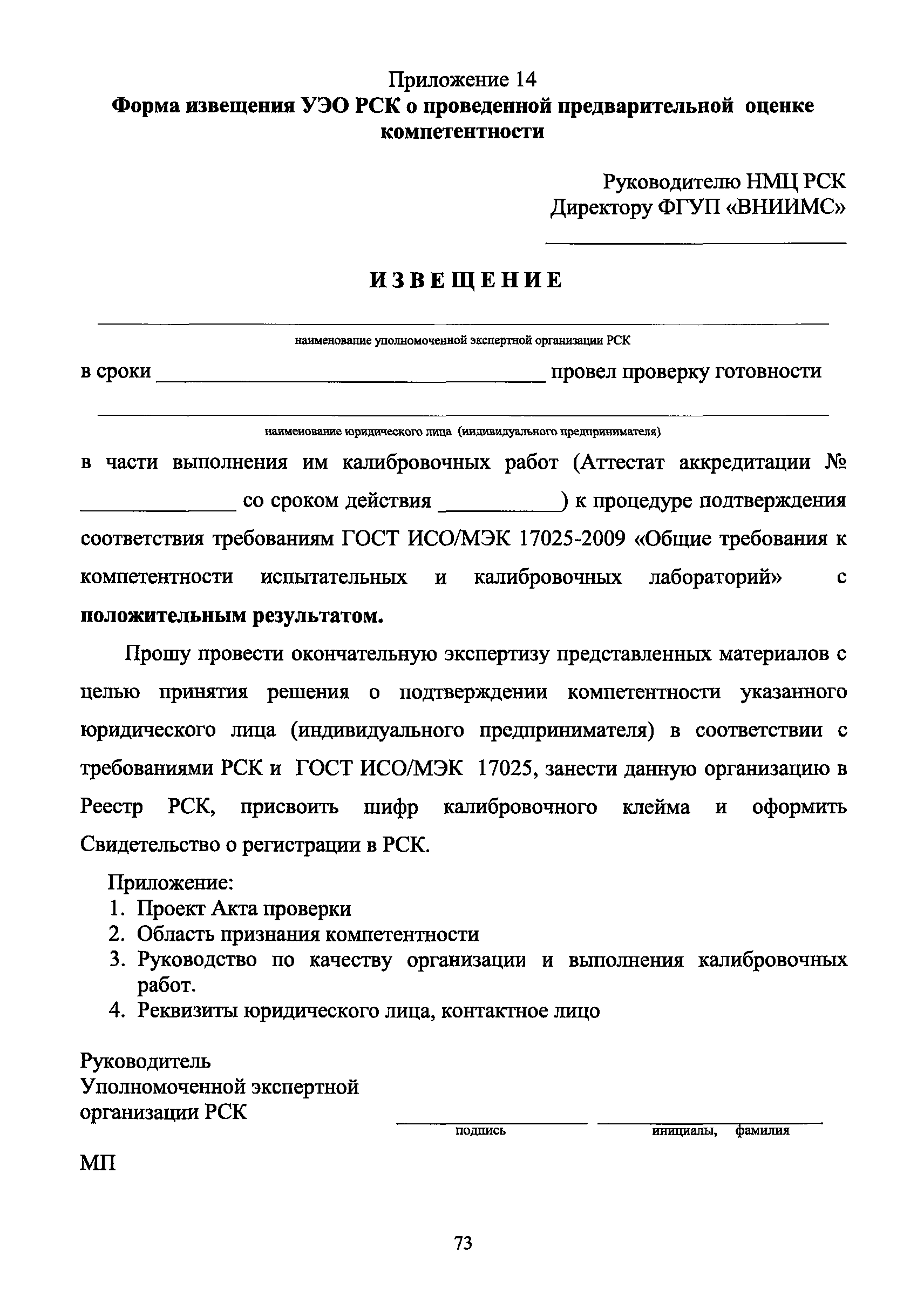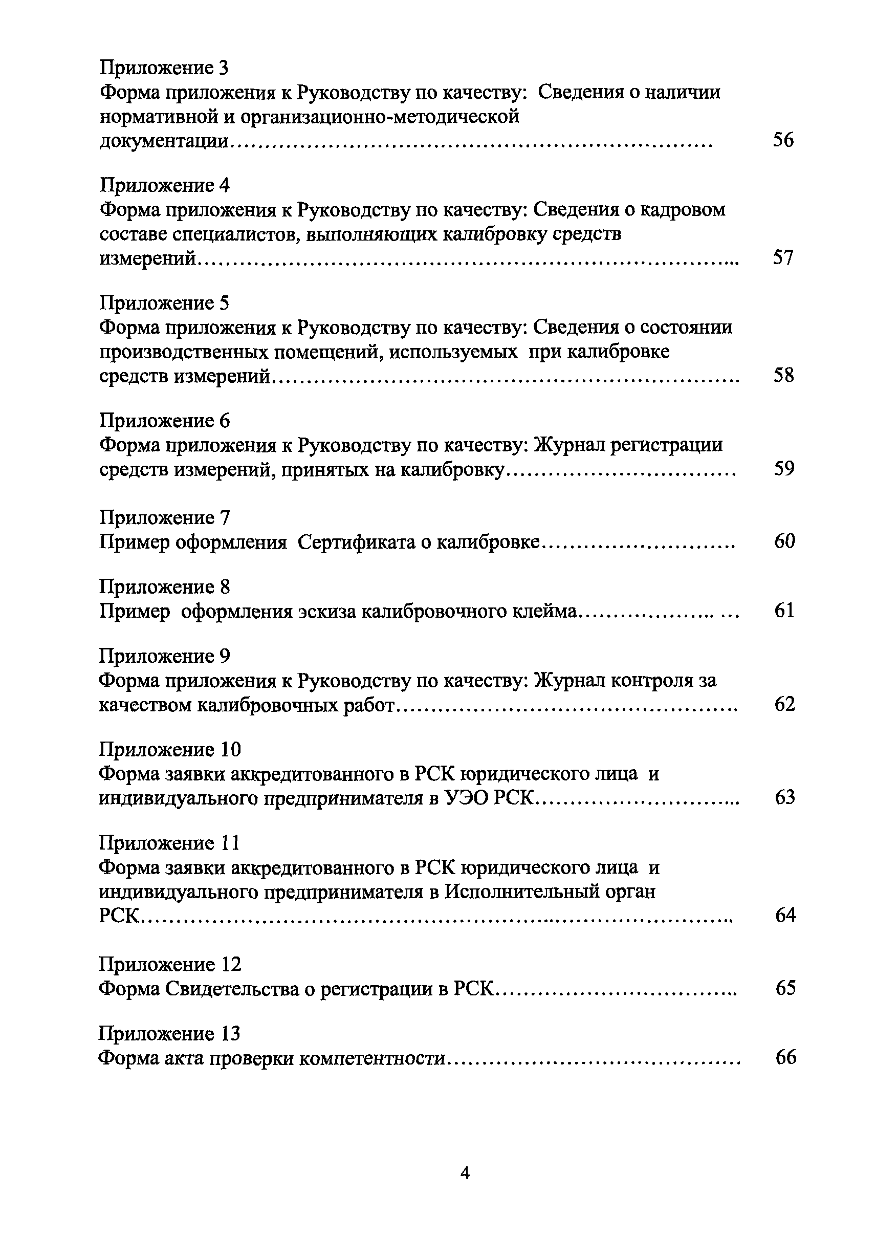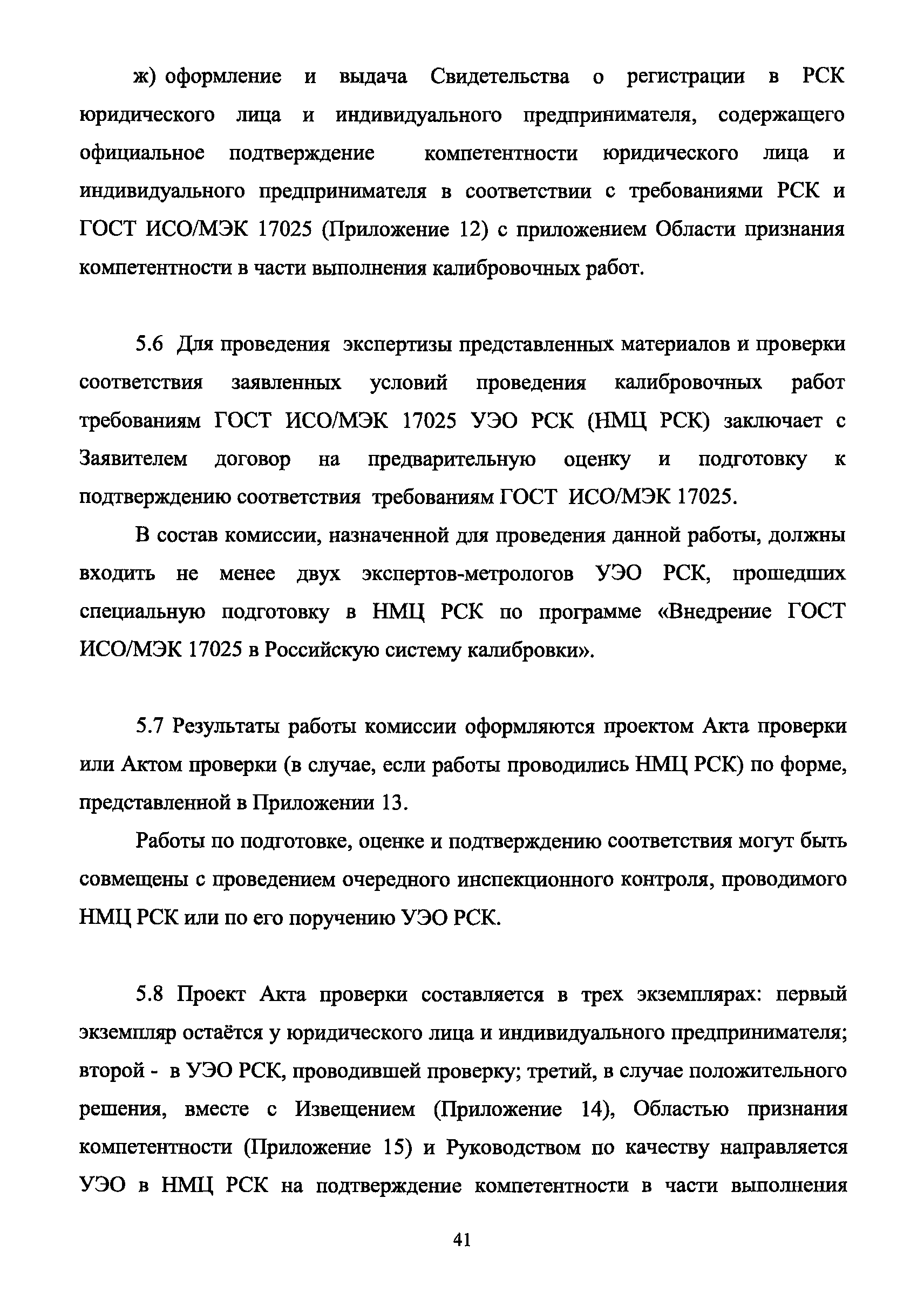 | Оглавление: | 1 Введение 2 Общие положения 3 Основные требования к юридическим лицам и индивидуальным предпринимателям, претендующим на подтверждение соответствия требованиям РСК И ГОСТ ИСО/МЭК 17025 4 Построение и содержание "Руководства по качеству организации и выполнения калибровочных работ" 5 Порядок проведения работ по подтверждению соответствия юридических лиц и индивидуальных предпринимателей, аккредитованных в РСК до 1 ноября 2011 г., требованиям ГОСТ ИСО/МЭК 17025 6 Порядок проведения работ по оценке и подтверждению компетентности юридических лиц и индивидуальных предпринимателей в части выполнения калибровочных работ в соответствии с требованиями РСК и ГОСТ ИСО/МЭК 17025 7 Инспекционный контроль за деятельностью юридических лиц и индивидуальных предпринимателей, зарегистрированных в Реестре РСК 8 Порядок регистрации в Российской системе калибровки юридических лиц и индивидуальных предпринимателей, аккредитованных в области обеспечения единства измерений на компетентность в выполнении работ по поверке средств измерений Библиография Приложение 1. Бланк Извещения о регистрации Уполномоченной экспертной организации РСК Приложение 2. Форма приложения к Руководству по качеству: Сведения о калибруемых средствах и средствах калибровки Приложение 3. Форма приложения к Руководству по качеству: Сведения о наличии нормативной и организационно-методической документации Приложение 4. Форма приложения к Руководству по качеству: Сведения о кадровом составе специалистов, выполняющих калибровку средств измерений Приложение 5. Форма приложения к Руководству по качеству: Сведения о состоянии производственных помещений, используемых при калибровке средств измерений Приложение 6. Форма приложения к Руководству по качеству: Журнал регистрации средств измерений, принятых на калибровку Приложение 7. Пример оформления Сертификата о калибровке Приложение 8. Пример оформления эскиза калибровочного клейма Приложение 9. Форма приложения к Руководству по качеству: Журнал контроля за качеством калибровочных работ Приложение 10.Форма заявки аккредитованного в РСК юридического лица и индивидуального предпринимателя в УЭО РСК Приложение 11. Форма заявки аккредитованного в РСК юридического лица и индивидуального предпринимателя в Исполнительный орган РСК Приложение 12. Форма Свидетельства о регистрации в РСК Приложение 13. Форма акта проверки компетентности Приложение 14. Форма извещения УЗО РСК о проведенной предварительной оценке компетентности Приложение 15. Область признания компетентности в части выполнения калибровочных работ Приложение 16. Форма заявки о регистрации в РСК юридического лица и индивидуального предпринимателя в Исполнительный орган РСК Приложение 17. Форма заявки о регистрации в РСК юридического лица и индивидуального предпринимателя в УЭО РСК Приложение 18. Форма Уведомления о проведении инспекционного контроля Приложение 19. Форма Извещения об аннулирования (приостановлении действия). Свидетельства о регистрации в РСК Приложение 20. Форма заявки о регистрации в РСК юридического лица и индивидуального предпринимателя, аккредитованного в области обеспечения единства измерений на компетентность в выполнении работ по поверке средств измерений Приложение 21. Форма Свидетельства о регистрации в РСК юридич