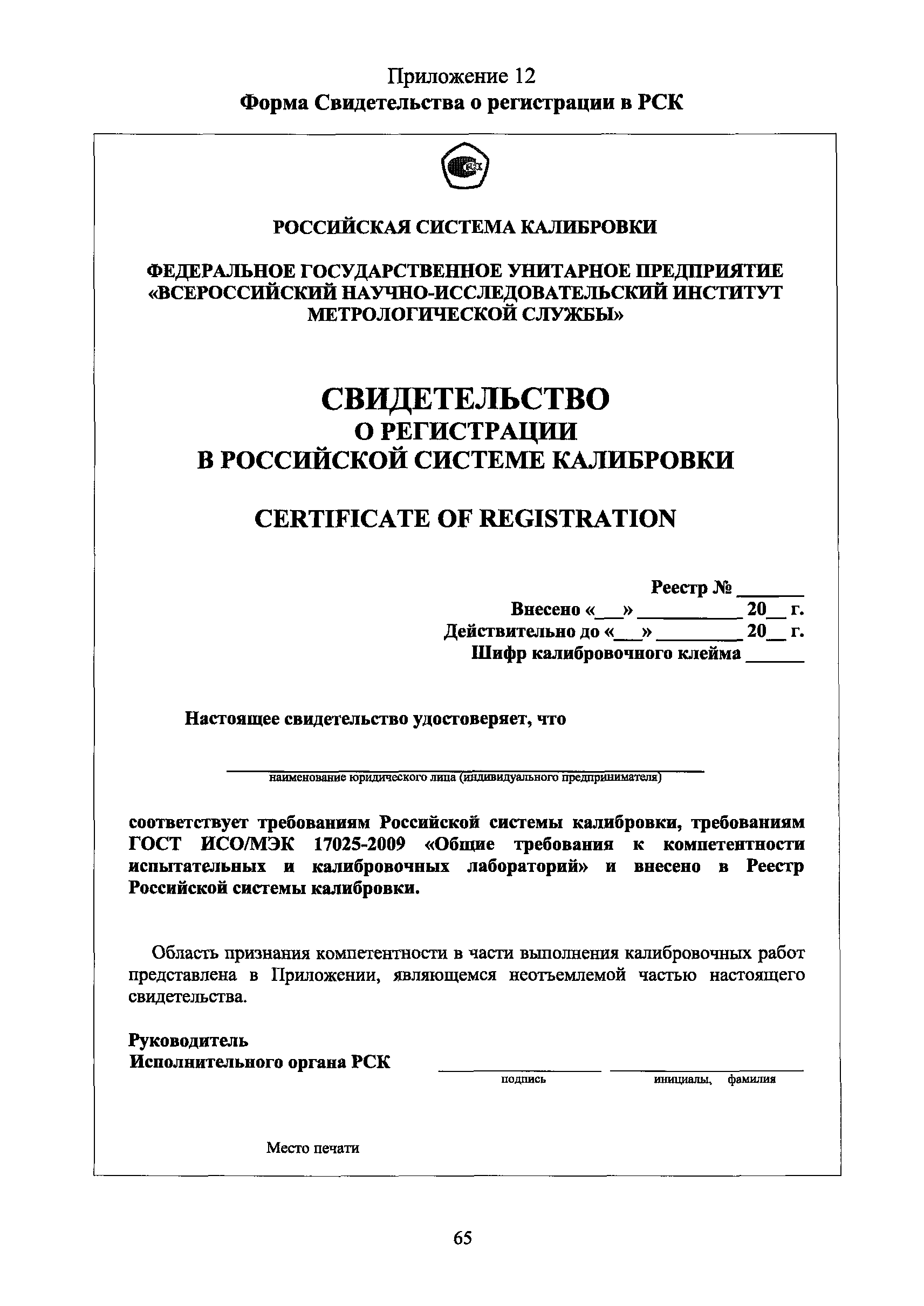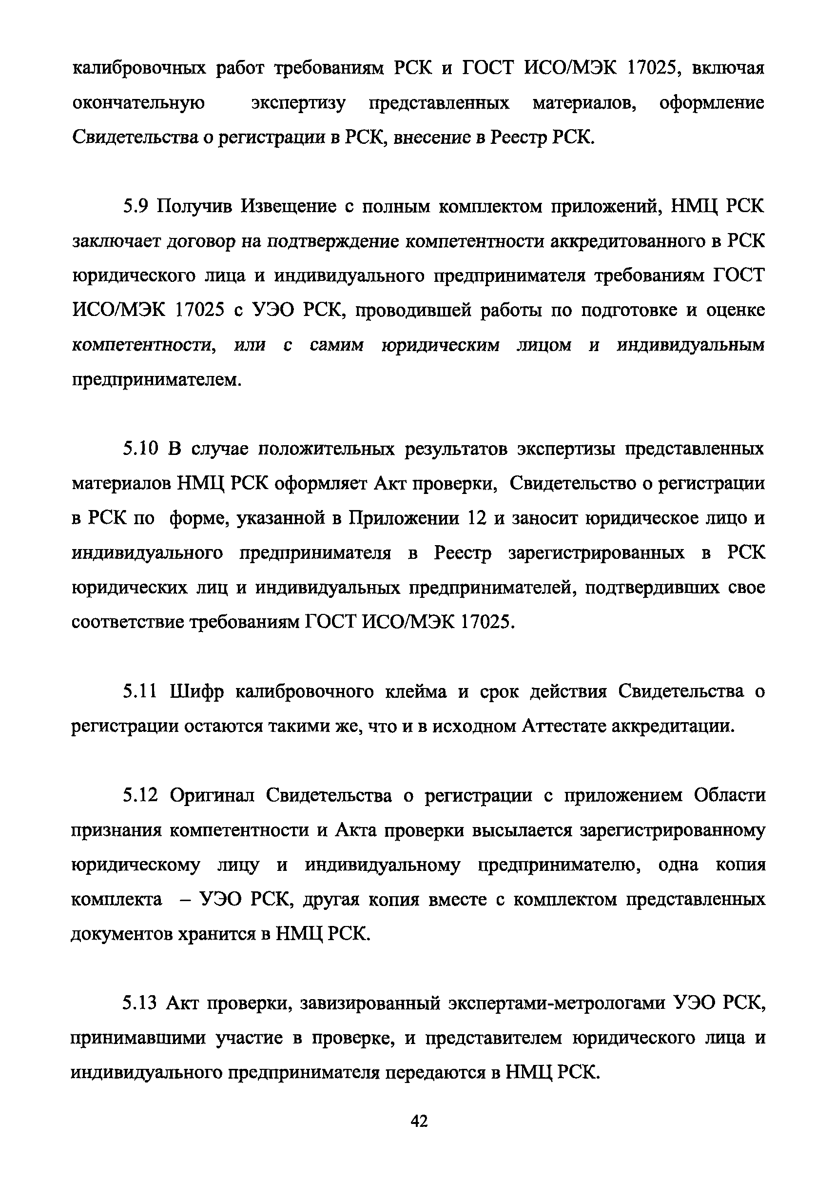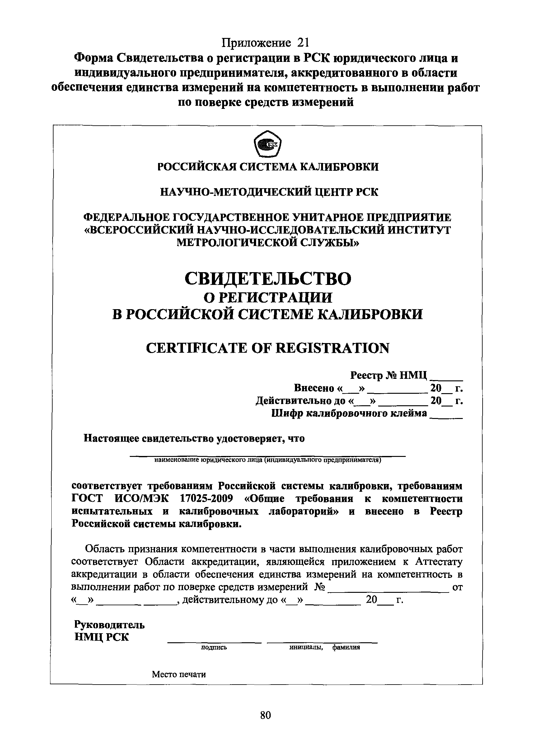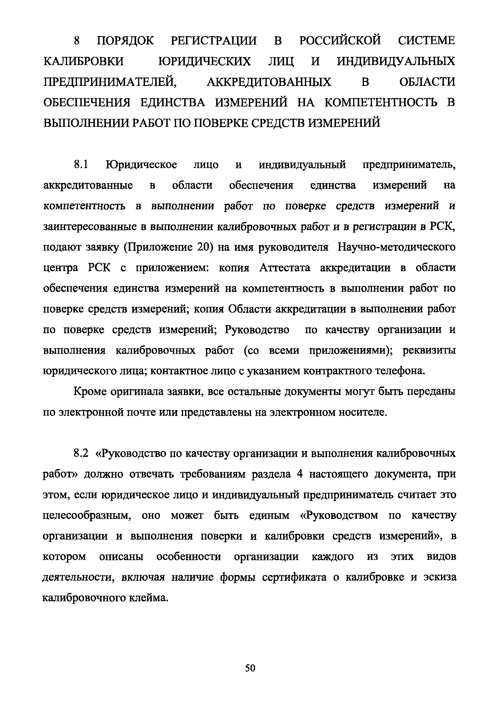 | Оглавление: | 1 Введение 2 Общие положения 3 Основные требования к юридическим лицам и индивидуальным предпринимателям, претендующим на подтверждение соответствия требованиям РСК И ГОСТ ИСО/МЭК 17025 4 Построение и содержание "Руководства по качеству организации и выполнения калибровочных работ" 5 Порядок проведения работ по подтверждению соответствия юридических лиц и индивидуальных предпринимателей, аккредитованных в РСК до 1 ноября 2011 г., требованиям ГОСТ ИСО/МЭК 17025 6 Порядок проведения работ по оценке и подтверждению компетентности юридических лиц и индивидуальных предпринимателей в части выполнения калибровочных работ в соответствии с требованиями РСК и ГОСТ ИСО/МЭК 17025 7 Инспекционный контроль за деятельностью юридических лиц и индивидуальных предпринимателей, зарегистрированных в Реестре РСК 8 Порядок регистрации в Российской системе калибровки юридических лиц и индивидуальных предпринимателей, аккредитованных в области обеспечения единства измерений на компетентность в выполнении работ по поверке средств измерений Библиография Приложение 1. Бланк Извещения о регистрации Уполномоченной экспертной организации РСК Приложение 2. Форма приложения к Руководству по качеству: Сведения о калибруемых средствах и средствах калибровки Приложение 3. Форма приложения к Руководству по качеству: Сведения о наличии нормативной и организационно-методической документации Приложение 4. Форма приложения к Руководству по качеству: Сведения о кадровом составе специалистов, выполняющих калибровку средств измерений Приложение 5. Форма приложения к Руководству по качеству: Сведения о состоянии производственных помещений, используемых при калибровке средств измерений Приложение 6. Форма приложения к Руководству по качеству: Журнал регистрации средств измерений, принятых на калибровку Приложение 7. Пример оформления Сертификата о калибровке Приложение 8. Пример оформления эскиза калибровочного клейма Приложение 9. Форма приложения к Руководству по качеству: Журнал контроля за качеством калибровочных работ Приложение 10.Форма заявки аккредитованного в РСК юридического лица и индивидуального предпринимателя в УЭО РСК Приложение 11. Форма заявки аккредитованного в РСК юридического лица и индивидуального предпринимателя в Исполнительный орган РСК Приложение 12. Форма Свидетельства о регистрации в РСК Приложение 13. Форма акта проверки компетентности Приложение 14. Форма извещения УЗО РСК о проведенной предварительной оценке компетентности Приложение 15. Область признания компетентности в части выполнения калибровочных работ Приложение 16. Форма заявки о регистрации в РСК юридического лица и индивидуального предпринимателя в Исполнительный орган РСК Приложение 17. Форма заявки о регистрации в РСК юридического лица и индивидуального предпринимателя в УЭО РСК Приложение 18. Форма Уведомления о проведении инспекционного контроля Приложение 19. Форма Извещения об аннулирования (приостановлении действия). Свидетельства о регистрации в РСК Приложение 20. Форма заявки о регистрации в РСК юридического лица и индивидуального предпринимателя, аккредитованного в области обеспечения единства измерений на компетентность в выполнении работ по поверке средств измерений Приложение 21. Форма Свидетельства о регистрации в РСК юридич