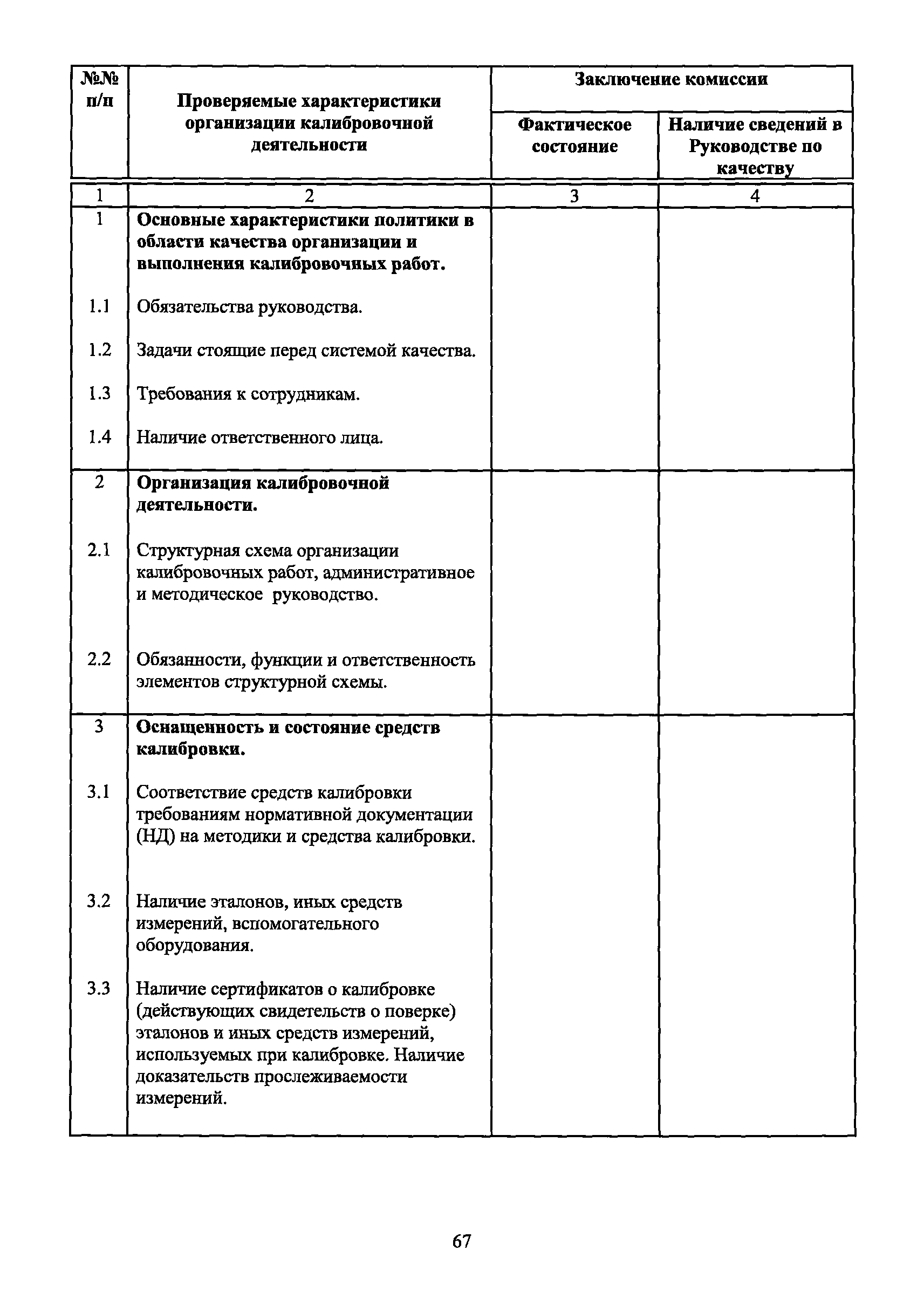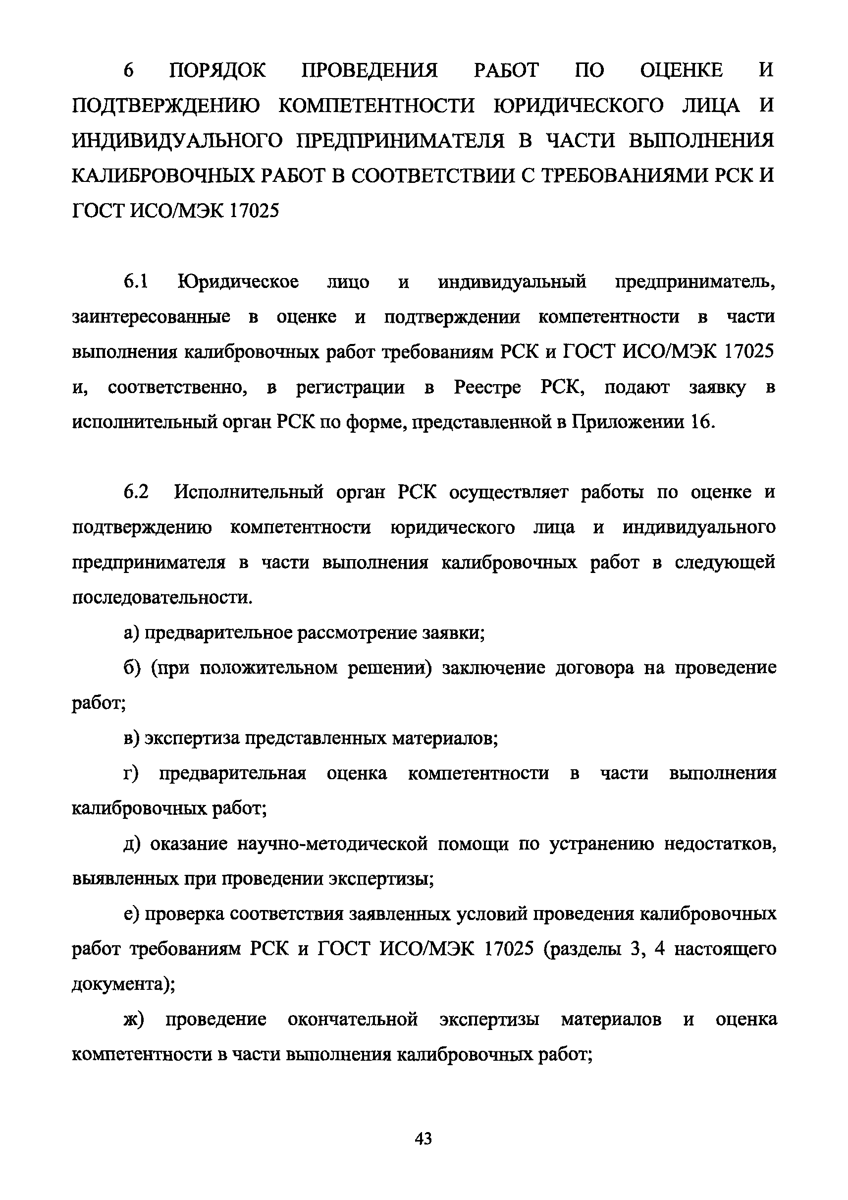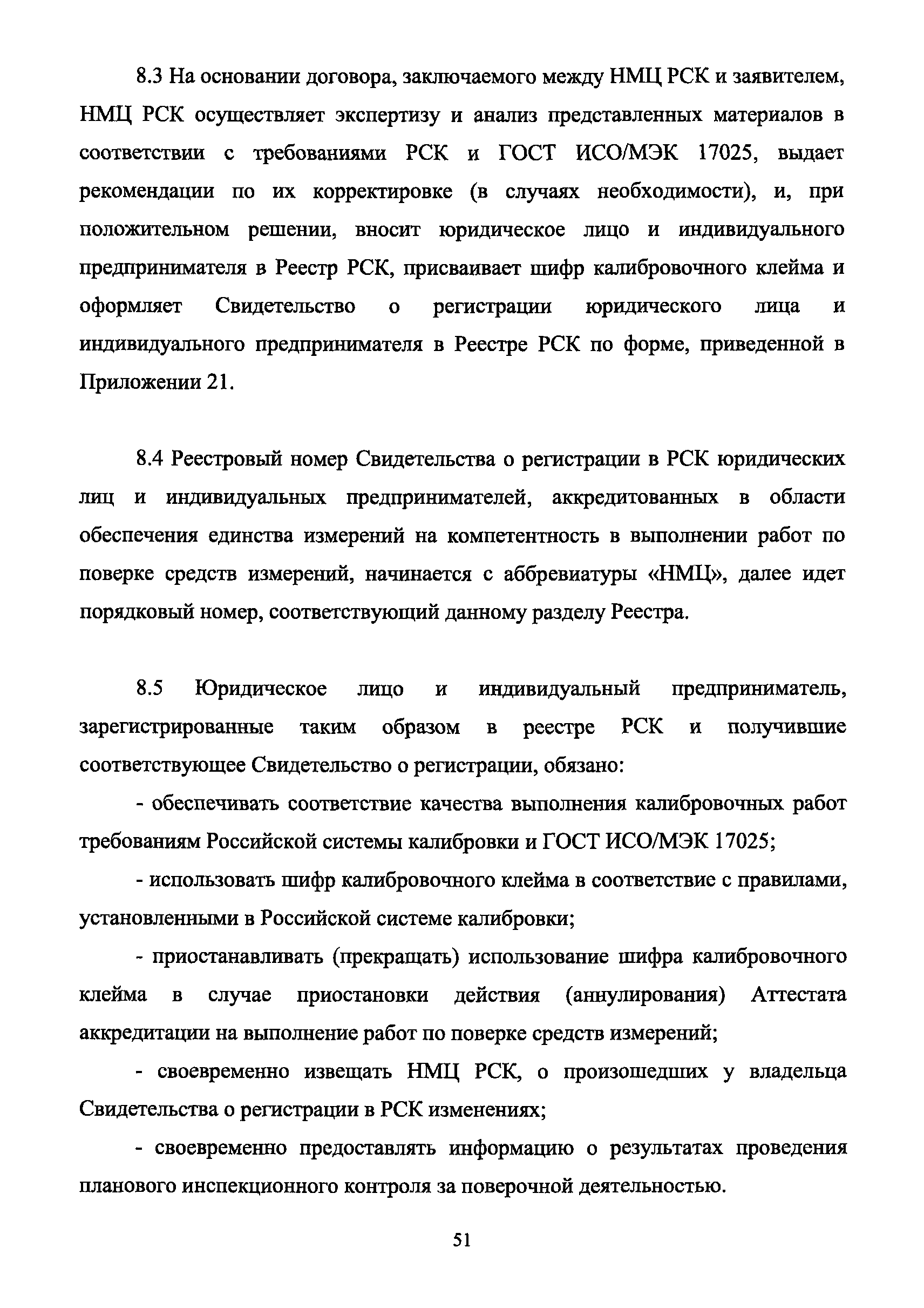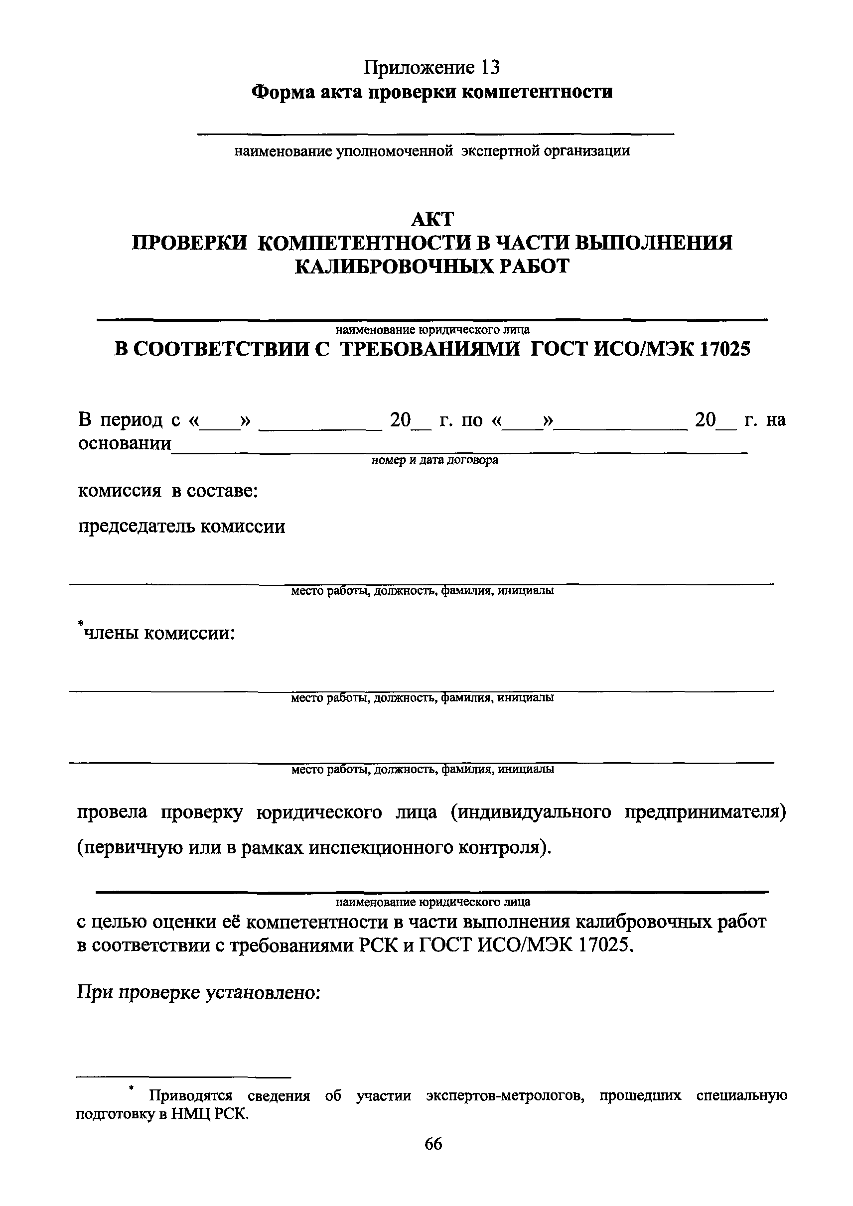 | Оглавление: | 1 Введение 2 Общие положения 3 Основные требования к юридическим лицам и индивидуальным предпринимателям, претендующим на подтверждение соответствия требованиям РСК И ГОСТ ИСО/МЭК 17025 4 Построение и содержание "Руководства по качеству организации и выполнения калибровочных работ" 5 Порядок проведения работ по подтверждению соответствия юридических лиц и индивидуальных предпринимателей, аккредитованных в РСК до 1 ноября 2011 г., требованиям ГОСТ ИСО/МЭК 17025 6 Порядок проведения работ по оценке и подтверждению компетентности юридических лиц и индивидуальных предпринимателей в части выполнения калибровочных работ в соответствии с требованиями РСК и ГОСТ ИСО/МЭК 17025 7 Инспекционный контроль за деятельностью юридических лиц и индивидуальных предпринимателей, зарегистрированных в Реестре РСК 8 Порядок регистрации в Российской системе калибровки юридических лиц и индивидуальных предпринимателей, аккредитованных в области обеспечения единства измерений на компетентность в выполнении работ по поверке средств измерений Библиография Приложение 1. Бланк Извещения о регистрации Уполномоченной экспертной организации РСК Приложение 2. Форма приложения к Руководству по качеству: Сведения о калибруемых средствах и средствах калибровки Приложение 3. Форма приложения к Руководству по качеству: Сведения о наличии нормативной и организационно-методической документации Приложение 4. Форма приложения к Руководству по качеству: Сведения о кадровом составе специалистов, выполняющих калибровку средств измерений Приложение 5. Форма приложения к Руководству по качеству: Сведения о состоянии производственных помещений, используемых при калибровке средств измерений Приложение 6. Форма приложения к Руководству по качеству: Журнал регистрации средств измерений, принятых на калибровку Приложение 7. Пример оформления Сертификата о калибровке Приложение 8. Пример оформления эскиза калибровочного клейма Приложение 9. Форма приложения к Руководству по качеству: Журнал контроля за качеством калибровочных работ Приложение 10.Форма заявки аккредитованного в РСК юридического лица и индивидуального предпринимателя в УЭО РСК Приложение 11. Форма заявки аккредитованного в РСК юридического лица и индивидуального предпринимателя в Исполнительный орган РСК Приложение 12. Форма Свидетельства о регистрации в РСК Приложение 13. Форма акта проверки компетентности Приложение 14. Форма извещения УЗО РСК о проведенной предварительной оценке компетентности Приложение 15. Область признания компетентности в части выполнения калибровочных работ Приложение 16. Форма заявки о регистрации в РСК юридического лица и индивидуального предпринимателя в Исполнительный орган РСК Приложение 17. Форма заявки о регистрации в РСК юридического лица и индивидуального предпринимателя в УЭО РСК Приложение 18. Форма Уведомления о проведении инспекционного контроля Приложение 19. Форма Извещения об аннулирования (приостановлении действия). Свидетельства о регистрации в РСК Приложение 20. Форма заявки о регистрации в РСК юридического лица и индивидуального предпринимателя, аккредитованного в области обеспечения единства измерений на компетентность в выполнении работ по поверке средств измерений Приложение 21. Форма Свидетельства о регистрации в РСК юридич