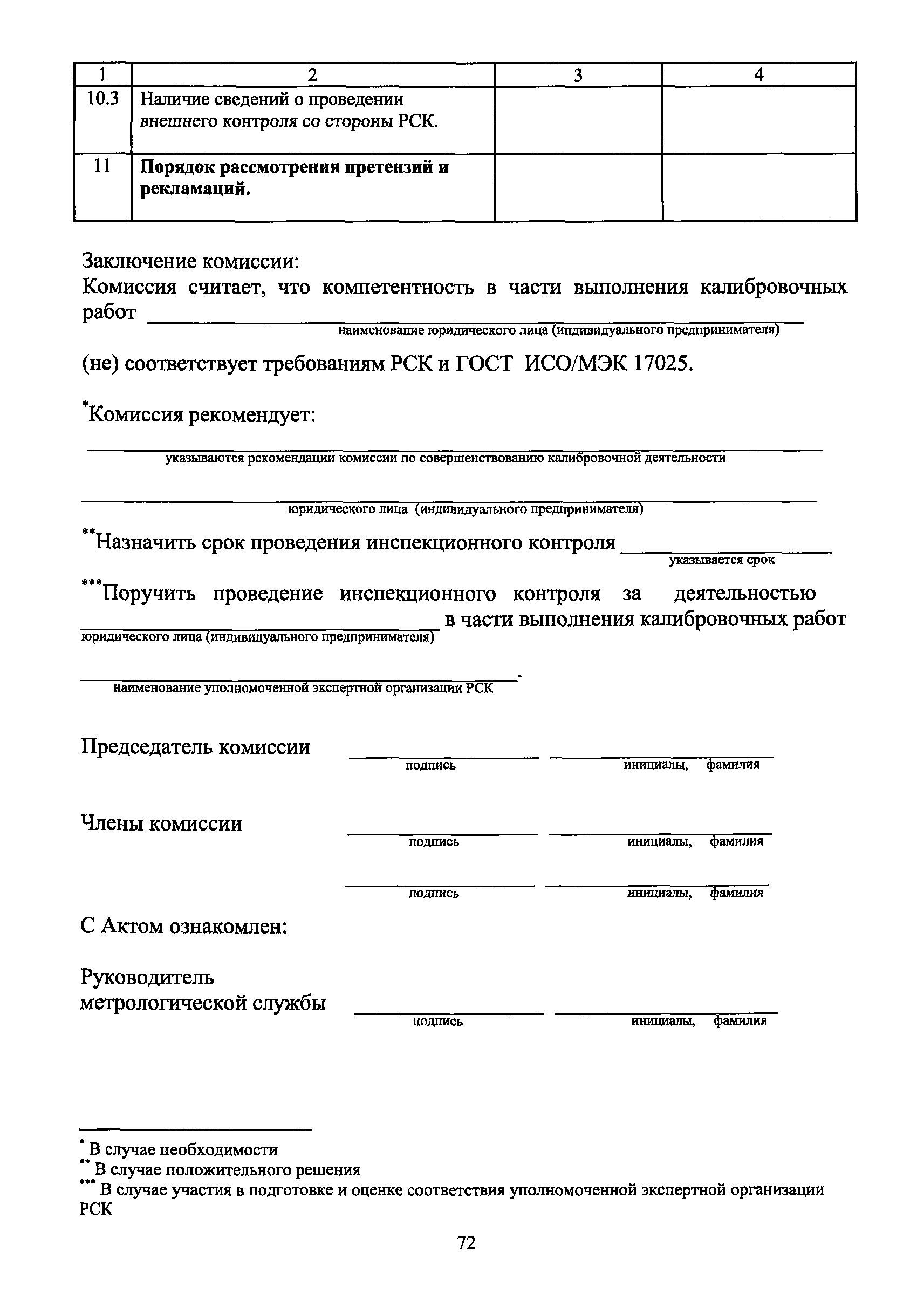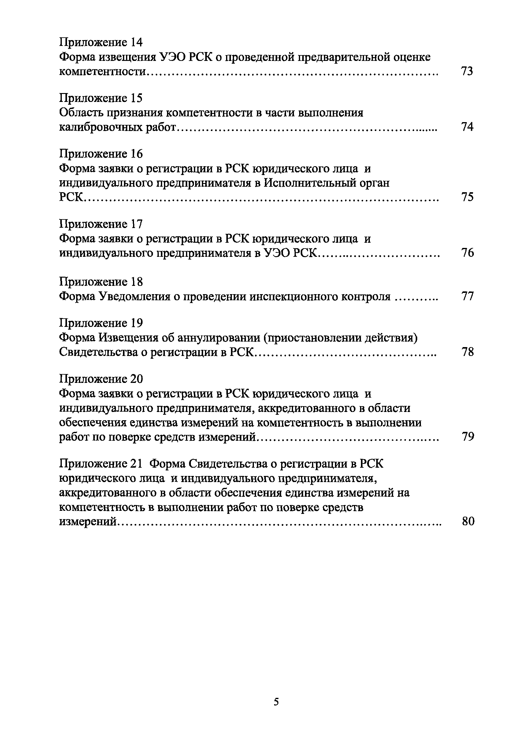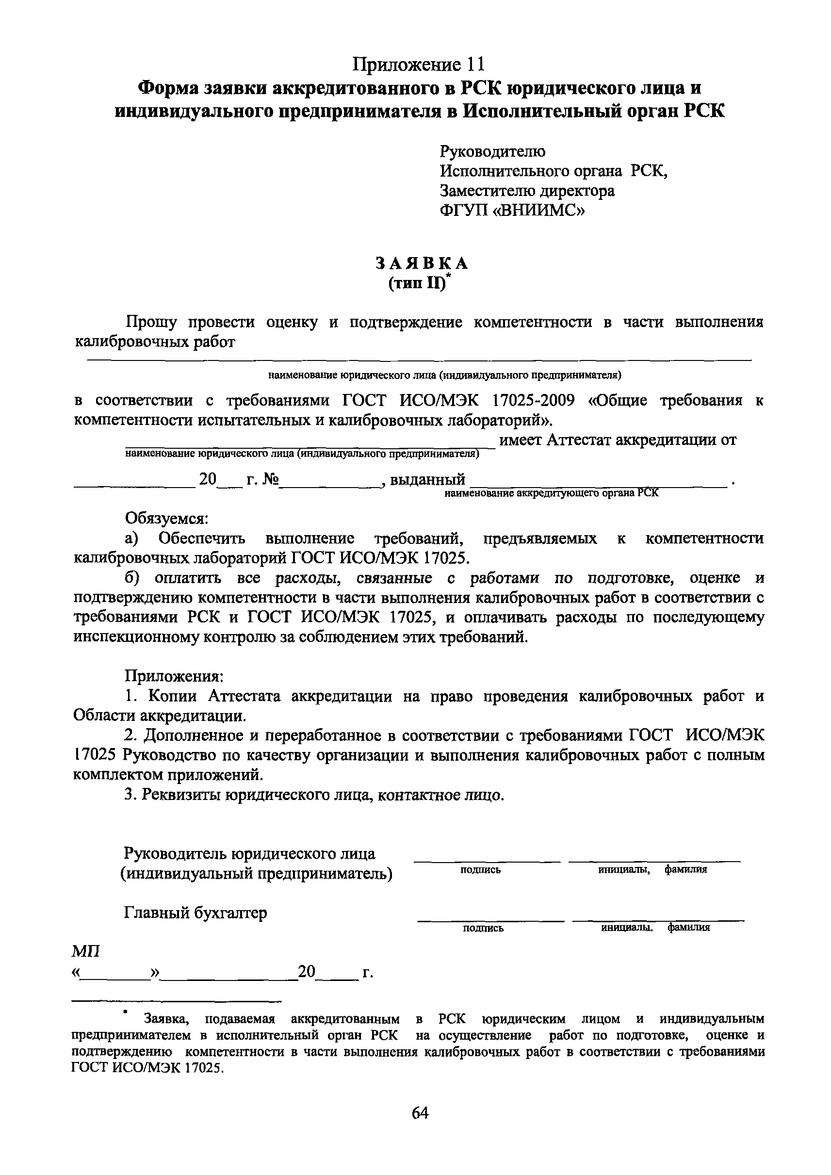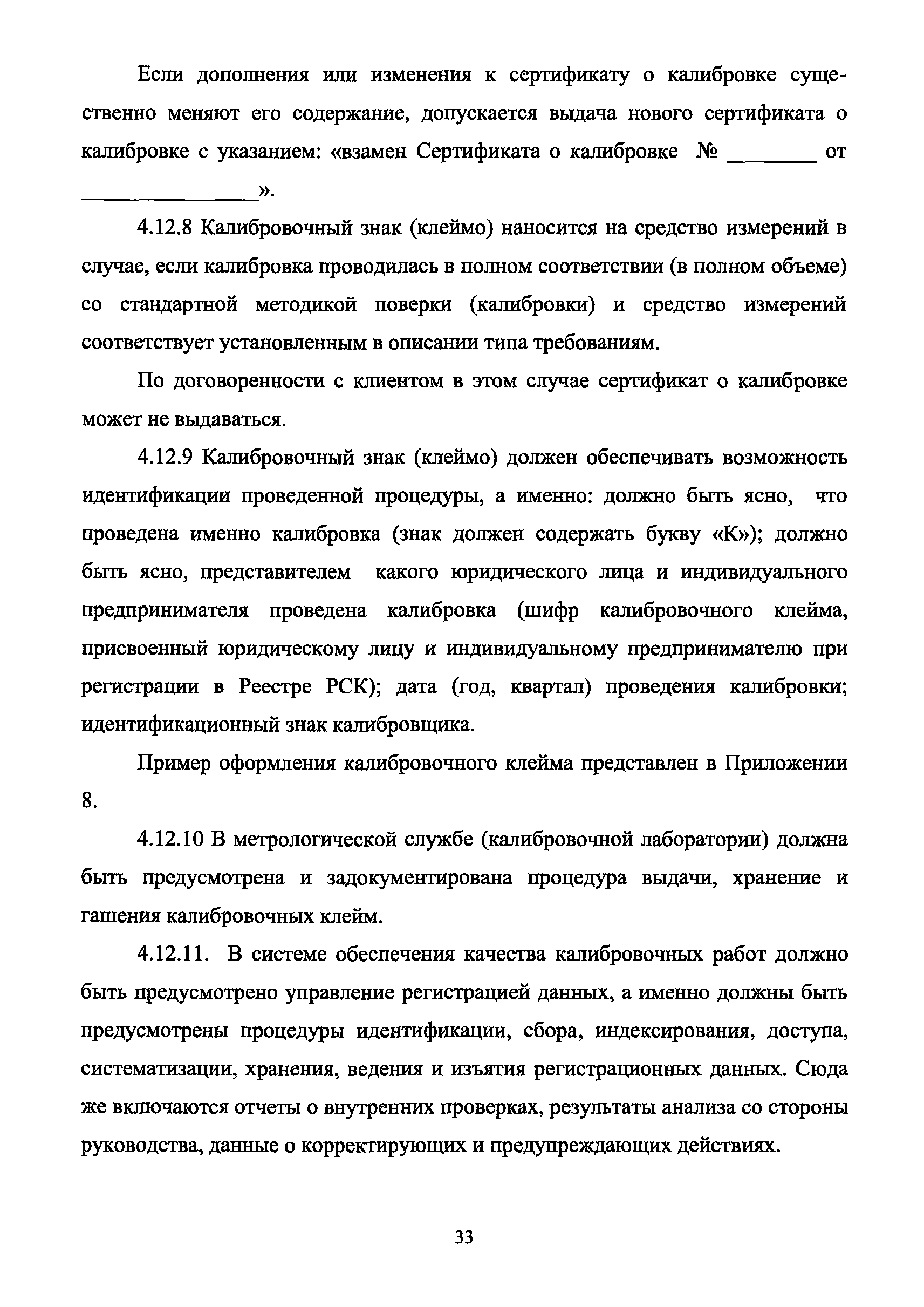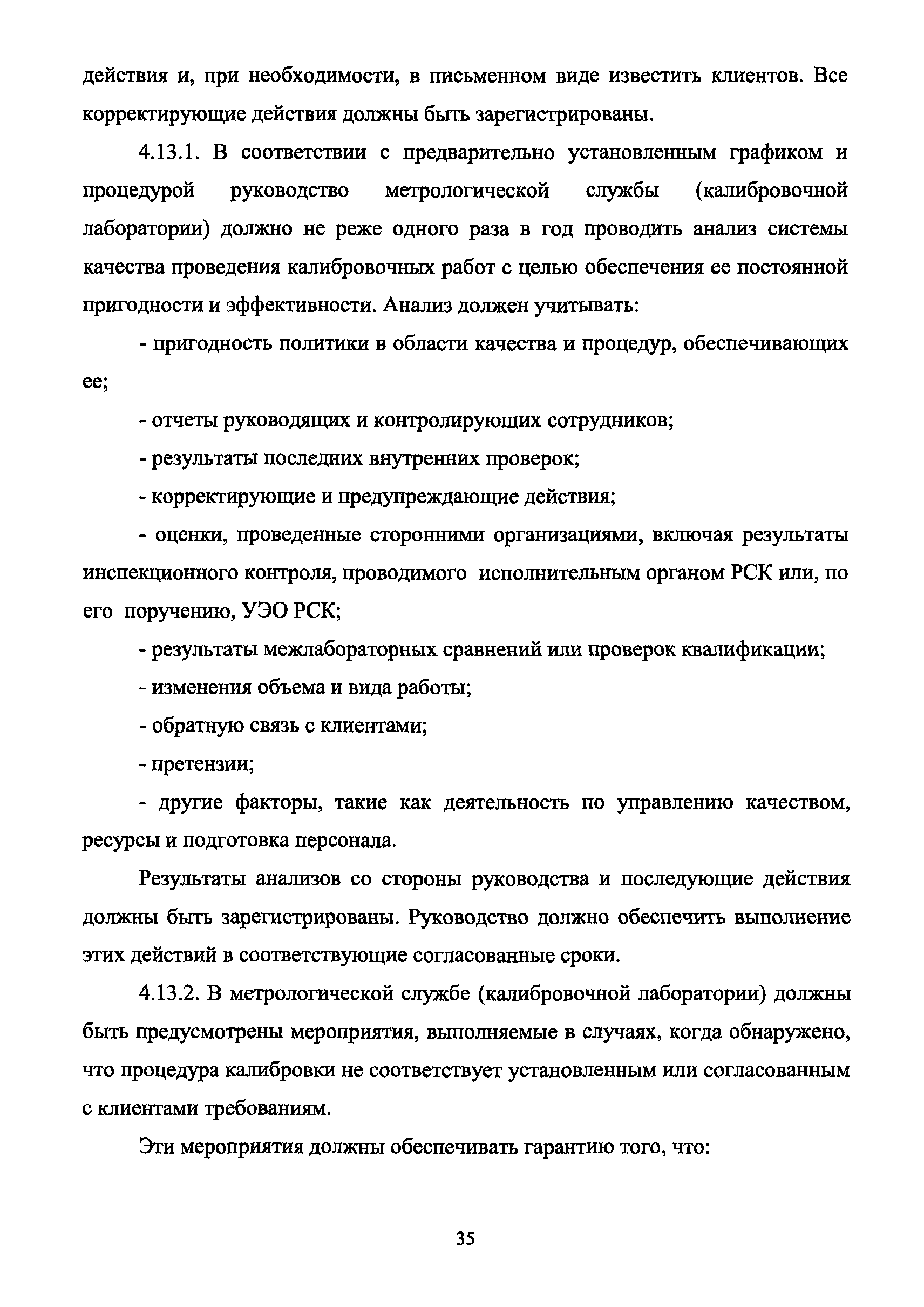 | Оглавление: | 1 Введение 2 Общие положения 3 Основные требования к юридическим лицам и индивидуальным предпринимателям, претендующим на подтверждение соответствия требованиям РСК И ГОСТ ИСО/МЭК 17025 4 Построение и содержание "Руководства по качеству организации и выполнения калибровочных работ" 5 Порядок проведения работ по подтверждению соответствия юридических лиц и индивидуальных предпринимателей, аккредитованных в РСК до 1 ноября 2011 г., требованиям ГОСТ ИСО/МЭК 17025 6 Порядок проведения работ по оценке и подтверждению компетентности юридических лиц и индивидуальных предпринимателей в части выполнения калибровочных работ в соответствии с требованиями РСК и ГОСТ ИСО/МЭК 17025 7 Инспекционный контроль за деятельностью юридических лиц и индивидуальных предпринимателей, зарегистрированных в Реестре РСК 8 Порядок регистрации в Российской системе калибровки юридических лиц и индивидуальных предпринимателей, аккредитованных в области обеспечения единства измерений на компетентность в выполнении работ по поверке средств измерений Библиография Приложение 1. Бланк Извещения о регистрации Уполномоченной экспертной организации РСК Приложение 2. Форма приложения к Руководству по качеству: Сведения о калибруемых средствах и средствах калибровки Приложение 3. Форма приложения к Руководству по качеству: Сведения о наличии нормативной и организационно-методической документации Приложение 4. Форма приложения к Руководству по качеству: Сведения о кадровом составе специалистов, выполняющих калибровку средств измерений Приложение 5. Форма приложения к Руководству по качеству: Сведения о состоянии производственных помещений, используемых при калибровке средств измерений Приложение 6. Форма приложения к Руководству по качеству: Журнал регистрации средств измерений, принятых на калибровку Приложение 7. Пример оформления Сертификата о калибровке Приложение 8. Пример оформления эскиза калибровочного клейма Приложение 9. Форма приложения к Руководству по качеству: Журнал контроля за качеством калибровочных работ Приложение 10.Форма заявки аккредитованного в РСК юридического лица и индивидуального предпринимателя в УЭО РСК Приложение 11. Форма заявки аккредитованного в РСК юридического лица и индивидуального предпринимателя в Исполнительный орган РСК Приложение 12. Форма Свидетельства о регистрации в РСК Приложение 13. Форма акта проверки компетентности Приложение 14. Форма извещения УЗО РСК о проведенной предварительной оценке компетентности Приложение 15. Область признания компетентности в части выполнения калибровочных работ Приложение 16. Форма заявки о регистрации в РСК юридического лица и индивидуального предпринимателя в Исполнительный орган РСК Приложение 17. Форма заявки о регистрации в РСК юридического лица и индивидуального предпринимателя в УЭО РСК Приложение 18. Форма Уведомления о проведении инспекционного контроля Приложение 19. Форма Извещения об аннулирования (приостановлении действия). Свидетельства о регистрации в РСК Приложение 20. Форма заявки о регистрации в РСК юридического лица и индивидуального предпринимателя, аккредитованного в области обеспечения единства измерений на компетентность в выполнении работ по поверке средств измерений Приложение 21. Форма Свидетельства о регистрации в РСК юридич