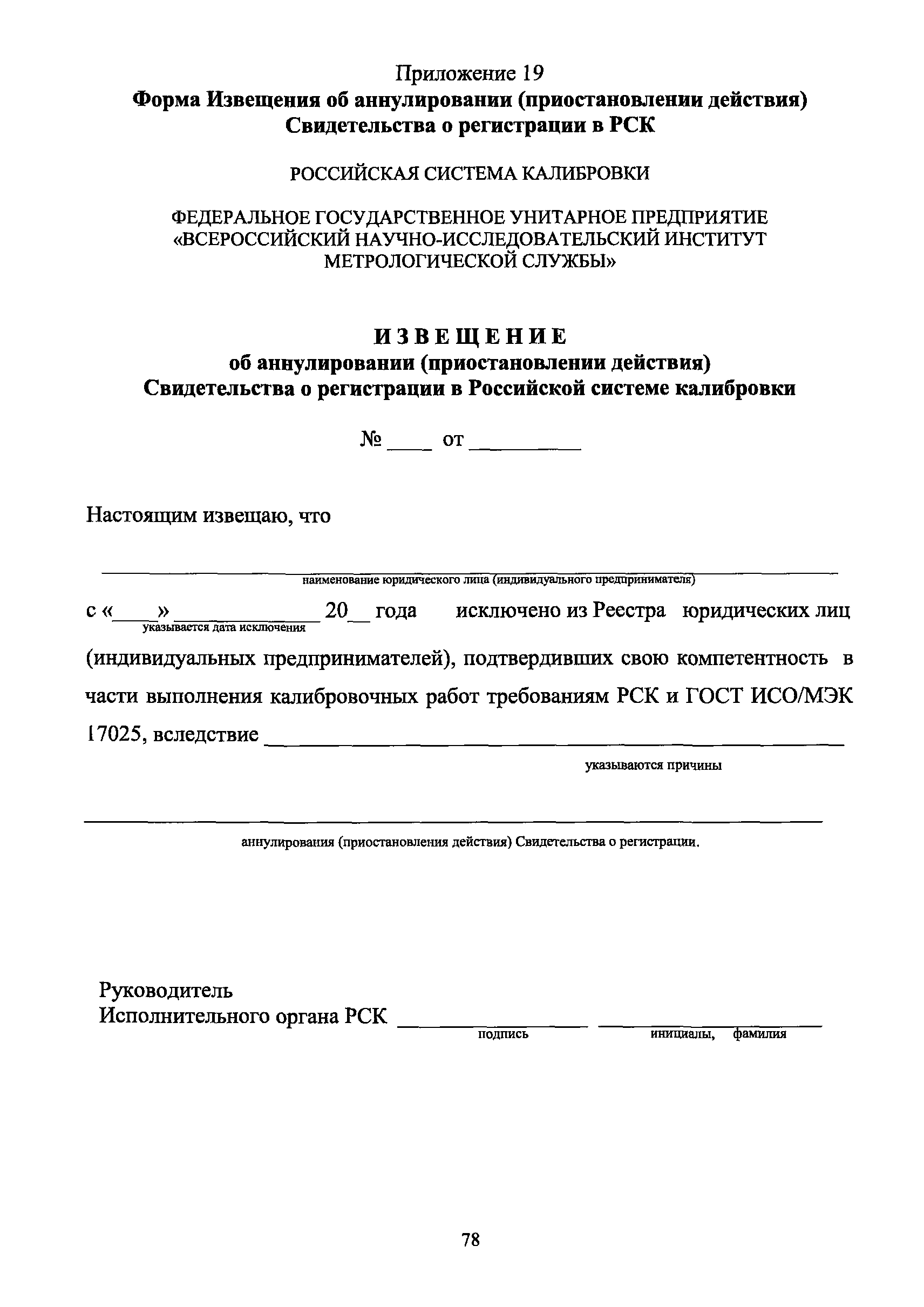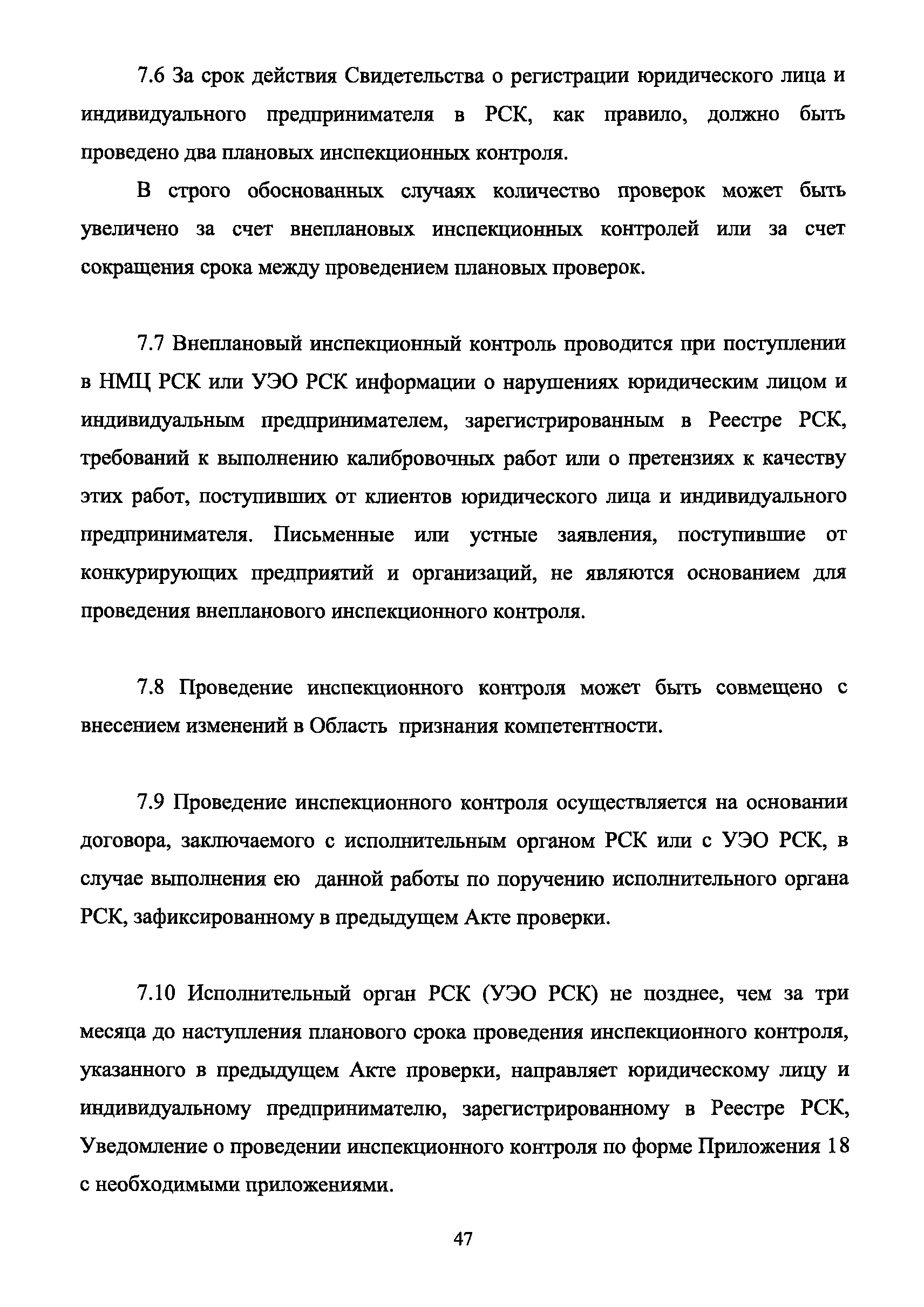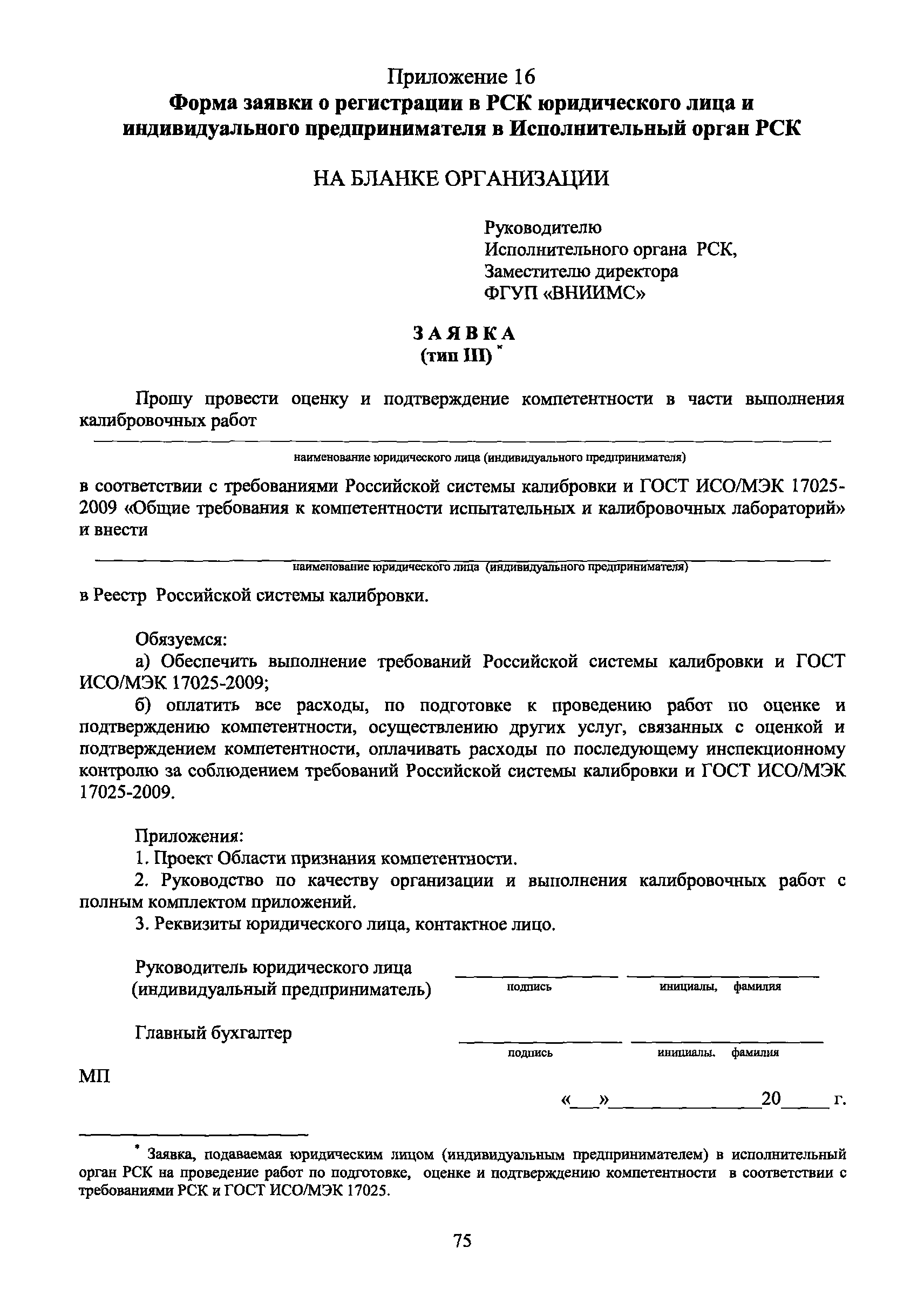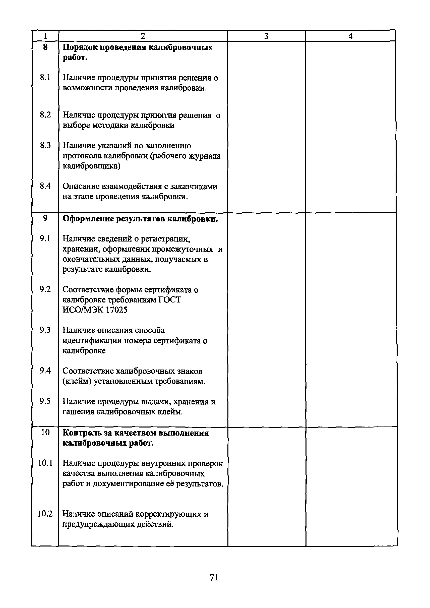 | Оглавление: | 1 Введение 2 Общие положения 3 Основные требования к юридическим лицам и индивидуальным предпринимателям, претендующим на подтверждение соответствия требованиям РСК И ГОСТ ИСО/МЭК 17025 4 Построение и содержание "Руководства по качеству организации и выполнения калибровочных работ" 5 Порядок проведения работ по подтверждению соответствия юридических лиц и индивидуальных предпринимателей, аккредитованных в РСК до 1 ноября 2011 г., требованиям ГОСТ ИСО/МЭК 17025 6 Порядок проведения работ по оценке и подтверждению компетентности юридических лиц и индивидуальных предпринимателей в части выполнения калибровочных работ в соответствии с требованиями РСК и ГОСТ ИСО/МЭК 17025 7 Инспекционный контроль за деятельностью юридических лиц и индивидуальных предпринимателей, зарегистрированных в Реестре РСК 8 Порядок регистрации в Российской системе калибровки юридических лиц и индивидуальных предпринимателей, аккредитованных в области обеспечения единства измерений на компетентность в выполнении работ по поверке средств измерений Библиография Приложение 1. Бланк Извещения о регистрации Уполномоченной экспертной организации РСК Приложение 2. Форма приложения к Руководству по качеству: Сведения о калибруемых средствах и средствах калибровки Приложение 3. Форма приложения к Руководству по качеству: Сведения о наличии нормативной и организационно-методической документации Приложение 4. Форма приложения к Руководству по качеству: Сведения о кадровом составе специалистов, выполняющих калибровку средств измерений Приложение 5. Форма приложения к Руководству по качеству: Сведения о состоянии производственных помещений, используемых при калибровке средств измерений Приложение 6. Форма приложения к Руководству по качеству: Журнал регистрации средств измерений, принятых на калибровку Приложение 7. Пример оформления Сертификата о калибровке Приложение 8. Пример оформления эскиза калибровочного клейма Приложение 9. Форма приложения к Руководству по качеству: Журнал контроля за качеством калибровочных работ Приложение 10.Форма заявки аккредитованного в РСК юридического лица и индивидуального предпринимателя в УЭО РСК Приложение 11. Форма заявки аккредитованного в РСК юридического лица и индивидуального предпринимателя в Исполнительный орган РСК Приложение 12. Форма Свидетельства о регистрации в РСК Приложение 13. Форма акта проверки компетентности Приложение 14. Форма извещения УЗО РСК о проведенной предварительной оценке компетентности Приложение 15. Область признания компетентности в части выполнения калибровочных работ Приложение 16. Форма заявки о регистрации в РСК юридического лица и индивидуального предпринимателя в Исполнительный орган РСК Приложение 17. Форма заявки о регистрации в РСК юридического лица и индивидуального предпринимателя в УЭО РСК Приложение 18. Форма Уведомления о проведении инспекционного контроля Приложение 19. Форма Извещения об аннулирования (приостановлении действия). Свидетельства о регистрации в РСК Приложение 20. Форма заявки о регистрации в РСК юридического лица и индивидуального предпринимателя, аккредитованного в области обеспечения единства измерений на компетентность в выполнении работ по поверке средств измерений Приложение 21. Форма Свидетельства о регистрации в РСК юридич