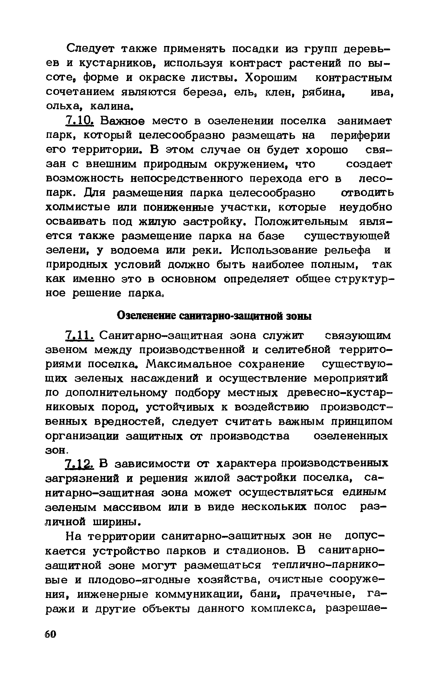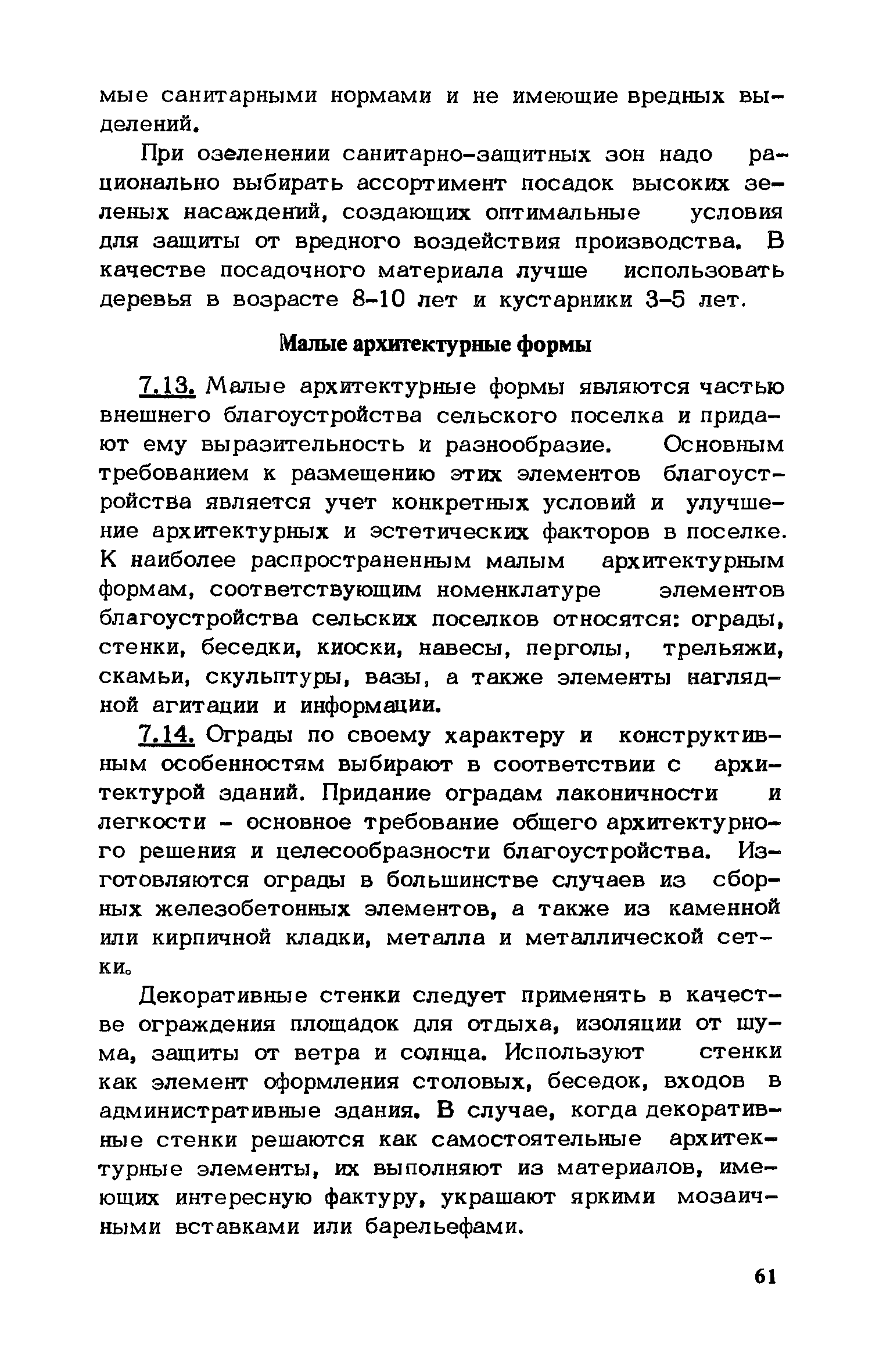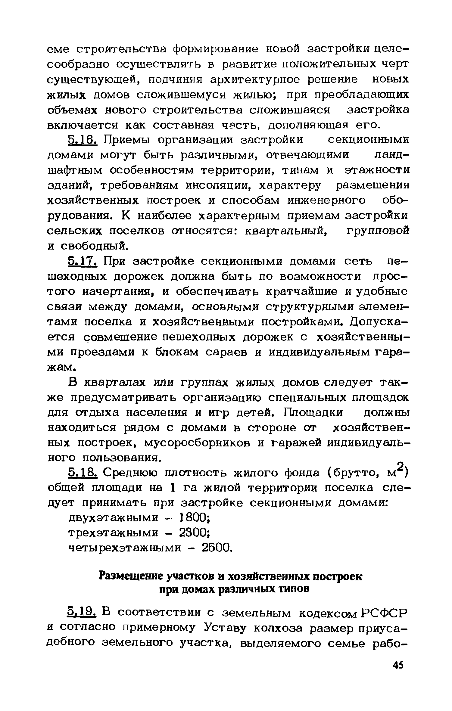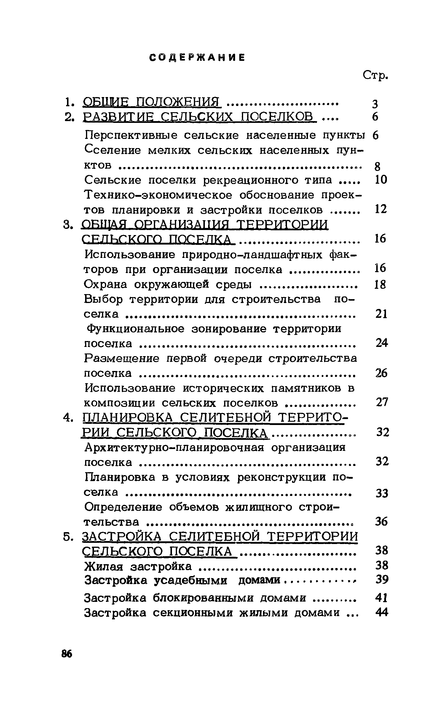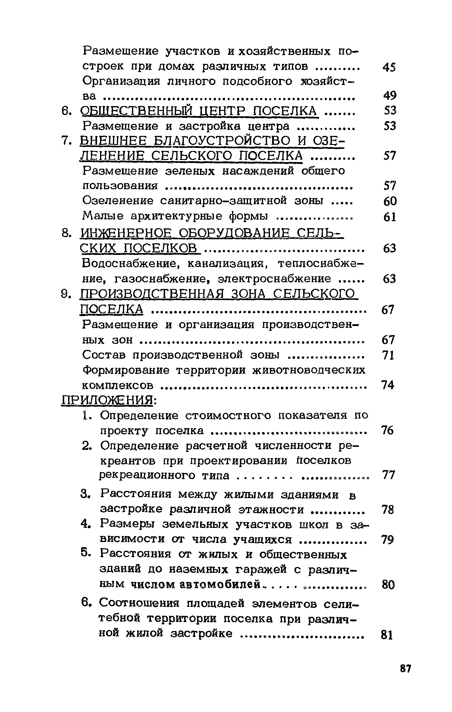 | Оглавление: | 1. Общие положения 2. Развитие сельских поселков Перспективные сельские населенные пункты Сселение мелких сельских населенных пунктов Сельские поселки рекреационного типа Технико-экономическое обоснование проектов планировки и застройки поселков 3. Общая организация территории сельского поселка Использование природно-ландшафтных факторов при организации поселка Охрана окружающей среды Выбор территории для строительства поселка Функциональное зонирование территории поселка Размещение первой очереди строительства поселка Использование исторических памятников в композиции сельских поселков 4. Планировка селитебной территории сельского поселка Архитектурно-планировочная организация поселка Планировка в условиях реконструкции поселка Определение объемов жилищного строительства 5. Застройка селитебной территории сельского поселка Жилая застройка Застройка усадебными домами Застройка блокированными домами Застройка секционными жилыми домами Размещение участков и хозяйственных построек при домах различных типов Организация личного подсобного хозяйства 6. Общественный центр поселка Размещение и застройка центра 7. Внешнее благоустройство и озеленение сельского поселка Размещение зеленых насаждений общего пользования Озеленение санитарно-защитной зоны Малые архитектурные формы 8. Инженерное оборудование сельских поселков Водоснабжение, канализация, теплоснабжение, газоснабжение, электроснабжение 9. Производственная зона сельского поселка Размещение и организация производственных зон Состав производственной зоны Формирование территории животноводческих комплексов Приложение 1. Определение стоимостного показателя по проекту поселка Приложение 2. Определение расчетной численности рекреантов при проектирования поселков рекреационного типа Приложение 3. Расстояния между жилыми зданиями в застройке различной этажности Приложение 4. Размеры земельных участков школ в зависимости от числа учащихся Приложение 5. Расстояния от жилых и общественных зданий до наземных гаражей с различным числом автомобилей Приложение 6. Соотношения площадей элементов селитебной территории поселка при различной жилой застройки Приложение 7. Плотность жилого фонда селитебной территории сельского населенного пункта при различных типах жилых домов Приложение 8. Минимальные санитарно-гигиенические разрывы для хозяйственных построек и сооружений различного назначения Приложение 9. Допустимые продольные уклоны дорог, улиц и проездов в поселках Приложение 10. Размеры спортивных сооружений Приложение 11. Санитарно-гигиенические требования к очистке территории сельского населенного пункта |